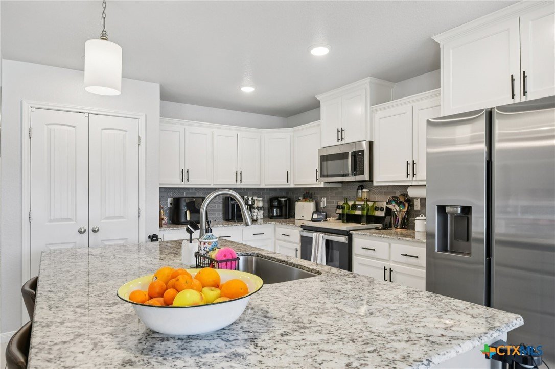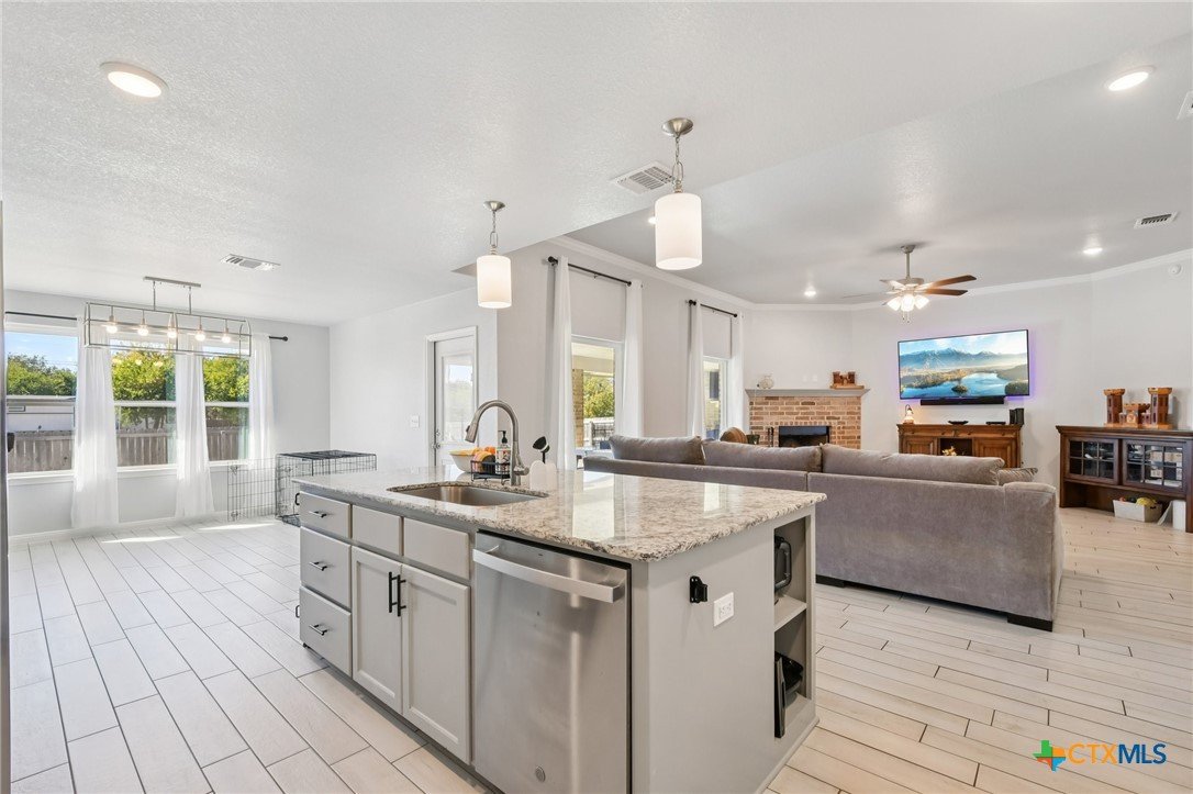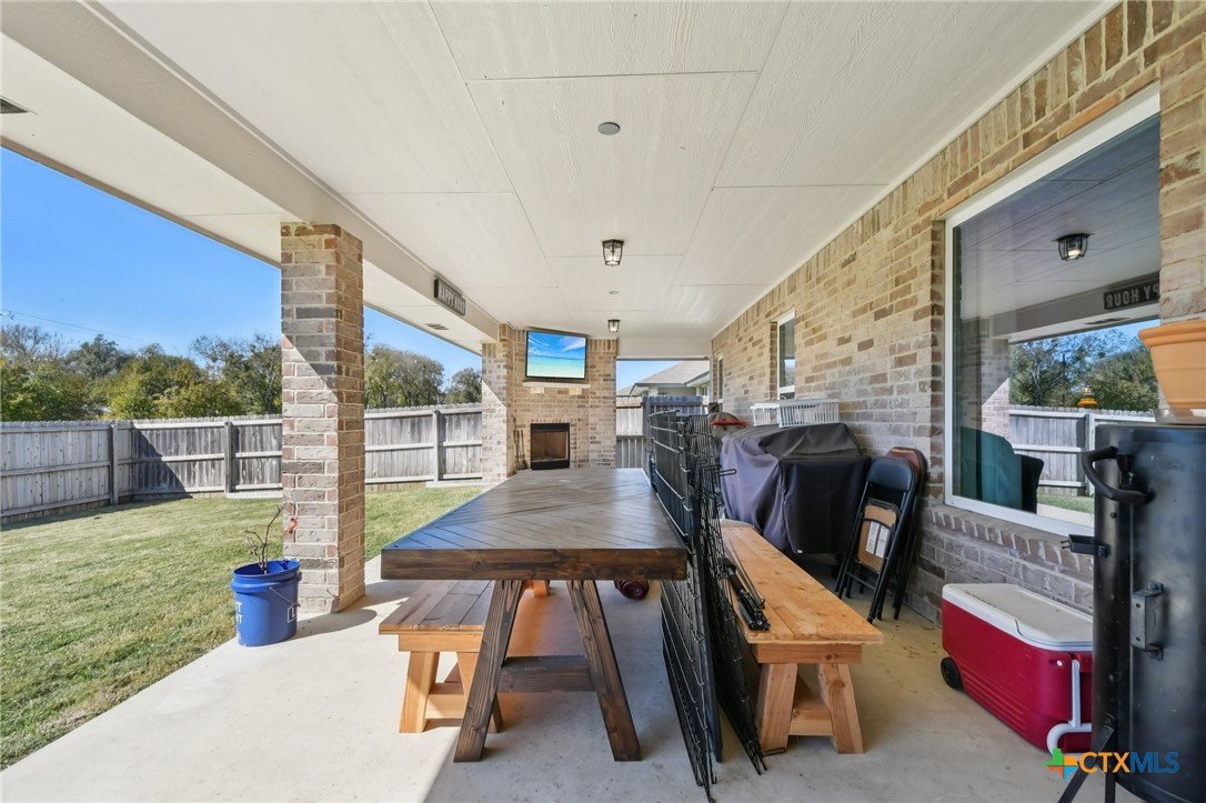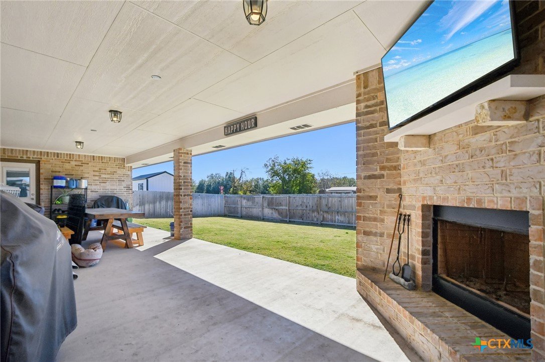 Beautifully maintained 2021-built home featuring 4 bedrooms and 2 full baths in an ideal Belton location! You’ll love the open-concept layout with a spacious living room highlighted by a cozy fireplace and a gorgeous light wood-look plank tile that flows throughout. The chef’s kitchen offers abundant counter space, a large center island, granite countertops, and stainless steel appliances—perfect for entertaining or family gatherings. Step outside to an impressive covered patio complete with a built-in fireplace, creating the ultimate outdoor living space. The primary suite boasts a tray ceiling, a luxurious soaking tub, separate shower, and dual vanities. Three additional bedrooms provide plenty of room for guests or a home office. Solar panels with battery back-up keep your power on and your energy bills low. Conveniently located close to major roads, shopping, and schools, this home truly has it all!