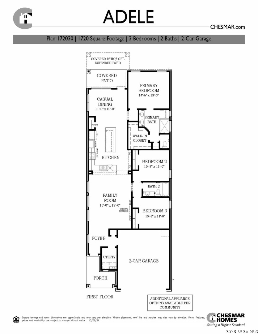 The Adele floorplan by Chesmar Homes offers a beautifully designed single-story new construction home featuring 1,720 square feet, 3 bedrooms, 2 bathrooms, and a 2-car garage. At the heart of the Adele is a spacious family room that flows seamlessly into the kitchen and casual dining area. The kitchen features a large pantry, generous counter space, and flexible appliance options. The private primary suite is tucked toward the rear of the home and includes a walk-in closet and a well-appointed primary bath, offering a relaxing retreat. Two secondary bedrooms and a full bath are thoughtfully positioned to provide comfort and privacy for guests or family members. HOME IS UNDER CONSTRUCTION, est. July completion. Some photos are REPRESENTATIVE* of the floorplan.