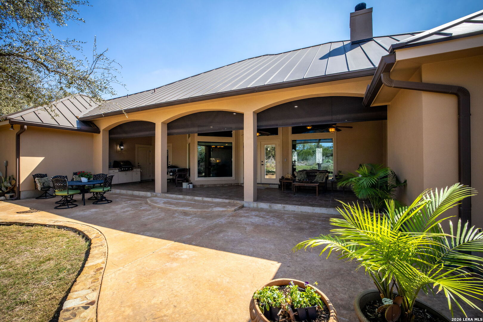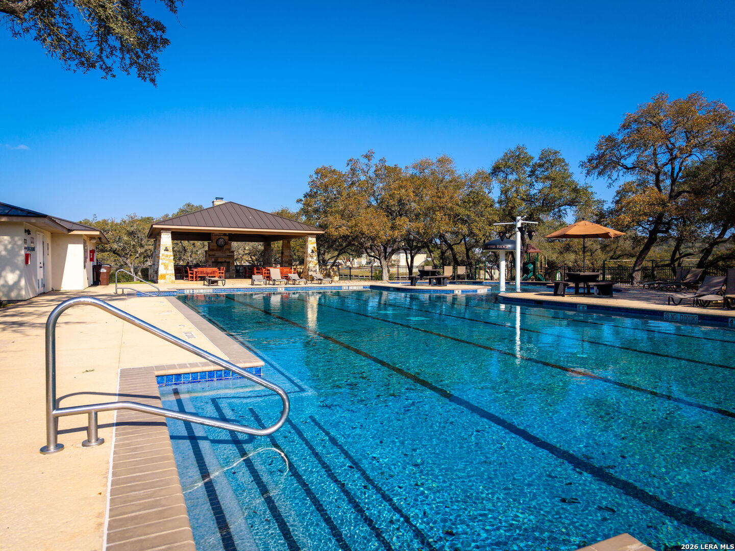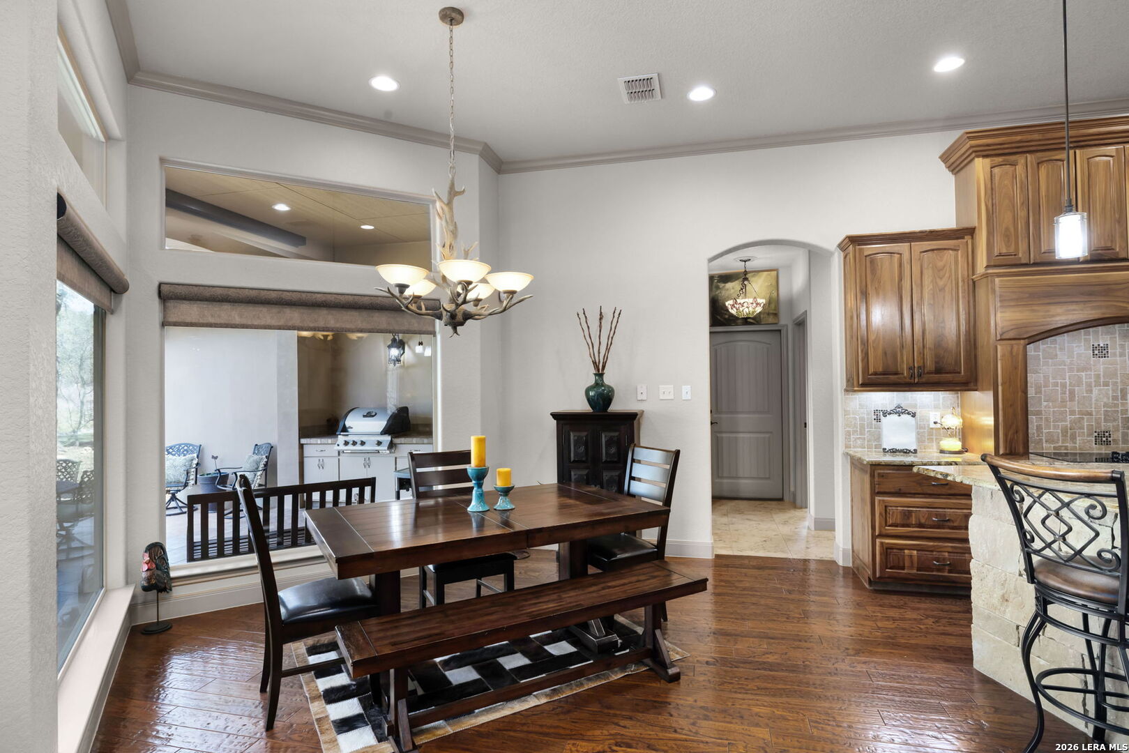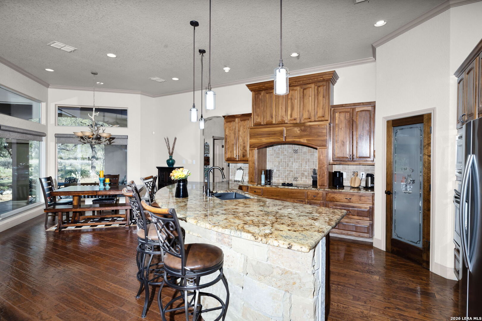 Nestled in the desirable guarded and gated community of Copper Ridge, this stunning residence boasts four spacious bedrooms and three and a half bathrooms. The open-concept layout is enhanced by impressive floor-to-ceiling windows that flood the living space with natural light and offer sweeping views of the beautifully manicured backyard oasis-complete with a sprinkler system and an extended patio featuring a built-in grill, perfect for entertaining. Throughout the home, rich walnut wood flooring adds warmth and sophistication. The kitchen dazzles with custom walnut cabinetry, gleaming granite countertops, top-of-the-line fixtures, and a striking stone-accented breakfast bar and backsplash. Modern conveniences abound, including a security system with glass breakage, an attached three-car garage, plus a versatile detached two-car garage for extra storage or hobbies. Residents enjoy premium community amenities: a sparkling pool, tennis courts, a sports court, and scenic jogging trails. All this, just steps from vibrant shops, lively bars, and delicious restaurants-and only minutes away from New Braunfels' top attractions.