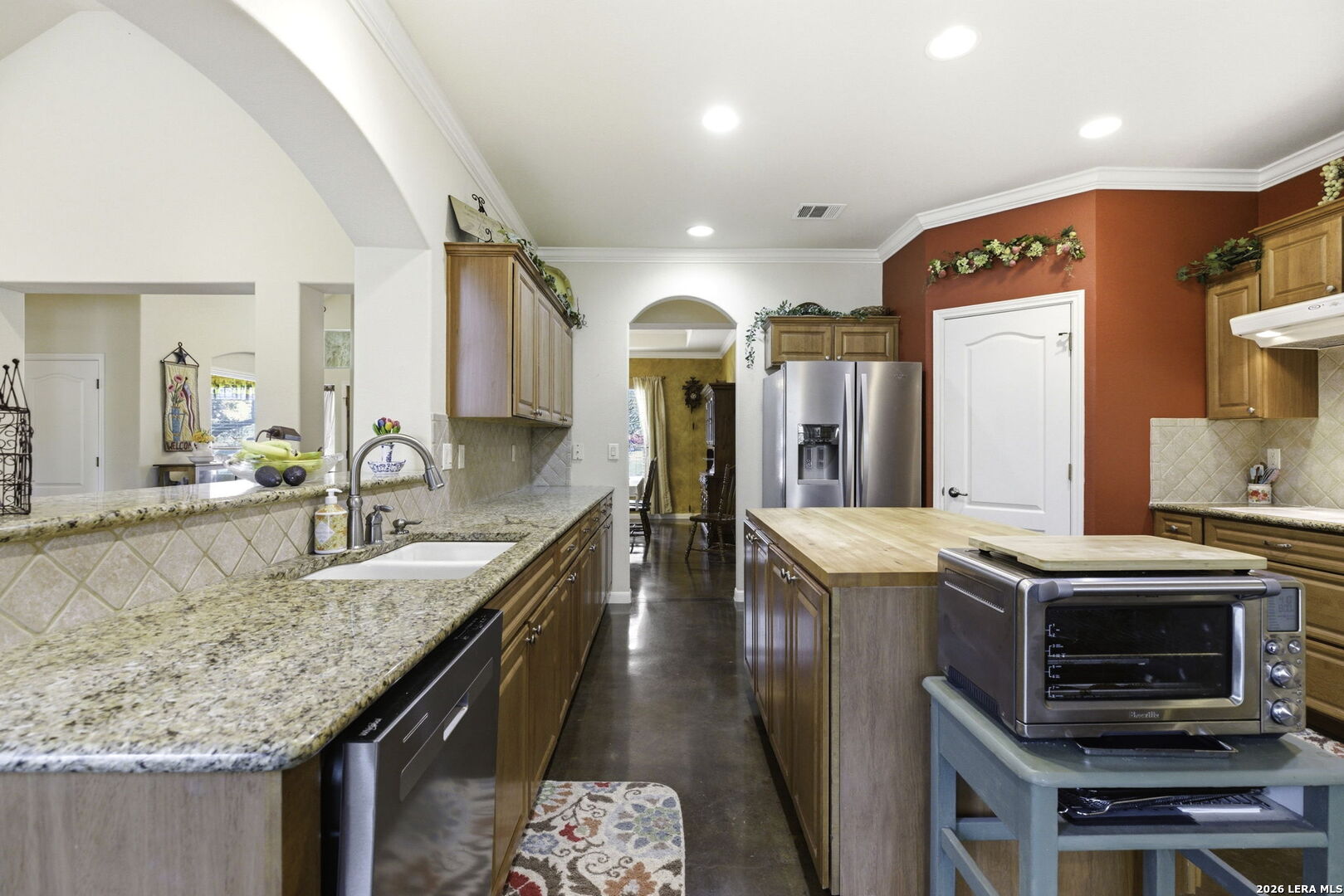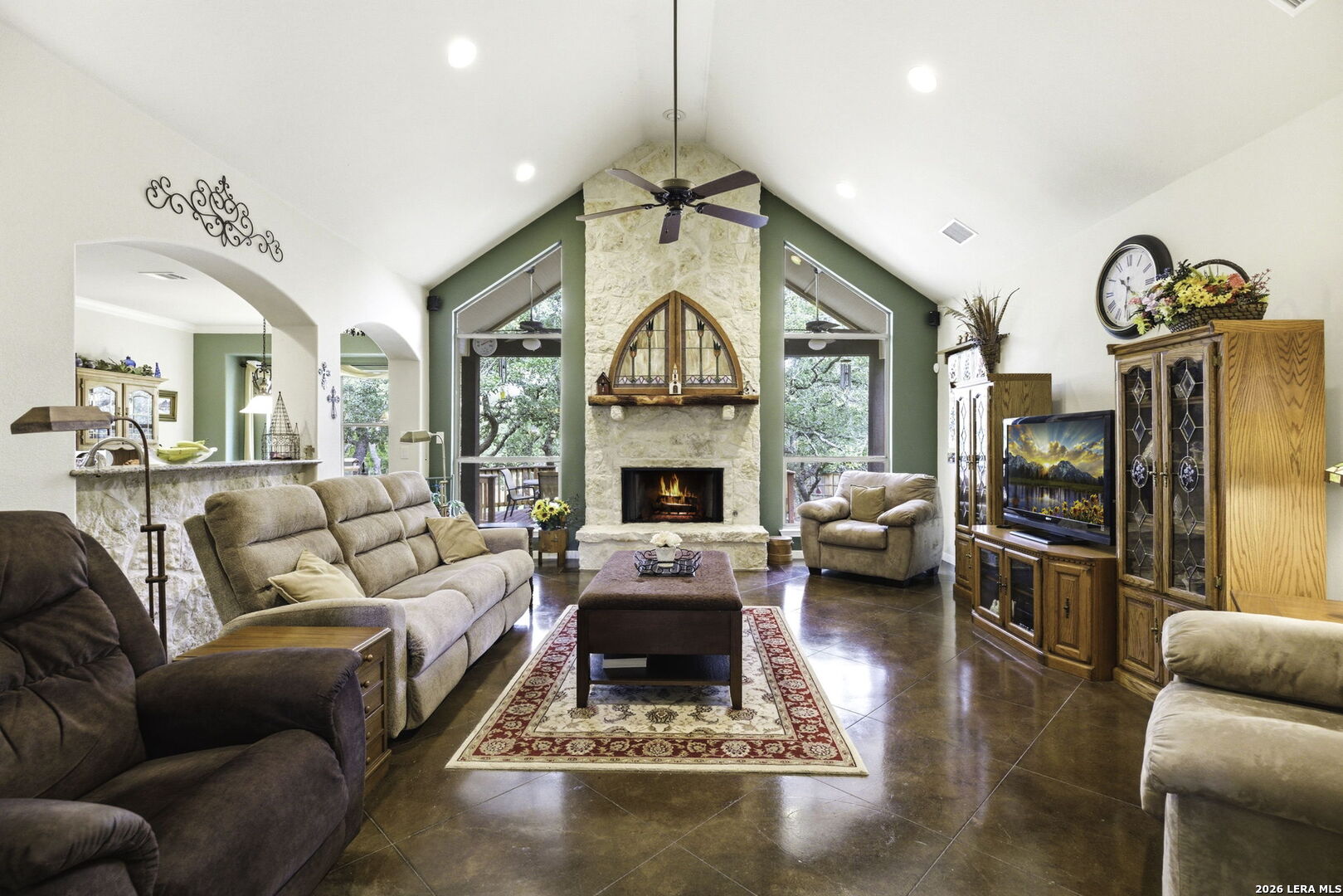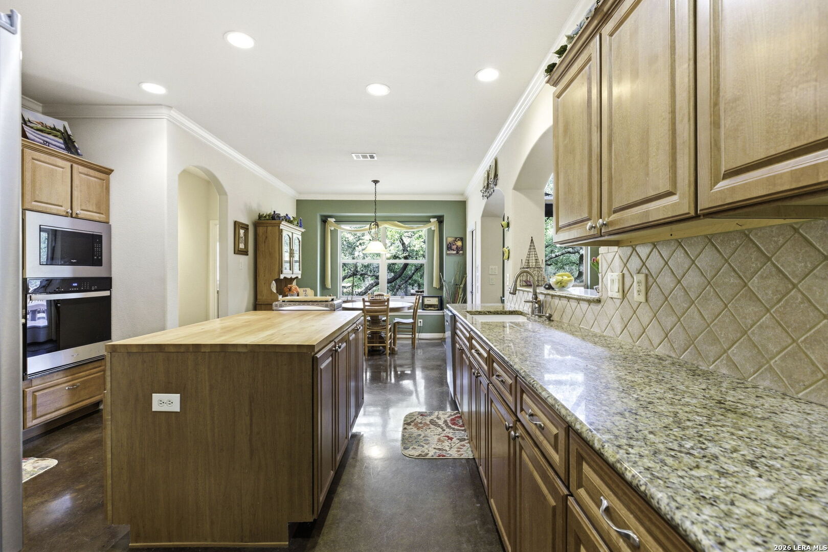 This beautiful one-story custom home is located in the popular Timberwood Park subdivision, and is situated on a spacious, .81-acre, level lot, loaded with 50 oak trees! NEW ROOF 2024! The Builder is the highly acclaimed Double Diamond and some of the Exterior features include side-entry garage, large, covered patio and deck, privacy fence, shed, and 4-sides masonry. The interior is appointed with a gourmet island kitchen w/granite top, custom cabinets, in-wall ovens, high vaulted ceilings, tall rock fireplace with glass on both sides, beautiful stained concrete floors in all the common areas, carpet and tile in bedrooms and baths, and beautiful designer colors! NO CITY TAXES * LOW HOA FEES * EXCELLENT AREA SCHOOLS * 35 ACRE RECREATION CENTER (pool, lake, clubhouse, gym, par-3 golf, tennis, basketball, and pickle ball courts, jogging trail, pavilion area, and so much more) *