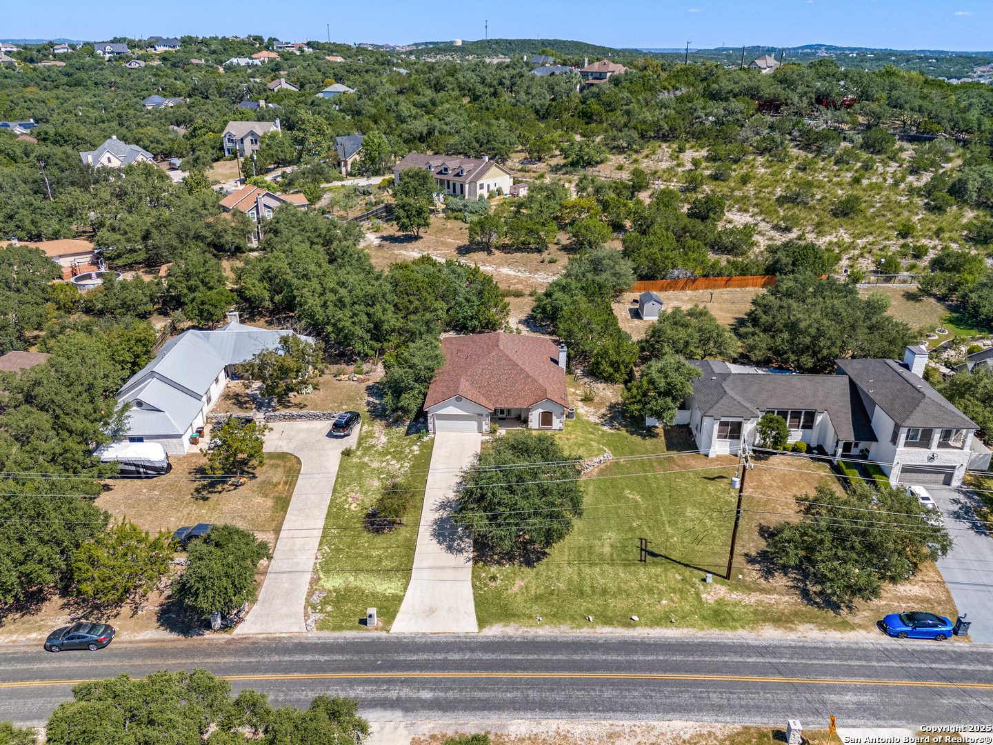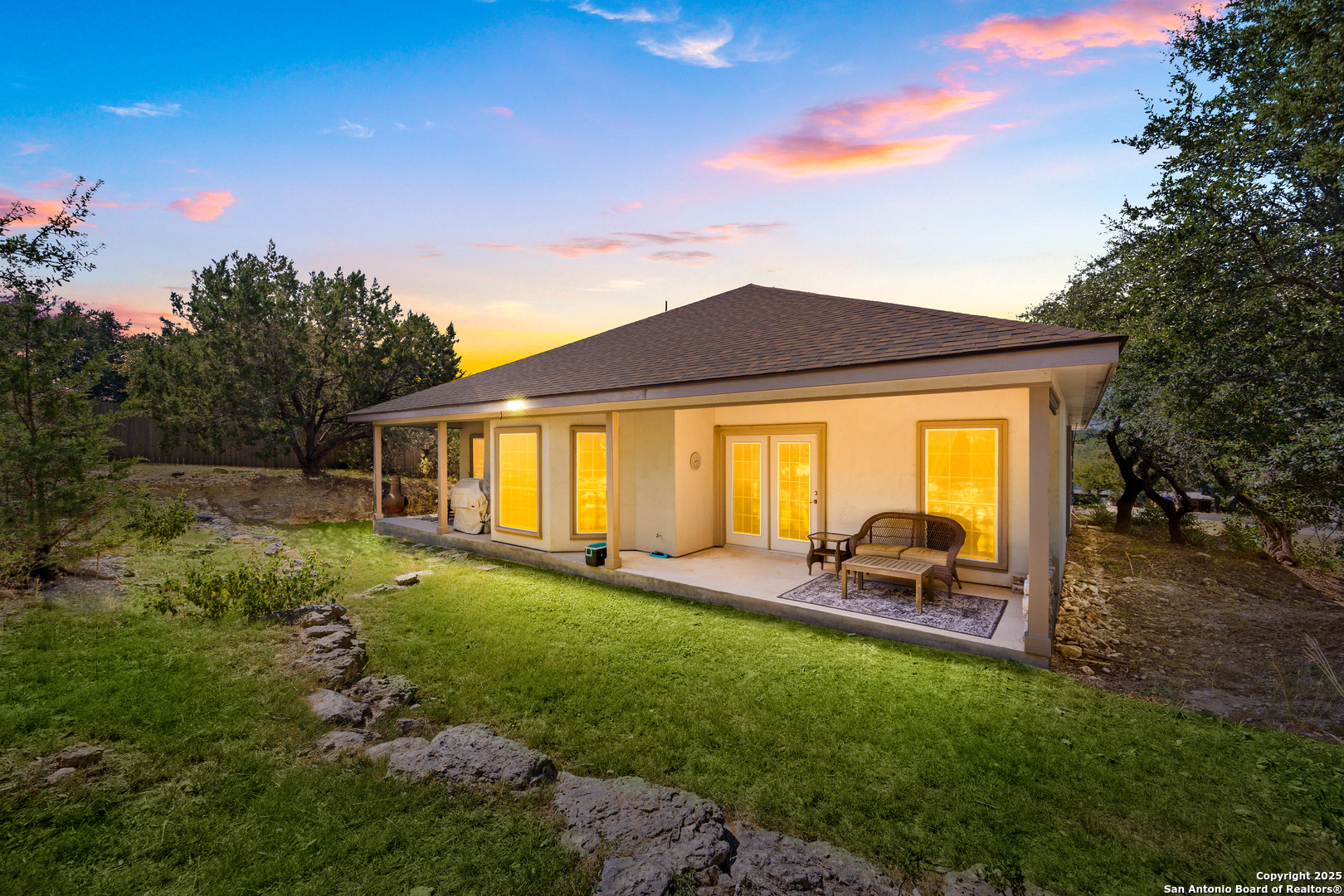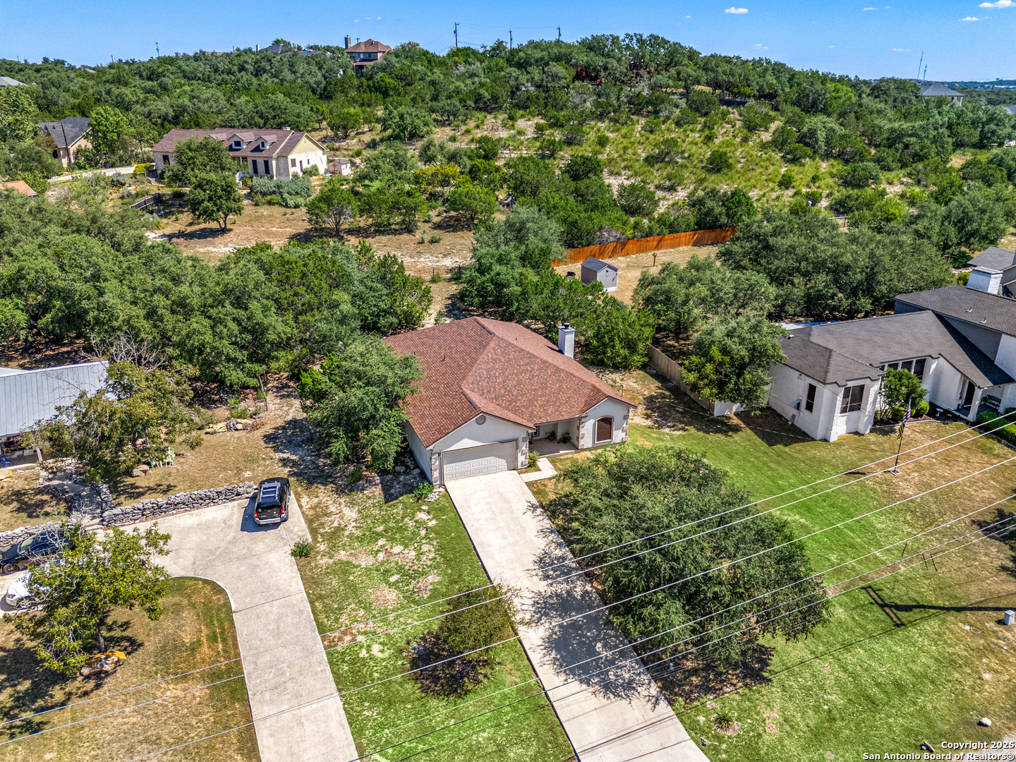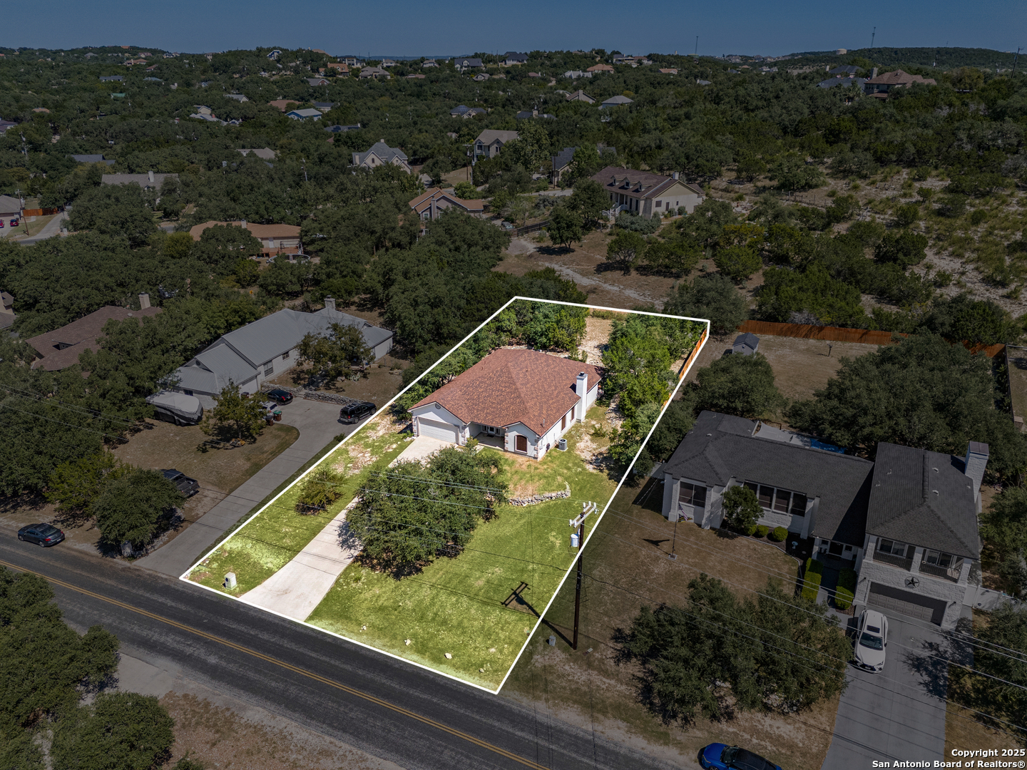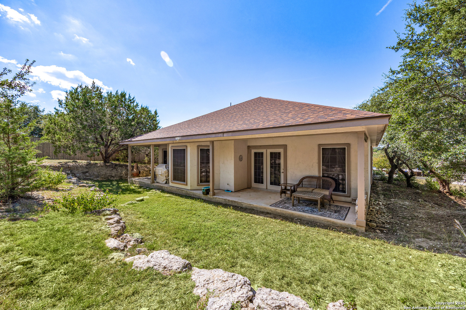Lovely one-story home located in the serene community of Timberwood Park, surrounded by mature trees an abundance of wildlife. This custom home sits on .46 acre and features high ceilings, a spacious open floor plan, and ceramic tile flooring throughout the main living areas, kitchen, and bathrooms. The large kitchen offers plenty of space for cooking and gathering, with custom maple cabinets, Corian countertops, and an open layout that connects to the dining and living areas. The primary suite includes a garden tub, separate shower, double vanity, and walk-in closets for added convenience. Step outside to enjoy the spacious backyard with a covered patio and plenty of shade provided by beautiful trees. Recent updates include a roof replaced in October 2023, AC core and blower replaced in May 2018, solar screens added in May 2025, new flooring in the primary suite and carpet replaced in the bedrooms in May 2024, plus septic pumped and inspected in September 2025. This home is just a short drive to schools, parks, TX-281, and more. Schedule your personal tour today!