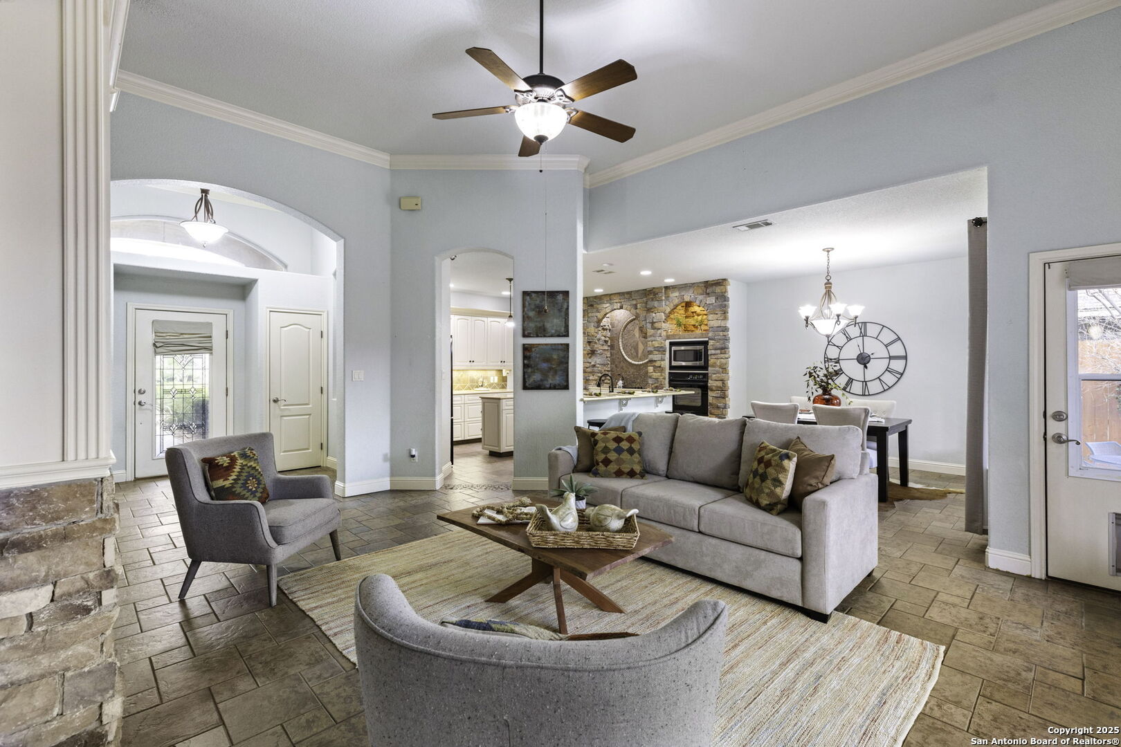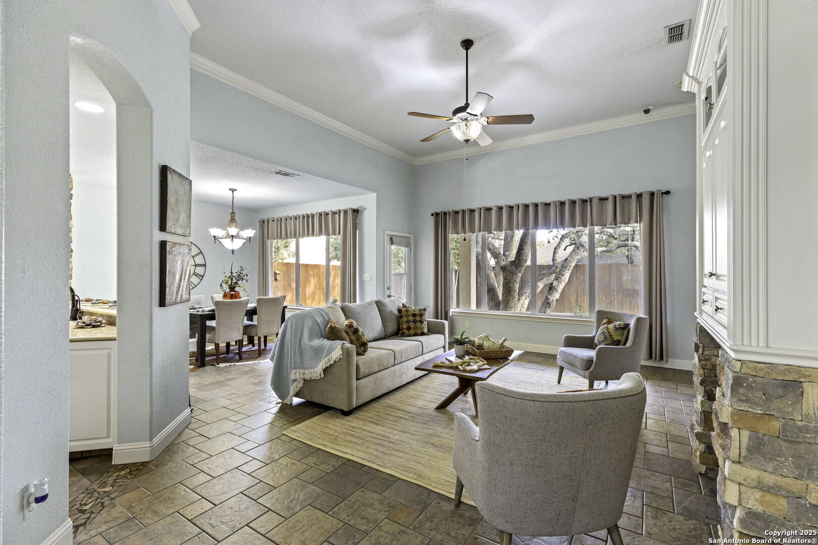 Welcome home to this thoughtfully designed 3-bedroom, 2-bath Parker Custom home in the gated community of Champions Village. This residence offers the perfect blend of function and style, featuring an open-concept layout and well-planned spaces that create an inviting flow-ideal for everyday living and entertaining. The oversized primary suite is a true retreat, showcasing a spacious en-suite bath with a walk-in shower, relaxing corner tub, private toilet area, and dual vanities with separate his-and-hers sides. A generous walk-in closet provides ample storage and organization. At the heart of the home, the kitchen offers abundant cabinetry, a large island perfect for casual dining, and a seamless connection to the main living areas-perfect for gatherings with family and friends. Step outside to your private backyard escape with a covered patio-ideal for summer barbecues or peaceful evenings under the Texas sky. The yard is fully enclosed with an extra-high privacy fence for added comfort. Additional highlights include an oversized two-car garage, dedicated laundry room, full sprinkler system, and security system. With convenient access to top-rated schools, shopping, dining, and all the charm New Braunfels has to offer-including rivers, parks, and the historic downtown-this well-maintained, move-in-ready home is truly a gem.