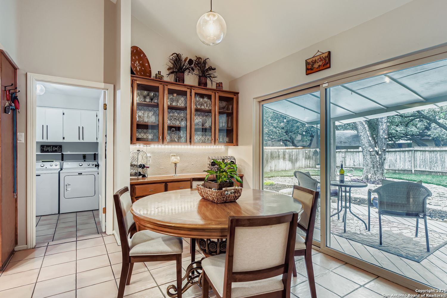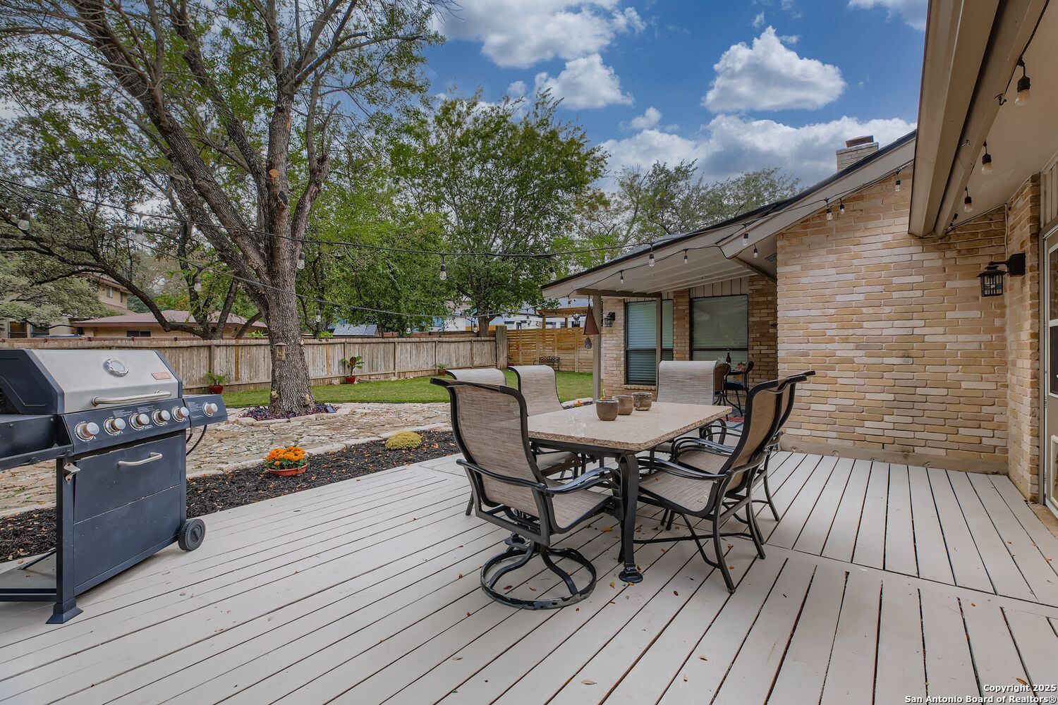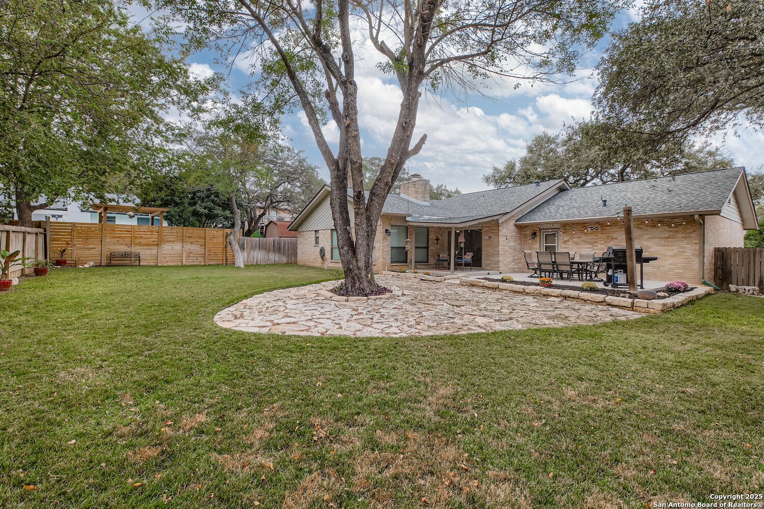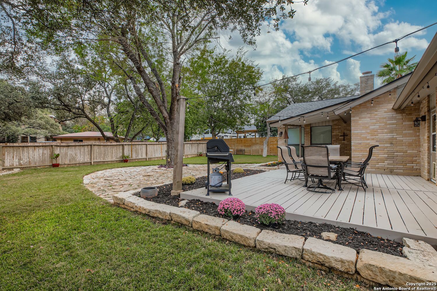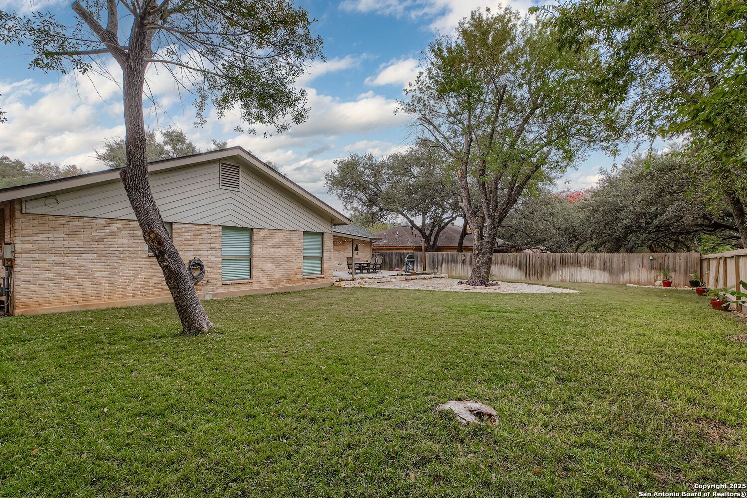 This single story Oak Hollow Estates residence is uniquely warm and elegant. It is superbly designed for both relaxation and entertaining. The moment you step inside, cathedral ceilings, stylish Saltillo tile and a grand fireplace establish the welcoming ambiance of the main living area - a space generous enough to accommodate gatherings with family or friends, yet intimate enough for quiet evenings. The kitchen is eye-catching with thoughtful functionality. Granite countertops provide a generous workspace that supports the gas-powered range and double ovens that most home cooks prefer. A breakfast nook with custom built-ins offers a place for everyday feel-good dining and morning coffee experiences as its oversized glass door windows overlook the tree lined yard. A separate dining room with plantation shutters provides distinct space for more formal gatherings. The three bedrooms include a primary suite that commands attention with its size and comfort and the primary bathroom sports large dual walk-in closets, an ultra- spacious shower, and dual vanities to create a personal retreat within the home. The family room is a perfect setting to enjoy movies or gaming - it is spacious and cozy with high ceilings and plenty of natural light. The outside property is an impressive asset, as it is beautiful, private, and large. The wide, tree lined backyard is secured by a privacy fence and transforms into a genuine extension of the home. A covered patio flows into an extended deck and flagstone area, creating distinct areas for different activities - whether you're grilling, lounging, or simply watching the Texas sky. An irrigation system keeps landscaping maintained without demanding your constant attention. The home sits within the NEISD school district, positioning you near quality educational options. At approximately 2,193 square feet, this layout balances spacious living with manageable maintenance, offering room for your life to unfold without excess.