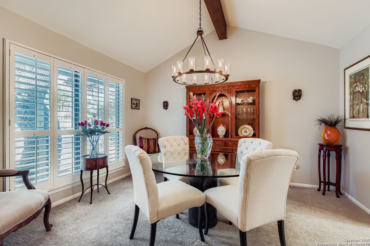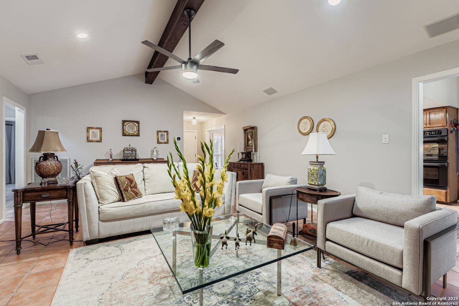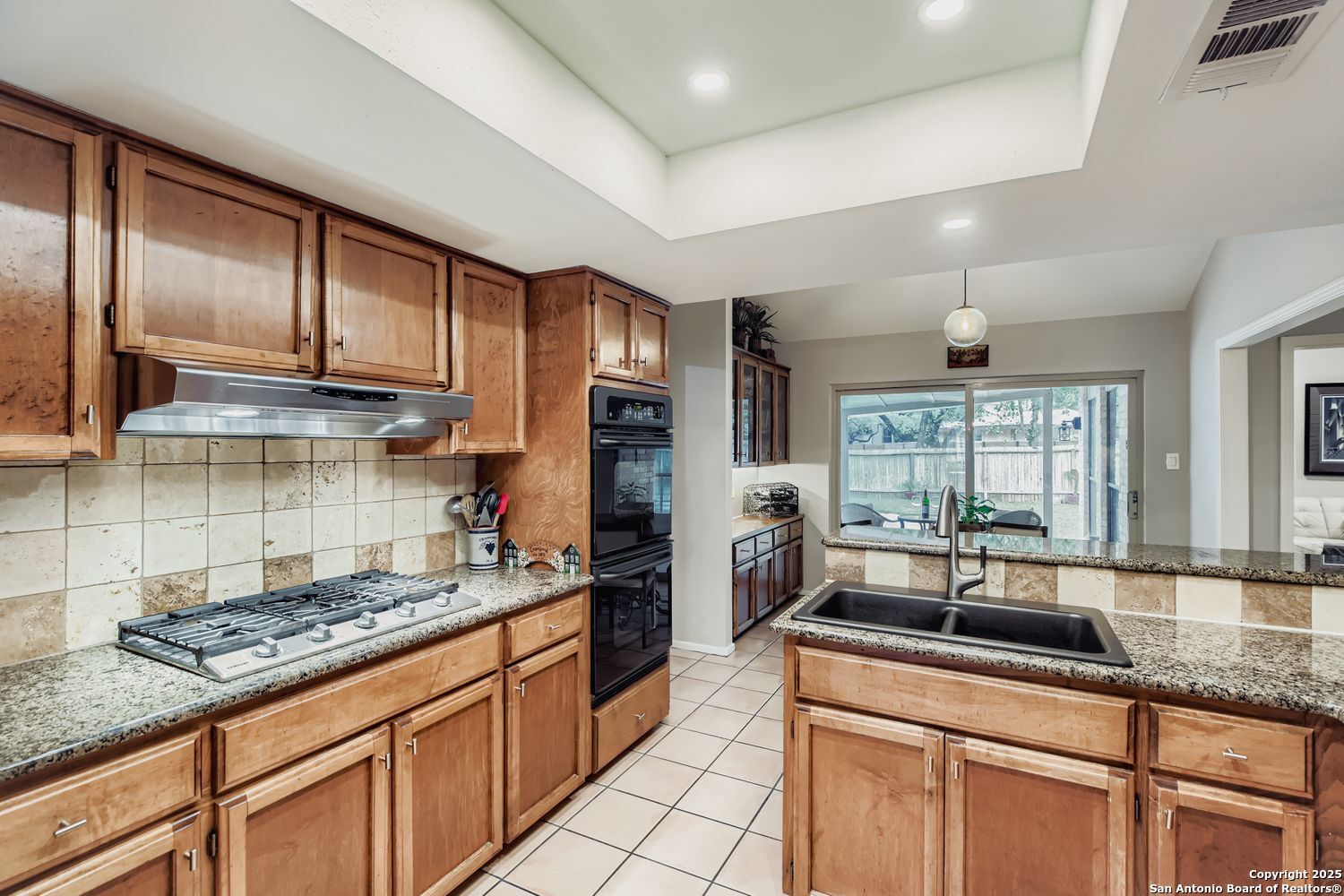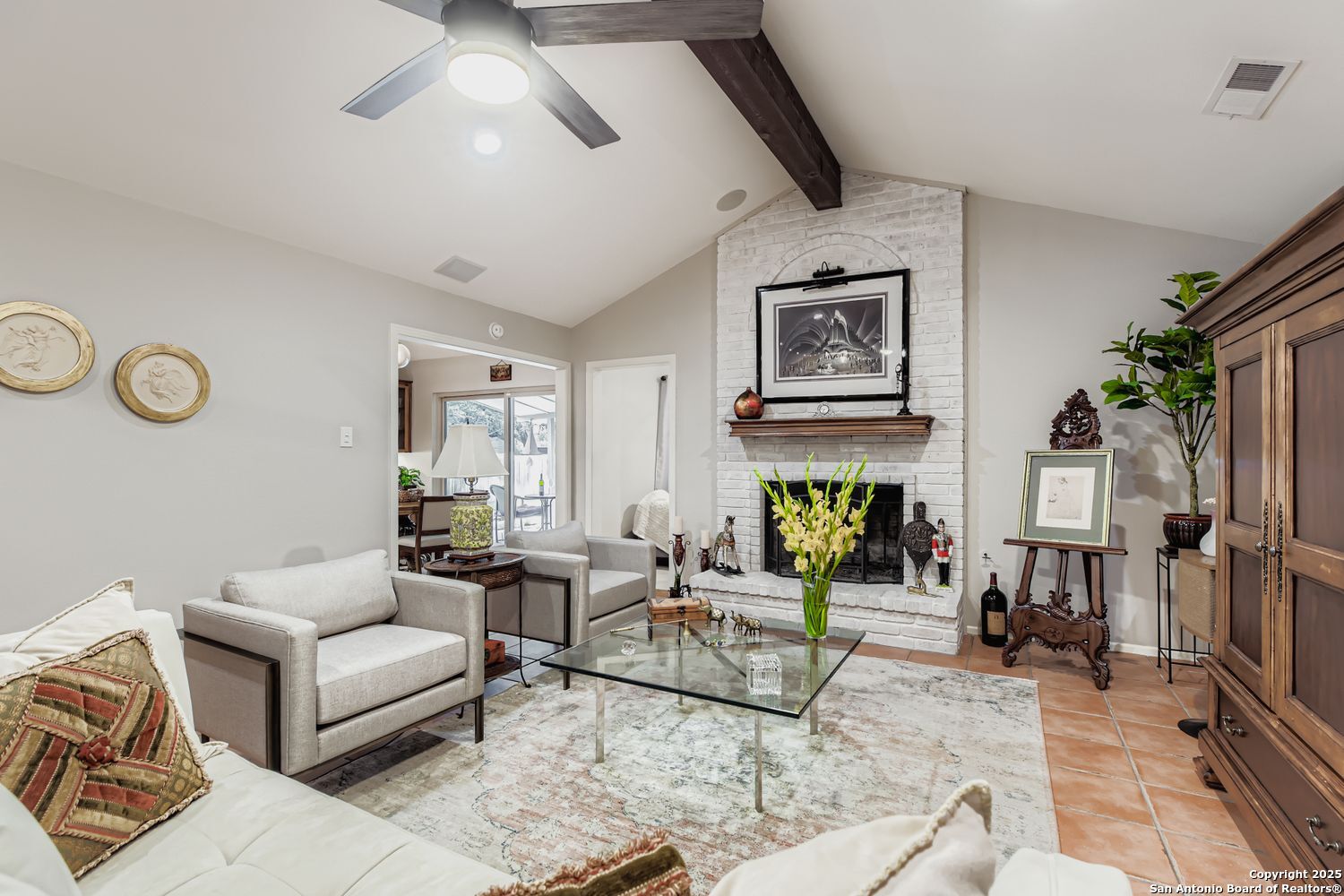 This single story Oak Hollow Estates residence is uniquely warm and elegant. It is superbly designed for both relaxation and entertaining. The moment you step inside, cathedral ceilings, stylish Saltillo tile and a grand fireplace establish the welcoming ambiance of the main living area - a space generous enough to accommodate gatherings with family or friends, yet intimate enough for quiet evenings. The kitchen is eye-catching with thoughtful functionality. Granite countertops provide a generous workspace that supports the gas-powered range and double ovens that most home cooks prefer. A breakfast nook with custom built-ins offers a place for everyday feel-good dining and morning coffee experiences as its oversized glass door windows overlook the tree lined yard. A separate dining room with plantation shutters provides distinct space for more formal gatherings. The three bedrooms include a primary suite that commands attention with its size and comfort and the primary bathroom sports large dual walk-in closets, an ultra- spacious shower, and dual vanities to create a personal retreat within the home. The family room is a perfect setting to enjoy movies or gaming - it is spacious and cozy with high ceilings and plenty of natural light. The outside property is an impressive asset, as it is beautiful, private, and large. The wide, tree lined backyard is secured by a privacy fence and transforms into a genuine extension of the home. A covered patio flows into an extended deck and flagstone area, creating distinct areas for different activities - whether you're grilling, lounging, or simply watching the Texas sky. An irrigation system keeps landscaping maintained without demanding your constant attention. The home sits within the NEISD school district, positioning you near quality educational options. At approximately 2,193 square feet, this layout balances spacious living with manageable maintenance, offering room for your life to unfold without excess.