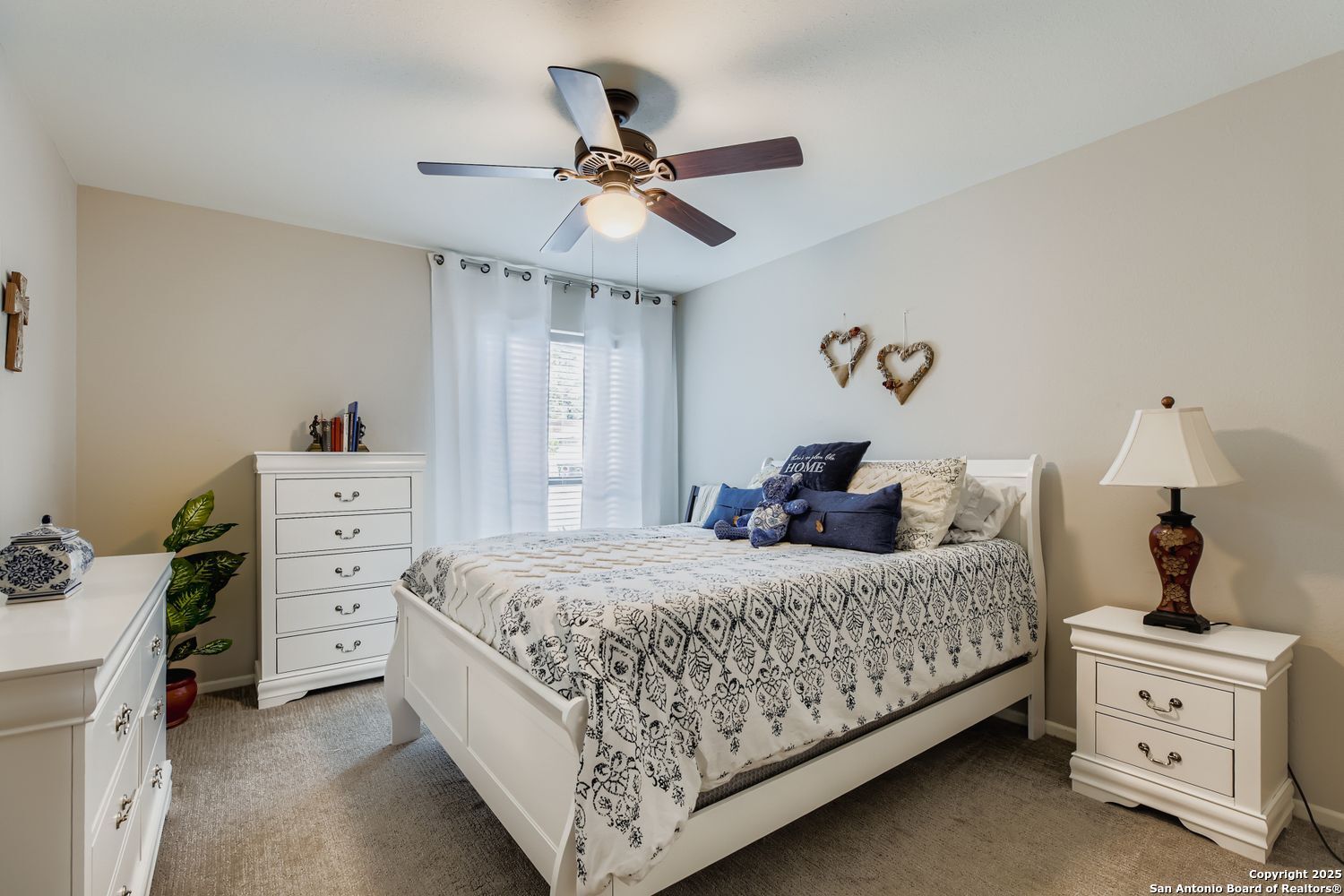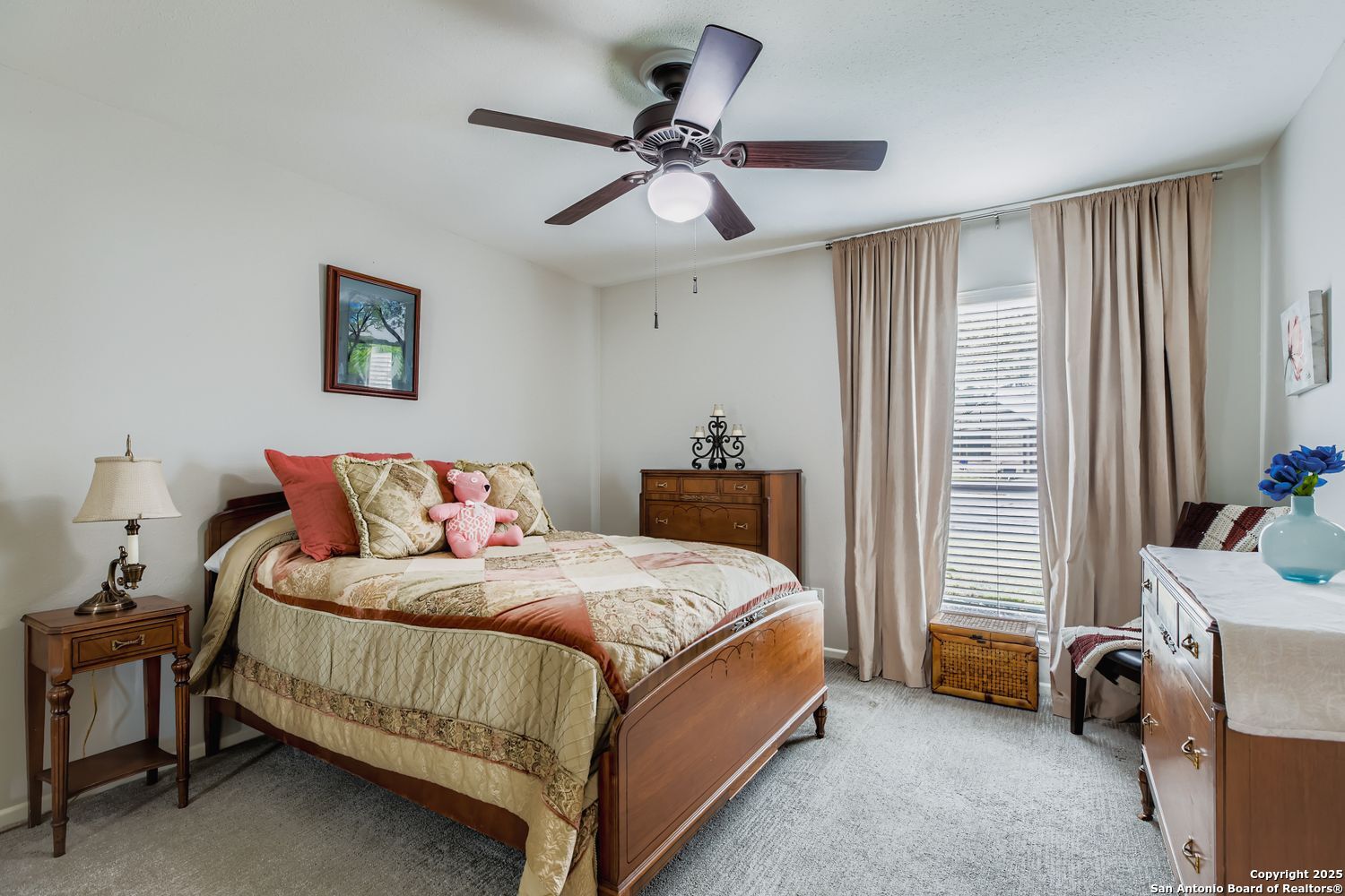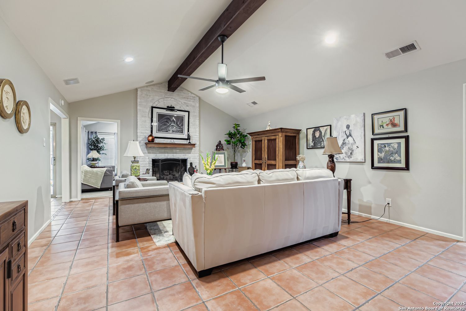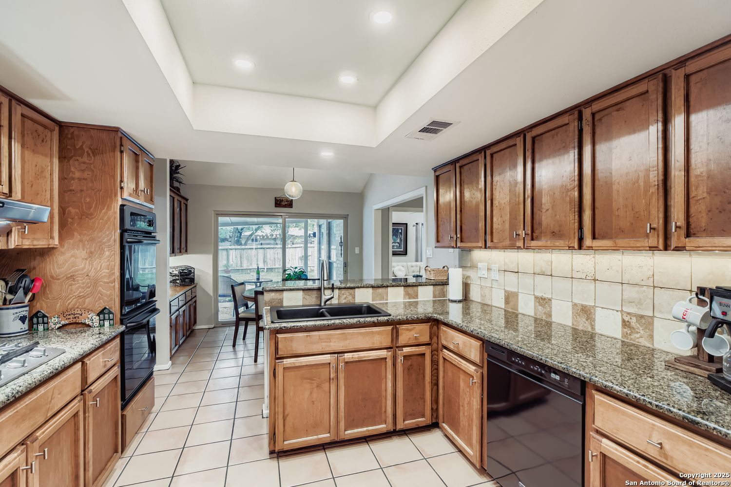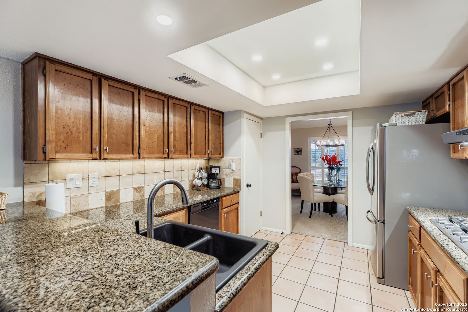 This single story Oak Hollow Estates residence is uniquely warm and elegant. It is superbly designed for both relaxation and entertaining. The moment you step inside, cathedral ceilings, stylish Saltillo tile and a grand fireplace establish the welcoming ambiance of the main living area - a space generous enough to accommodate gatherings with family or friends, yet intimate enough for quiet evenings. The kitchen is eye-catching with thoughtful functionality. Granite countertops provide a generous workspace that supports the gas-powered range and double ovens that most home cooks prefer. A breakfast nook with custom built-ins offers a place for everyday feel-good dining and morning coffee experiences as its oversized glass door windows overlook the tree lined yard. A separate dining room with plantation shutters provides distinct space for more formal gatherings. The three bedrooms include a primary suite that commands attention with its size and comfort and the primary bathroom sports large dual walk-in closets, an ultra- spacious shower, and dual vanities to create a personal retreat within the home. The family room is a perfect setting to enjoy movies or gaming - it is spacious and cozy with high ceilings and plenty of natural light. The outside property is an impressive asset, as it is beautiful, private, and large. The wide, tree lined backyard is secured by a privacy fence and transforms into a genuine extension of the home. A covered patio flows into an extended deck and flagstone area, creating distinct areas for different activities - whether you're grilling, lounging, or simply watching the Texas sky. An irrigation system keeps landscaping maintained without demanding your constant attention. The home sits within the NEISD school district, positioning you near quality educational options. At approximately 2,193 square feet, this layout balances spacious living with manageable maintenance, offering room for your life to unfold without excess.