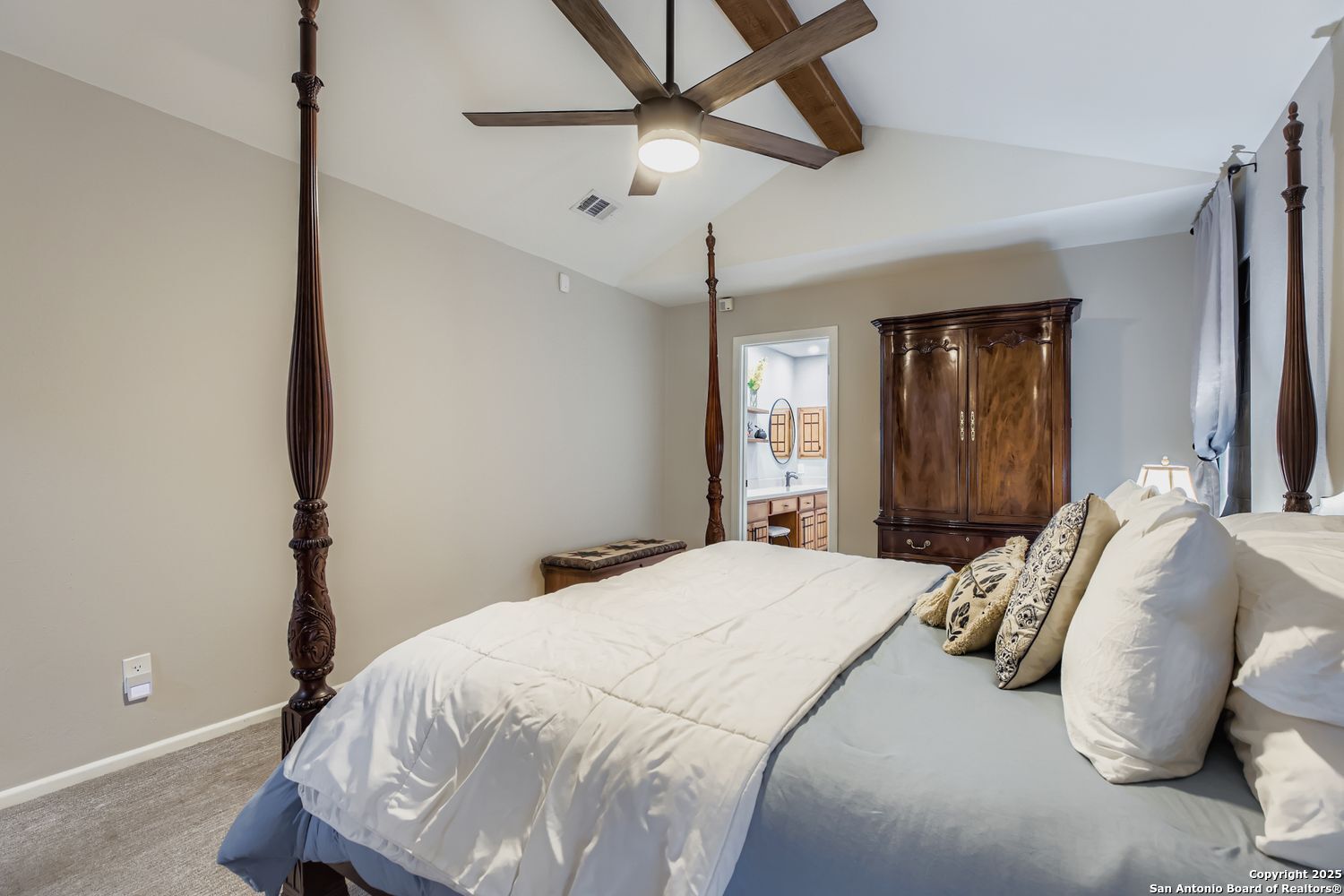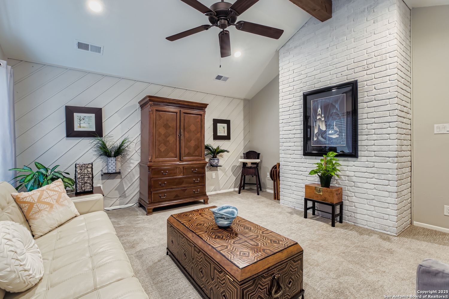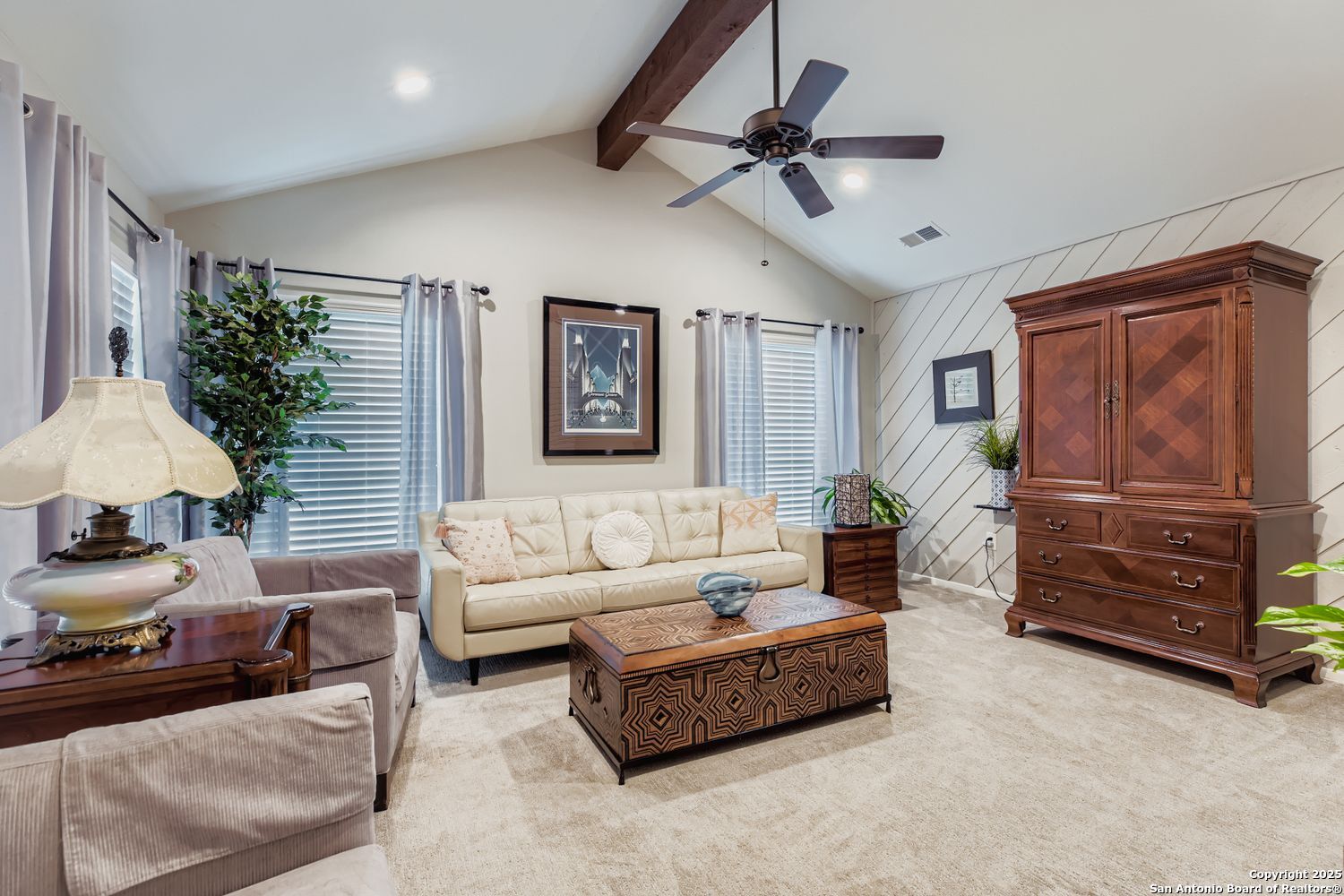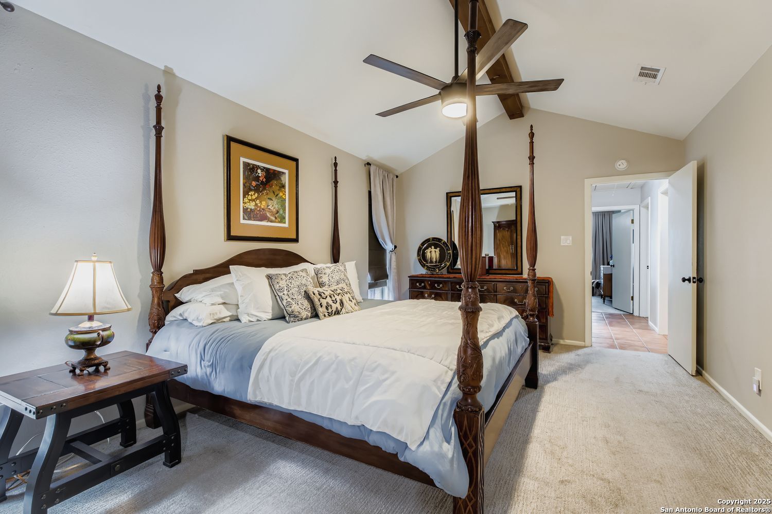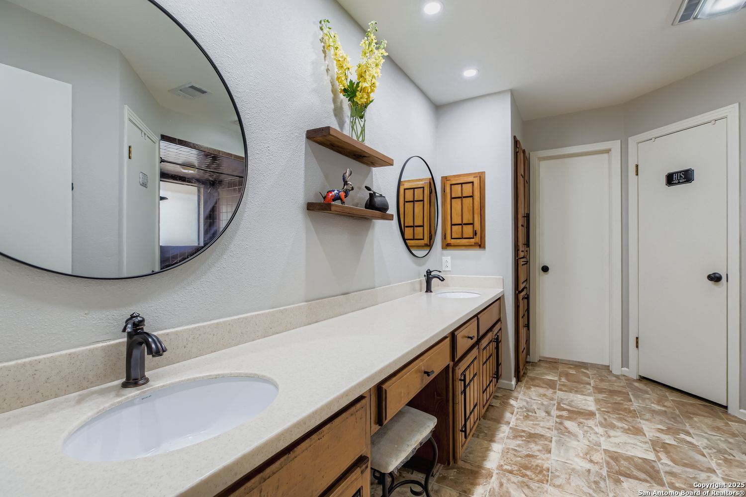 This single story Oak Hollow Estates residence is uniquely warm and elegant. It is superbly designed for both relaxation and entertaining. The moment you step inside, cathedral ceilings, stylish Saltillo tile and a grand fireplace establish the welcoming ambiance of the main living area - a space generous enough to accommodate gatherings with family or friends, yet intimate enough for quiet evenings. The kitchen is eye-catching with thoughtful functionality. Granite countertops provide a generous workspace that supports the gas-powered range and double ovens that most home cooks prefer. A breakfast nook with custom built-ins offers a place for everyday feel-good dining and morning coffee experiences as its oversized glass door windows overlook the tree lined yard. A separate dining room with plantation shutters provides distinct space for more formal gatherings. The three bedrooms include a primary suite that commands attention with its size and comfort and the primary bathroom sports large dual walk-in closets, an ultra- spacious shower, and dual vanities to create a personal retreat within the home. The family room is a perfect setting to enjoy movies or gaming - it is spacious and cozy with high ceilings and plenty of natural light. The outside property is an impressive asset, as it is beautiful, private, and large. The wide, tree lined backyard is secured by a privacy fence and transforms into a genuine extension of the home. A covered patio flows into an extended deck and flagstone area, creating distinct areas for different activities - whether you're grilling, lounging, or simply watching the Texas sky. An irrigation system keeps landscaping maintained without demanding your constant attention. The home sits within the NEISD school district, positioning you near quality educational options. At approximately 2,193 square feet, this layout balances spacious living with manageable maintenance, offering room for your life to unfold without excess.