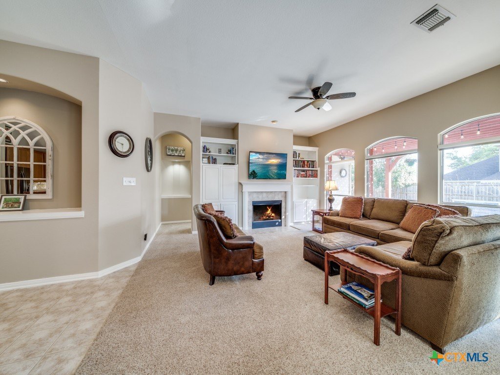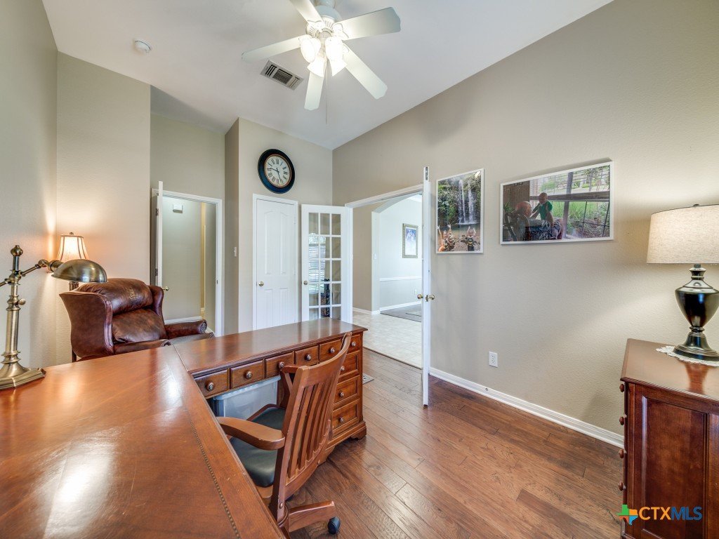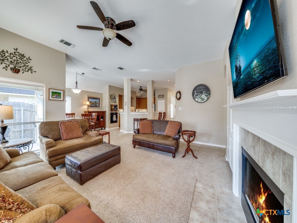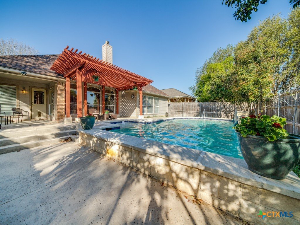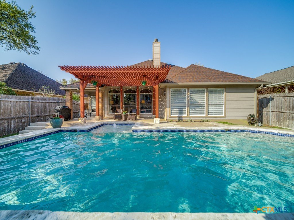 Here is your chance to live in the gated, well-established Champions Village neighborhood in New Braunfels, one of the most desirable cities in the country, for under $500,000, and have a pool. As you come through the front door, a hallway takes your eyes straight to the backyard with windows all along the back. Abundant natural light, open with tall ceilings, a very thoughtful floor plan for every day living and larger family gatherings. A generous formal dining space. An office with french doors that open into the main hallway and another door that opens into the side hallway that the secondary bedrooms, full bathroom, half bathroom, and utility room share. The kitchen is truly in the middle of everything with an updated Frigidaire oven and microwave with convection fan replaced in 2023. The star of the living room is the built in entertainment area with bookshelves and a wood burning fireplace in the center. The primary suite has its own dedicated space at the back of the home separate from the secondary bedrooms for extra privacy. Peaceful and bright with a perfect view of the pool from the wall of windows. The backyard is a true oasis. A gorgeous pool with two swim-up barstools, waterfall, and tanning ledge with bubbler fountain perfectly situated under the pergola. A Texas size patio with 2 levels, covered, and open. Dine al fresco with plenty of room to set up a grill, extra seating, a fire pit, whatever floats your boat. A 30-year roof was installed in 2019 and a Carrier 5-ton heat pump split system installed in 2015 along with an inside coil as well. Minutes from John Newcombe Tennis Ranch and Country Club, T Bar M Camp and Retreat Center, Dry Comal Creek Winery, HEB, restaurants, shopping, Landa Park. New Braunfels is home to Schlitterbahn, Wurstfest, holiday parades, tubing on the Comal and Guadalupe Rivers, a downtown that still has a small town charm to it and German influence, neighbor to Gruene Historic District.