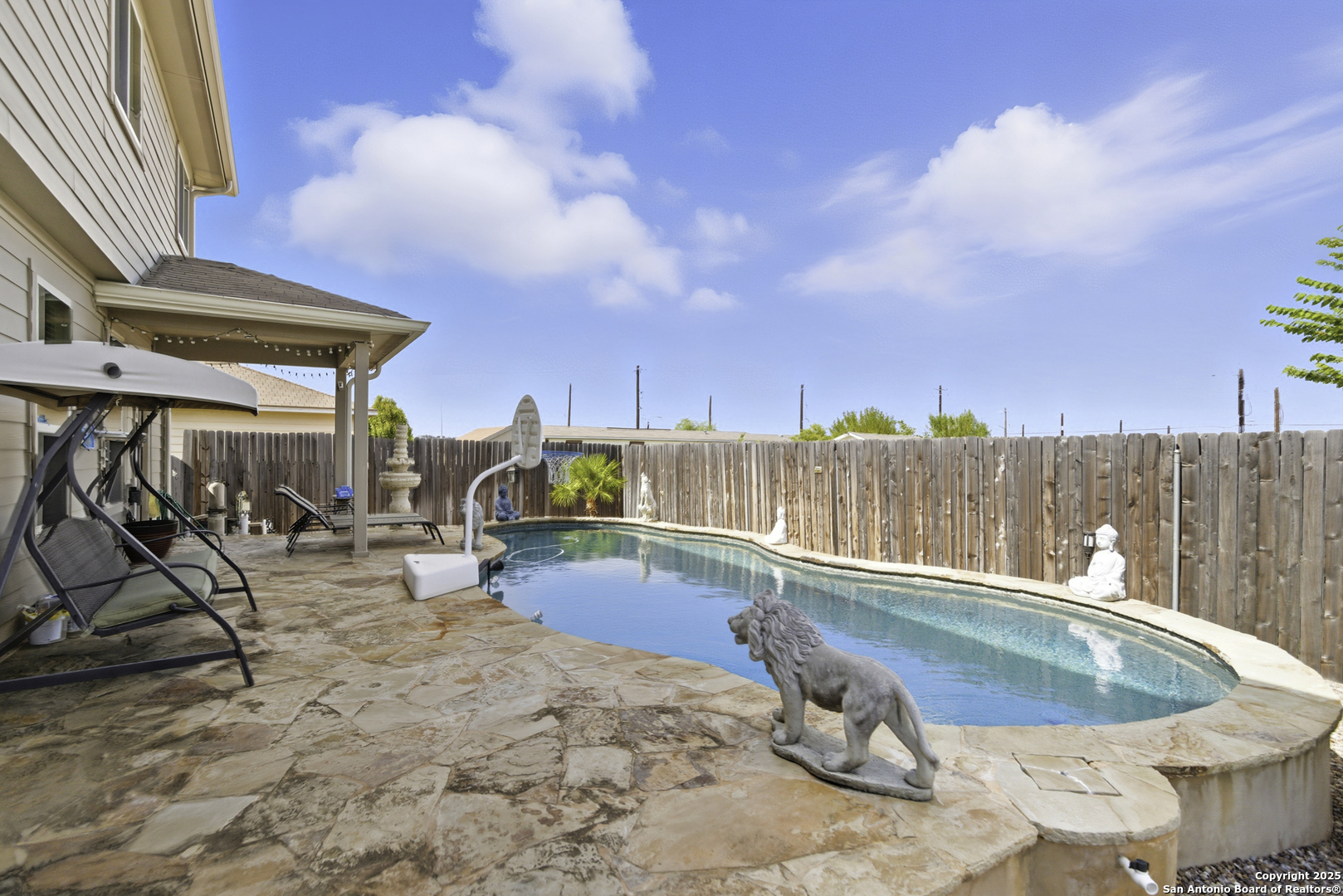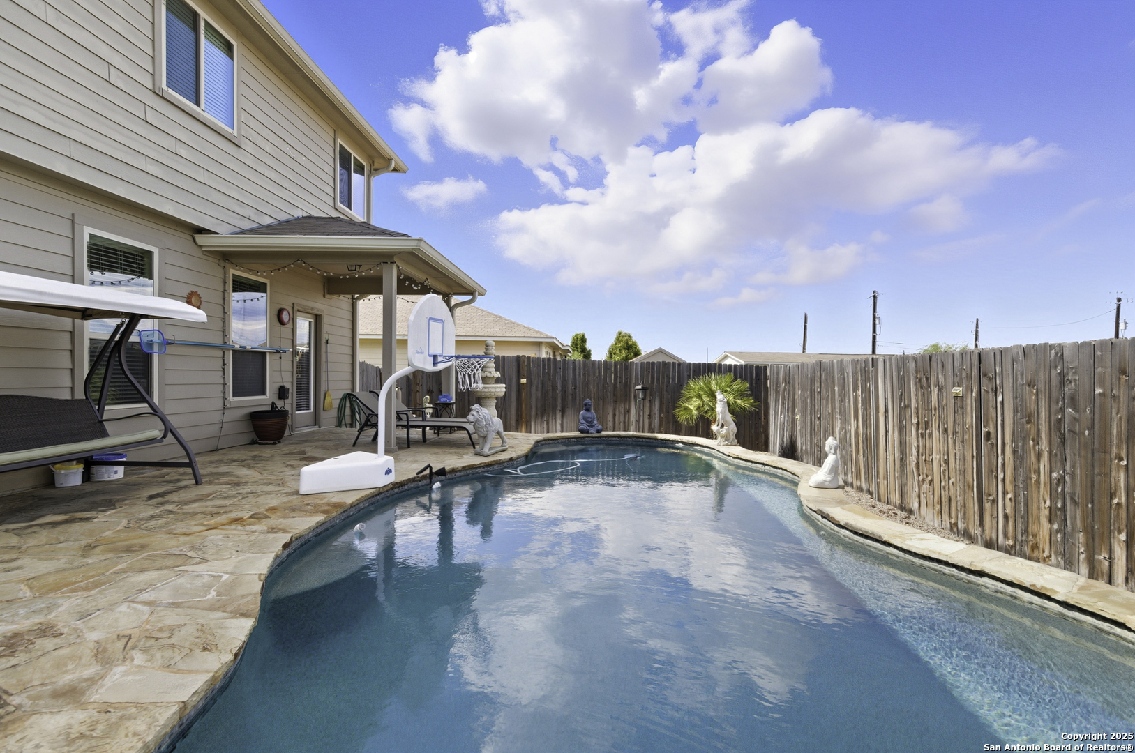 Come See this 4 bdrm 2.5 bath home it shows like new. Very well maintained! Primary bedroom, bath and 1/2 bath is downstairs, with 3 bedrooms and 1 full bath upstairs. Open concept with high ceilings in the Living room being separated only by the breakfast bar to the kitchen. Beautiful landscaping!! Enjoy the backyard lounging under the covered patio while entertaining or just enjoying the gorgeous pool. Sprinkler system in the front yard. Storage Building in the backyard with plenty room for lawn equipment. All ceiling fans and chandeliers to remain. Garage and Driveway have been finished out and tile placed under the covered patio in the front of the home adding to the immaculate taste this home has to offer. Don't delay schedule your showing today!!