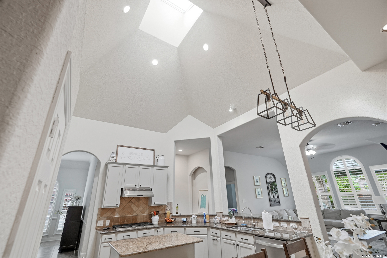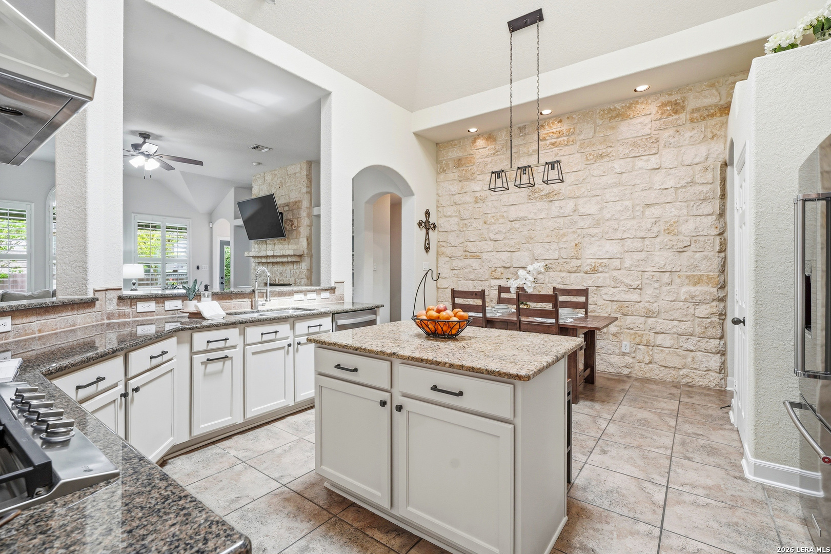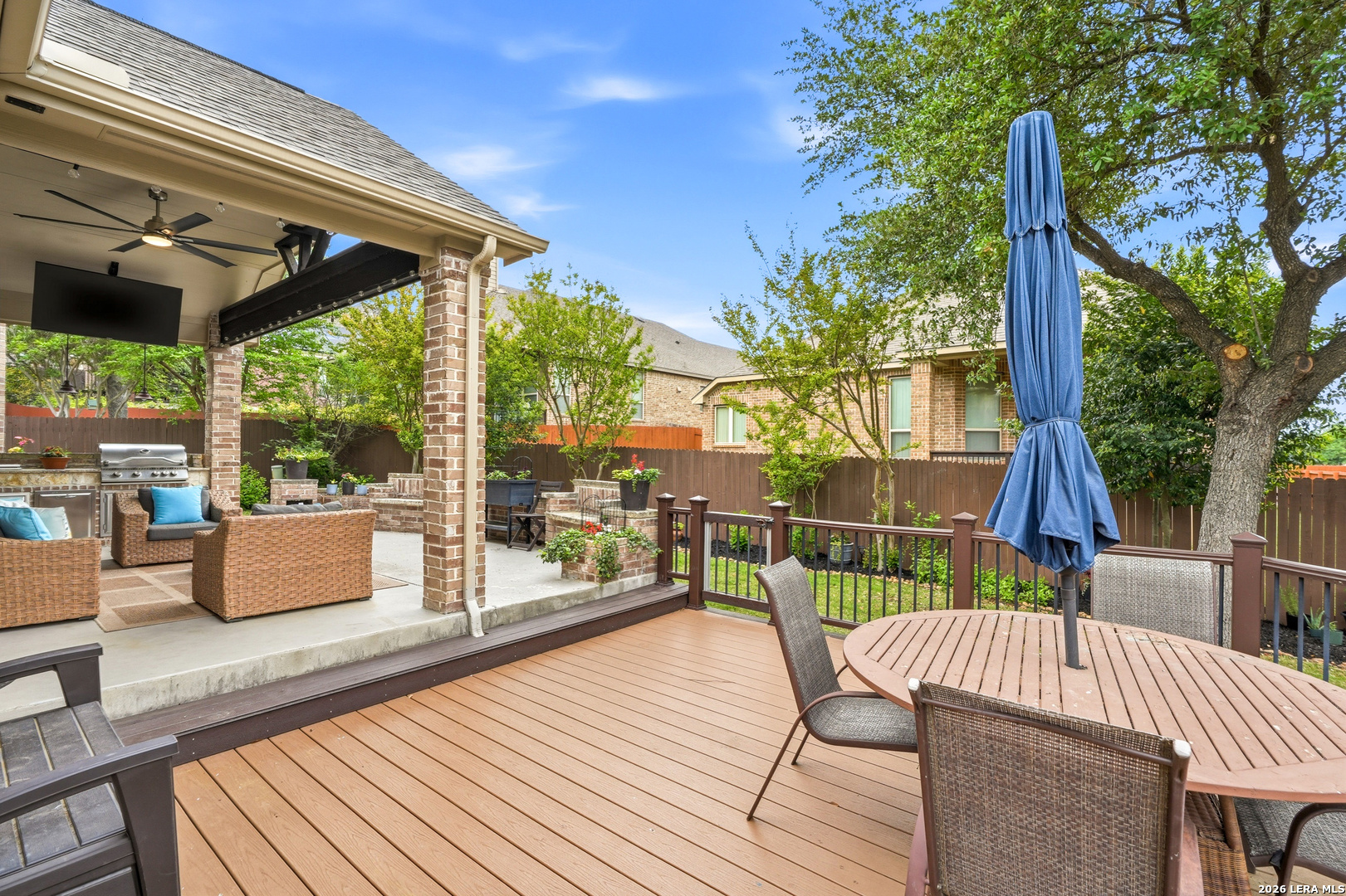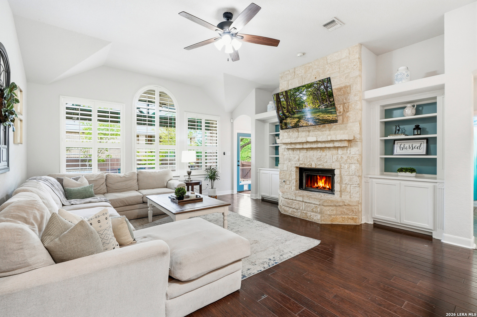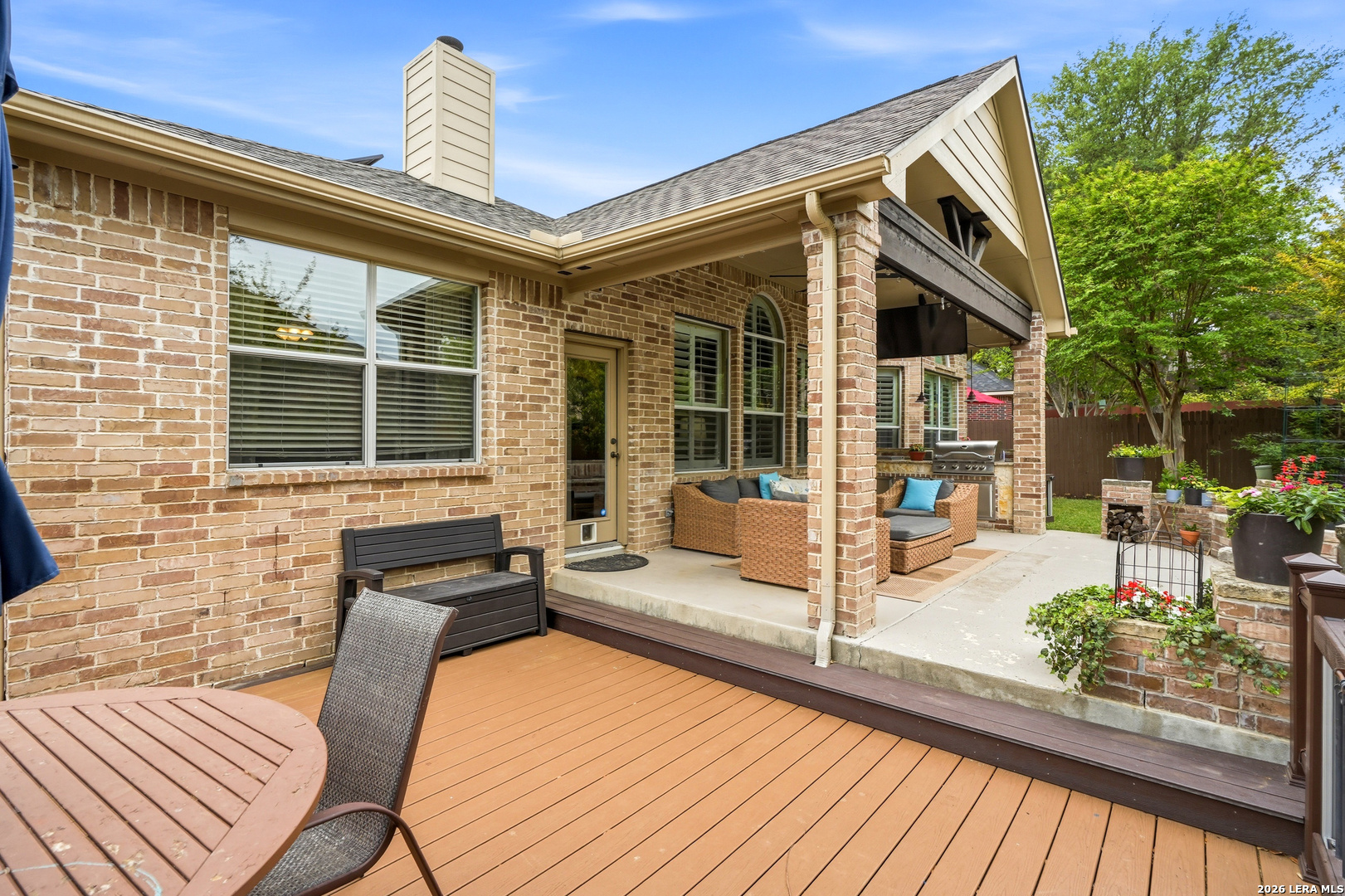 Stunning 1.5-story home with incredible curb appeal under mature oak trees, soaring ceilings, abundant natural light, and a beautifully designed outdoor living space with covered patio, deck, and outdoor kitchen. Inside, enjoy a spacious, light-filled layout with elegant architectural details including arched openings, high ceilings, and plantation shutters. The open-concept design flows seamlessly from the chef's kitchen into the main living and dining areas-perfect for everyday living and entertaining. The kitchen features vaulted ceilings with a skylight, an oversized island, white cabinetry with updated hardware, built-in stainless steel appliances, and gas cooking. It opens to a stunning family room with a floor-to-ceiling stone fireplace, built-ins, and large windows that flood the space with natural light. All bedrooms are located downstairs, including a private primary suite with a curved wall of windows, large walk-in closet, double vanities, separate shower, and garden tub. Upstairs offers a versatile game room and half bath. Step outside to your private backyard retreat with a covered patio, wood beam ceiling, extended deck, and outdoor kitchen-ideal for relaxing or entertaining. Additional highlights include tile flooring in main areas, new carpet, updated lighting, a recently replaced roof, and solar panels. Located in highly sought-after Comal ISD and zoned to Pieper High School, with gated access, community pool, playground, and no city taxes.