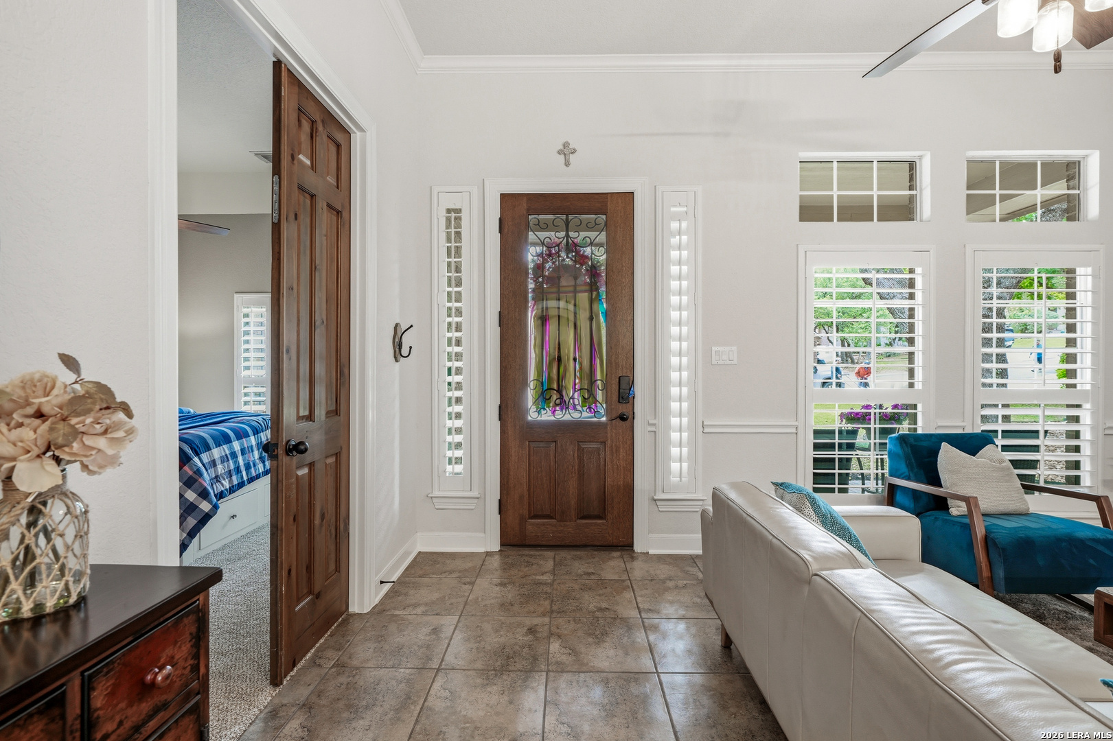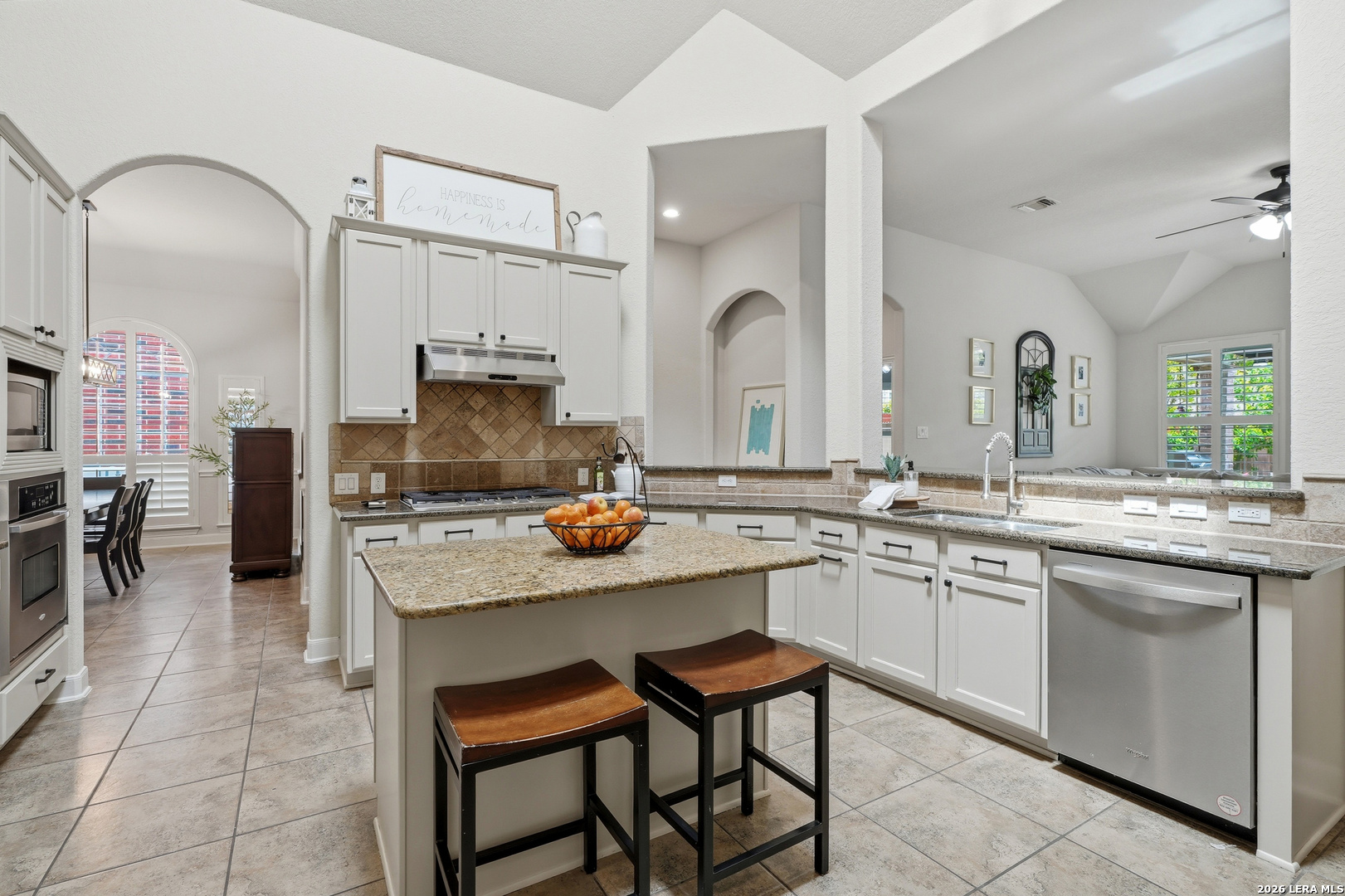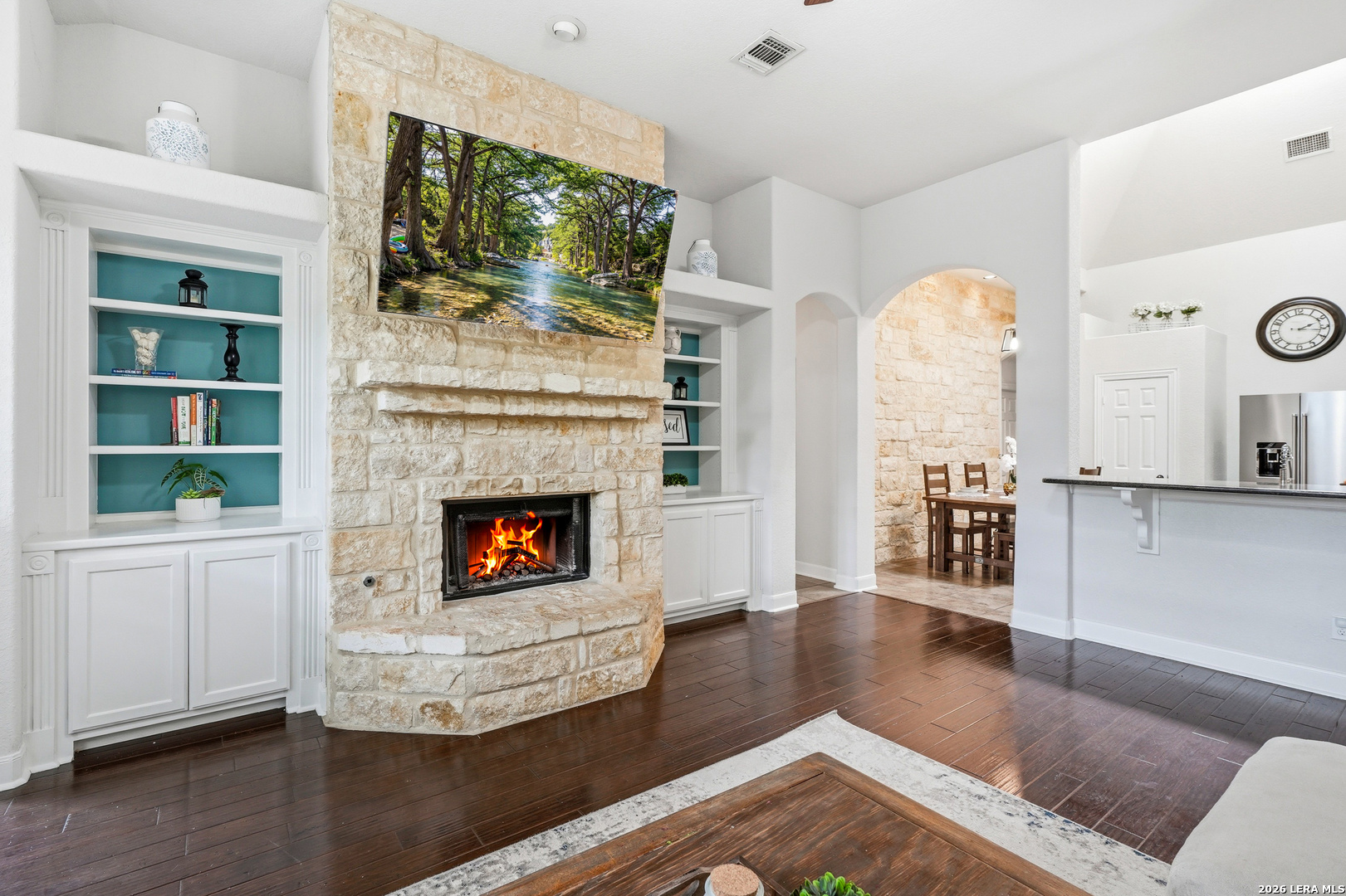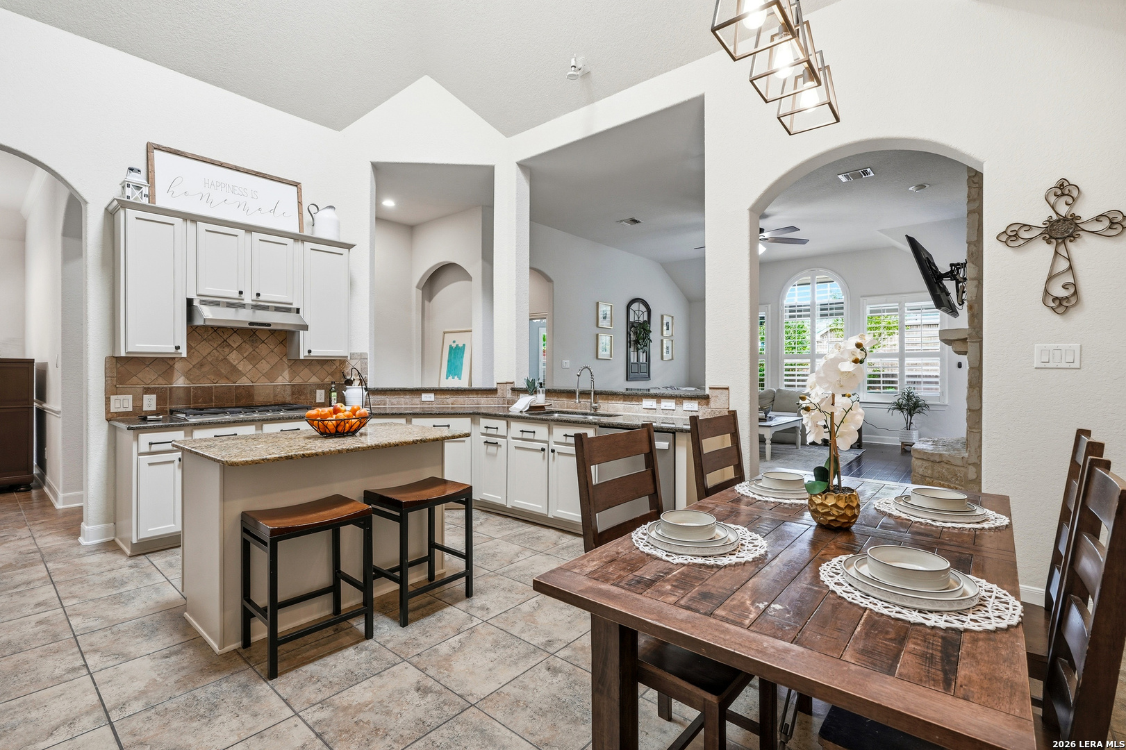 Stunning 1.5-story home with incredible curb appeal under mature oak trees, soaring ceilings, abundant natural light, and a beautifully designed outdoor living space with covered patio, deck, and outdoor kitchen. Inside, enjoy a spacious, light-filled layout with elegant architectural details including arched openings, high ceilings, and plantation shutters. The open-concept design flows seamlessly from the chef's kitchen into the main living and dining areas-perfect for everyday living and entertaining. The kitchen features vaulted ceilings with a skylight, an oversized island, white cabinetry with updated hardware, built-in stainless steel appliances, and gas cooking. It opens to a stunning family room with a floor-to-ceiling stone fireplace, built-ins, and large windows that flood the space with natural light. All bedrooms are located downstairs, including a private primary suite with a curved wall of windows, large walk-in closet, double vanities, separate shower, and garden tub. Upstairs offers a versatile game room and half bath. Step outside to your private backyard retreat with a covered patio, wood beam ceiling, extended deck, and outdoor kitchen-ideal for relaxing or entertaining. Additional highlights include tile flooring in main areas, new carpet, updated lighting, a recently replaced roof, and solar panels. Located in highly sought-after Comal ISD and zoned to Pieper High School, with gated access, community pool, playground, and no city taxes.