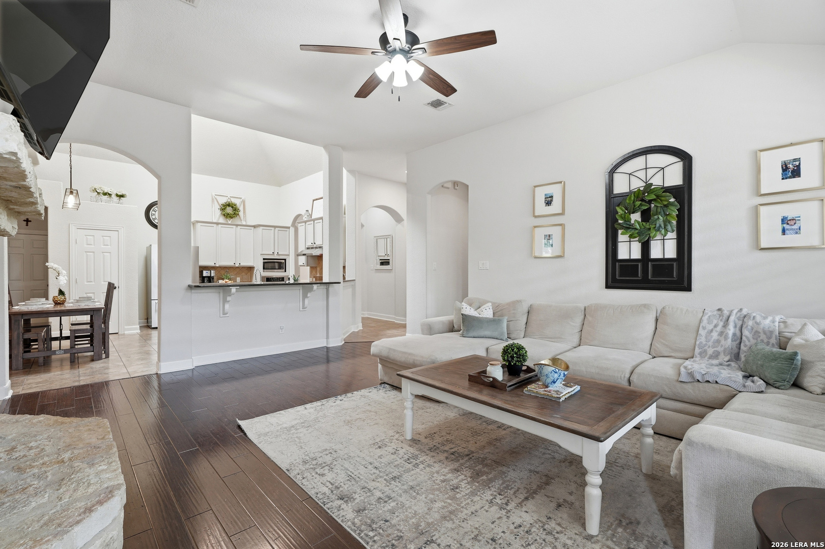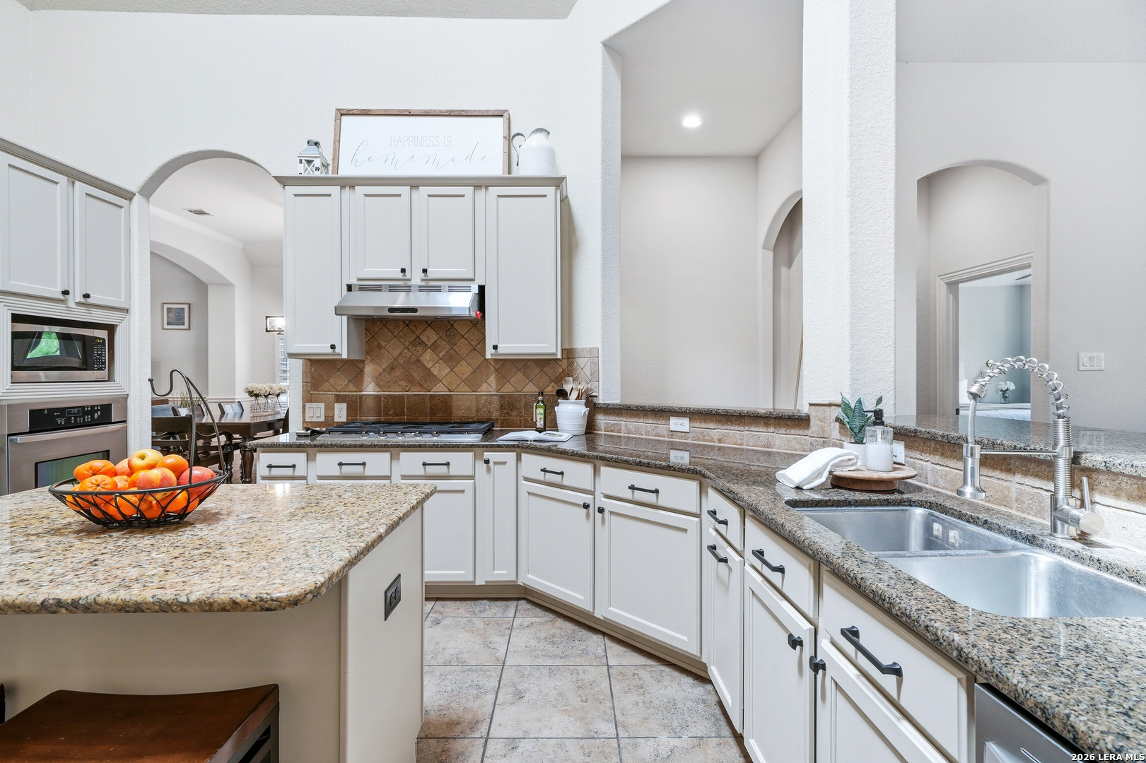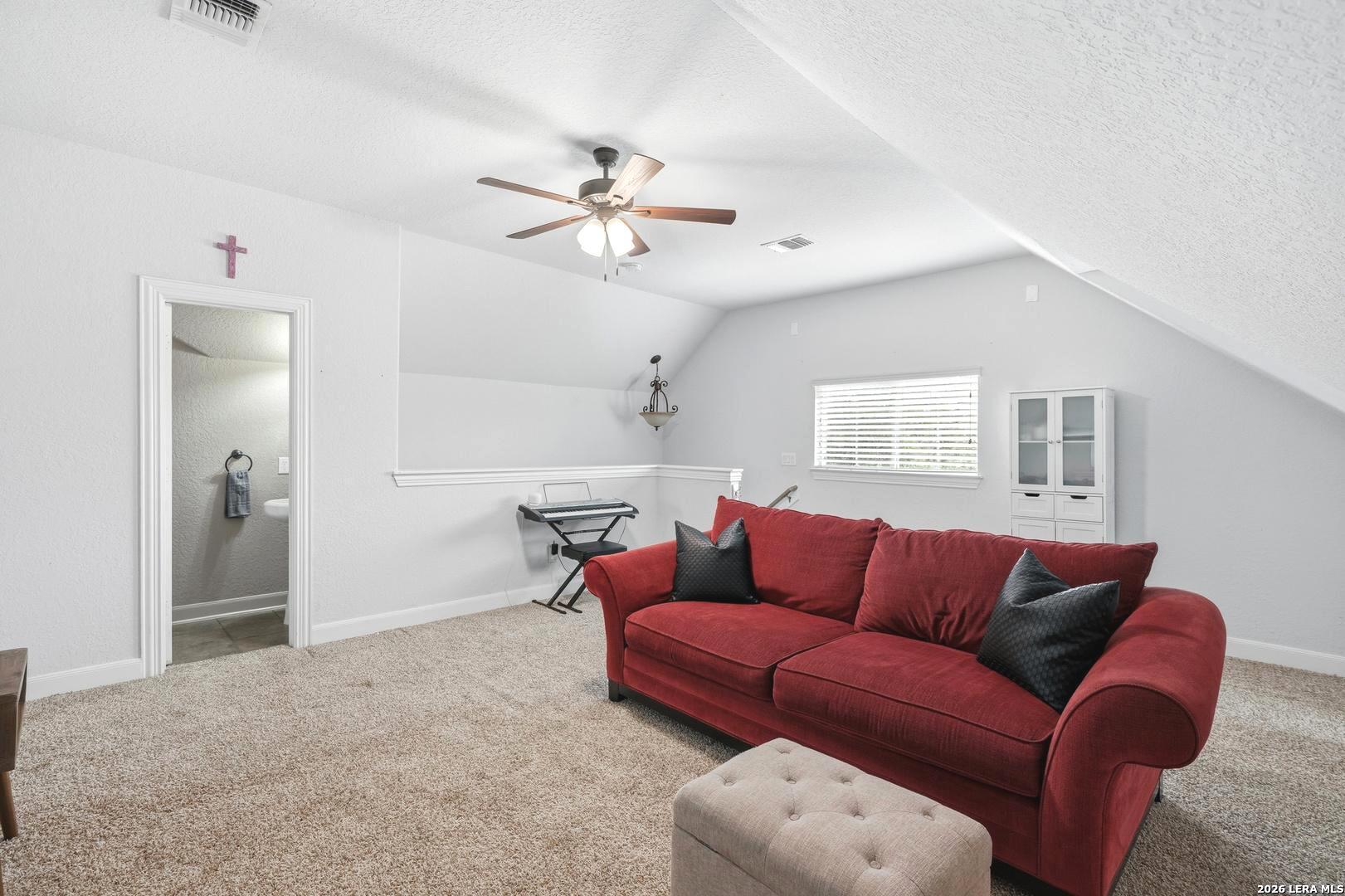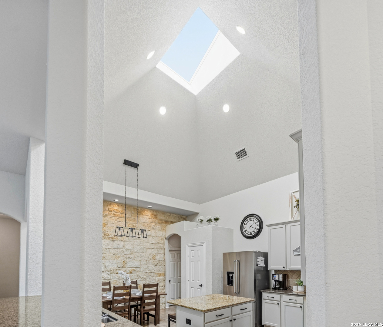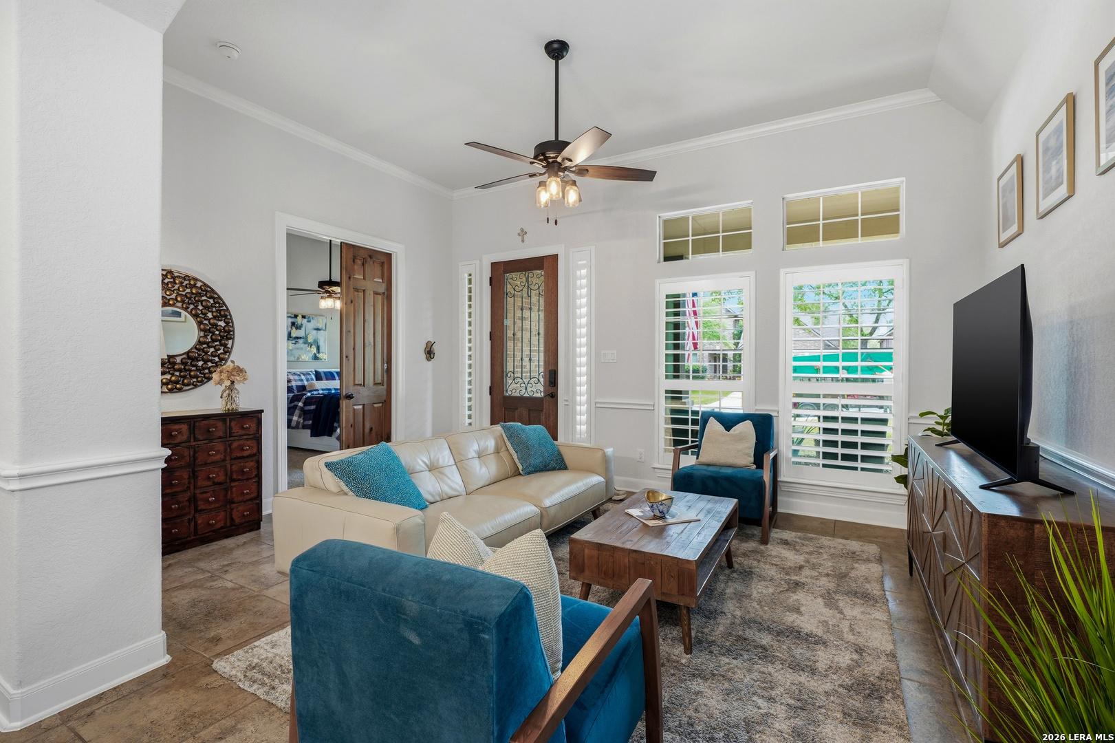 Stunning 1.5-story home with incredible curb appeal under mature oak trees, soaring ceilings, abundant natural light, and a beautifully designed outdoor living space with covered patio, deck, and outdoor kitchen. Inside, enjoy a spacious, light-filled layout with elegant architectural details including arched openings, high ceilings, and plantation shutters. The open-concept design flows seamlessly from the chef's kitchen into the main living and dining areas-perfect for everyday living and entertaining. The kitchen features vaulted ceilings with a skylight, an oversized island, white cabinetry with updated hardware, built-in stainless steel appliances, and gas cooking. It opens to a stunning family room with a floor-to-ceiling stone fireplace, built-ins, and large windows that flood the space with natural light. All bedrooms are located downstairs, including a private primary suite with a curved wall of windows, large walk-in closet, double vanities, separate shower, and garden tub. Upstairs offers a versatile game room and half bath. Step outside to your private backyard retreat with a covered patio, wood beam ceiling, extended deck, and outdoor kitchen-ideal for relaxing or entertaining. Additional highlights include tile flooring in main areas, new carpet, updated lighting, a recently replaced roof, and solar panels. Located in highly sought-after Comal ISD and zoned to Pieper High School, with gated access, community pool, playground, and no city taxes.
