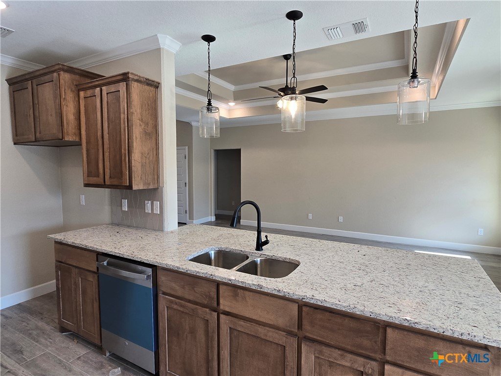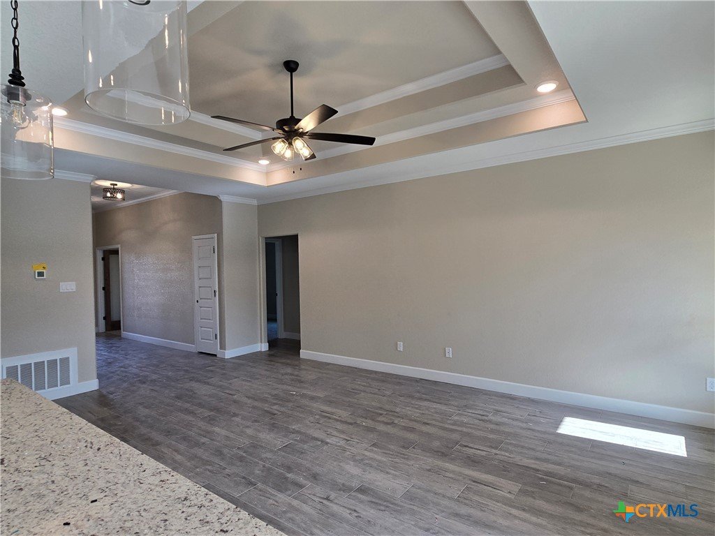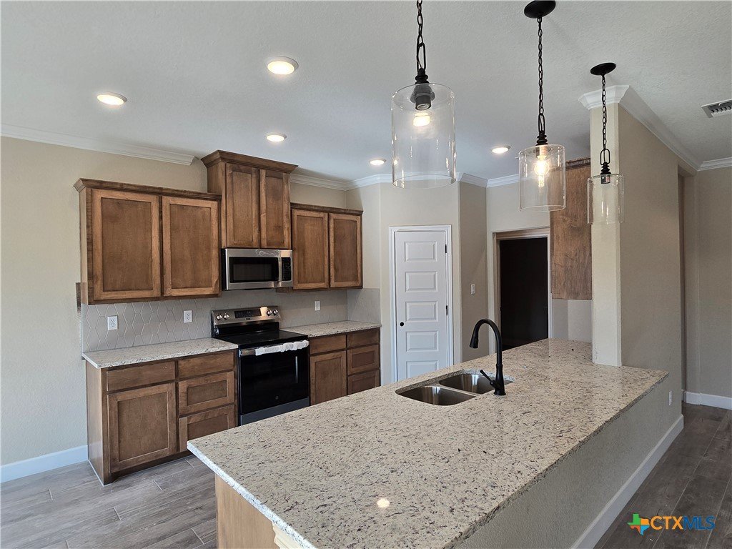 Another beauty built by Eagle Homes. This 4 bedroom, 2 bath, 3 car garage home is situated in Belton ISD. Entry has large pop up decorative tray ceiling. Kitchen boasts granite counter tops, custom cabinets, and stainless steel appliances. Wood looking tile in all wet and common areas with a shiplap decorated electric fire place. Master bath has separate free standing tub & walk- in shower, large walk-in closet, crown molding, split floor plan. 3 secondary bedrooms' and bathroom are located on the other side of the home. Kitchen opens into family room & family room looks out onto the covered patio. Backyard has full Sod, privacy fenced backyard, & sprinkler system front & back.