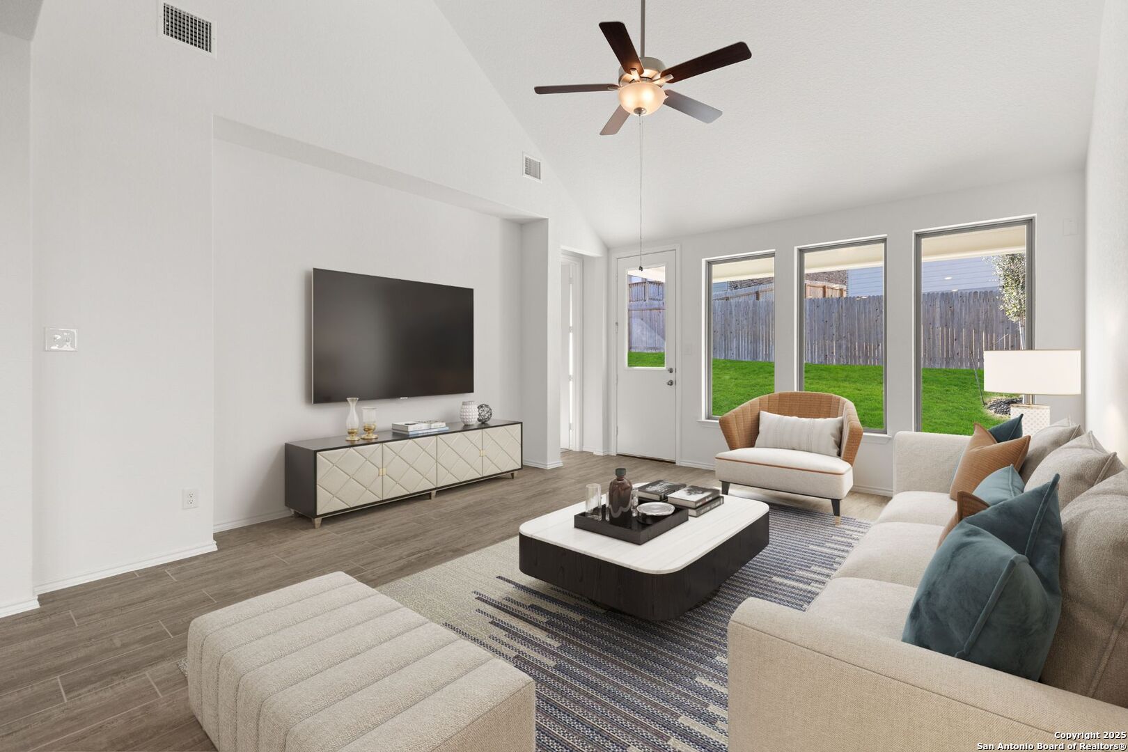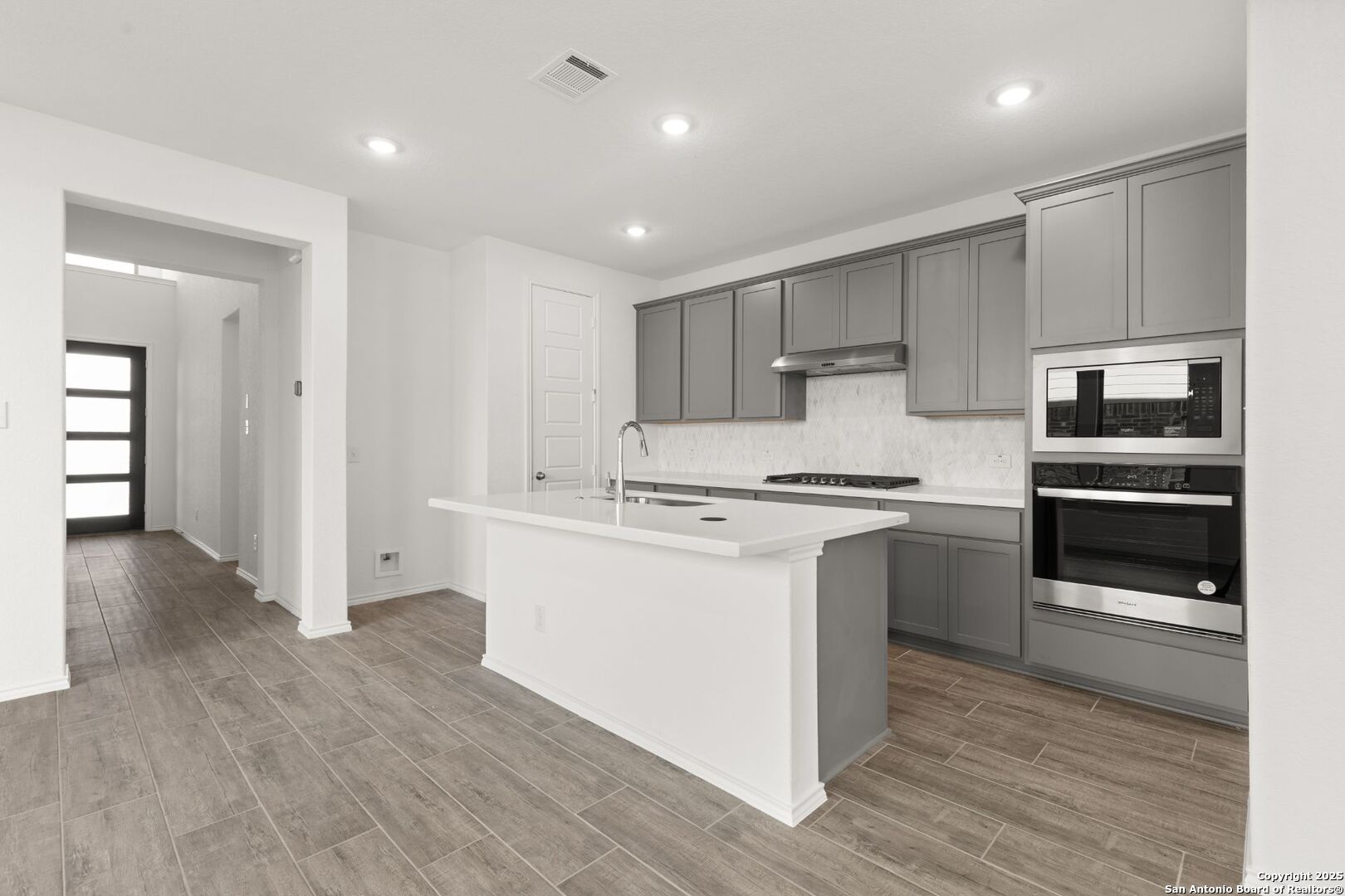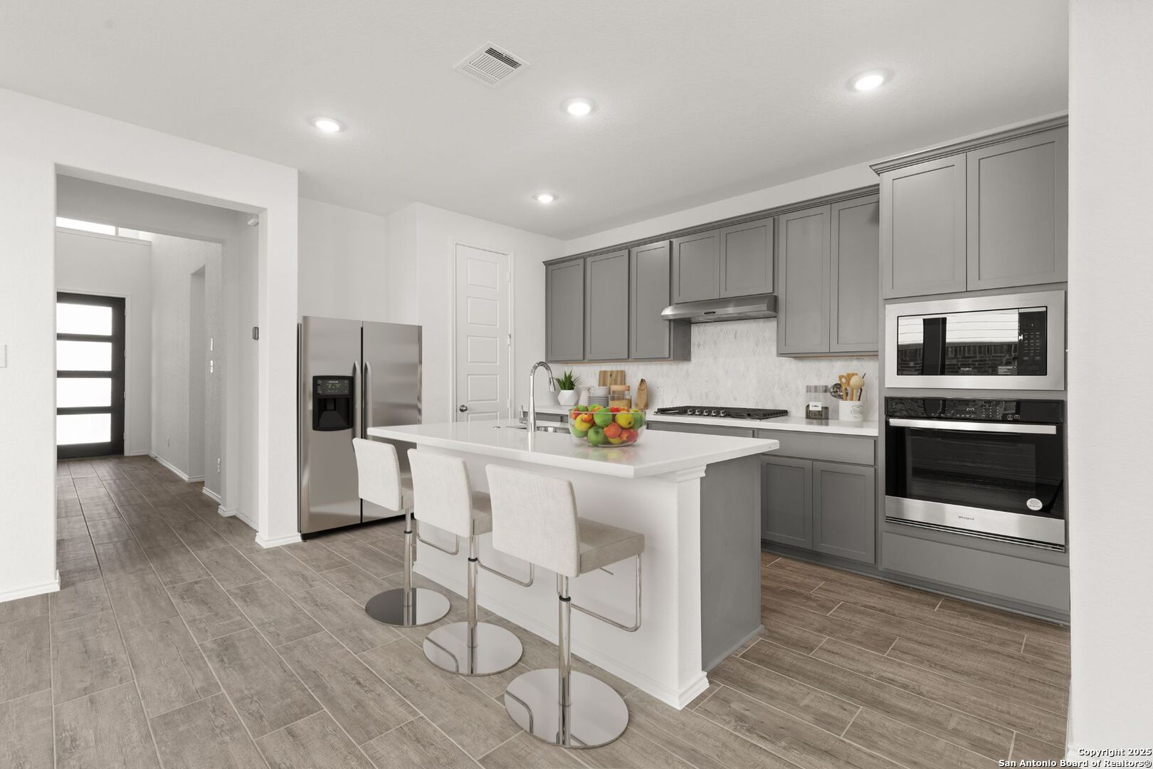 Welcome to this stunning two-story home, where a grand foyer greets you with soaring ceilings and exquisite wood tile flooring. The gourmet kitchen is a chef's dream, featuring upgraded cabinetry, sleek solid surface countertops, and a spacious island that enhances the open-concept design. The primary bedroom offers a serene retreat, complete with a private bath that includes a separate shower and soaking tub. An additional bedroom with a full bath on the main floor provides added convenience for guests. Upstairs, the expansive game room overlooks the great room, creating an ideal space for entertaining or relaxing with family and friends. Step outside to your backyard oasis, perfect for hosting BBQs or enjoying quality time with loved ones. Don't miss the opportunity to own this highly sought-after floor plan-schedule your tour today!