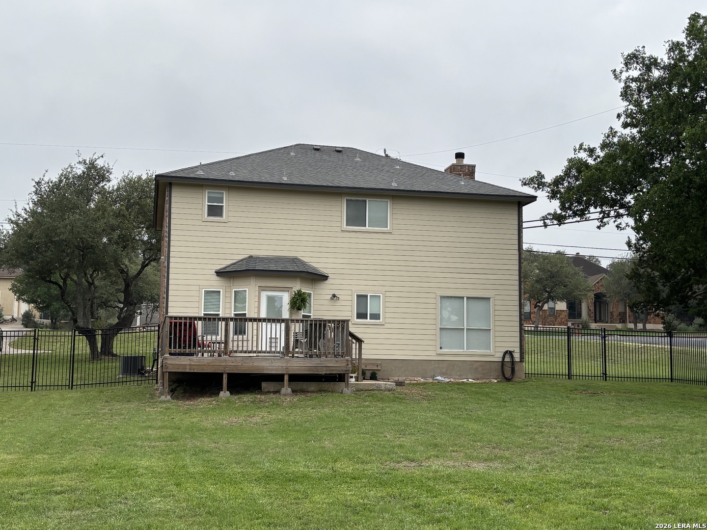 This beautifully maintained two-story home sits on a desirable corner lot and features a spacious fenced backyard with lush green grass.The expansive attached deck is perfect for relaxing, entertaining, or customizing to your needs. Step inside to an inviting interior highlighted by a cozy wood-burning fireplace in the living room that flows seamlessly into the dining room. The floor to ceiling windows provide an abundance of natural light. The kitchen offers abundant counter space, stainless steel appliances, and a cozy breakfast nook for enjoying your morning coffee while watching the wildlife in your backyard. A separate utility room just off the kitchen adds convenience and functionality. Upstairs, you'll find a versatile loft space ideal for a home office or additional living area, as well as all 3 bedrooms and a full bath. The owner's suite lives up to its name; spacious and thoughtfully upgraded. The ensuite features a large, beautifully tiled shower with bench and partial glass enclosure. The custom double vanity, and stylish lighting and mirrors tie the space together. A linen closet and generously sized walk-in closet complete the retreat. Located in Timberwood Park, this home is a must-see and won't last long.