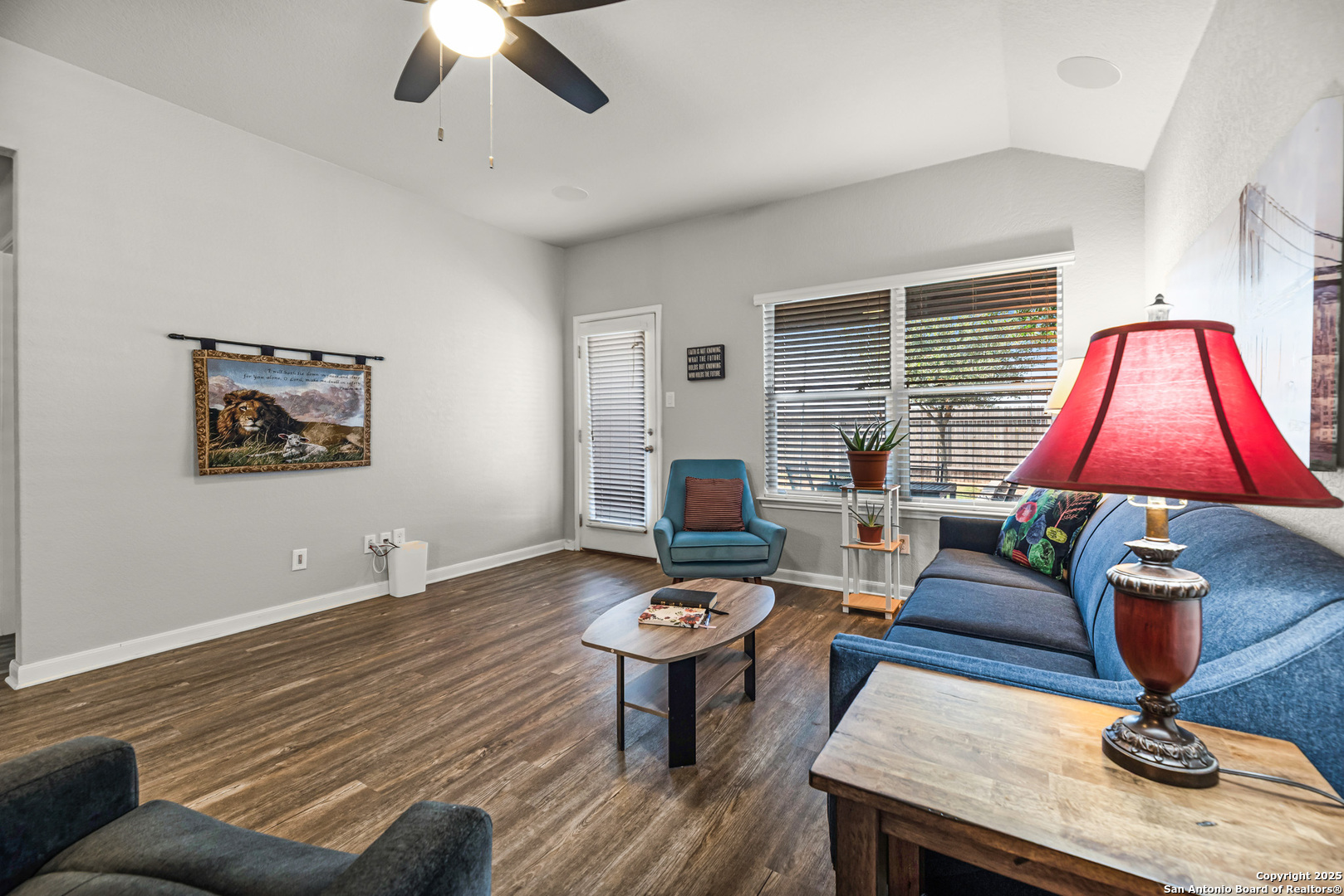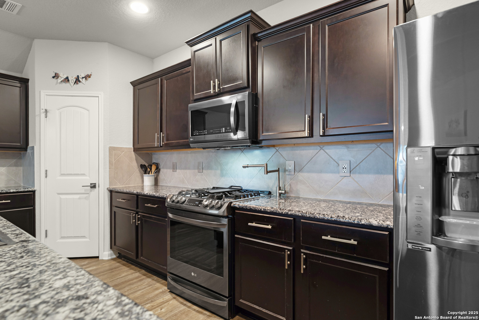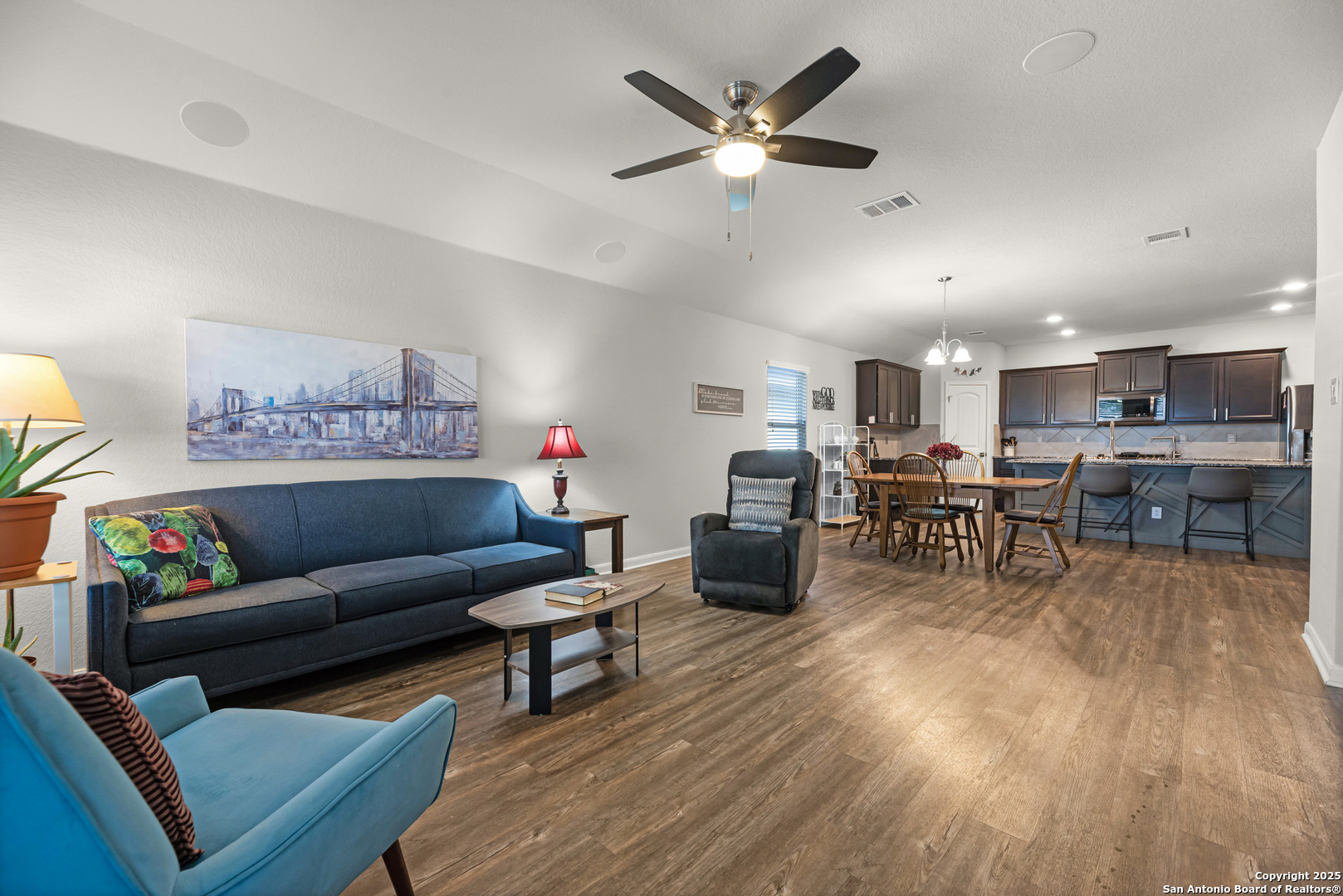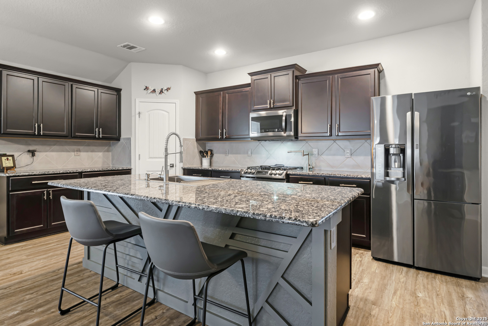 Welcome to a very well cared for and gently lived in home, that was recently refreshed with new carpet and a freshly repainted interior, on 08/23/25. This beautiful single story 4/2/2, with 1,692 sq. ft, offers an open floor concept with numerous upgrades. The kitchen features granite counter tops, a gas cook top with a very convenient pot-filler, next to the cook top, a spacious granite top island that overlooks the dining area and living area, as well as a seating area on the granite top island. This beautiful home has many upgrades such as upgraded appliances, to include a steam dishwasher, range with gas cook top with a center griddle, dual beverage refrigerators in the serving niche, located in the kitchen area, In addition, the entire house is smart wired and has surround sound wired into the ceiling in the living room for amazing sound that enhances your entertainment experience. The ceiling fans have been upgraded in the bedrooms and living room. Two of the bedrooms have walk in closets and the two bathrooms have tile surround in the shower and bathtubs, as well as built in night lights. The healthy landscape and trees offer a beautiful ambiance for you to enjoy your home, while sitting out on the covered back porch or deck. This home offers many more features than any home on the market today, in this area, for an unbelievable price point. Do not miss out on this home that is conveniently located near schools and just a short five-minute commute to IH 35 or fifteen minutes from IH 10.