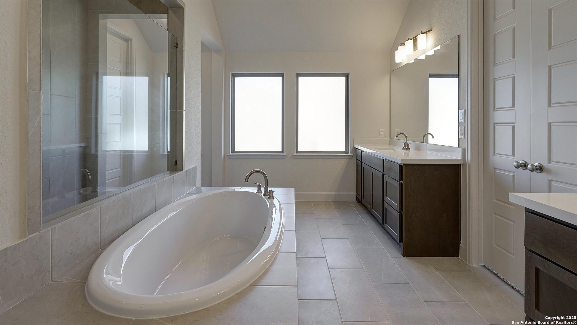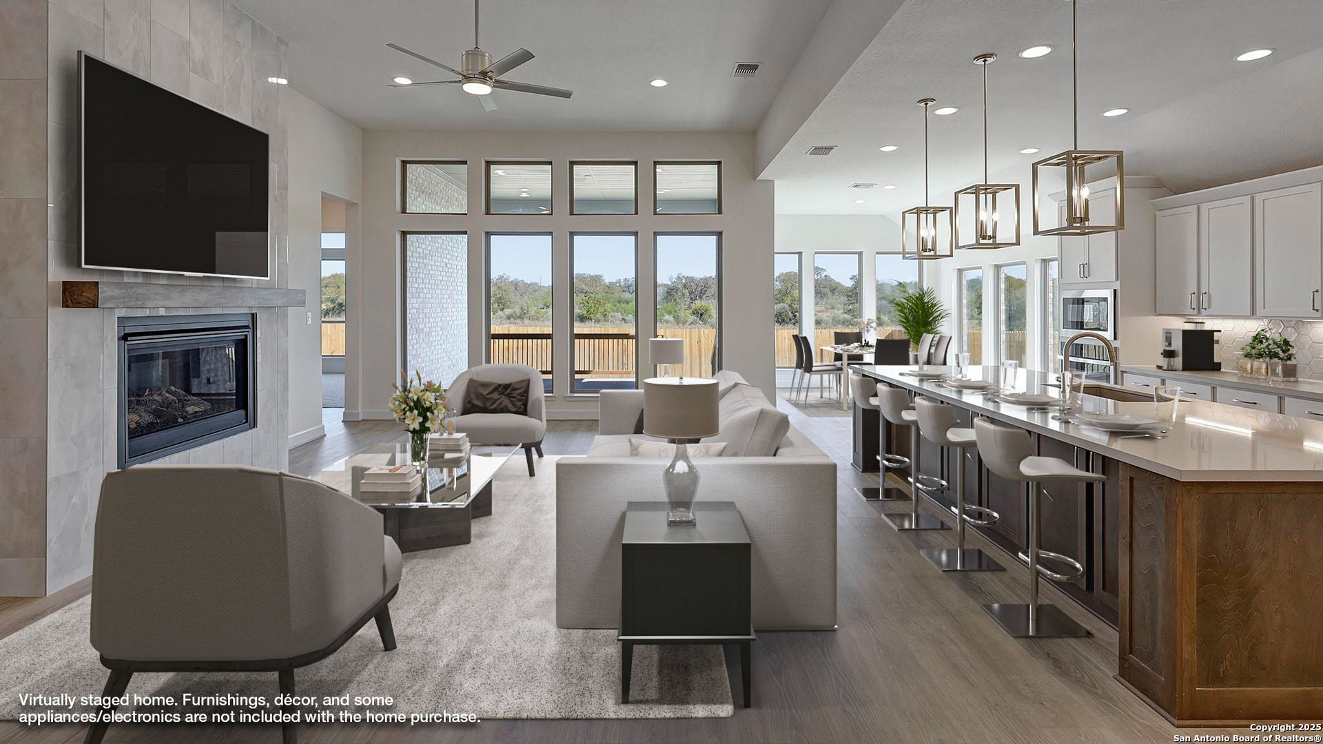 Welcoming entry extends past game room and utility room. Game room with French door entry. Spacious family room with a wood mantel fireplace and wall of windows. Island kitchen with built-in seating space and a walk-in pantry opens to the dining area with two walls of windows. Secluded primary suite features three large windows and 13-foot ceiling. French doors lead to primary bath with three windows, dual vanities, garden tub, separate glass enclosed shower, and two walk-in closets. Secondary bedrooms with walk-in closets and a Hollywood bathroom complete this design. Extended covered backyard patio and 5-zone sprinkler system. Mud room just off the three-car garage.