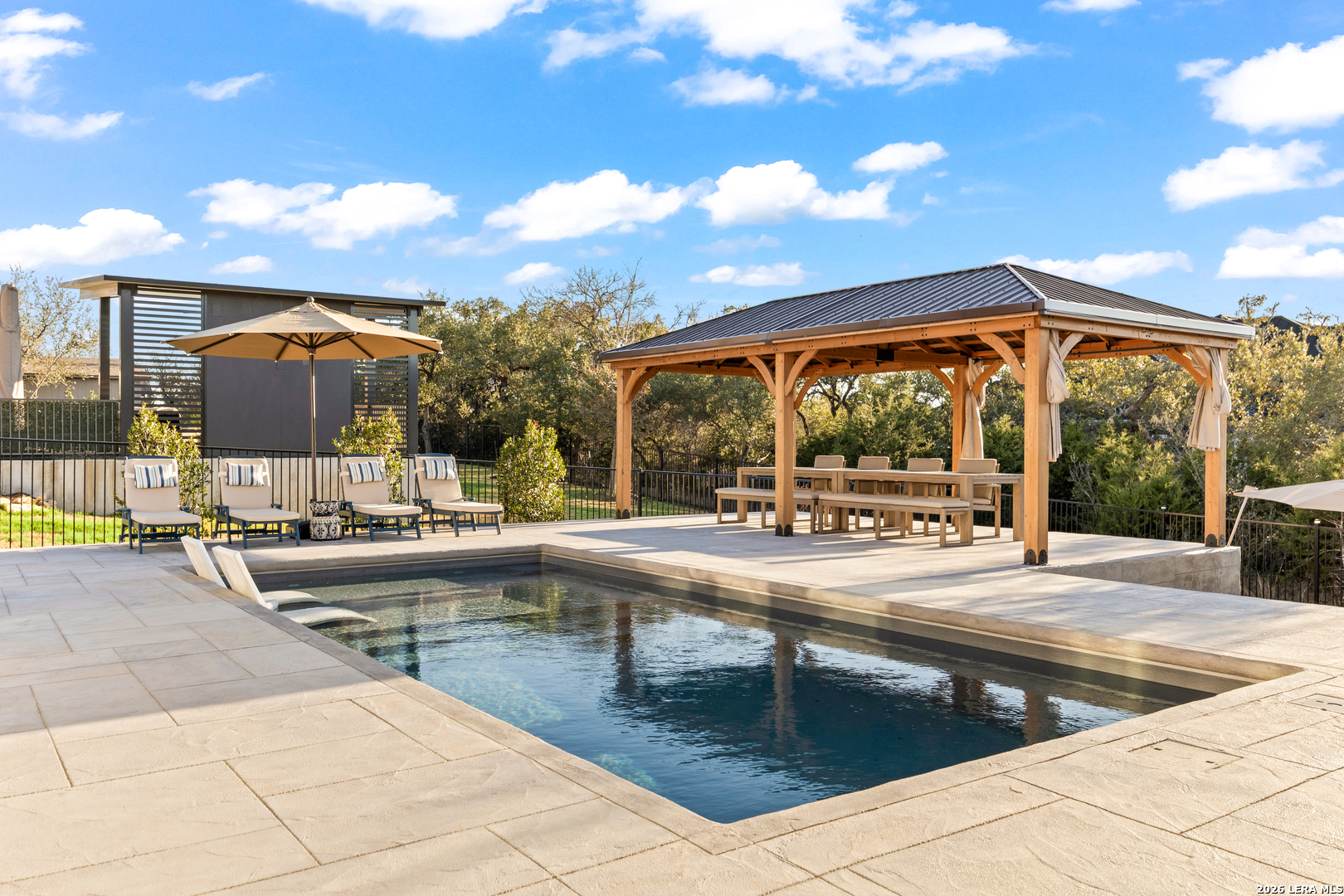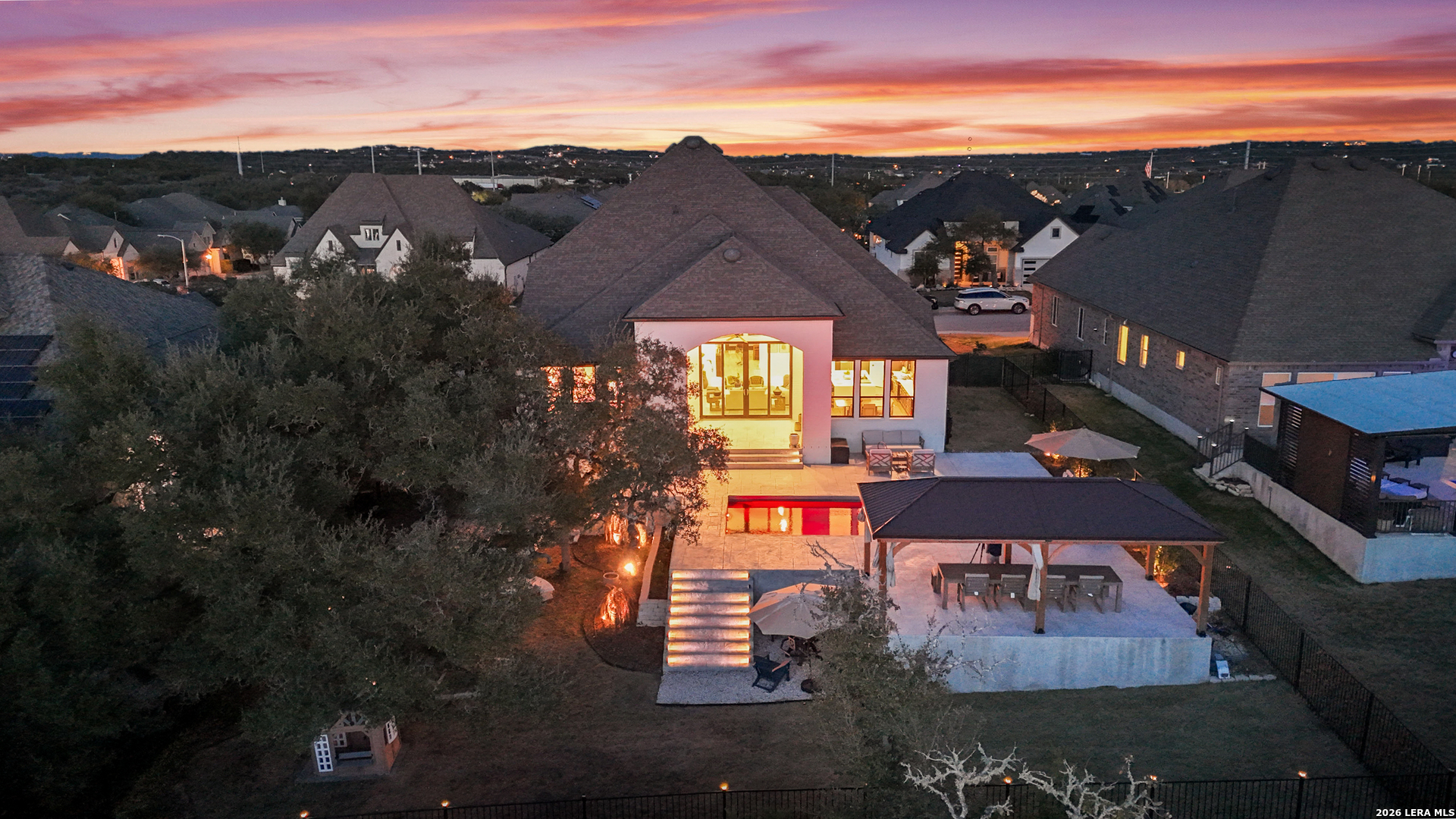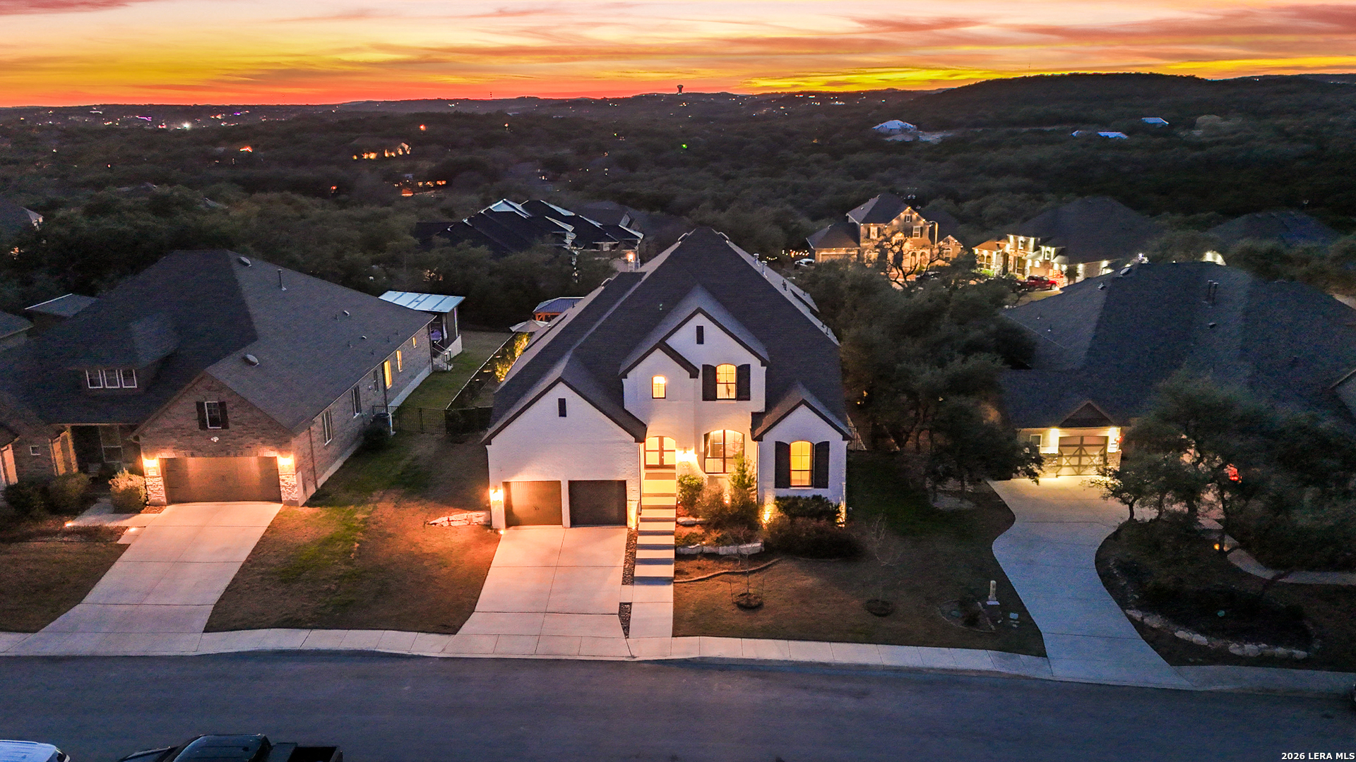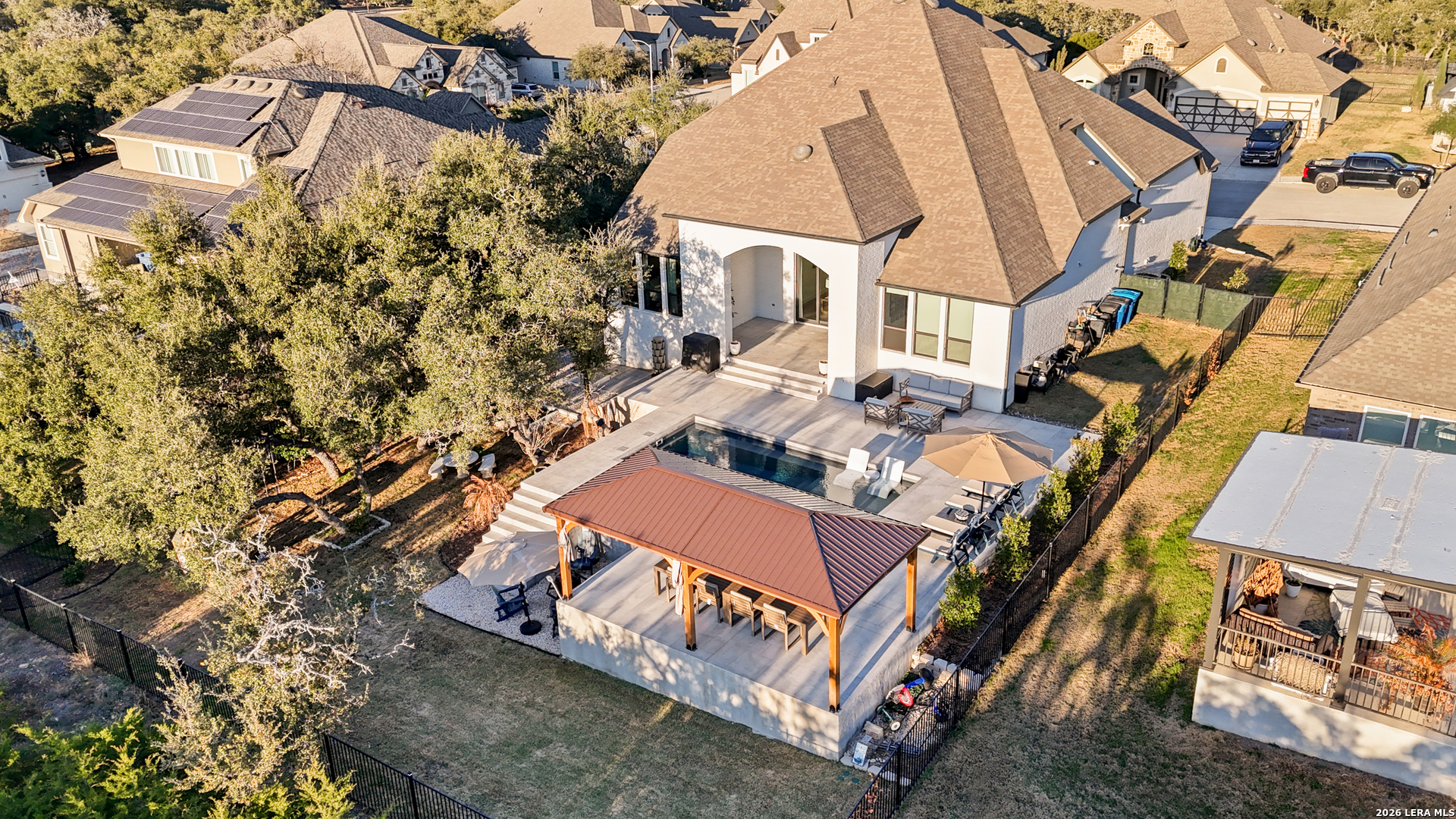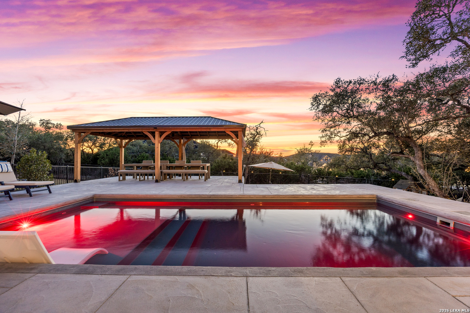 Experience elevated living in this meticulously redesigned luxury home offering panoramic Hill Country views from a premium elevated lot. Thoughtfully re-imagined by a professional architect, the enhanced open-concept floorplan provides seamless flow, expanded living spaces, and flexible functionality ideal for modern living and entertaining. Designed for today's lifestyle, this home features two private home offices perfect for remote work, a formal dining room with an elegant dry bar, and multiple spacious living areas. The expansive second-floor media room creates the ultimate entertainment space for movie nights, game days, or hosting large gatherings. High-end finishes are showcased throughout, including custom millwork, designer lighting, premium flooring, and bespoke cabinetry. The gourmet kitchen features exquisite stone countertops, abundant prep space, and curated design details that blend luxury with performance. The expansive primary suite serves as a private retreat with dual custom walk-in closets and a spa-inspired bathroom designed for relaxation. Additional living spaces offer comfort and flexibility for family and guests. Step outside to a true backyard oasis featuring a resort-style pool, extensive hardscape, and a professionally designed oversized pergola that defines luxury outdoor living. The elevated setting captures breathtaking Hill Country views, stunning sunsets, and exceptional privacy. This luxury home with pool, media room, two offices, dual custom closets, formal dining, and panoramic views offers the perfect blend of architectural design, modern functionality, and resort-style outdoor living.