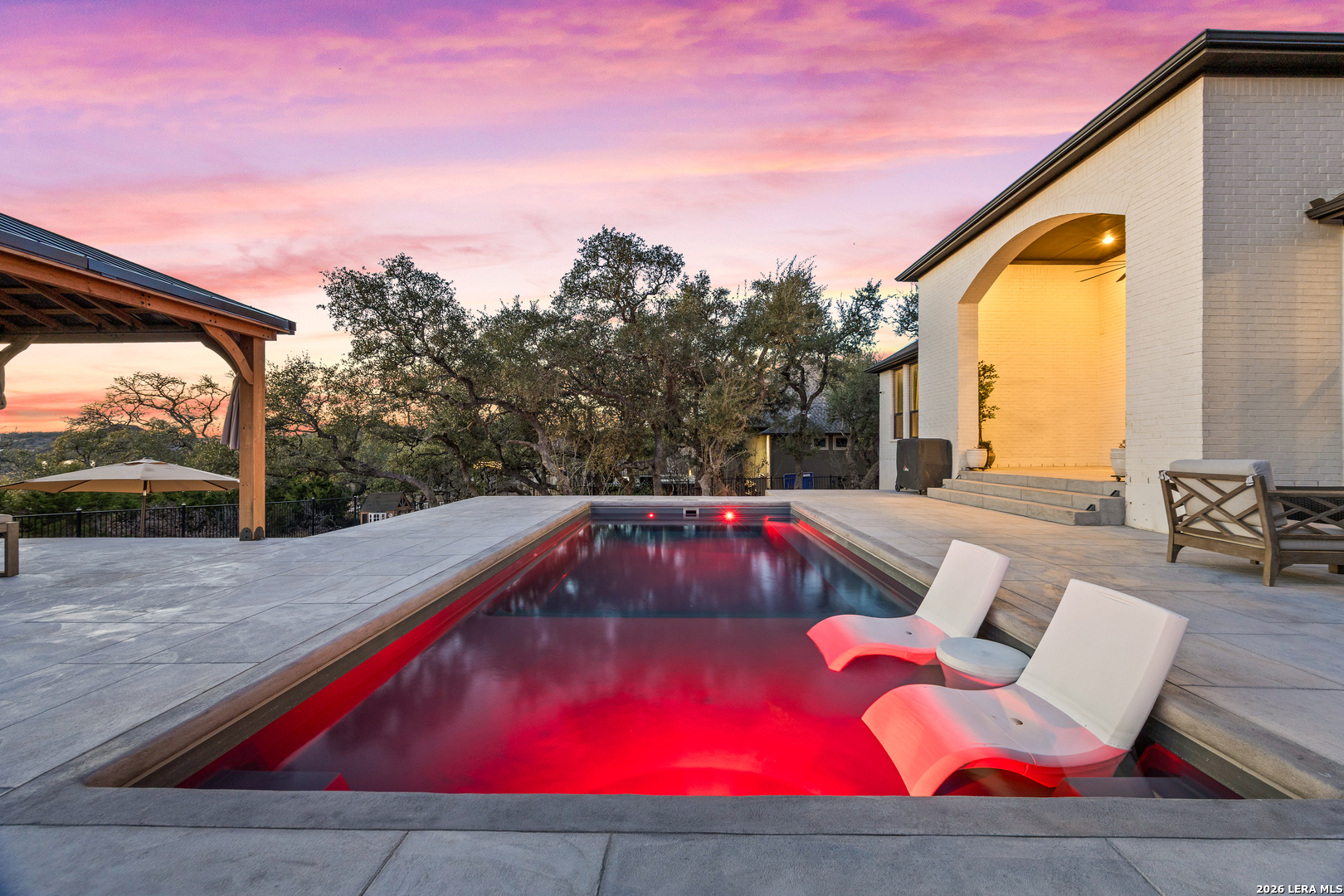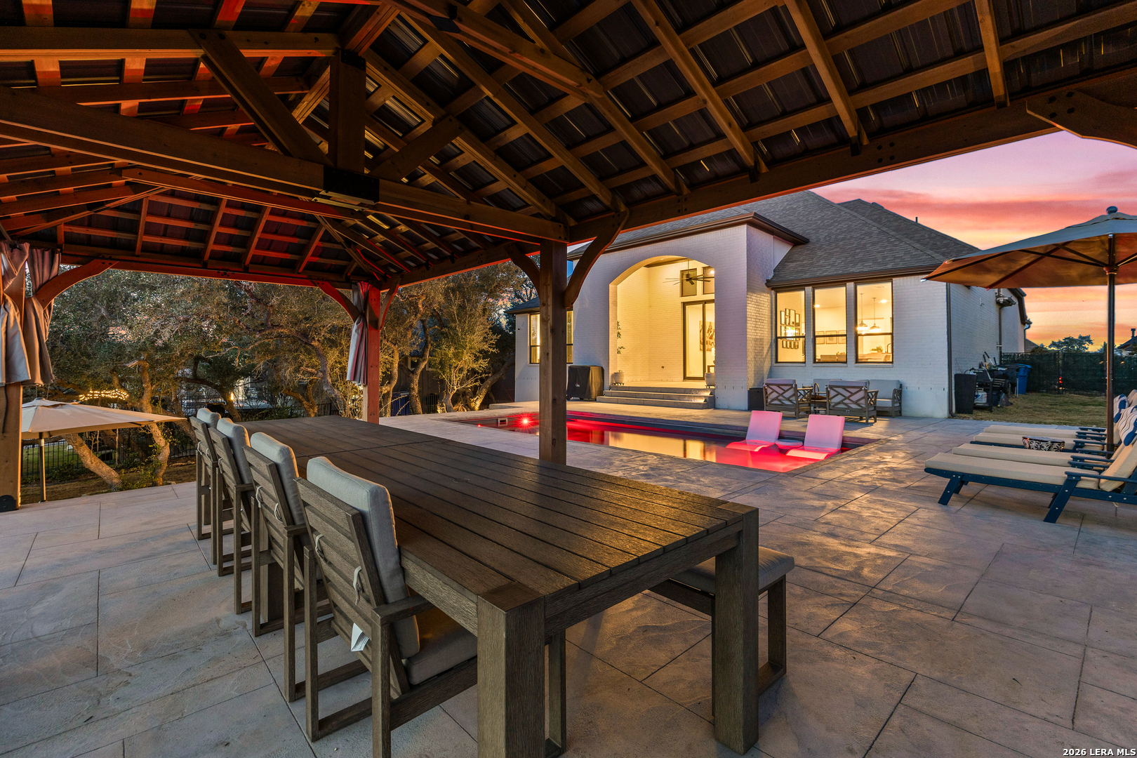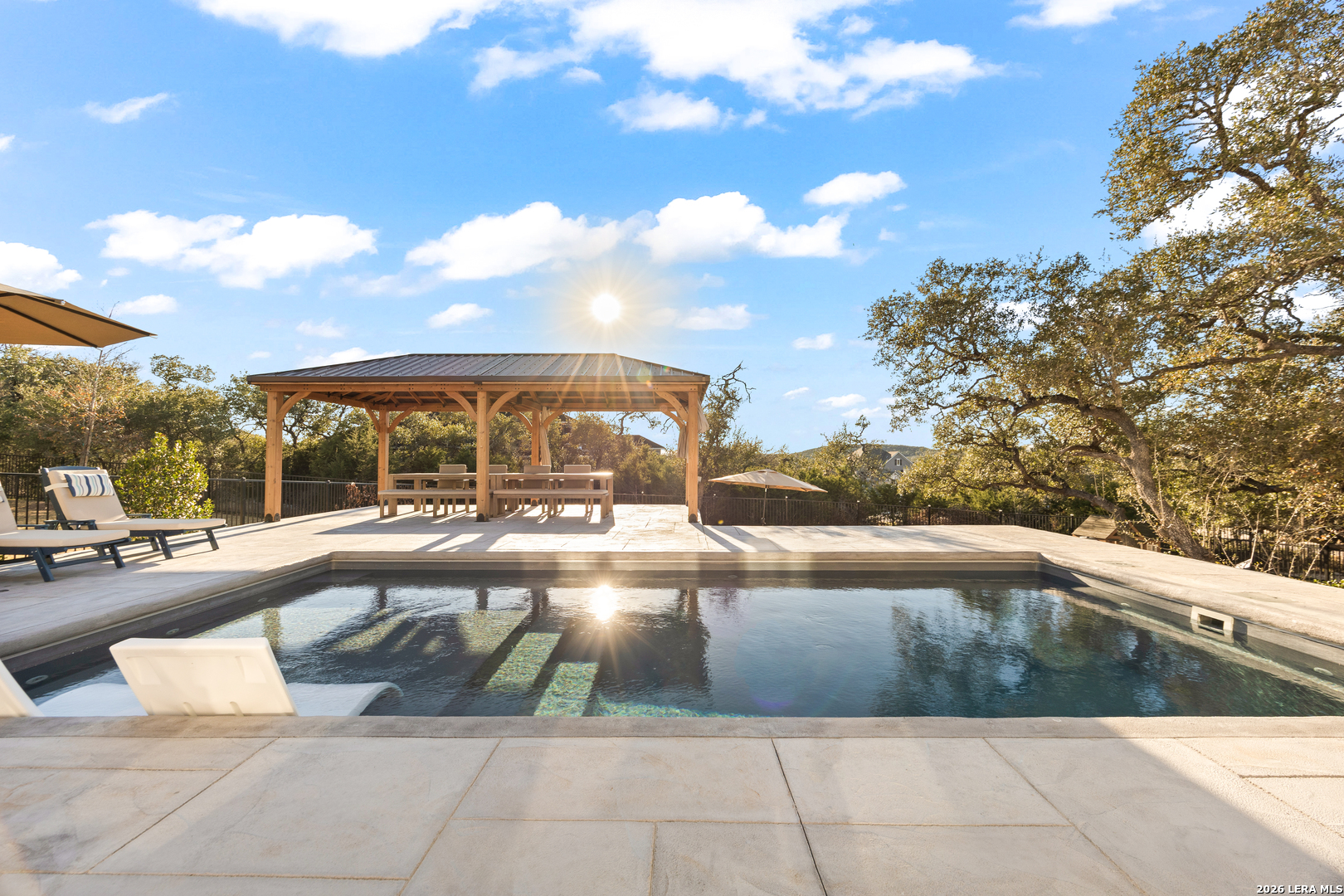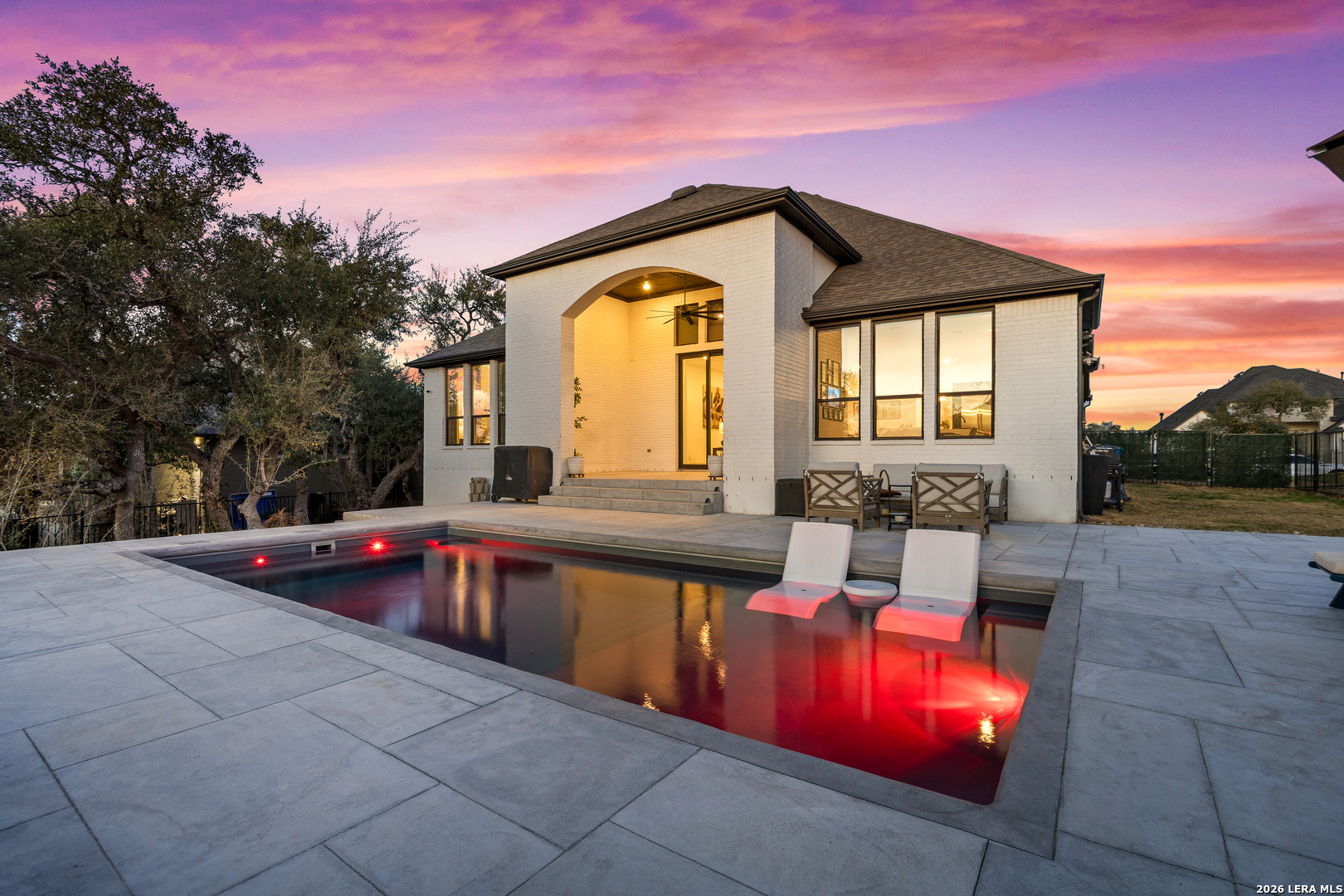 Experience elevated living in this meticulously redesigned luxury home offering panoramic Hill Country views from a premium elevated lot. Thoughtfully re-imagined by a professional architect, the enhanced open-concept floorplan provides seamless flow, expanded living spaces, and flexible functionality ideal for modern living and entertaining. Designed for today's lifestyle, this home features two private home offices perfect for remote work, a formal dining room with an elegant dry bar, and multiple spacious living areas. The expansive second-floor media room creates the ultimate entertainment space for movie nights, game days, or hosting large gatherings. High-end finishes are showcased throughout, including custom millwork, designer lighting, premium flooring, and bespoke cabinetry. The gourmet kitchen features exquisite stone countertops, abundant prep space, and curated design details that blend luxury with performance. The expansive primary suite serves as a private retreat with dual custom walk-in closets and a spa-inspired bathroom designed for relaxation. Additional living spaces offer comfort and flexibility for family and guests. Step outside to a true backyard oasis featuring a resort-style pool, extensive hardscape, and a professionally designed oversized pergola that defines luxury outdoor living. The elevated setting captures breathtaking Hill Country views, stunning sunsets, and exceptional privacy. This luxury home with pool, media room, two offices, dual custom closets, formal dining, and panoramic views offers the perfect blend of architectural design, modern functionality, and resort-style outdoor living.