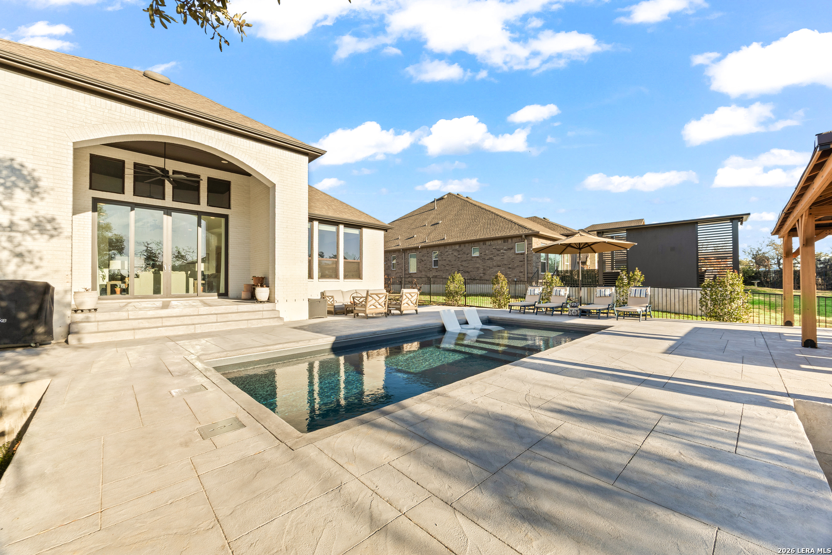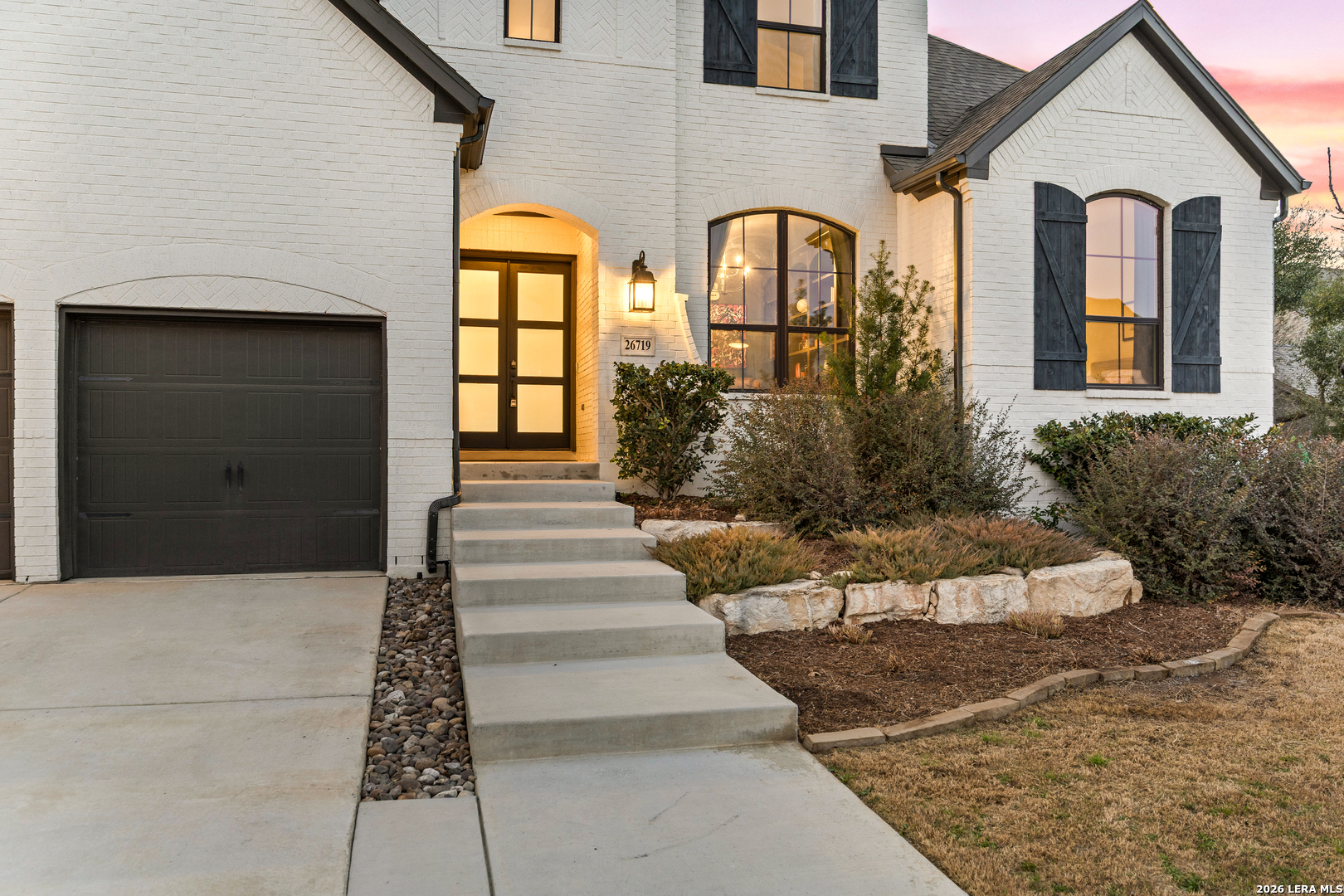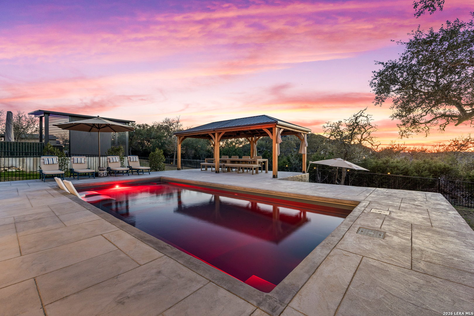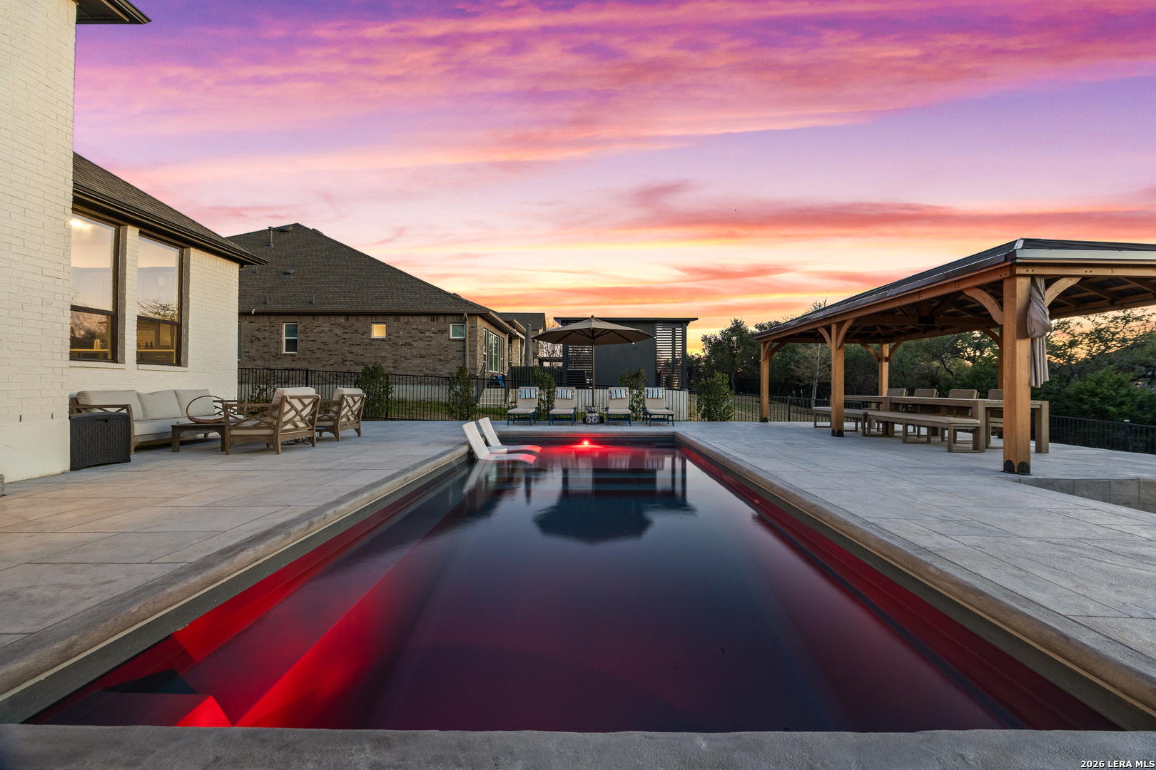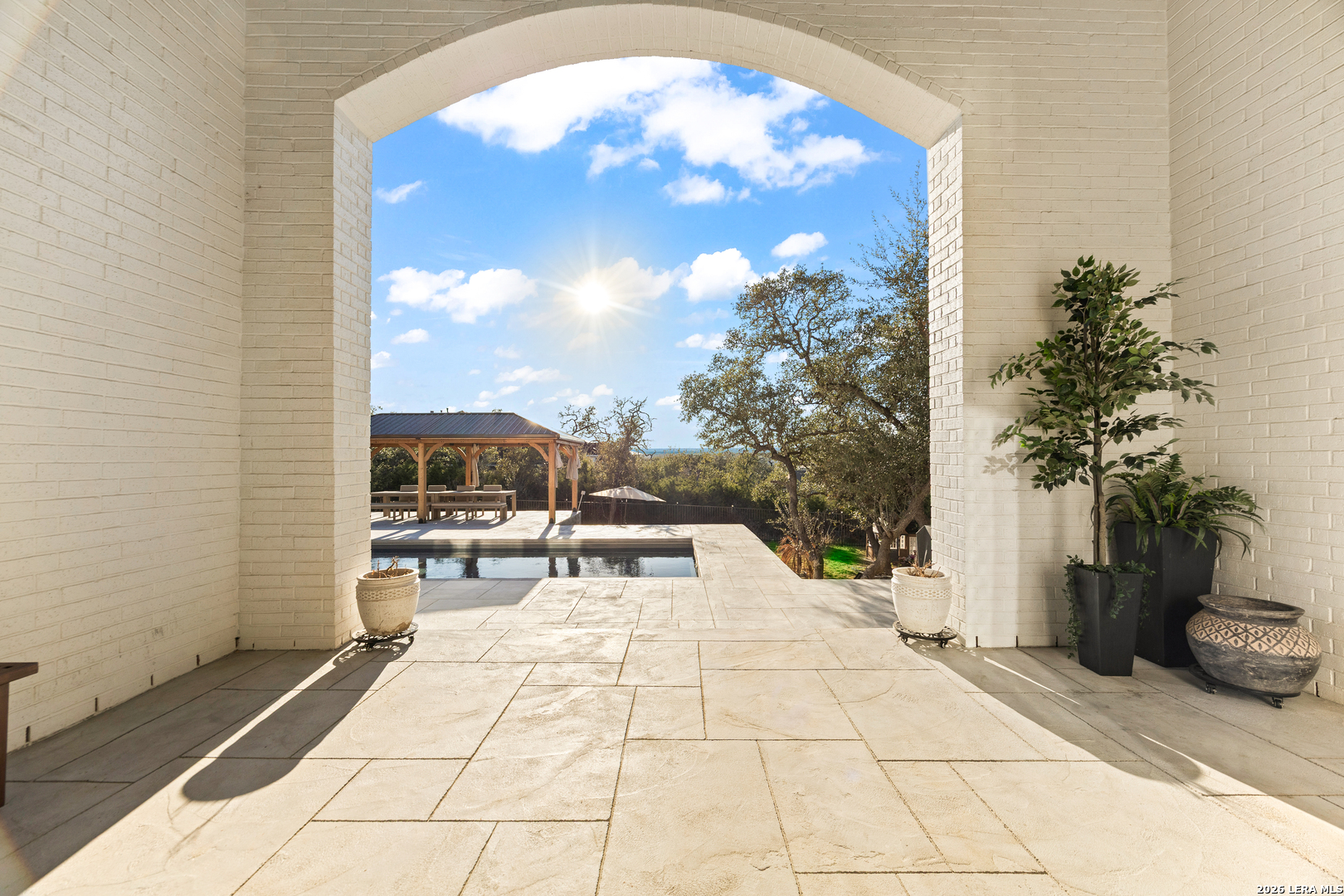 Experience elevated living in this meticulously redesigned luxury home offering panoramic Hill Country views from a premium elevated lot. Thoughtfully re-imagined by a professional architect, the enhanced open-concept floorplan provides seamless flow, expanded living spaces, and flexible functionality ideal for modern living and entertaining. Designed for today's lifestyle, this home features two private home offices perfect for remote work, a formal dining room with an elegant dry bar, and multiple spacious living areas. The expansive second-floor media room creates the ultimate entertainment space for movie nights, game days, or hosting large gatherings. High-end finishes are showcased throughout, including custom millwork, designer lighting, premium flooring, and bespoke cabinetry. The gourmet kitchen features exquisite stone countertops, abundant prep space, and curated design details that blend luxury with performance. The expansive primary suite serves as a private retreat with dual custom walk-in closets and a spa-inspired bathroom designed for relaxation. Additional living spaces offer comfort and flexibility for family and guests. Step outside to a true backyard oasis featuring a resort-style pool, extensive hardscape, and a professionally designed oversized pergola that defines luxury outdoor living. The elevated setting captures breathtaking Hill Country views, stunning sunsets, and exceptional privacy. This luxury home with pool, media room, two offices, dual custom closets, formal dining, and panoramic views offers the perfect blend of architectural design, modern functionality, and resort-style outdoor living.