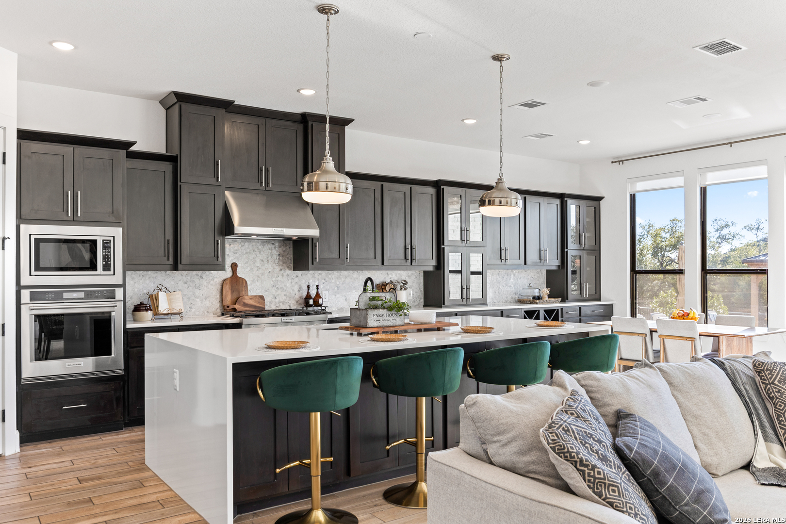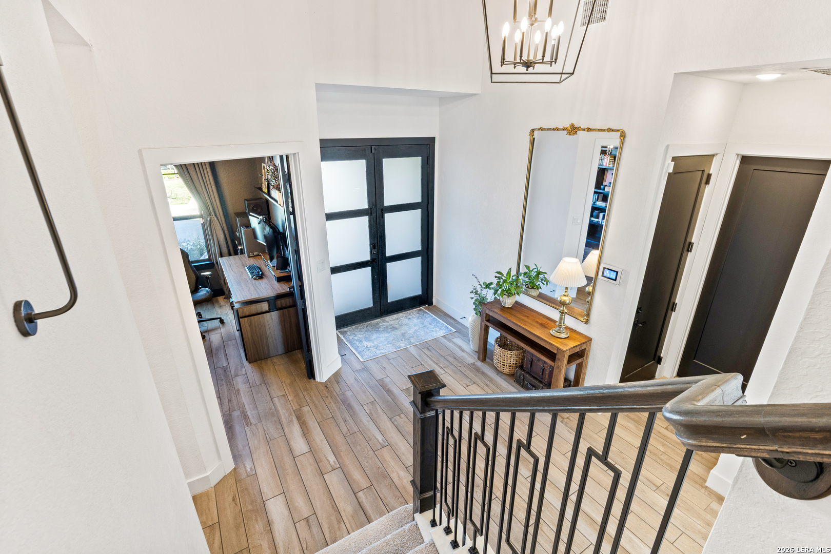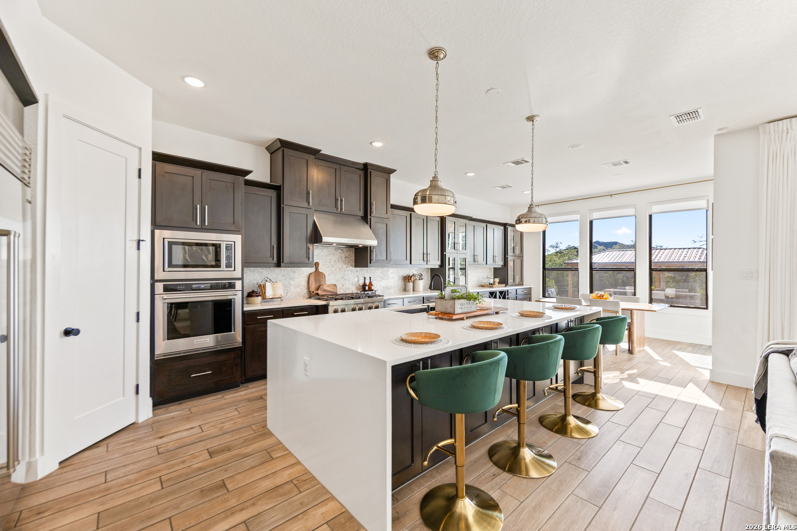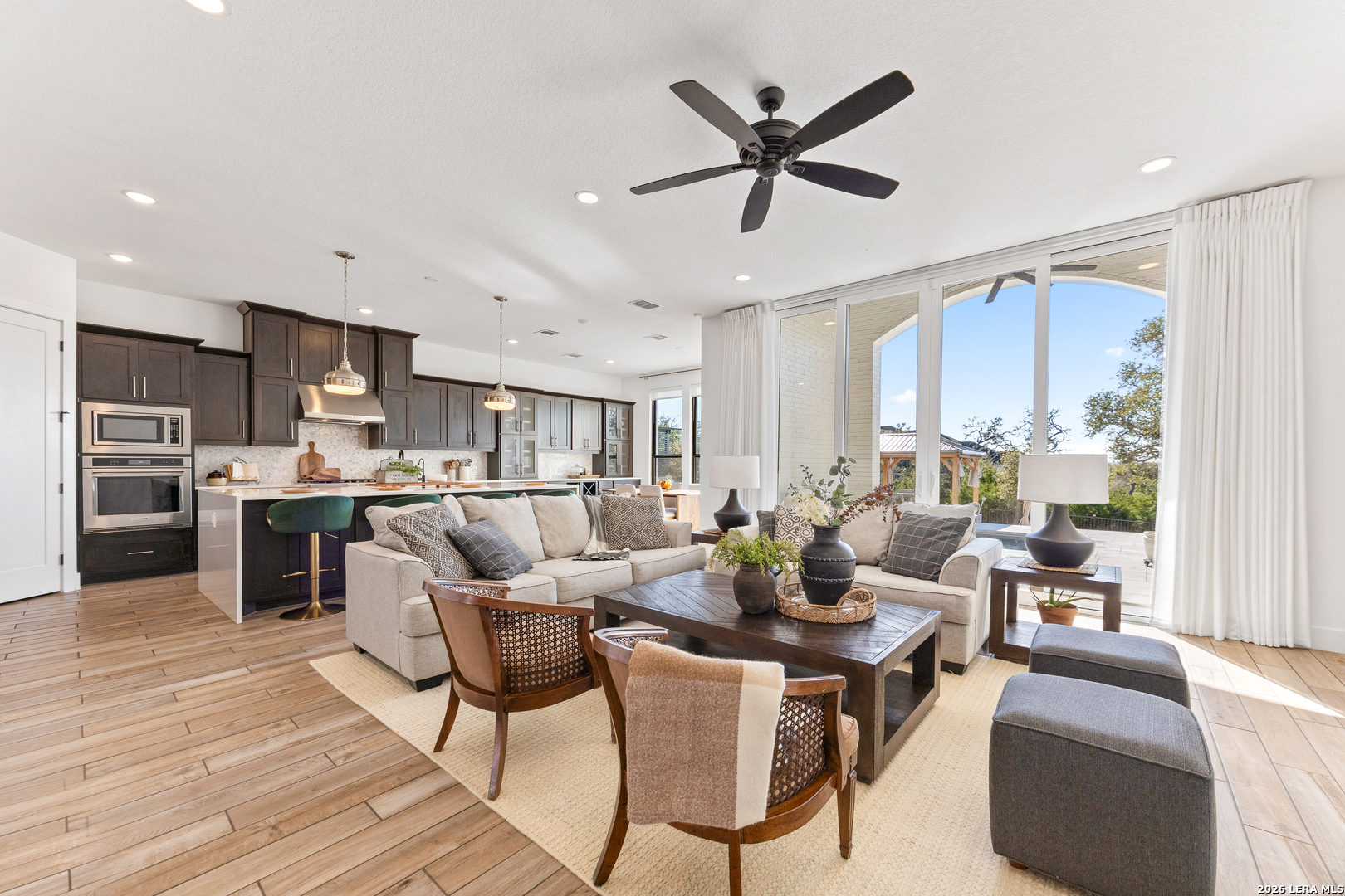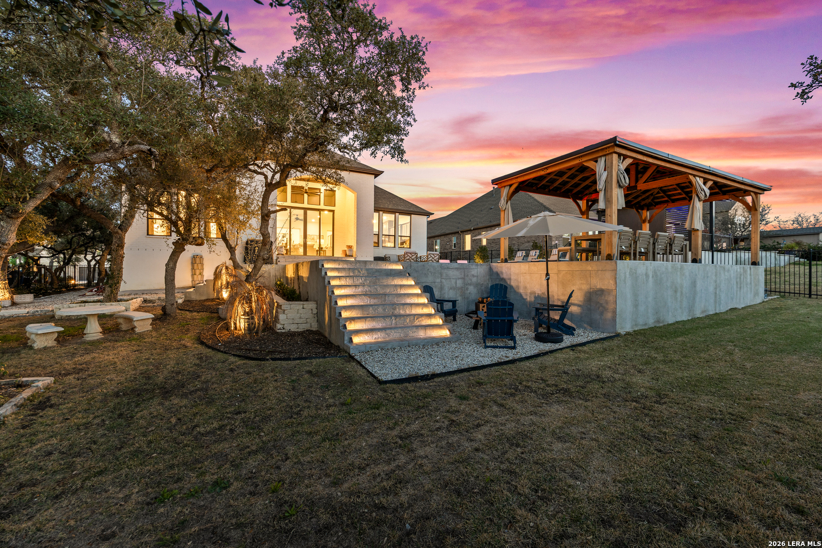 Experience elevated living in this meticulously redesigned luxury home offering panoramic Hill Country views from a premium elevated lot. Thoughtfully re-imagined by a professional architect, the enhanced open-concept floorplan provides seamless flow, expanded living spaces, and flexible functionality ideal for modern living and entertaining. Designed for today's lifestyle, this home features two private home offices perfect for remote work, a formal dining room with an elegant dry bar, and multiple spacious living areas. The expansive second-floor media room creates the ultimate entertainment space for movie nights, game days, or hosting large gatherings. High-end finishes are showcased throughout, including custom millwork, designer lighting, premium flooring, and bespoke cabinetry. The gourmet kitchen features exquisite stone countertops, abundant prep space, and curated design details that blend luxury with performance. The expansive primary suite serves as a private retreat with dual custom walk-in closets and a spa-inspired bathroom designed for relaxation. Additional living spaces offer comfort and flexibility for family and guests. Step outside to a true backyard oasis featuring a resort-style pool, extensive hardscape, and a professionally designed oversized pergola that defines luxury outdoor living. The elevated setting captures breathtaking Hill Country views, stunning sunsets, and exceptional privacy. This luxury home with pool, media room, two offices, dual custom closets, formal dining, and panoramic views offers the perfect blend of architectural design, modern functionality, and resort-style outdoor living.