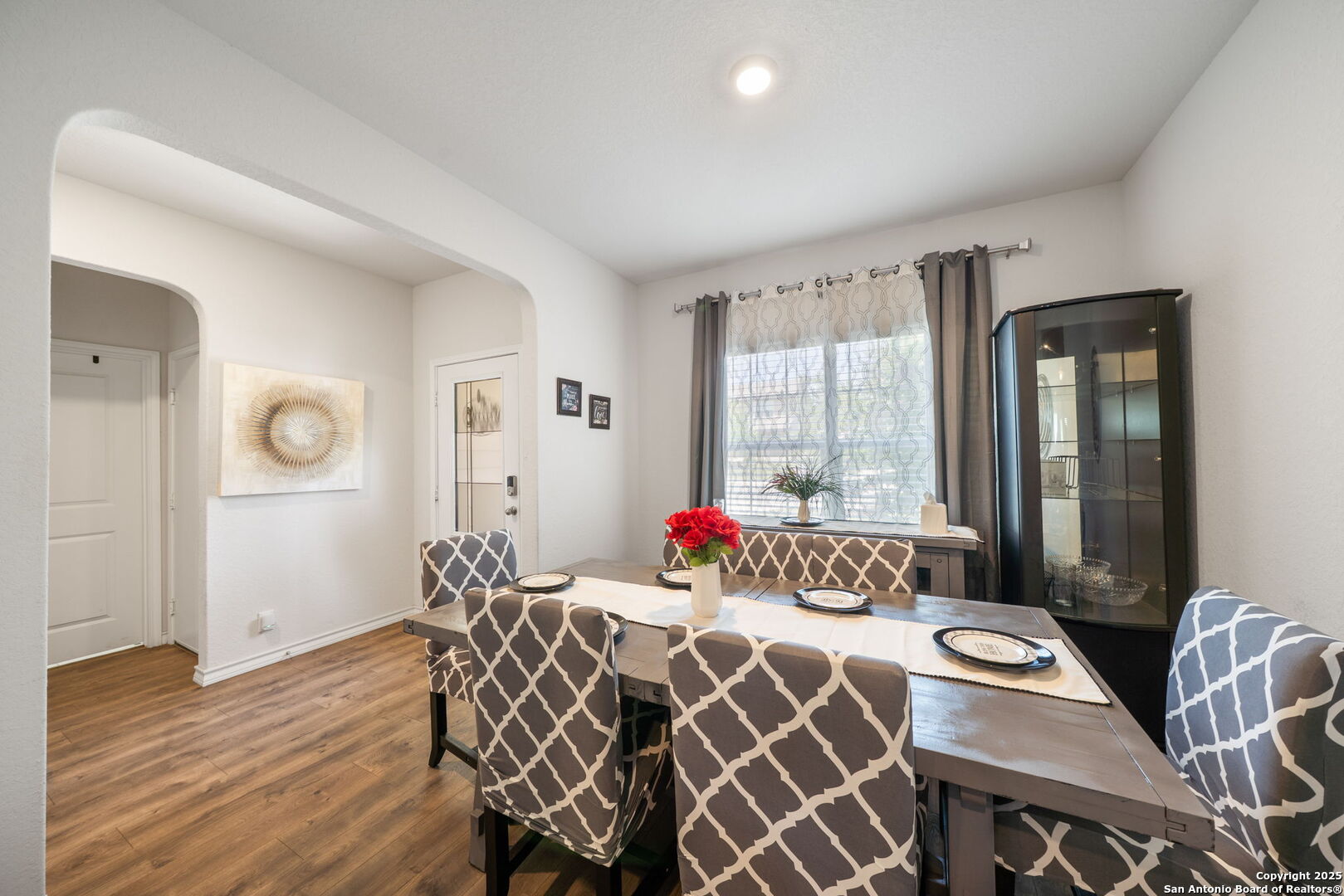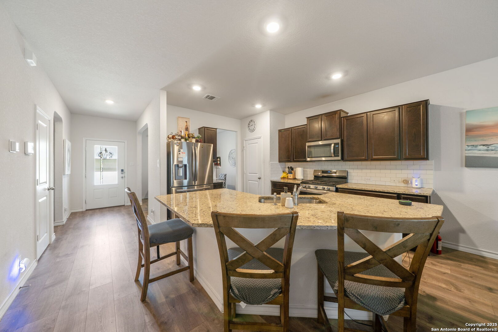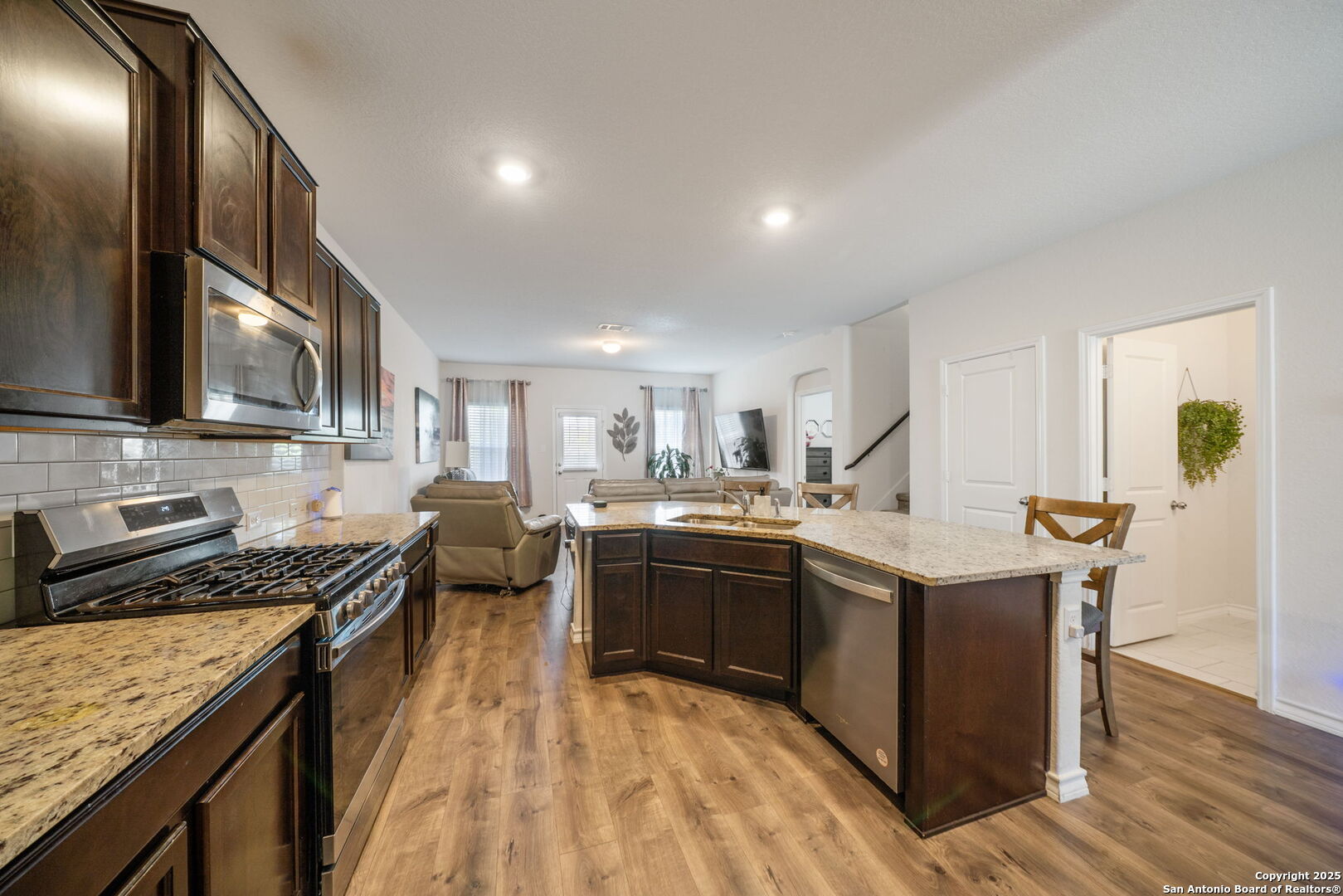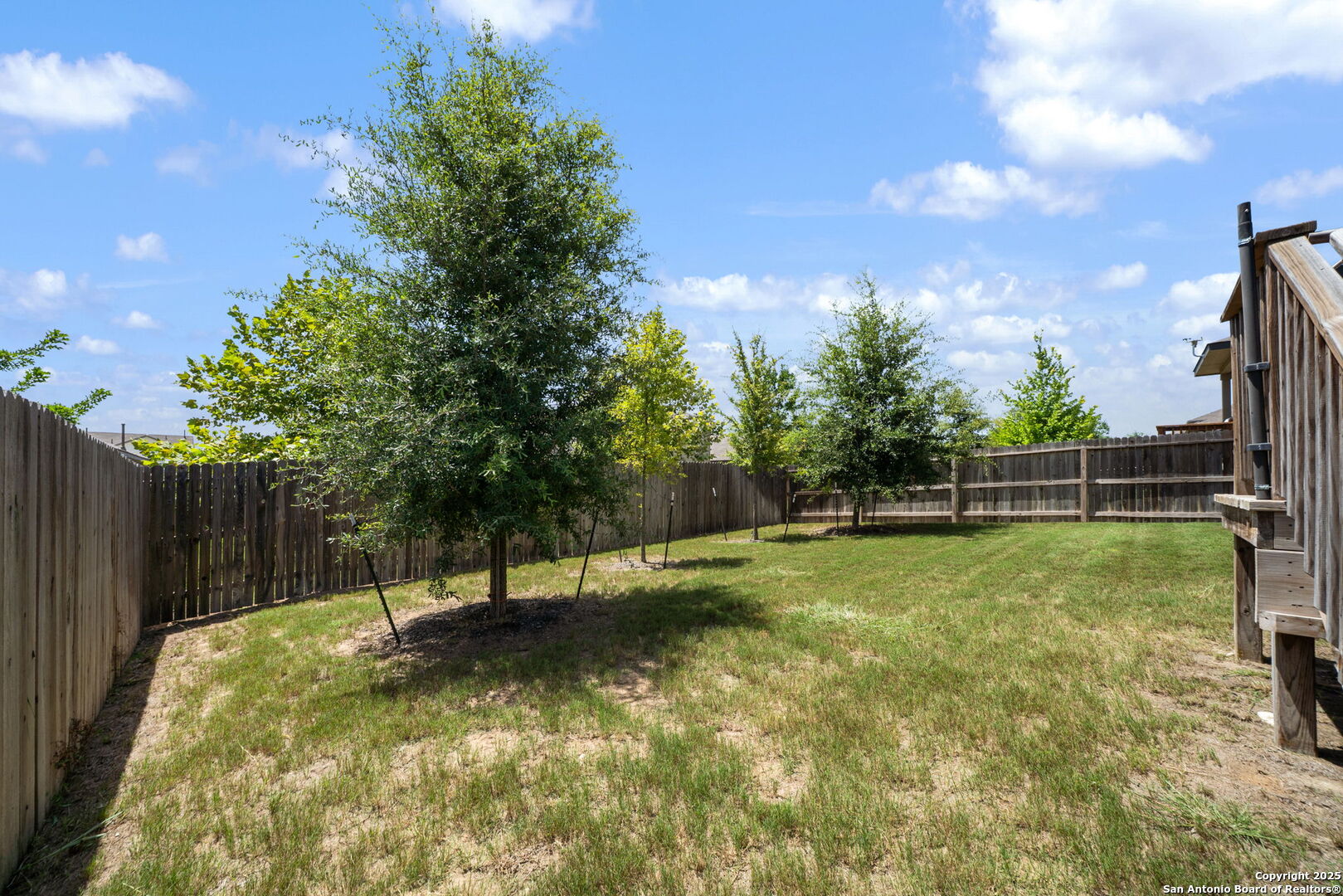 Welcome to this meticulously maintained 5-bedroom, 3.5-bathroom home located in the highly desired Redbird Ranch community. Offering 2,715 square feet of thoughtfully designed living space, this home features soaring ceilings, large windows that provide abundant natural light, and an open floor plan with wood-look luxury vinyl flooring throughout. A separate dining room adds elegance and functionality, perfect for entertaining or family gatherings. The kitchen is a chef's delight, complete with stainless steel appliances, a large island, custom tile backsplash, and a walk-in pantry. The spacious primary suite, located on the main level, includes large windows, a luxurious en-suite bathroom with a vanity area, double sinks, a garden tub, separate shower, and a generous walk-in closet. Upstairs, you'll find four additional bedrooms, two full bathrooms, and a large game room-ideal for relaxation or play. Step outside to a covered patio, a privacy fence, and a full irrigation system that makes lawn care a breeze. This home also comes with fully paid-off solar panels, providing energy efficiency and long-term savings. Conveniently located near JBSA-Lackland, SeaWorld, shopping, dining, and major highways, this home offers comfort, style, and convenience in one of the area's most sought-after communities.