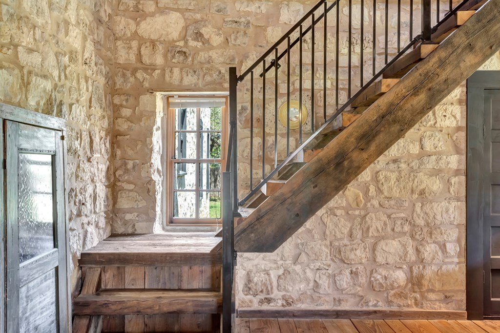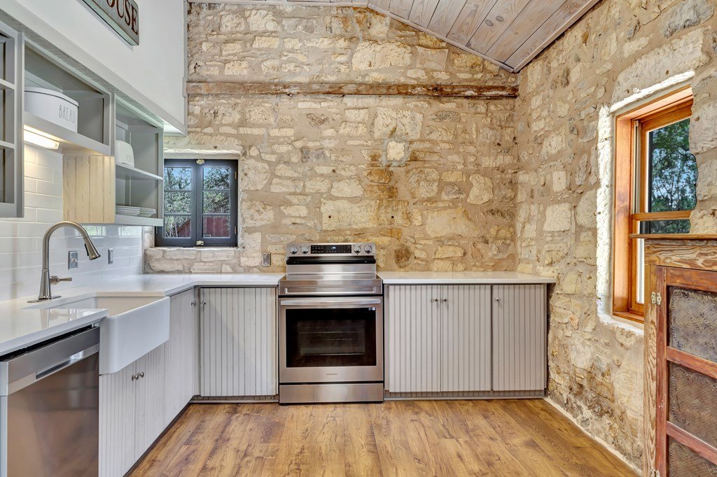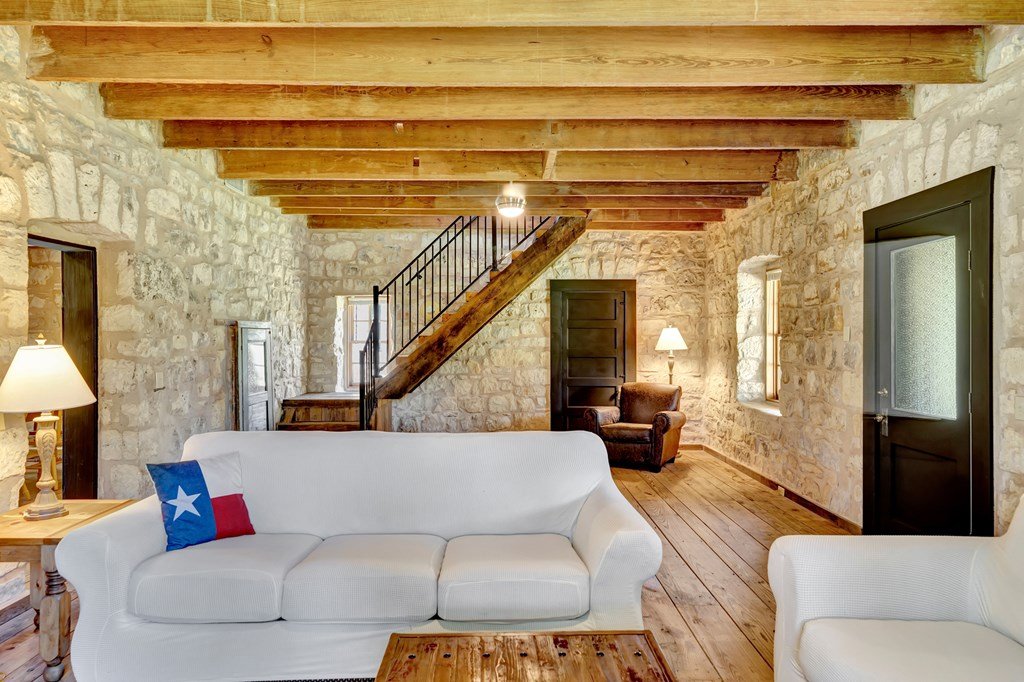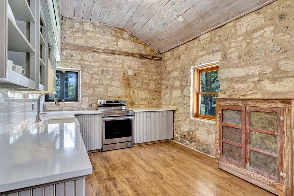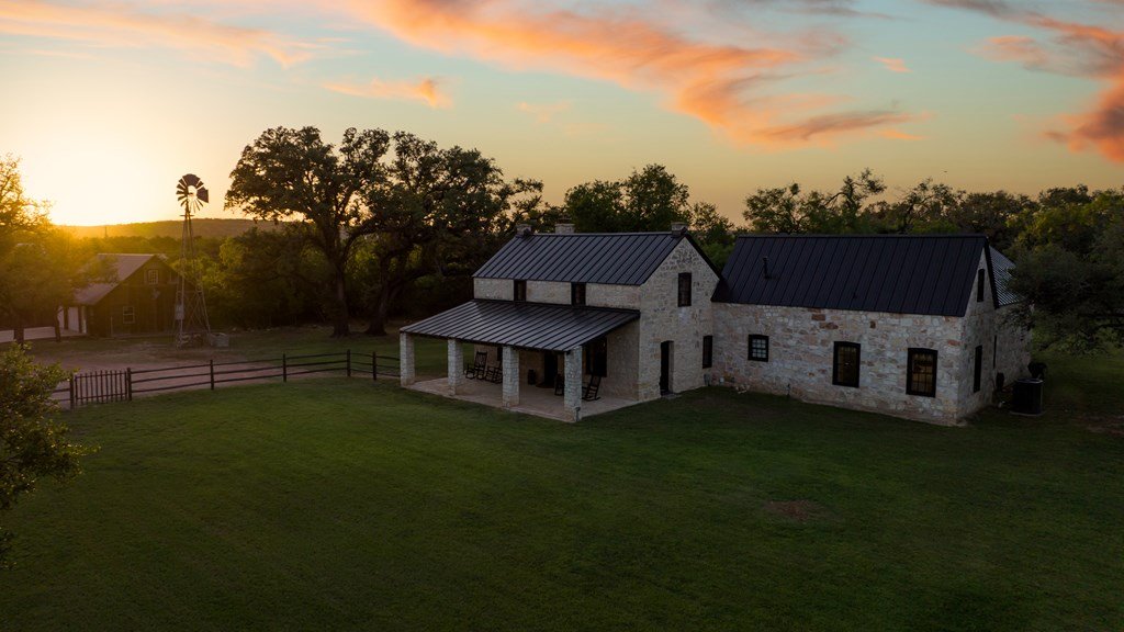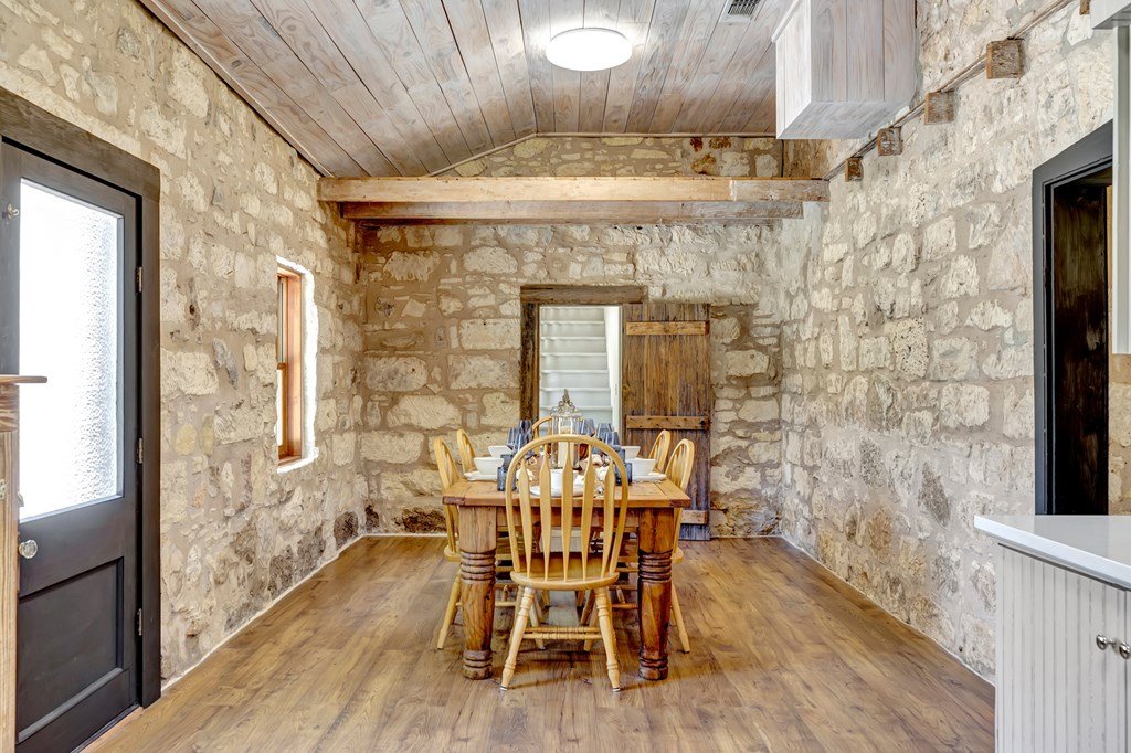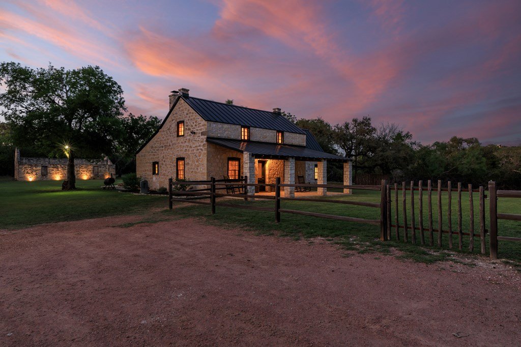 Must see historic, limestone, pioneer farmhouse on 11.49 unrestricted acres with magnificent live oaks - the perfect combination of preservation and modernization. True 4/4, extensive parking and a 2 car garage with air conditioned flex space. Recent remodel and landscaping in 2022 brings out the best in this very livable, turnkey home less than ten minutes from downtown Fredericksburg. Beautiful old stone barn offers a potential 2/2 guest house or amazing pool cabana. Currently a shot-term rental with room and plans to expand. The serene setting would also make a lovely private residence. Marschall Creek Retreat is ready for your Hill Country dreams!