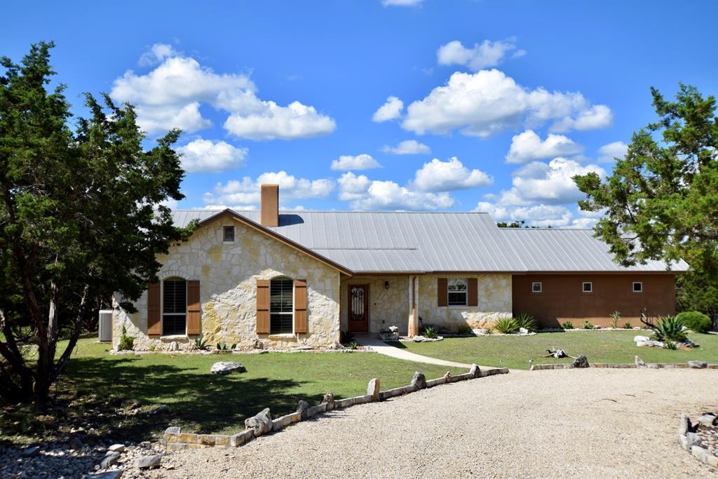 Hill Country style 3 Bedroom/ 2 Bath home plus 375 SF Studio with plumbing roughed in, could make a fourth bedroom or rec room. Stargaze off of the private deck with hot tub. Home has open floor plan and windows to admit natural light and great views of nature. Covered porch to enjoy your morning coffee and watch the wildlife. Great room has rock fireplace, wood floors, custom cut fir beams, ceiling fan, recessed lighting and built-in bookcases/shelving. Kitchen has large pantry, custom alder cabinets, granite counters, SS appliances, undercounter lighting, tumbled marble backsplashes, SS undermount sink, tile floors. Utility room is conveniently located between master bedroom and secondary bedrooms. Bathrooms have raised vanities. Cat-5 wiring, insulated garage w/ openers, tiled rear patio, 40 year Galvalume roof, Lennox Elite heat pump w/ME# filtration. Plantation shutters throughout the home. Enjoy spending time with friends and family on the Beautiful HOA Guadalupe Waterfront with 96 +/- AC wilderness area with marked hiking trails that backs up to home.