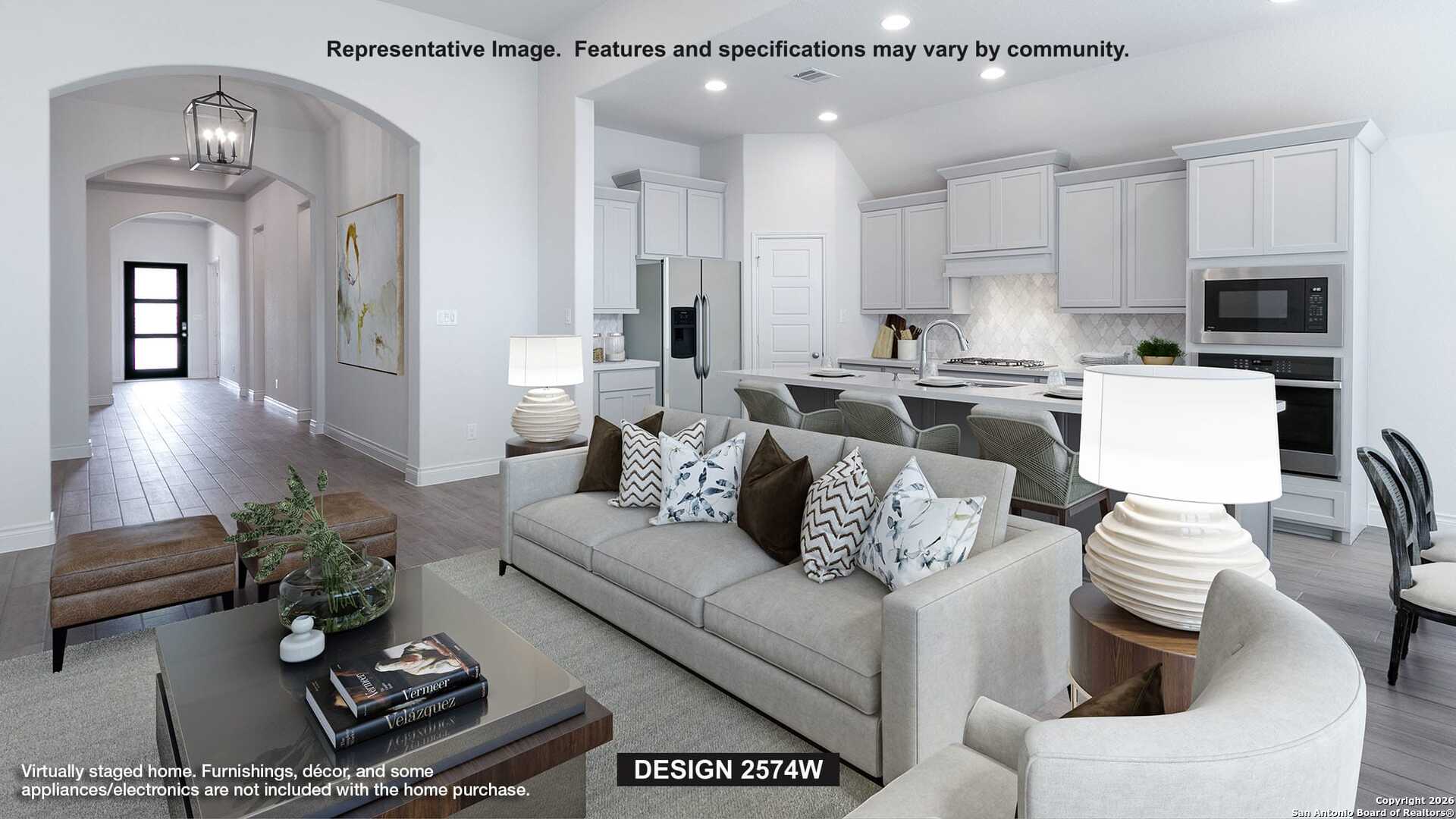 Home office with French doors set at entry with 12-foot ceiling. Coffered extended entry leads to open family room, kitchen and dining area. Family room features wall of windows and a wood mantel fireplace. Kitchen features corner walk-in pantry, a 5-burner gas cooktop, and generous island with built-in seating space. Primary bedroom highlights 12-foot ceiling and wall of windows. Double doors lead to primary bath with dual vanities, a freestanding tub and separate glass-enclosed shower with separate walk-in closets. A guest suite with private bath adds to this one-story design. Extended covered backyard patio. Mud room off two-car garage.