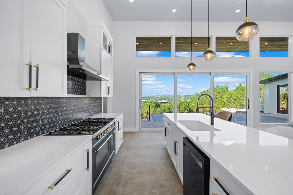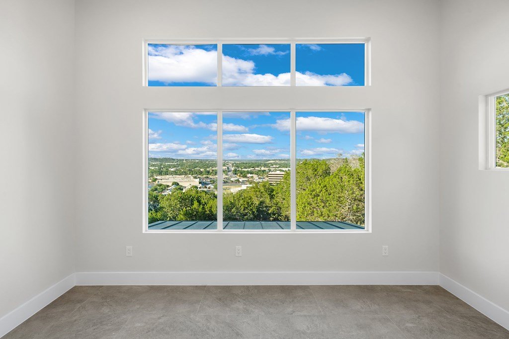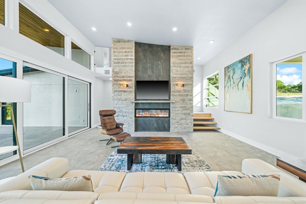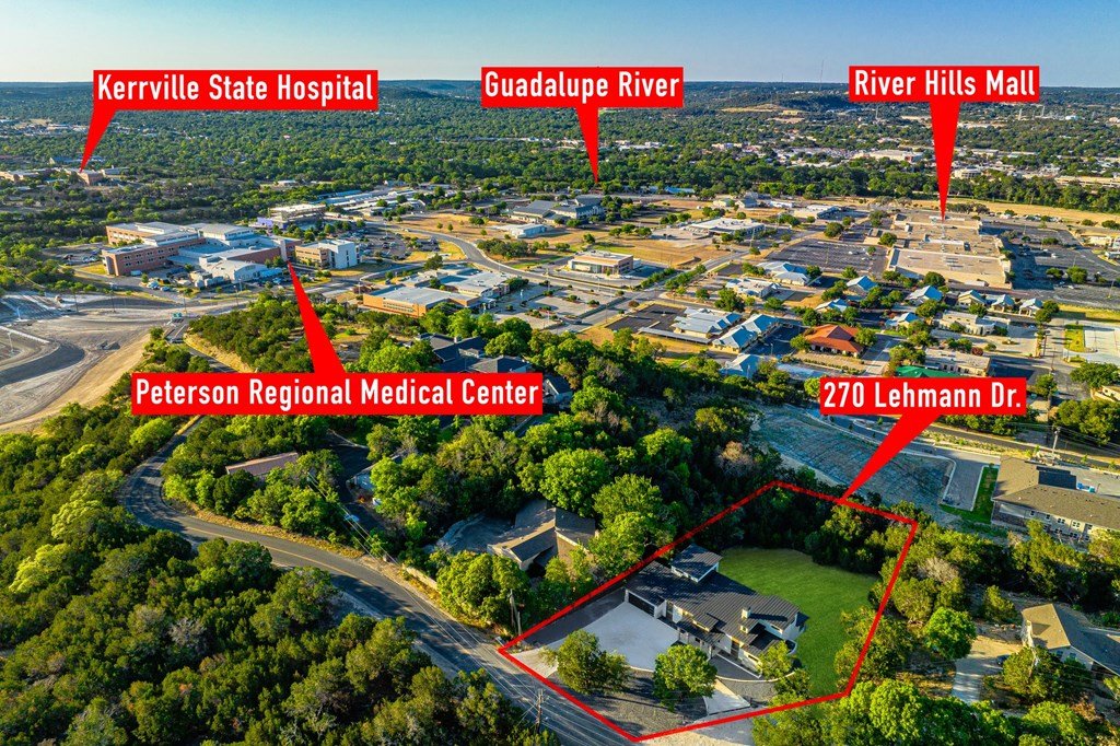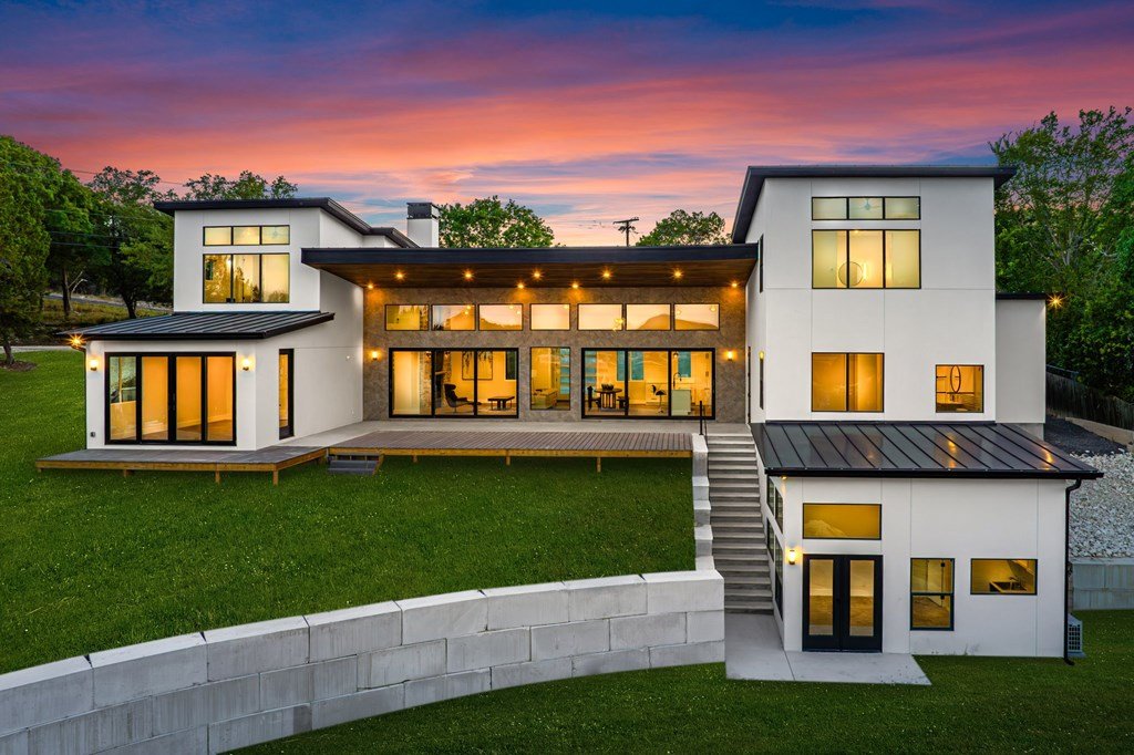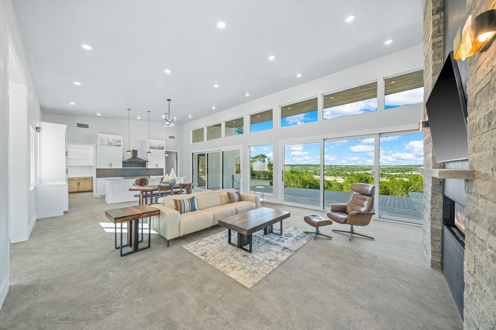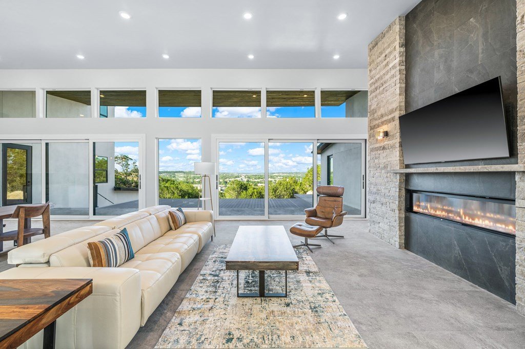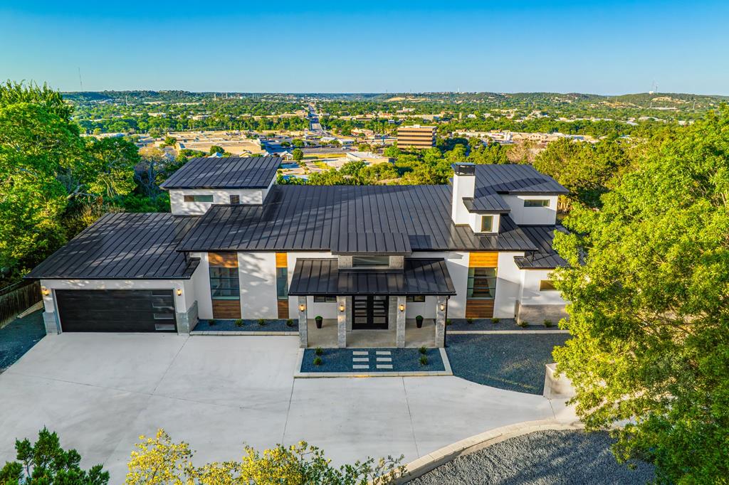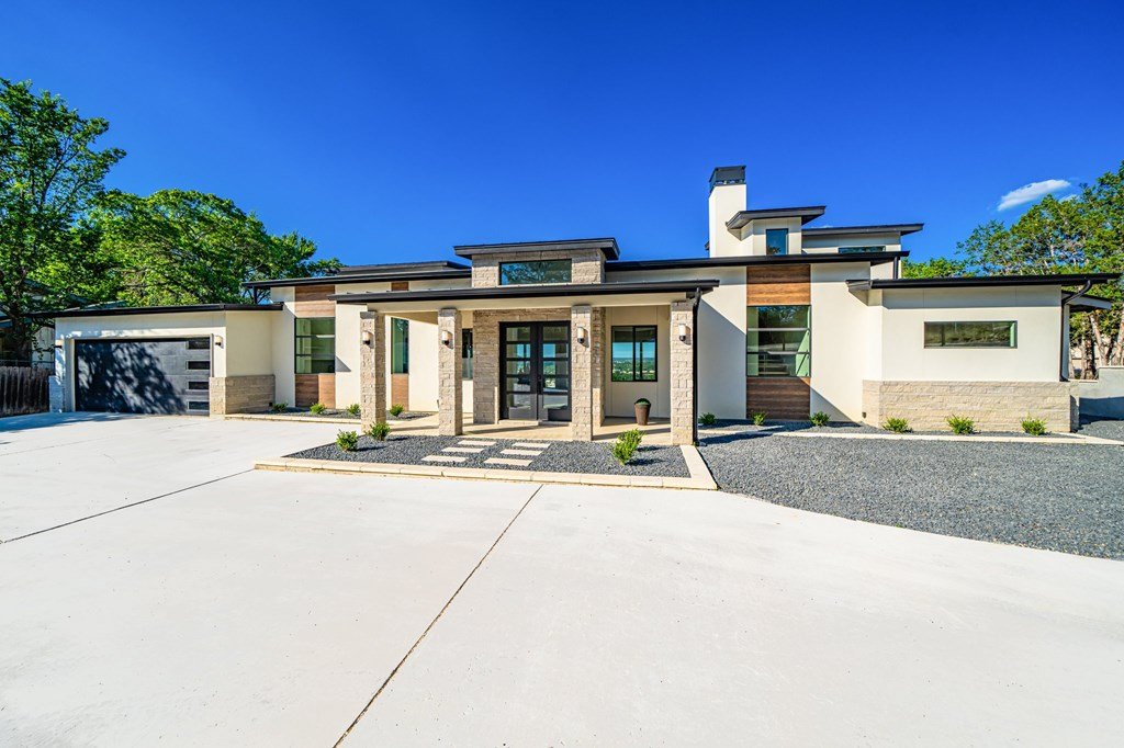 VIEWS! Exquisite modern estate, set on a pristine 1.07-acre lot, represents the pinnacle of exclusivity & sophistication. Nestled in the Texas Hill Country, the expansive open-plan living spaces are bathed in natural light, w/large glass walls framing the breathtaking surroundings. State-of-the-art chef's kitchen is a harmonious blend of functionality & elegance, featuring the finest finishes & cutting-edge design. Soaring ceilings, smart lighting throughout, & a captivating gas-electric fireplace, every detail is carefully curated for luxurious living. Multi-panel glass doors seamlessly connect the indoors to an expansive covered deck, offering sweeping, panoramic 24 hour breathtaking views of Kerrville. The voluminous primary suite is a sanctuary of comfort, featuring serene views, spacious walk-in closet, & a spa-inspired bathroom w/an indulgent indoor-outdoor shower. Four additional generously sized secondary bedrooms each boast en-suite bathrooms & continuous, expansive views. Fifth bedroom or guest suite/office is positioned on the lower level, complete w/ensuite bath. This unparalleled residence offers a rare opportunity to own a masterpiece close to all amenities & hospital