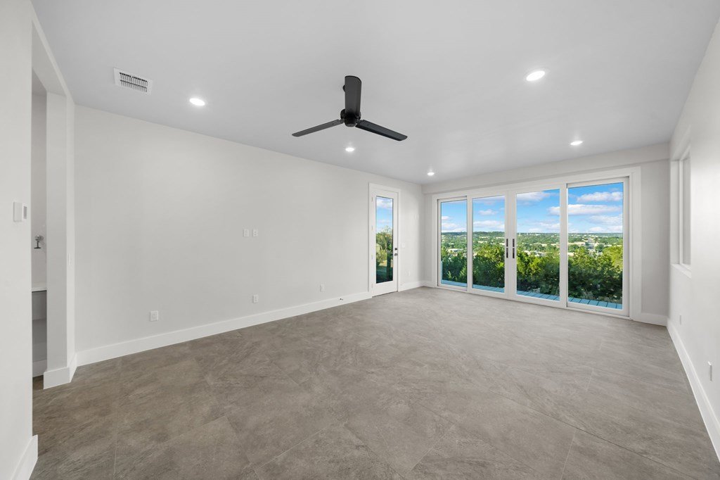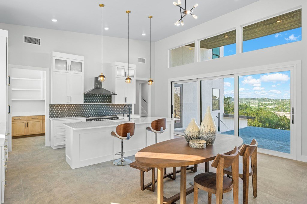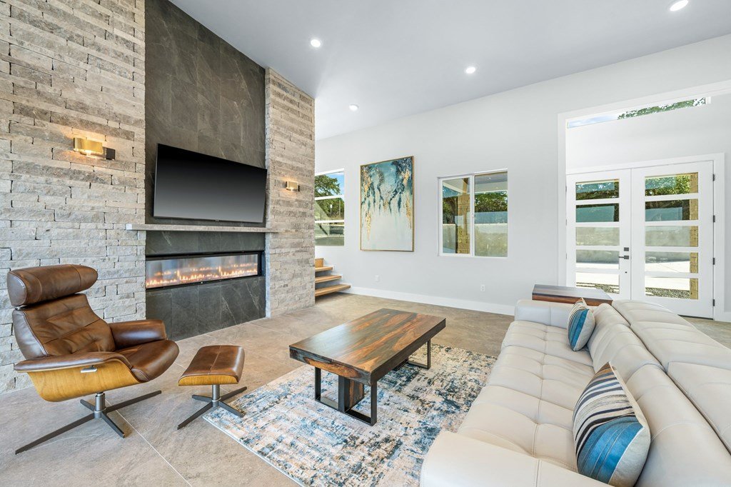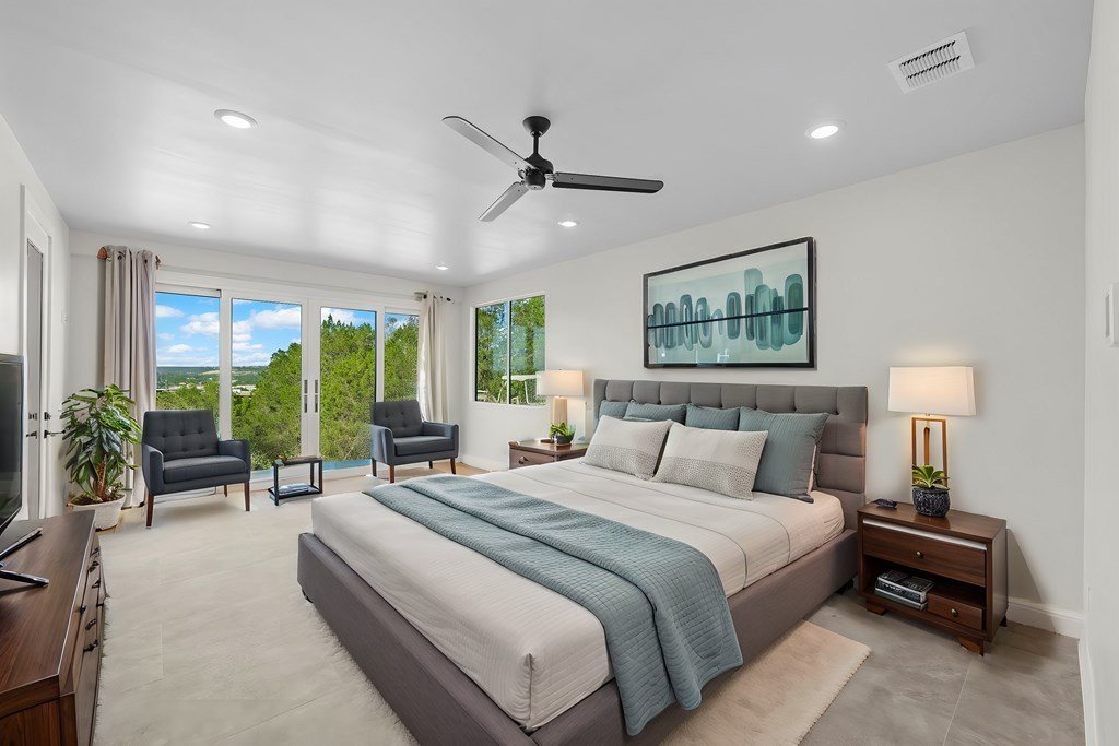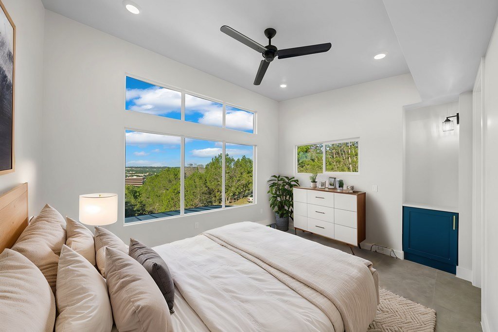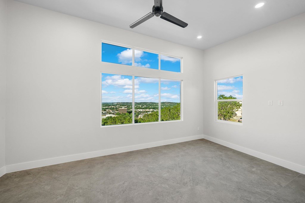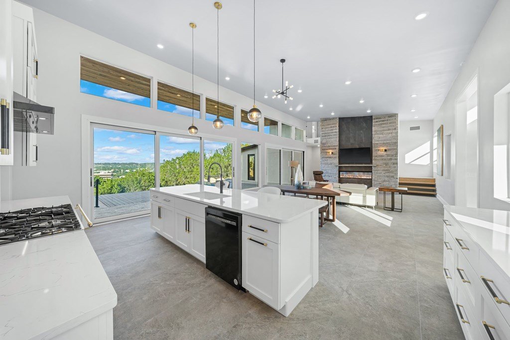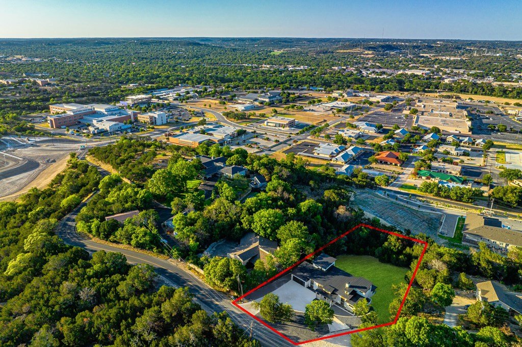 VIEWS! Exquisite modern estate, set on a pristine 1.07-acre lot, represents the pinnacle of exclusivity & sophistication. Nestled in the Texas Hill Country, the expansive open-plan living spaces are bathed in natural light, w/large glass walls framing the breathtaking surroundings. State-of-the-art chef's kitchen is a harmonious blend of functionality & elegance, featuring the finest finishes & cutting-edge design. Soaring ceilings, smart lighting throughout, & a captivating gas-electric fireplace, every detail is carefully curated for luxurious living. Multi-panel glass doors seamlessly connect the indoors to an expansive covered deck, offering sweeping, panoramic 24 hour breathtaking views of Kerrville. The voluminous primary suite is a sanctuary of comfort, featuring serene views, spacious walk-in closet, & a spa-inspired bathroom w/an indulgent indoor-outdoor shower. Four additional generously sized secondary bedrooms each boast en-suite bathrooms & continuous, expansive views. Fifth bedroom or guest suite/office is positioned on the lower level, complete w/ensuite bath. This unparalleled residence offers a rare opportunity to own a masterpiece close to all amenities & hospital