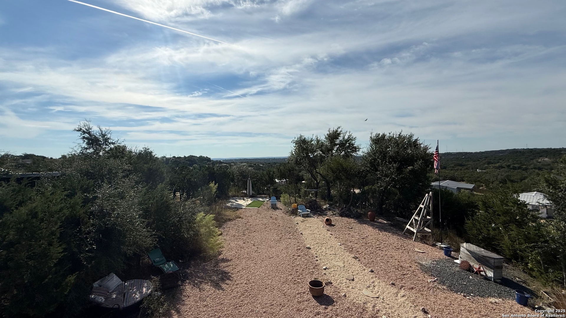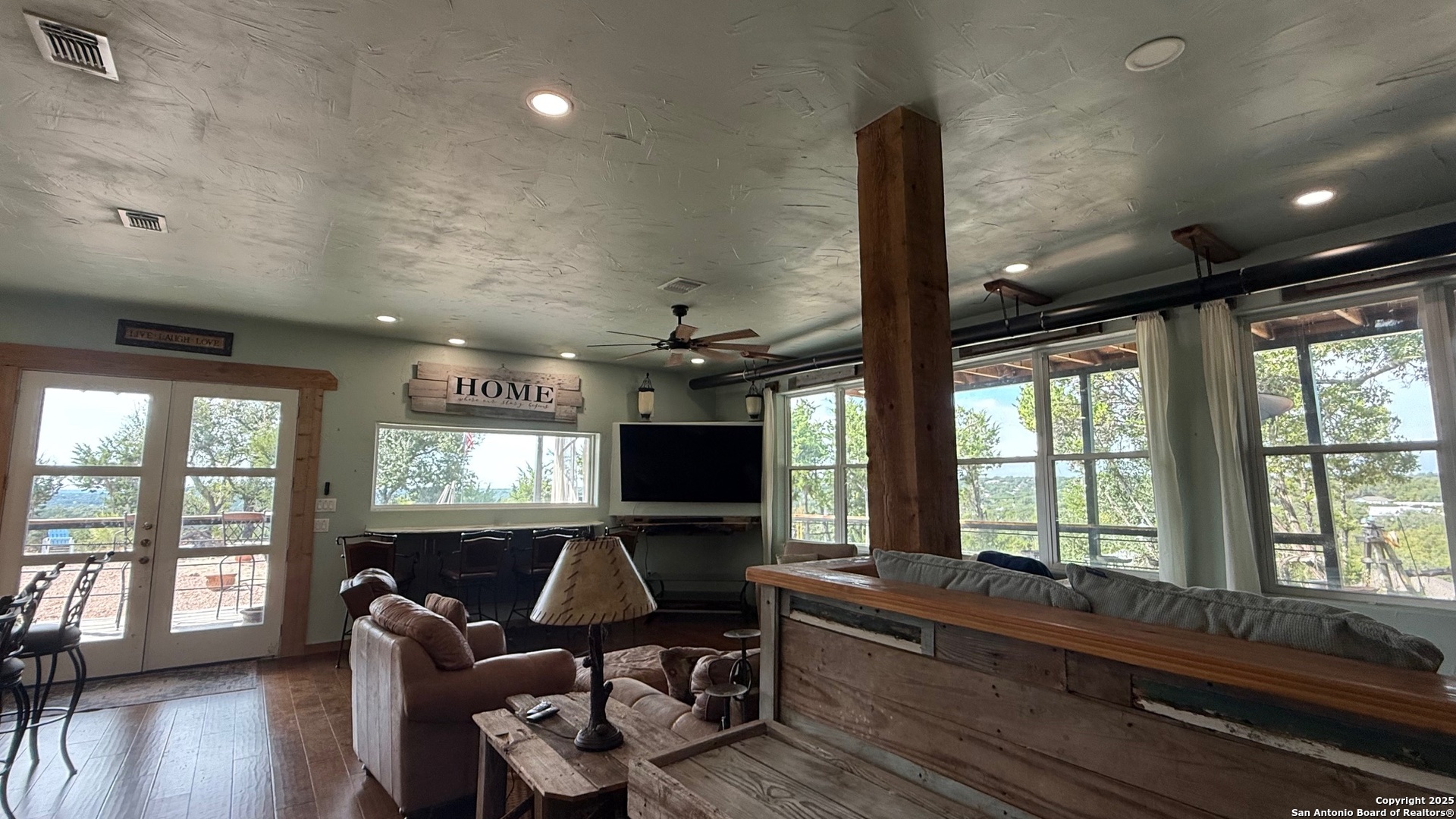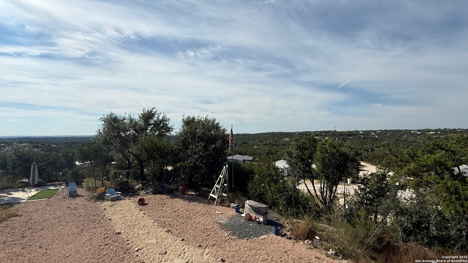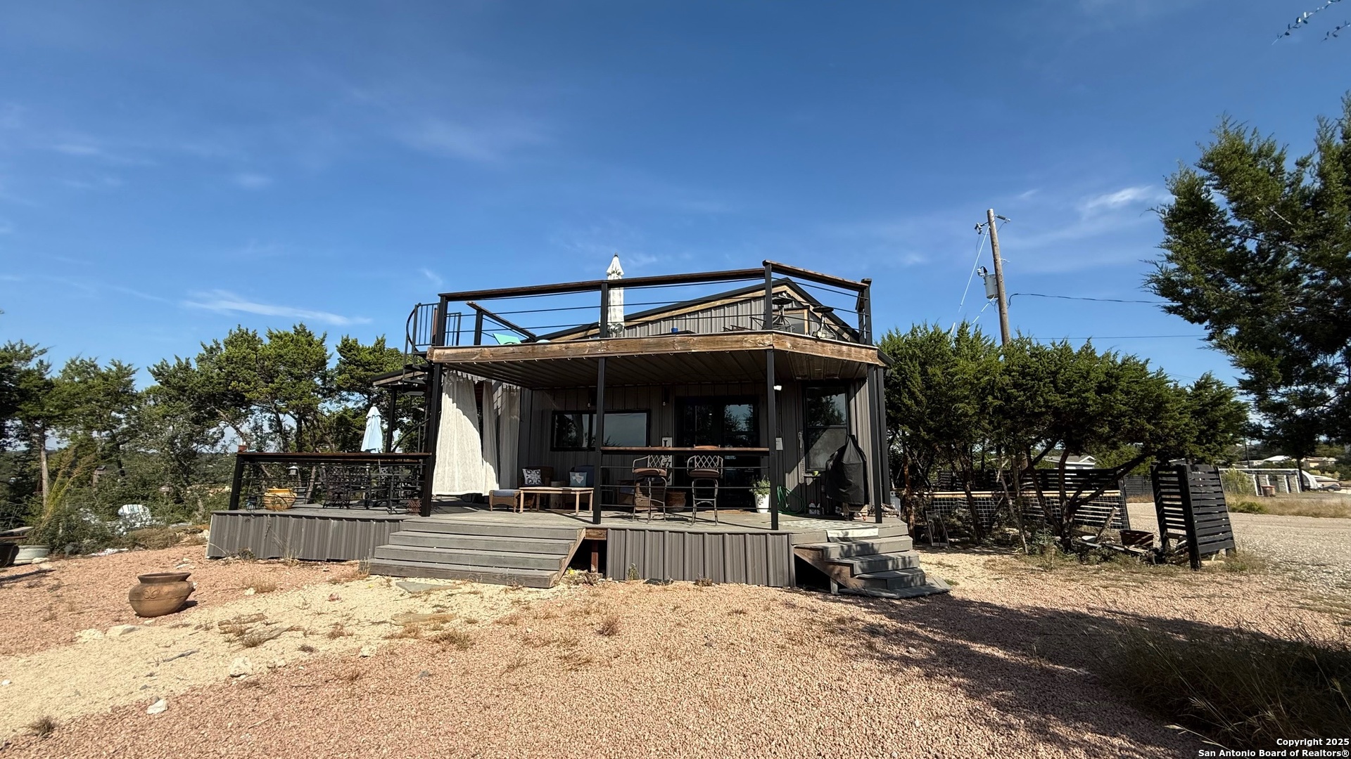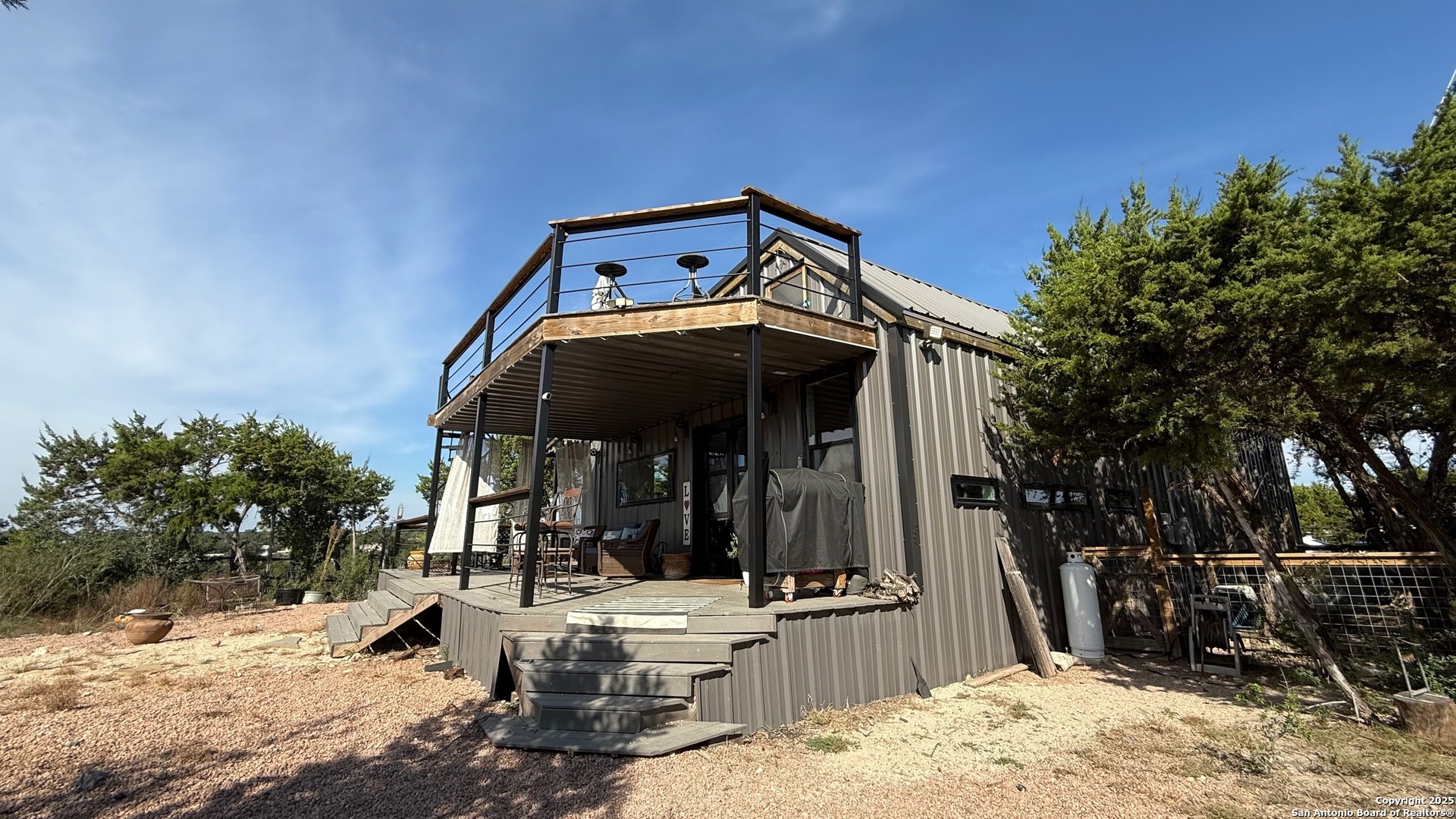 This custom-built fully furnished Lodge is designed for comfort, entertainment, and breathtaking Hill Country living. The spacious family room features a large flat-screen TV, cozy ceiling accents in warm tan, and sunset views that can be enjoyed from the bar seating for four or from a perfect spot affectionately called "La Bella." The open-concept kitchen is a chef's dream, boasting a large island, gas stove, new fridge with ice maker, dishwasher, walk-in pantry, and a sitting area with sunset views-perfect for morning coffee or evening gatherings. A dedicated pool table room with two additional TVs adds to the home's entertainment appeal. The master suite is oversized, with a California King bed, private sitting area, luxurious bath with double vanity, walk-in shower, and expansive closet. Additional storage is abundant, and the home includes a utility room with a newer stackable washer and dryer and a half bath for convenience. Step outside to enjoy a 1,000 sq. ft. deck and observation deck, offering both sunrise and sunset views with a zero-scape yard. Outdoor features include floodlights, deck lighting, ample seating, and plenty of parking. Additional amenities include central AC, a water filtration system, a drinking water system at the kitchen, rain water collection system and a sonic ice maker-every detail designed for comfort and functionality.