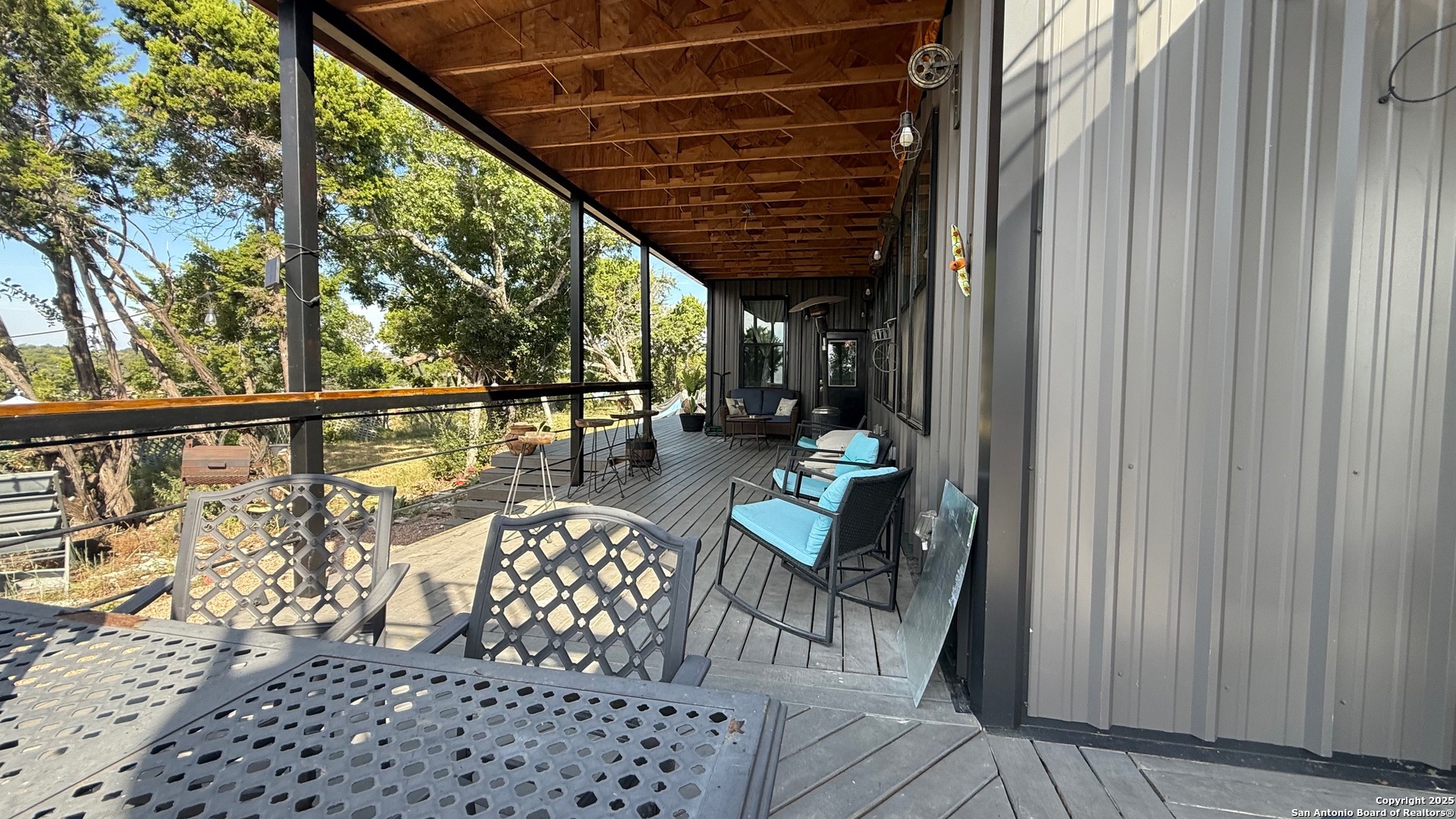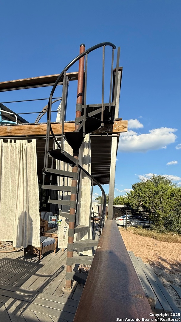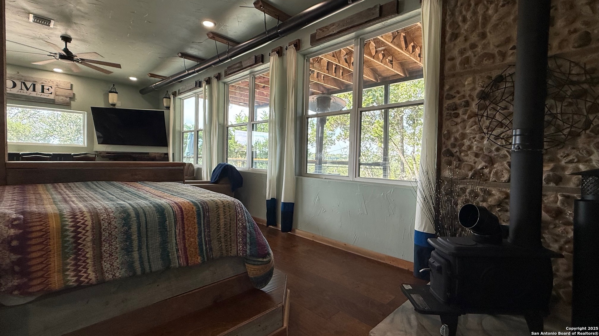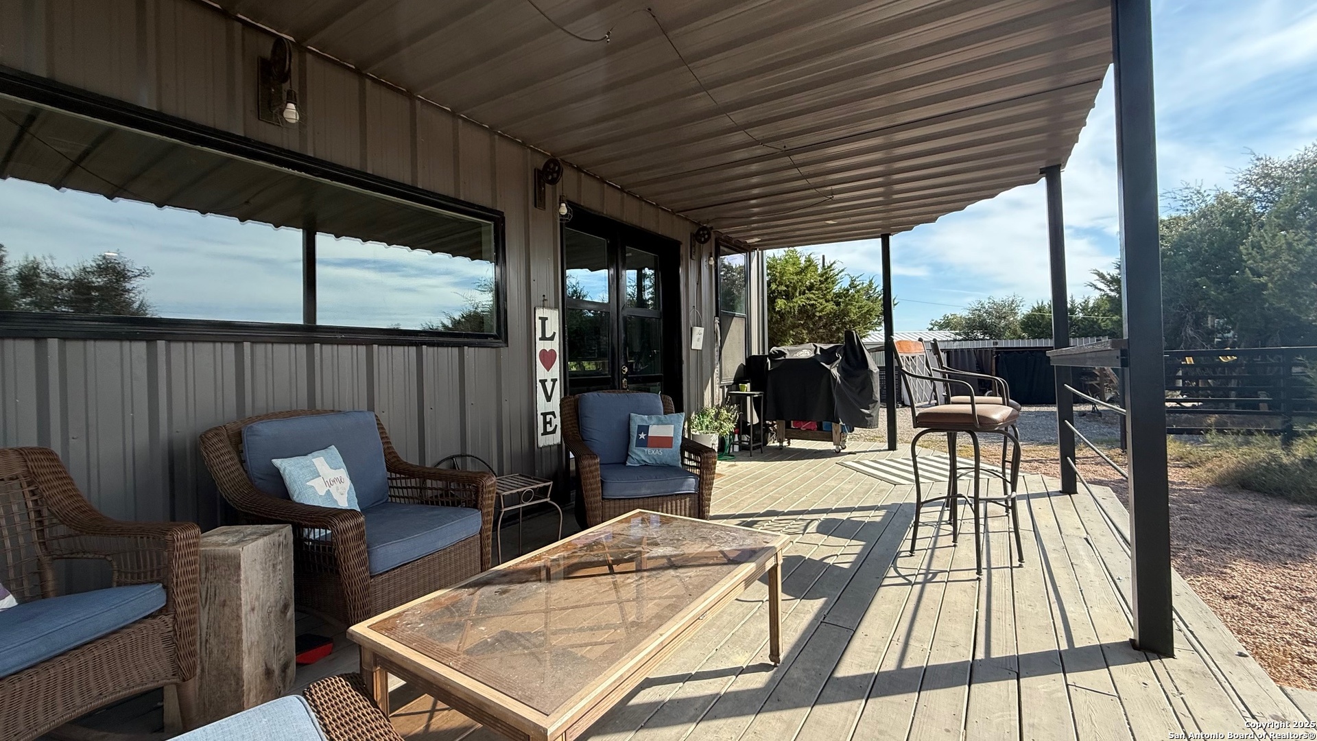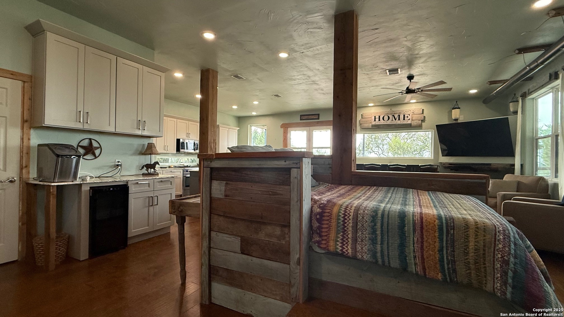 This custom-built fully furnished Lodge is designed for comfort, entertainment, and breathtaking Hill Country living. The spacious family room features a large flat-screen TV, cozy ceiling accents in warm tan, and sunset views that can be enjoyed from the bar seating for four or from a perfect spot affectionately called "La Bella." The open-concept kitchen is a chef's dream, boasting a large island, gas stove, new fridge with ice maker, dishwasher, walk-in pantry, and a sitting area with sunset views-perfect for morning coffee or evening gatherings. A dedicated pool table room with two additional TVs adds to the home's entertainment appeal. The master suite is oversized, with a California King bed, private sitting area, luxurious bath with double vanity, walk-in shower, and expansive closet. Additional storage is abundant, and the home includes a utility room with a newer stackable washer and dryer and a half bath for convenience. Step outside to enjoy a 1,000 sq. ft. deck and observation deck, offering both sunrise and sunset views with a zero-scape yard. Outdoor features include floodlights, deck lighting, ample seating, and plenty of parking. Additional amenities include central AC, a water filtration system, a drinking water system at the kitchen, rain water collection system and a sonic ice maker-every detail designed for comfort and functionality.