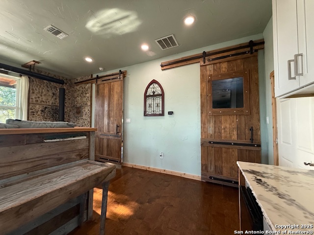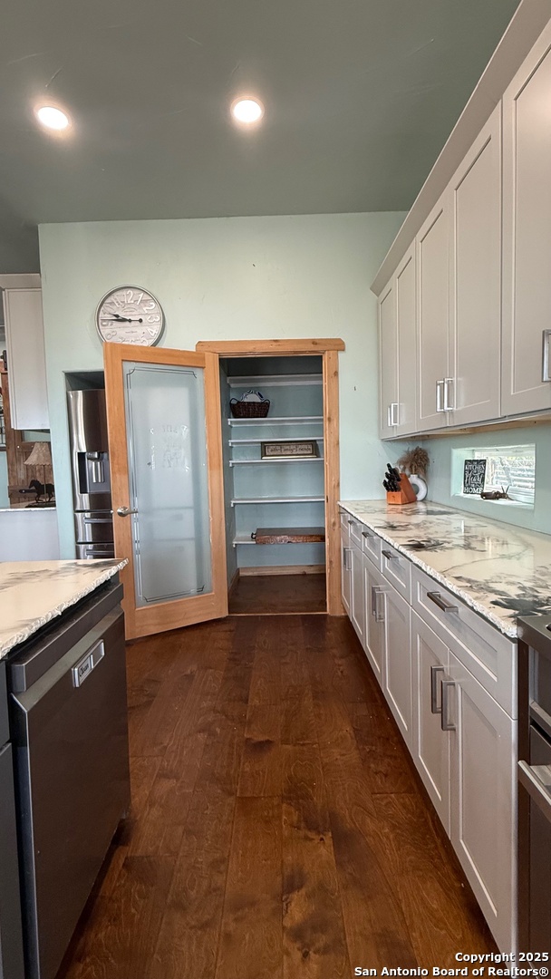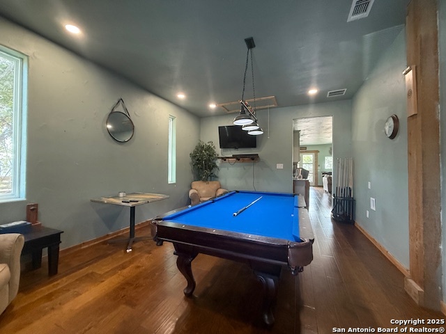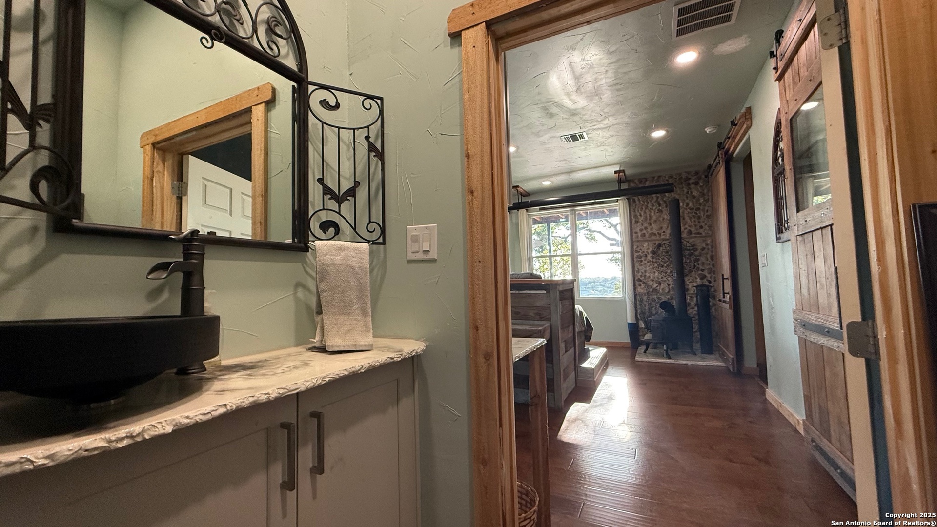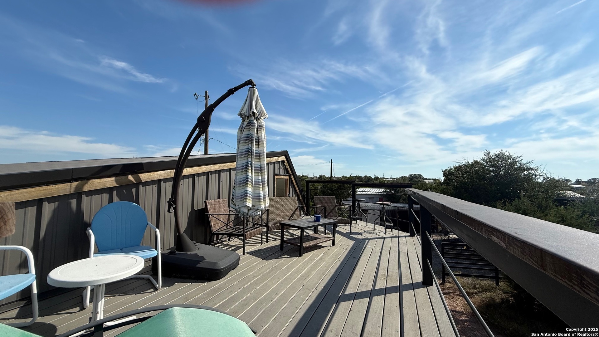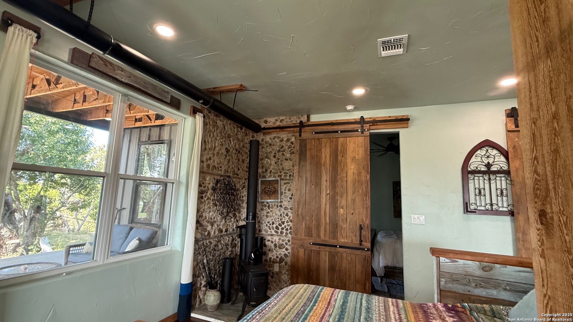 This custom-built fully furnished Lodge is designed for comfort, entertainment, and breathtaking Hill Country living. The spacious family room features a large flat-screen TV, cozy ceiling accents in warm tan, and sunset views that can be enjoyed from the bar seating for four or from a perfect spot affectionately called "La Bella." The open-concept kitchen is a chef's dream, boasting a large island, gas stove, new fridge with ice maker, dishwasher, walk-in pantry, and a sitting area with sunset views-perfect for morning coffee or evening gatherings. A dedicated pool table room with two additional TVs adds to the home's entertainment appeal. The master suite is oversized, with a California King bed, private sitting area, luxurious bath with double vanity, walk-in shower, and expansive closet. Additional storage is abundant, and the home includes a utility room with a newer stackable washer and dryer and a half bath for convenience. Step outside to enjoy a 1,000 sq. ft. deck and observation deck, offering both sunrise and sunset views with a zero-scape yard. Outdoor features include floodlights, deck lighting, ample seating, and plenty of parking. Additional amenities include central AC, a water filtration system, a drinking water system at the kitchen, rain water collection system and a sonic ice maker-every detail designed for comfort and functionality.