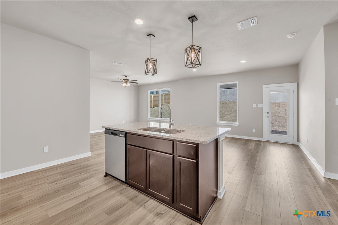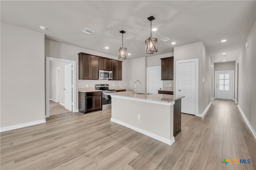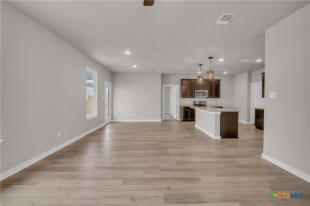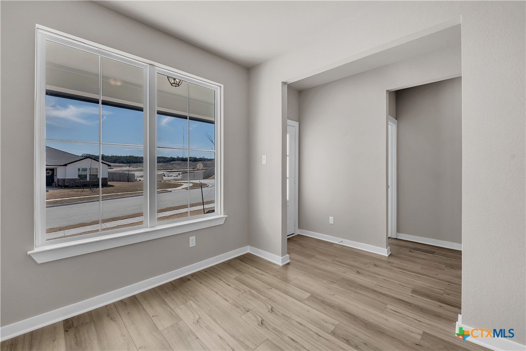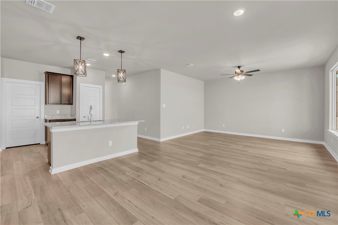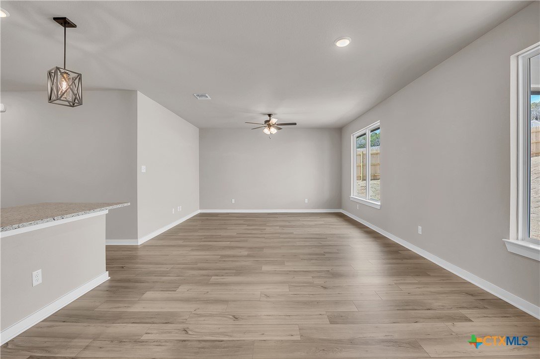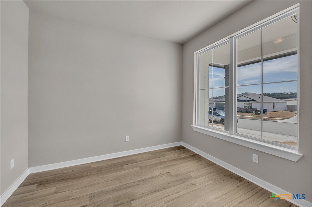 This charming 3 bed, 2 bath home starts with a covered front porch and a welcoming foyer that opens to a versatile Life Space—ideal for a home office, craft room, or play area. The opportunities for this space are plentiful! Choose what works best for your lifestyle. The split floor plan ensures privacy, while the open common area is perfect for gatherings. The kitchen features a central island and a utility room tucked behind it, with convenient access to the garage. The dining room opens to the backyard, making indoor-outdoor living a breeze. Additional Options included: Upgraded front door, integral blinds in rear door, exterior coach lighting, pendant lighting, and a dual primary bathroom vanity.