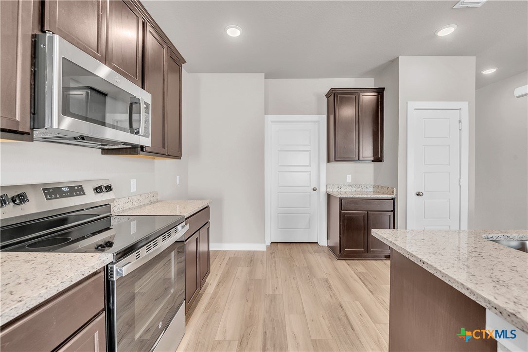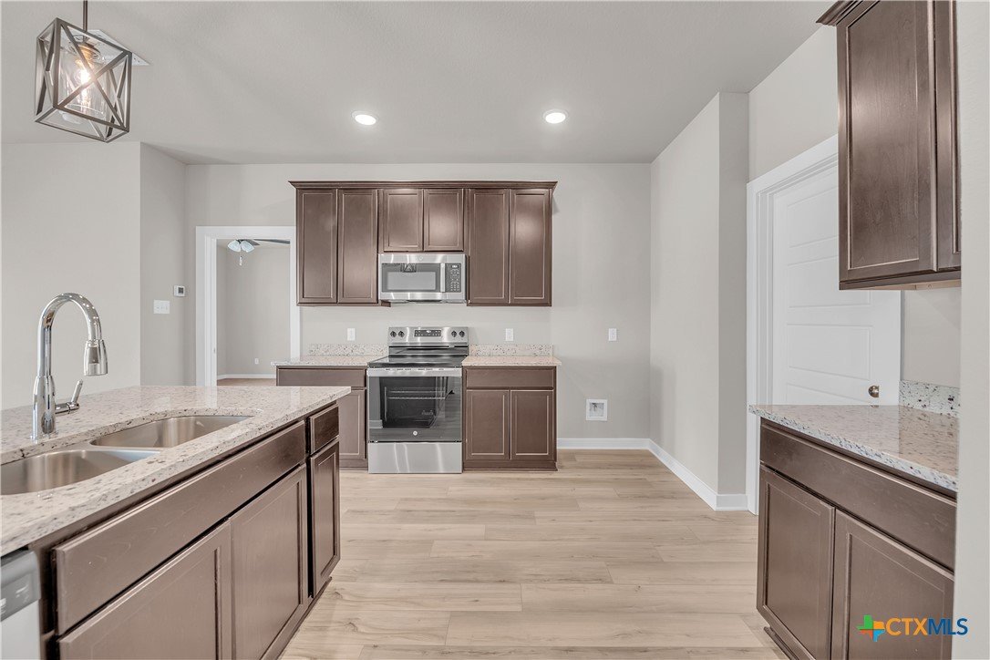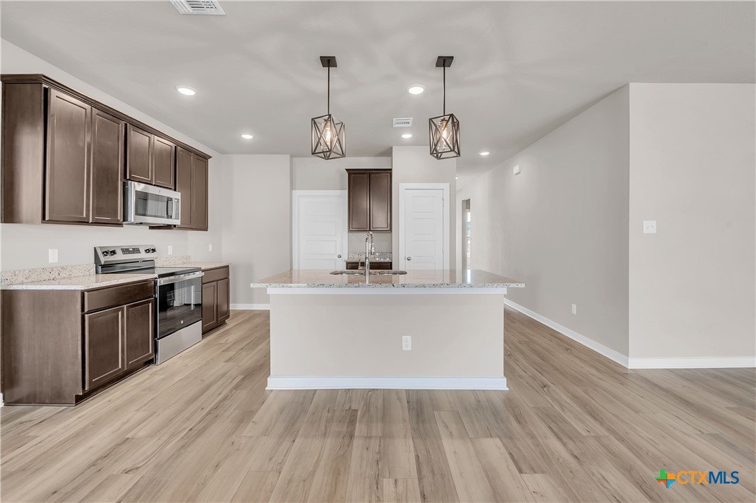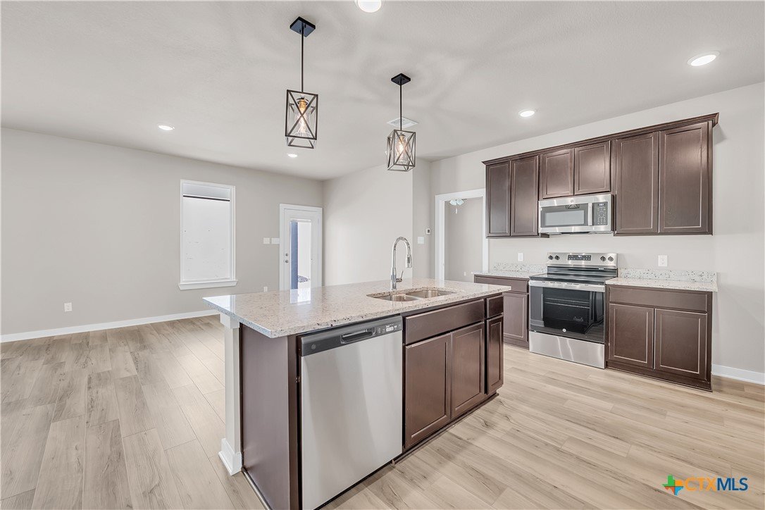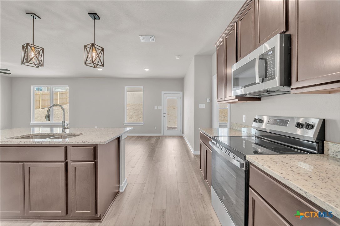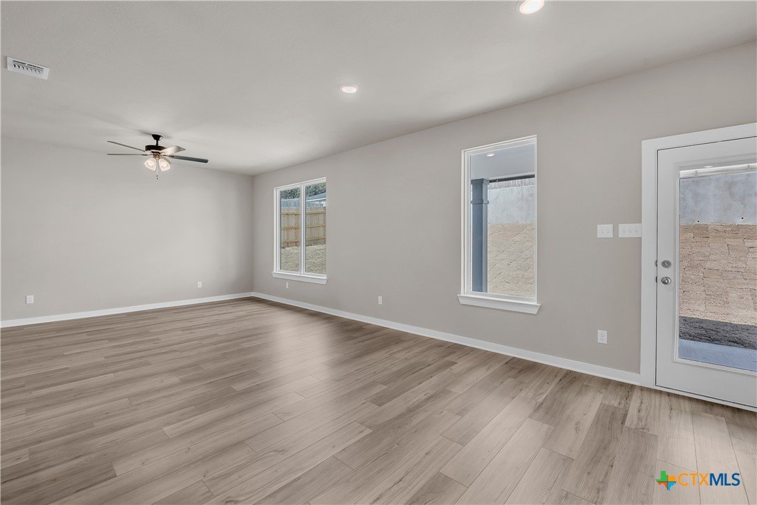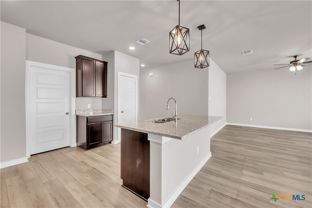 This charming 3 bed, 2 bath home starts with a covered front porch and a welcoming foyer that opens to a versatile Life Space—ideal for a home office, craft room, or play area. The opportunities for this space are plentiful! Choose what works best for your lifestyle. The split floor plan ensures privacy, while the open common area is perfect for gatherings. The kitchen features a central island and a utility room tucked behind it, with convenient access to the garage. The dining room opens to the backyard, making indoor-outdoor living a breeze. Additional Options included: Upgraded front door, integral blinds in rear door, exterior coach lighting, pendant lighting, and a dual primary bathroom vanity.