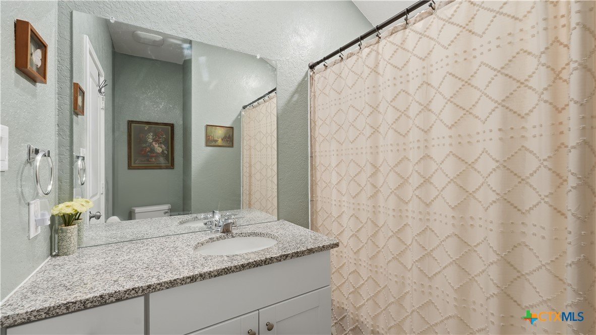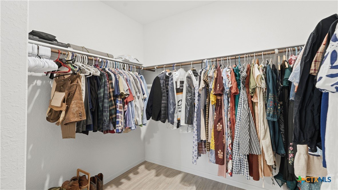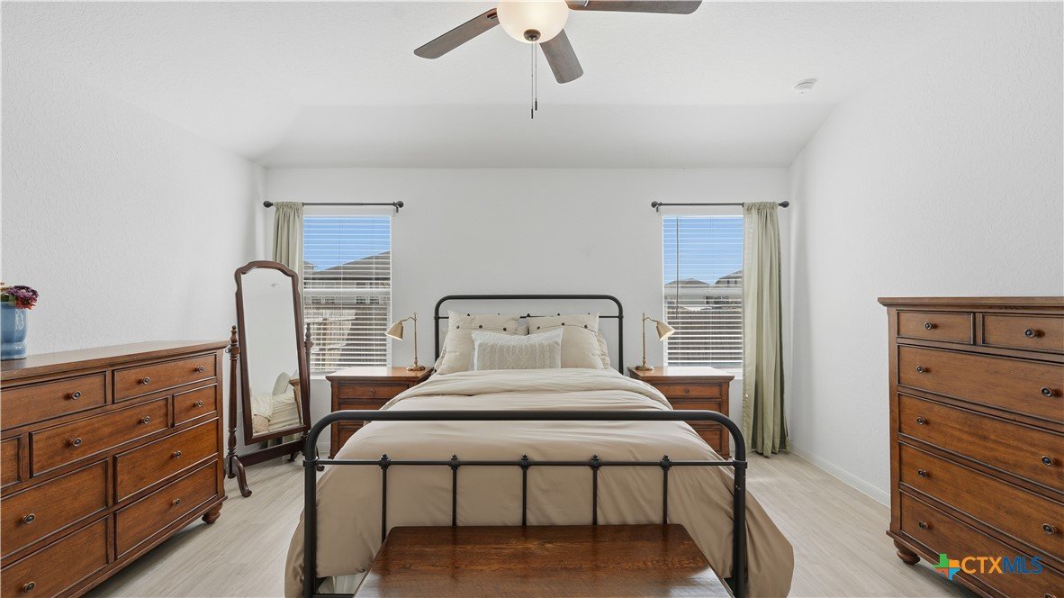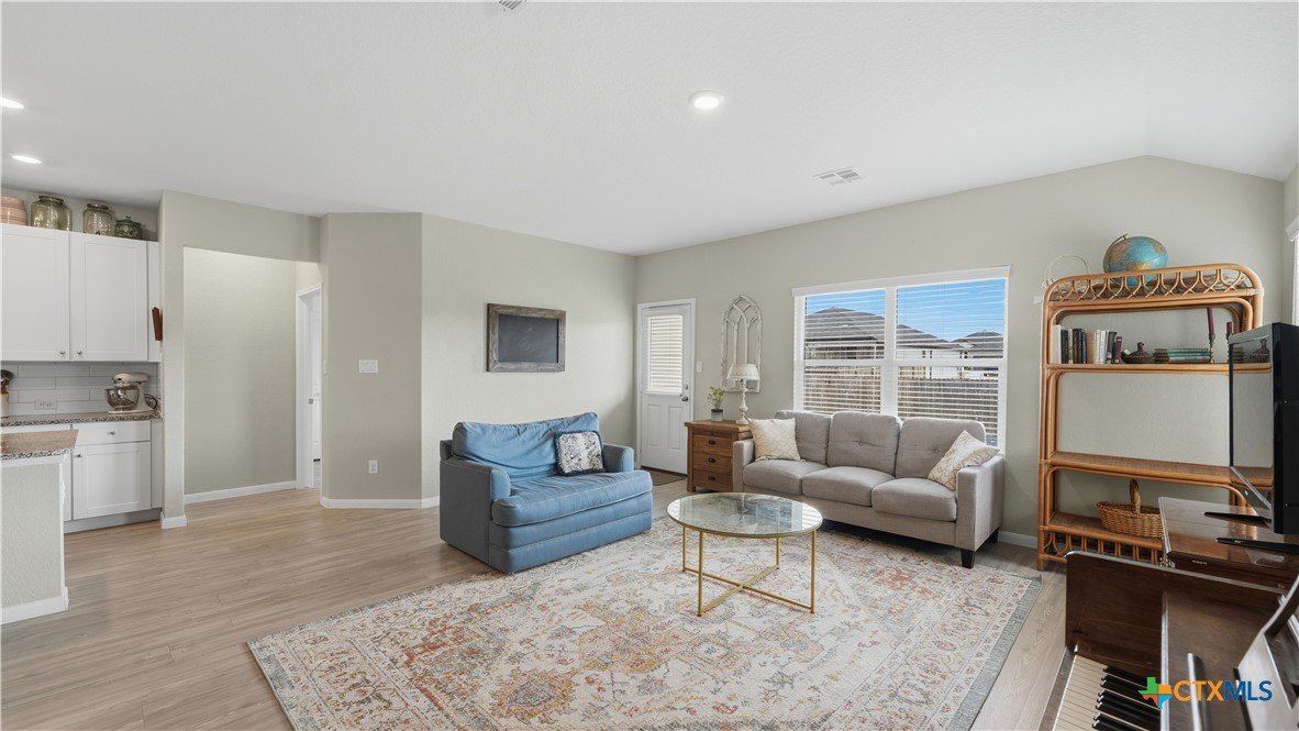 Welcome to this beautifully maintained 4 bedroom, 3 full bathroom home built in 2022, offering 1,910 square feet of thoughtfully designed living space. The smart single-story layout places three bedrooms at the front of the home, while the private owner’s suite sits in the back corner for added privacy. The bright, open living area connects the family room, dining space, and kitchen, creating a comfortable place for everyday living and entertaining. Large windows bring in abundant natural light, and recent interior painting gives the home a fresh, clean feel throughout. The kitchen features a large island, plenty of counter space, and a walk-in pantry. The owner’s suite includes a spacious walk-in closet, double vanity, and large walk-in shower. Outside, enjoy a great backyard space with a recently poured patio slab, plus newly added fruit and shade trees that make the yard both inviting and functional. Surrounded by farms, the property offers a sense of seclusion, making the neighborhood feel quiet and safe. Additional features include a washer, dryer, and refrigerator, all included with the sale. Located in a community with a neighborhood walking trail and playground, this home also offers convenient access to both New Braunfels and Seguin. Zoned to Navarro ISD with Guadalupe County taxes and GVEC utilities.