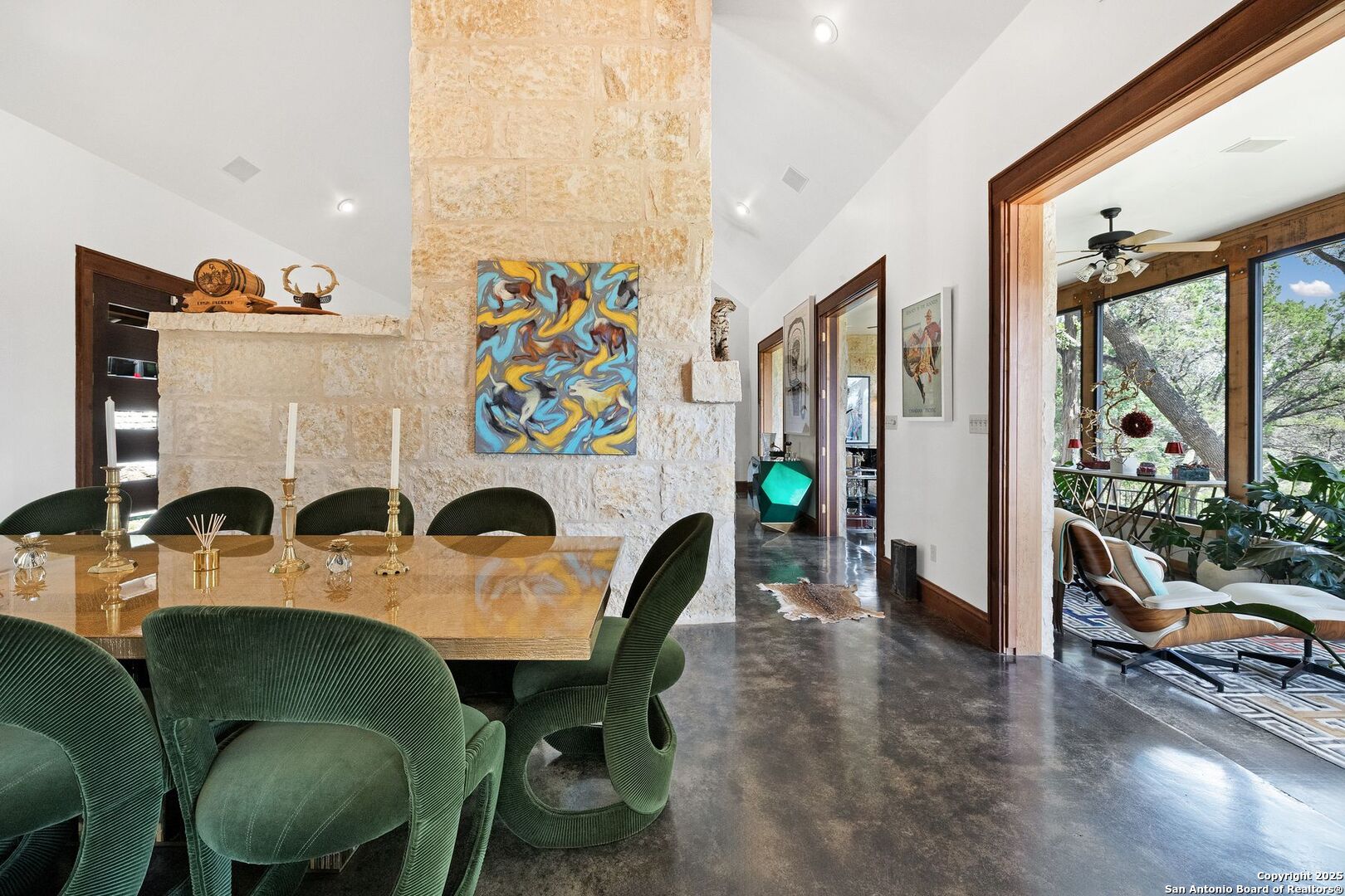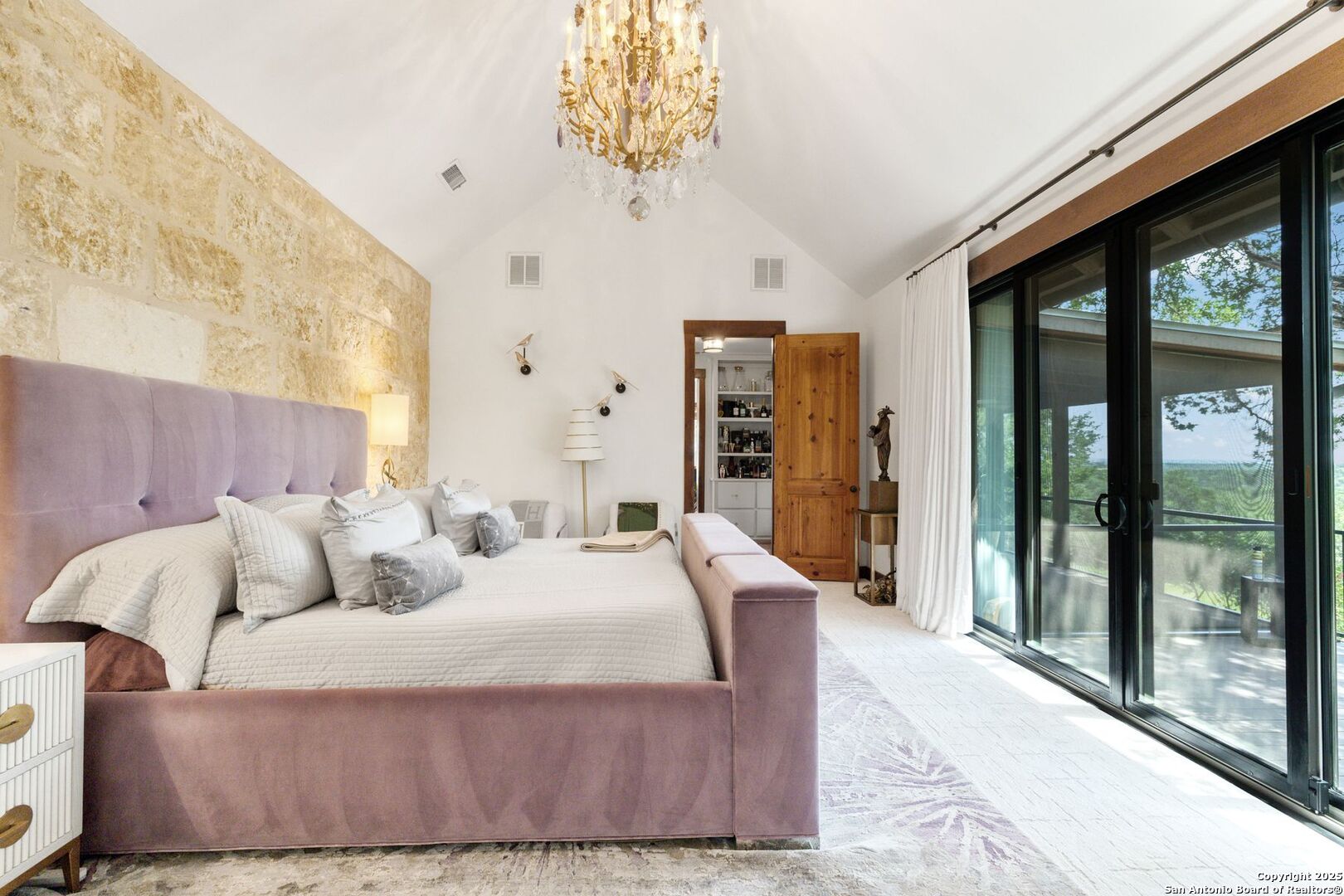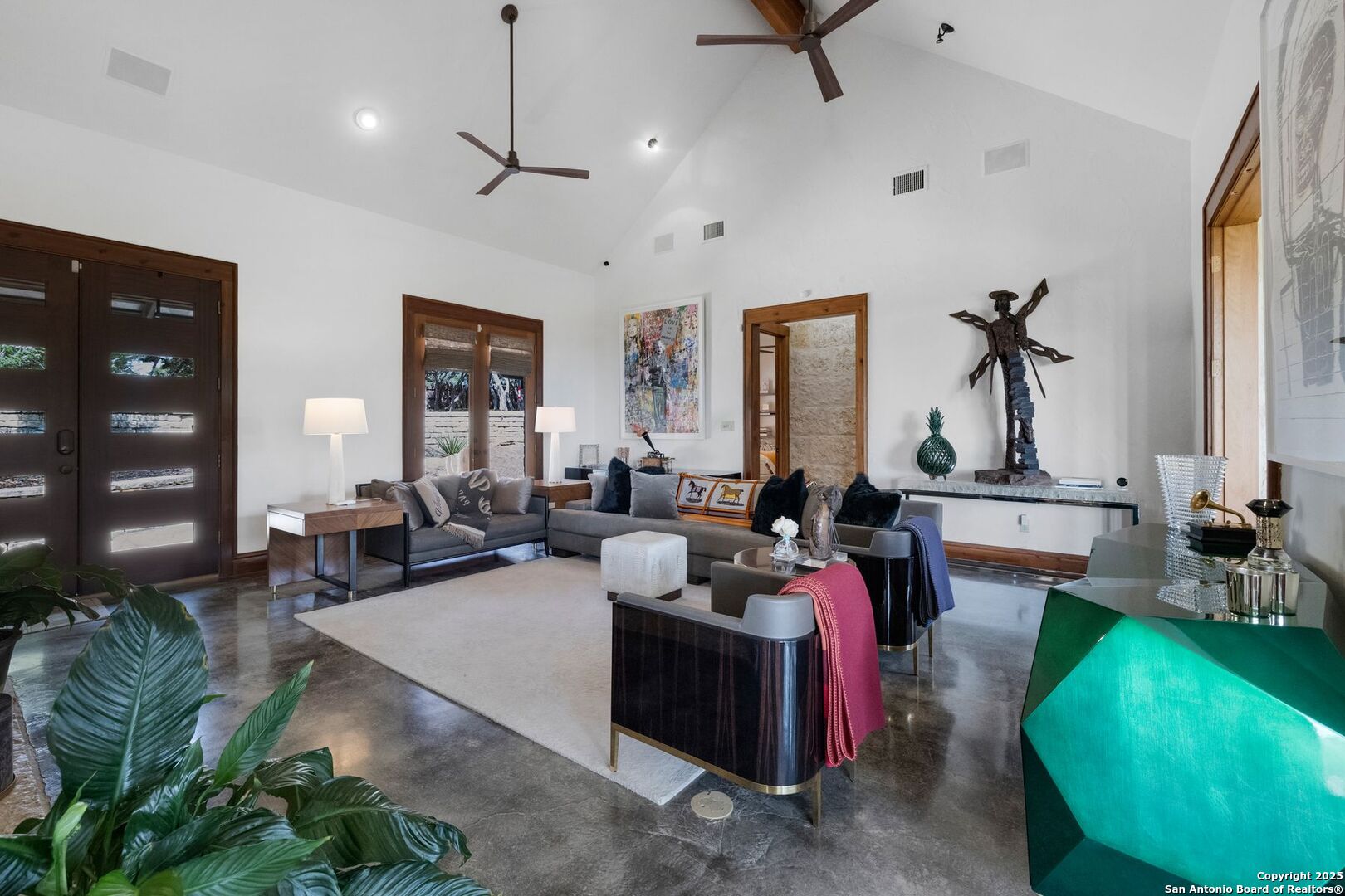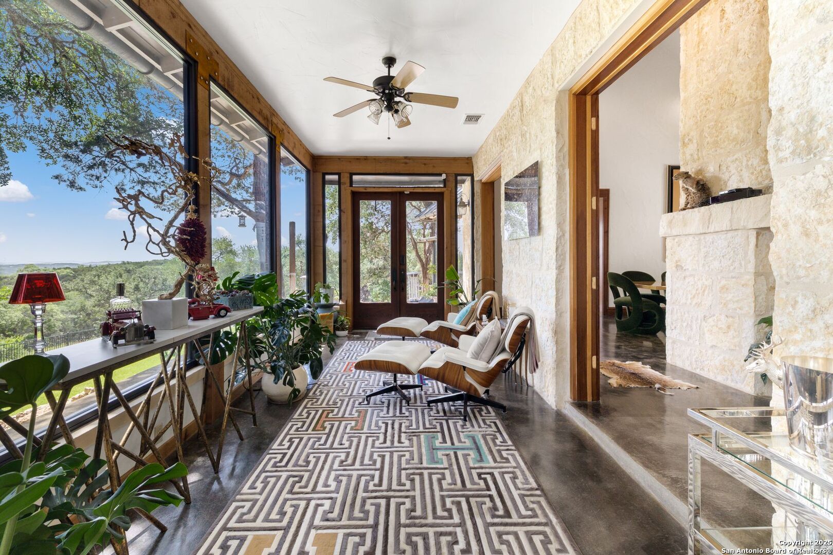 Your own private Hill Country haven just minutes from I-10. A truly exceptional 5.93-acre retreat that backs to an 800-acre private preserve, offering spectacular panoramic views, unmatched privacy, and the freedom of unrestricted living. This peaceful estate features a 3,272 sqft custom Rustic Contemporary home designed for comfort and elegance. Soaring vaulted ceilings and limestone accent walls create a dramatic yet warm atmosphere in the living and dining areas. The gourmet kitchen is a chef's dream, boasting a massive granite center island, custom cabinetry a striking copper vent hood, Viking gas range, and a generous breakfast area that invites casual dining with stunning views. The spacious primary suite is a private sanctuary with patio access, a spa-inspired bath featuring dual granite vanities, frameless glass shower, and custom his-and-her walk-in closets with built-ins. The split floor-plan ensures privacy, with generous secondary bedrooms thoughtfully positioned away from the master wing. Step outside to a screened patio, fully fenced grounds and multiple luxury lifestyle amenities. A detached 850 sqft gym with a full bath offers flexibility as a fitness space, guest house, or creative studio. Adjacent is a spa for the ultimate relaxation. Entertain effortlessly at the outdoor kitchen, complete with a pizza oven and authentic Argentine grill. For the enthusiast or collector, the property includes a massive 2,400 sqft climate-controlled garage perfect as a mega man cave, workshop, or car collector's dream setup. In addition to the main garage, the property includes general garage parking for 10+ more vehicles, offering a total setup that's virtually unmatched for nearly 20 vehicles. Whether you're a serious collector, hobbyist, or just want the ultimate space to store, work, and entertain - this property delivers on all fronts. State-of-the-art security with RFID gated entry that ensures both privacy and convenience. This is Hill Country living at its finest. Luxury, freedom, and endless views. Schedule your private showing today.