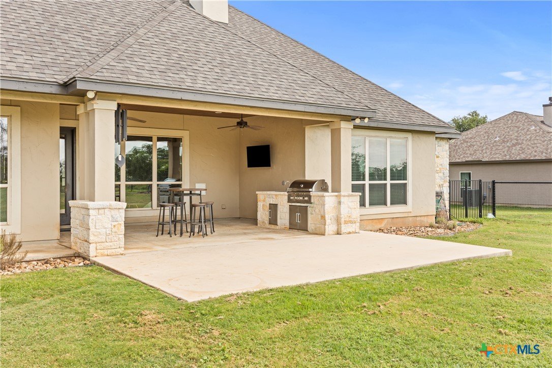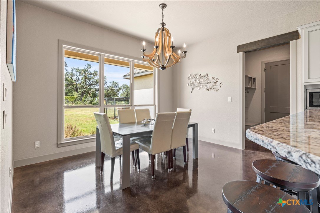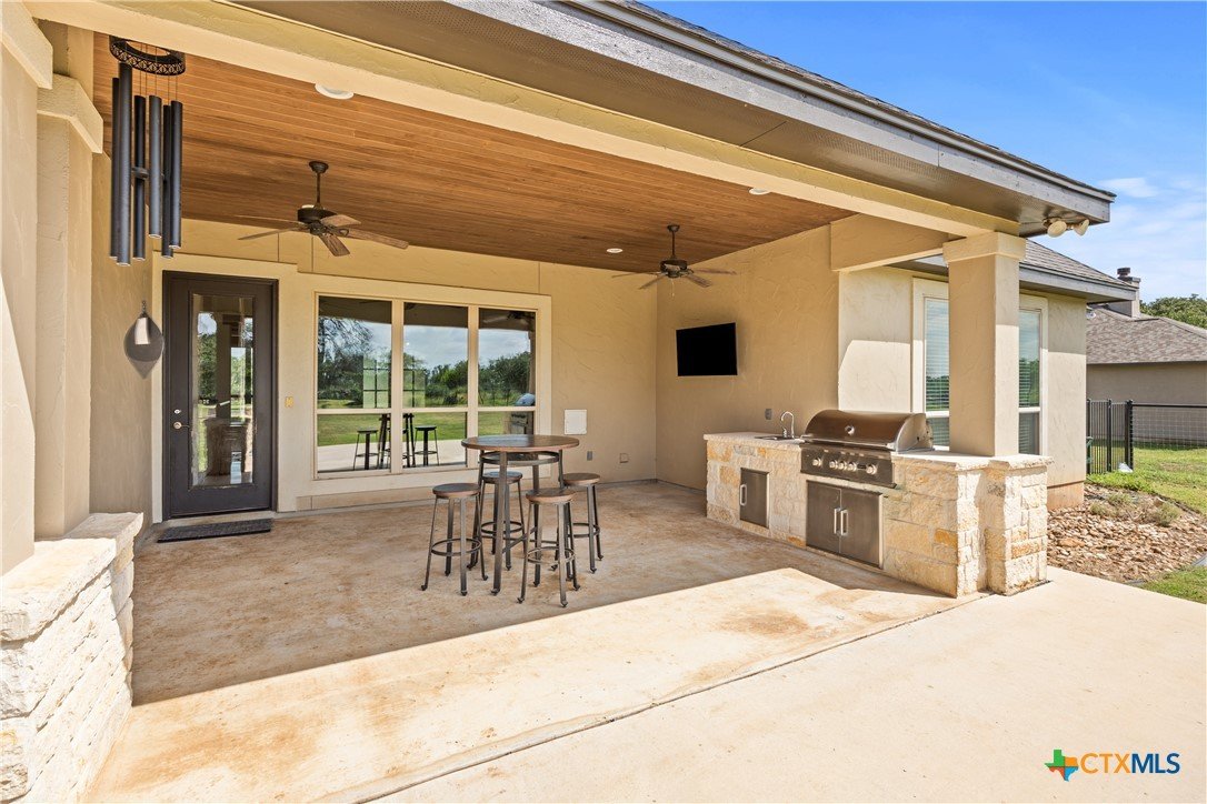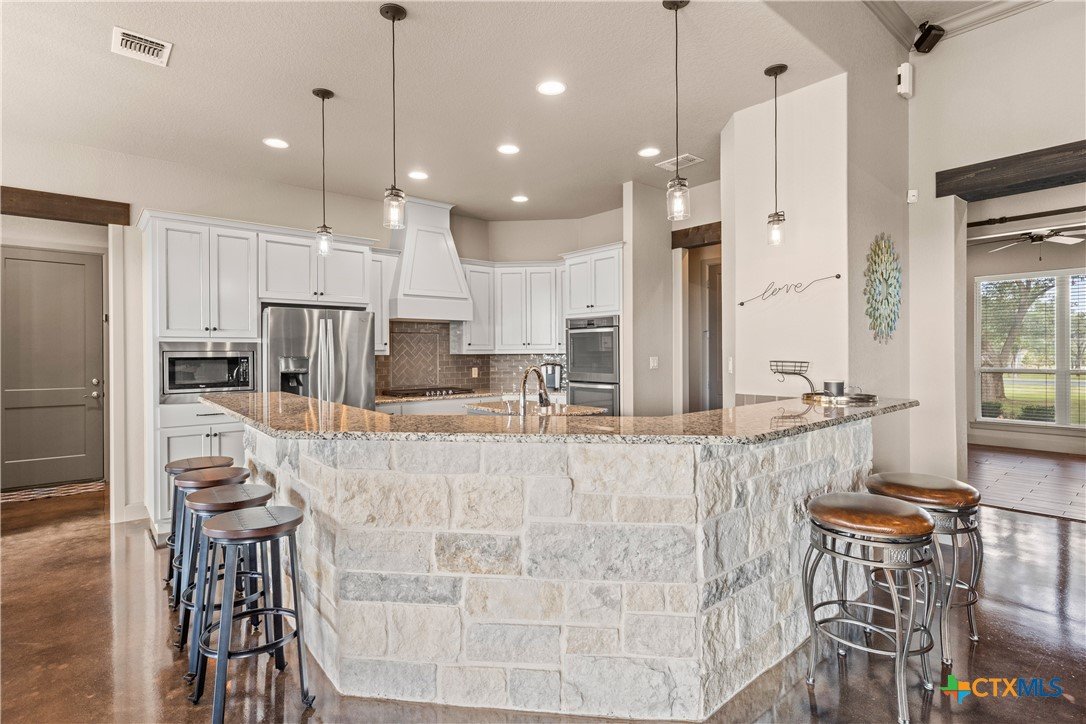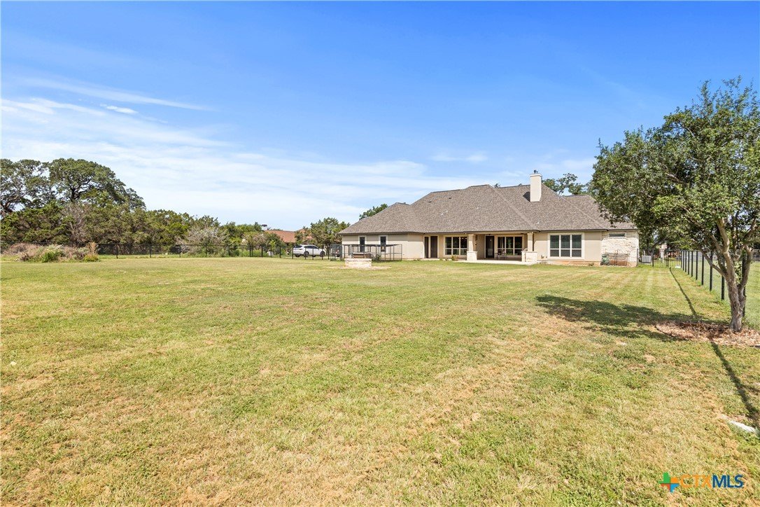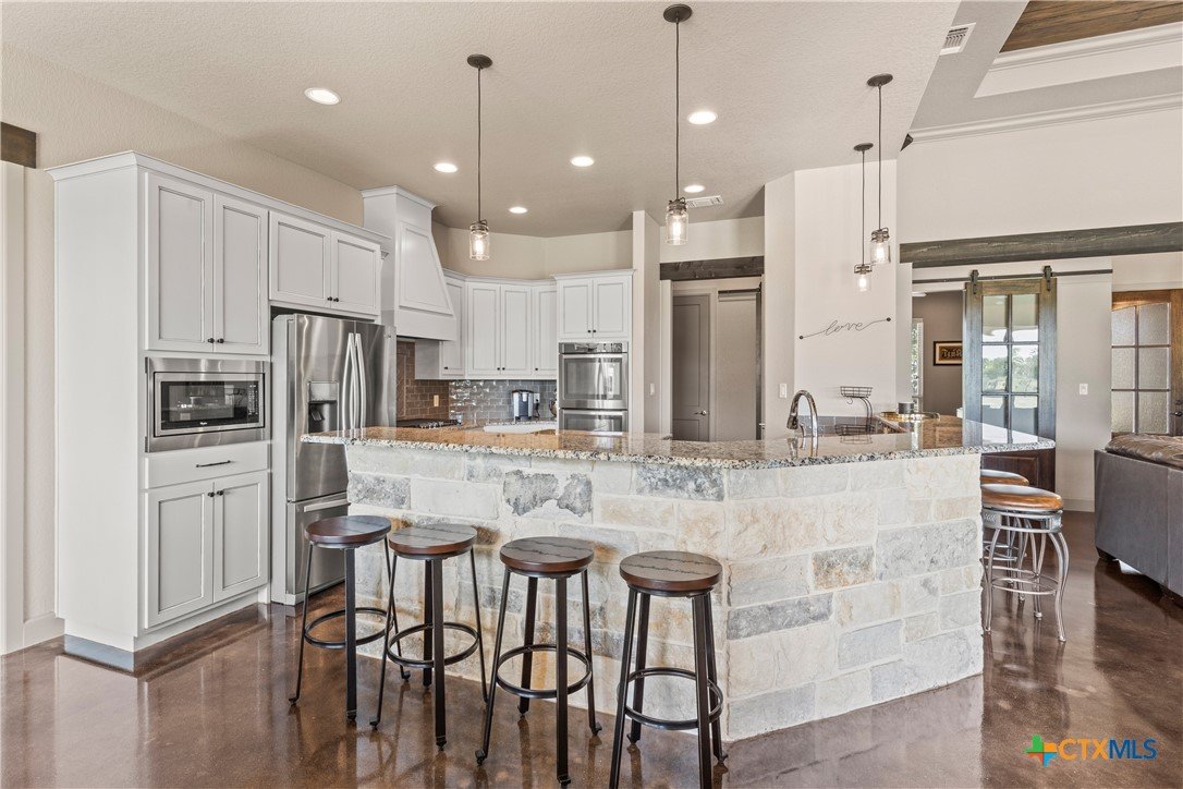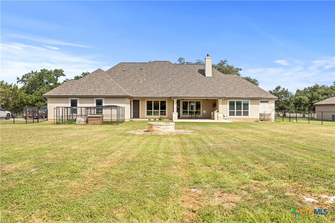 Welcome to your unique Modern Hill Country Home, nestled on just over an acre of land among majestic oaks. This meticulously crafted residence offers an unparalleled blend of comfort, luxury, and breathtaking natural beauty. Situated just off the beaten path, this home provides a peaceful retreat from city congestion while remaining conveniently close to shopping, restaurants, and recreation. Completed in 2016, this custom-built home spans 3,033 sq ft and features 4 bedrooms and 3.5 bathrooms. The residence boasts numerous upgrades, including wood-inlaid ceilings, stained concrete flooring, stunning light fixtures, a home office, tall ceilings, and custom doors. As you step through the beautiful double doors into the foyer, you're greeted by an inviting open floor plan that seamlessly connects the living spaces. The split floor plan, with a Jack and Jill layout, ensures everyone has room to spread out while maintaining a central gathering spot. The expansive master suite, located on one side of the home, features large his and hers closets and a private bath with ample space for all your needs. The cozy fireplace in the corner of the living area draws your eye, leading you to the open kitchen where gas cooking adds a touch of gourmet flair to meal preparation. The extra-large wall of windows offers a view of the outdoor kitchen and spacious fenced backyard. Need space for your toys? The 3-car garage offers oversized bays and 8-foot overhead doors. Additionally, the home is just a short walk from neighborhood amenities, including a pool, playground, volleyball court, tennis court, and walking trail. Don't miss the opportunity to own this exquisite home that combines modern luxury with natural beauty.