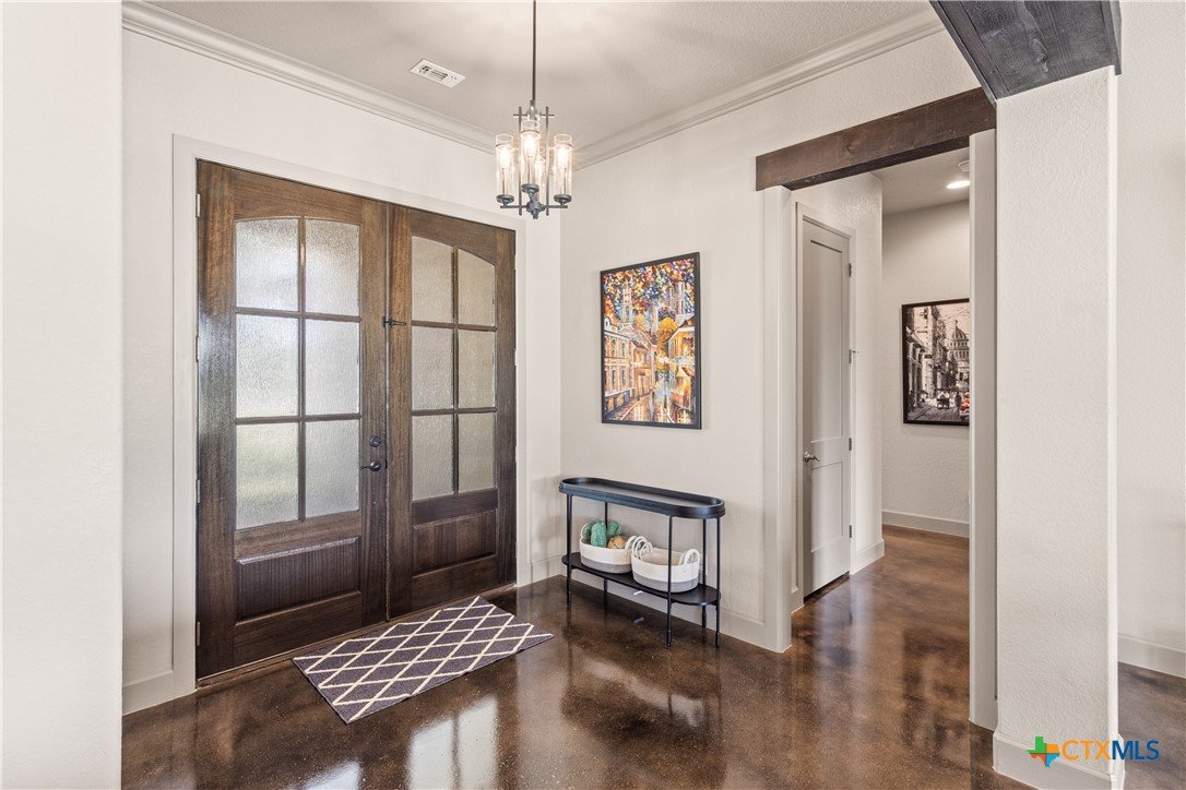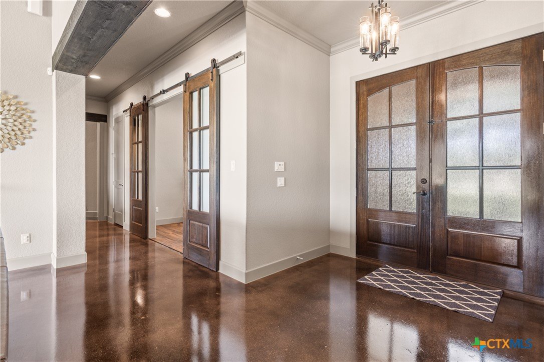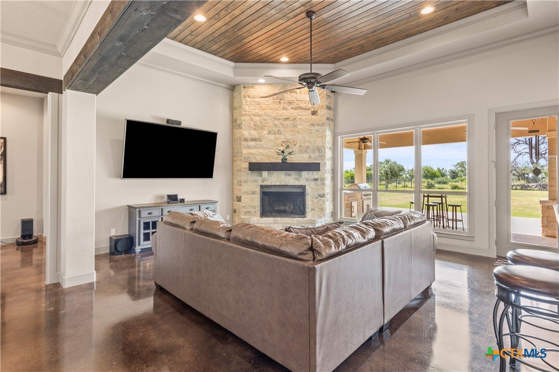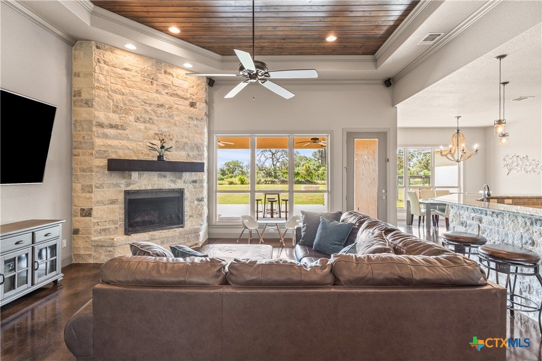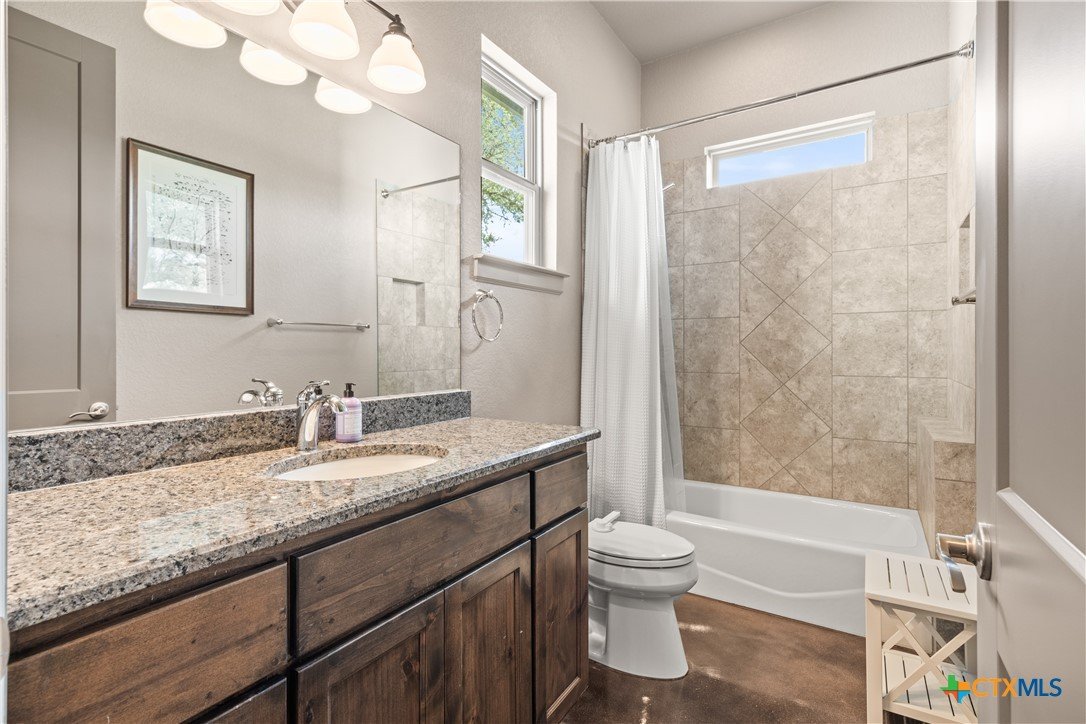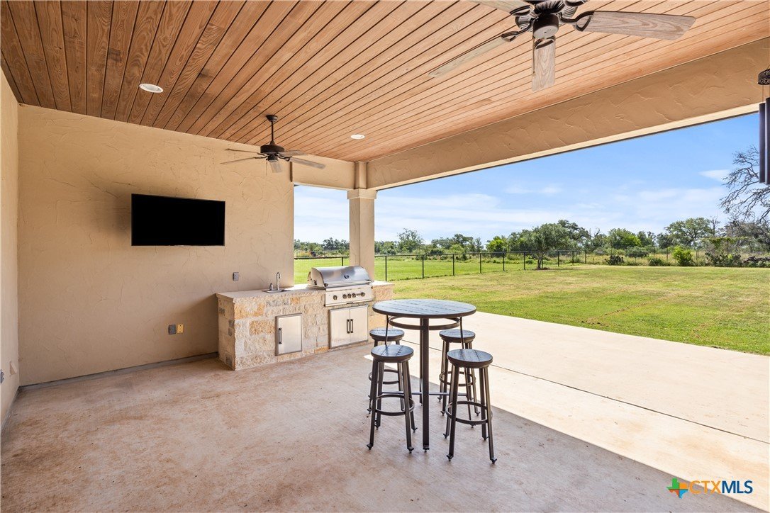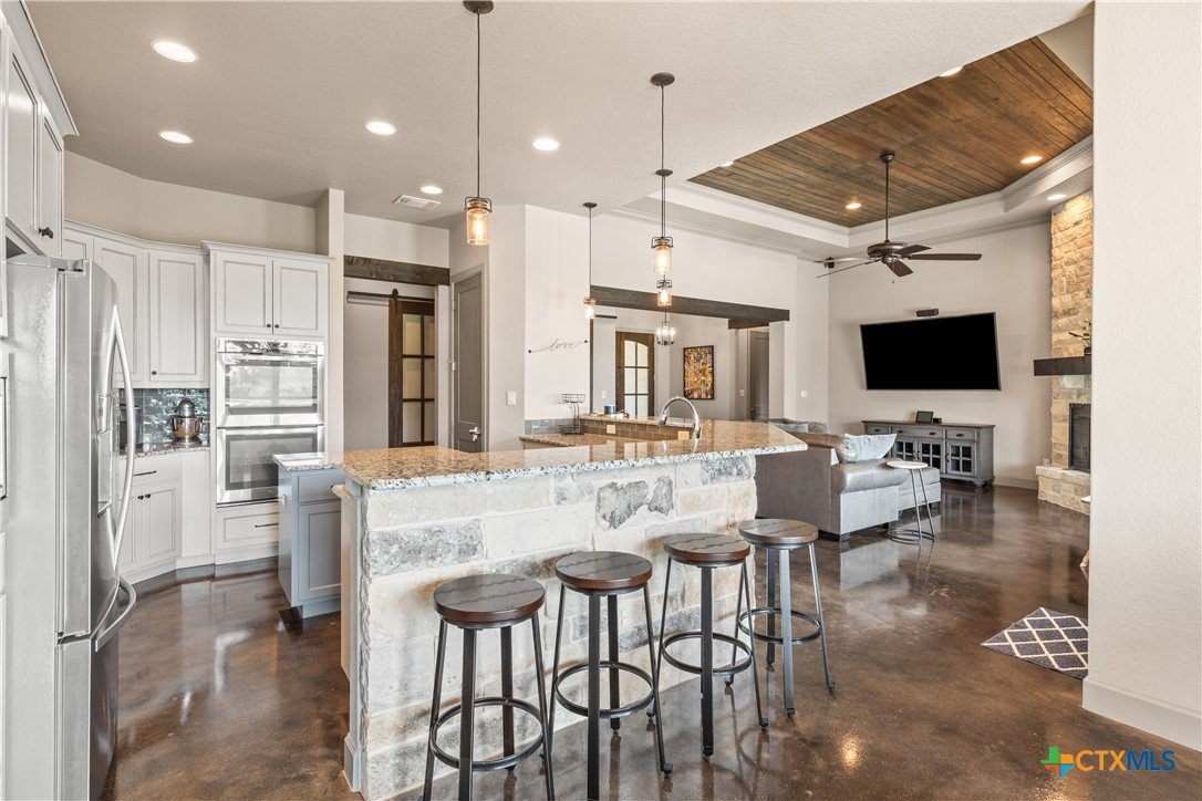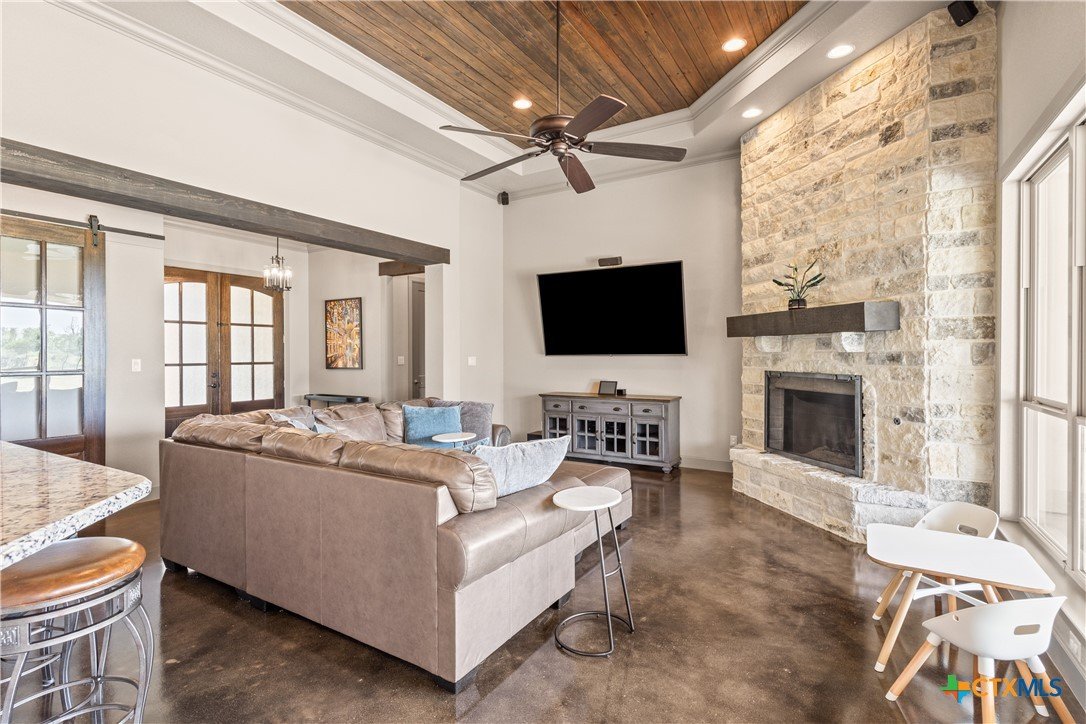 Welcome to your unique Modern Hill Country Home, nestled on just over an acre of land among majestic oaks. This meticulously crafted residence offers an unparalleled blend of comfort, luxury, and breathtaking natural beauty. Situated just off the beaten path, this home provides a peaceful retreat from city congestion while remaining conveniently close to shopping, restaurants, and recreation. Completed in 2016, this custom-built home spans 3,033 sq ft and features 4 bedrooms and 3.5 bathrooms. The residence boasts numerous upgrades, including wood-inlaid ceilings, stained concrete flooring, stunning light fixtures, a home office, tall ceilings, and custom doors. As you step through the beautiful double doors into the foyer, you're greeted by an inviting open floor plan that seamlessly connects the living spaces. The split floor plan, with a Jack and Jill layout, ensures everyone has room to spread out while maintaining a central gathering spot. The expansive master suite, located on one side of the home, features large his and hers closets and a private bath with ample space for all your needs. The cozy fireplace in the corner of the living area draws your eye, leading you to the open kitchen where gas cooking adds a touch of gourmet flair to meal preparation. The extra-large wall of windows offers a view of the outdoor kitchen and spacious fenced backyard. Need space for your toys? The 3-car garage offers oversized bays and 8-foot overhead doors. Additionally, the home is just a short walk from neighborhood amenities, including a pool, playground, volleyball court, tennis court, and walking trail. Don't miss the opportunity to own this exquisite home that combines modern luxury with natural beauty.
