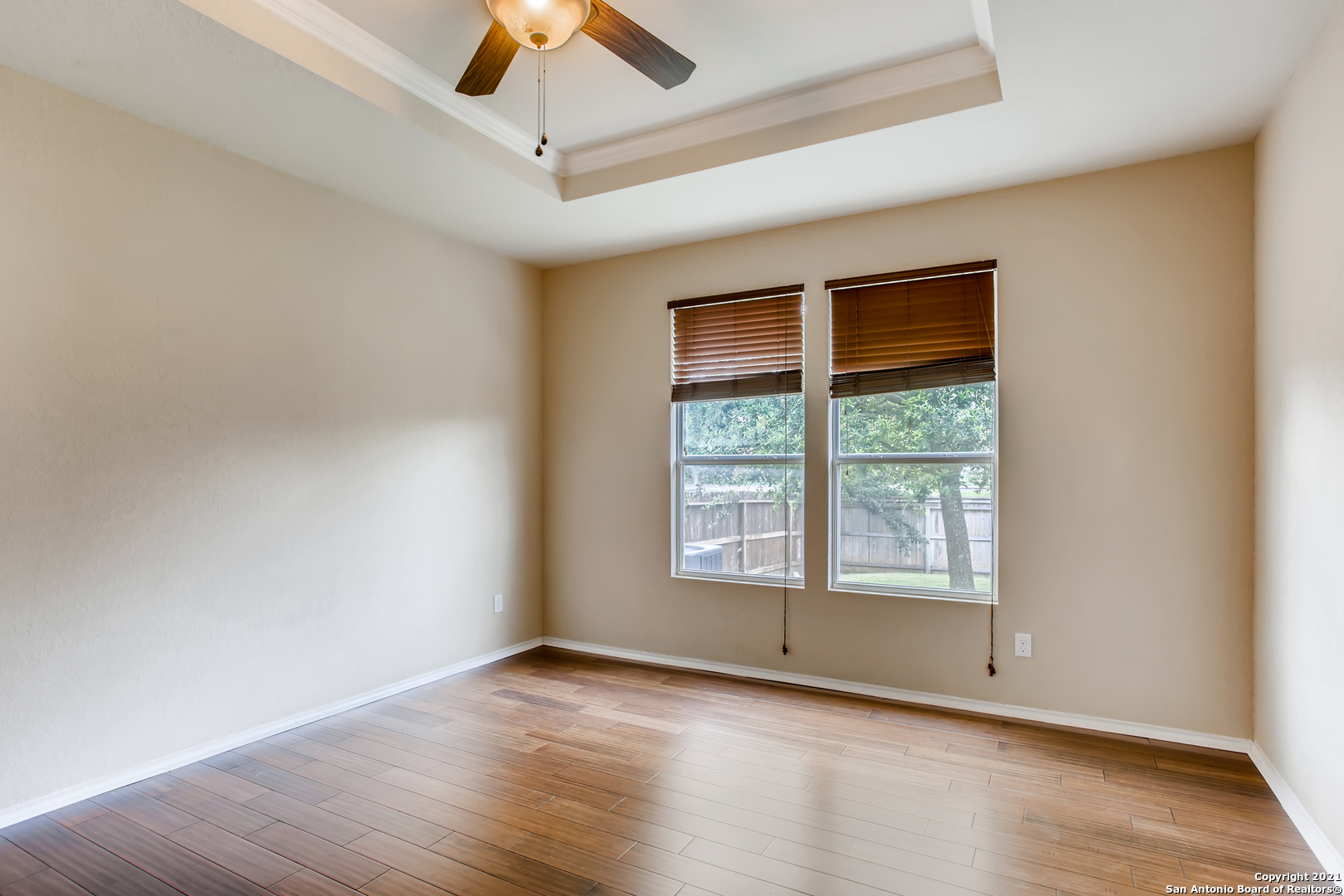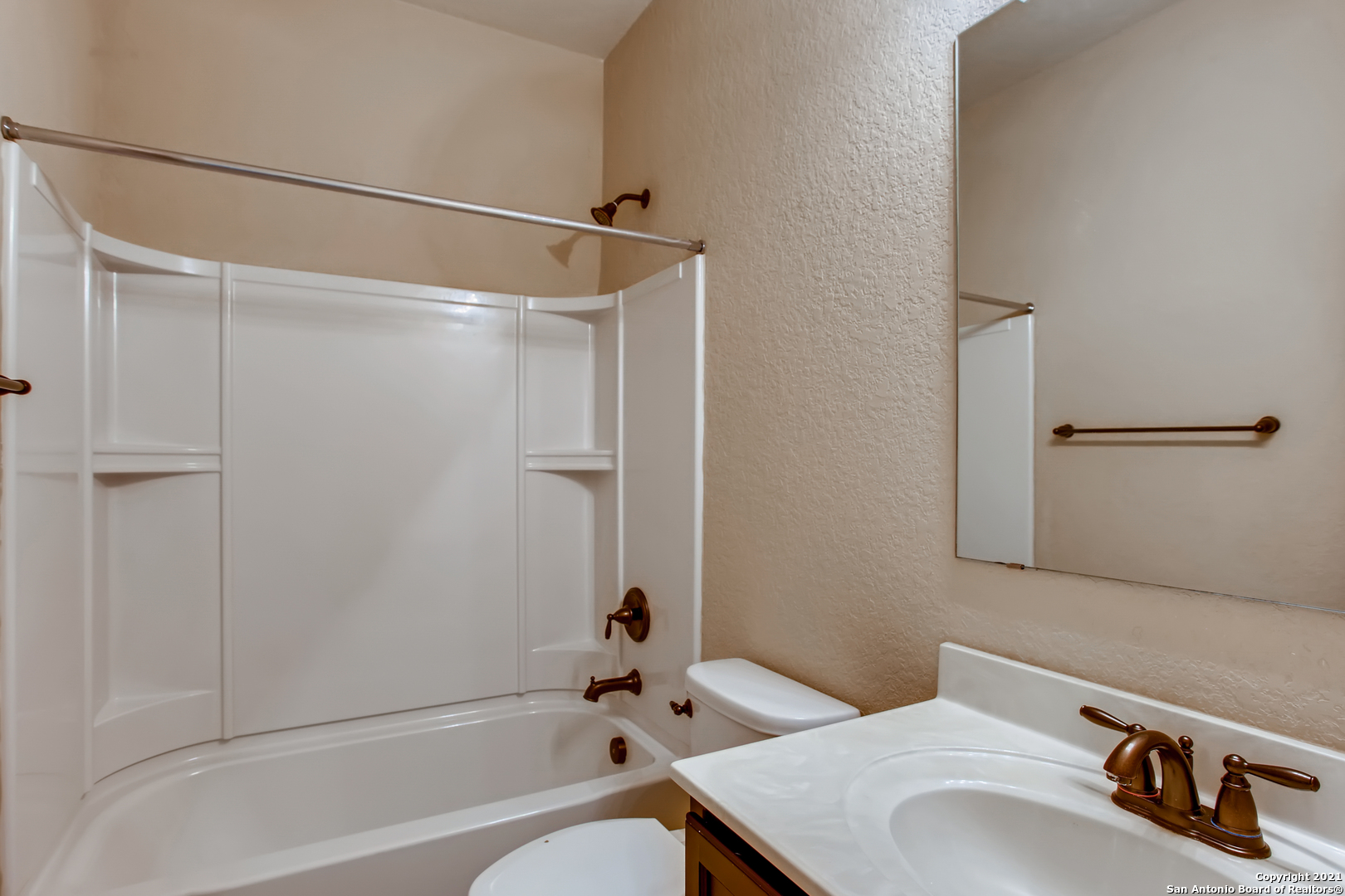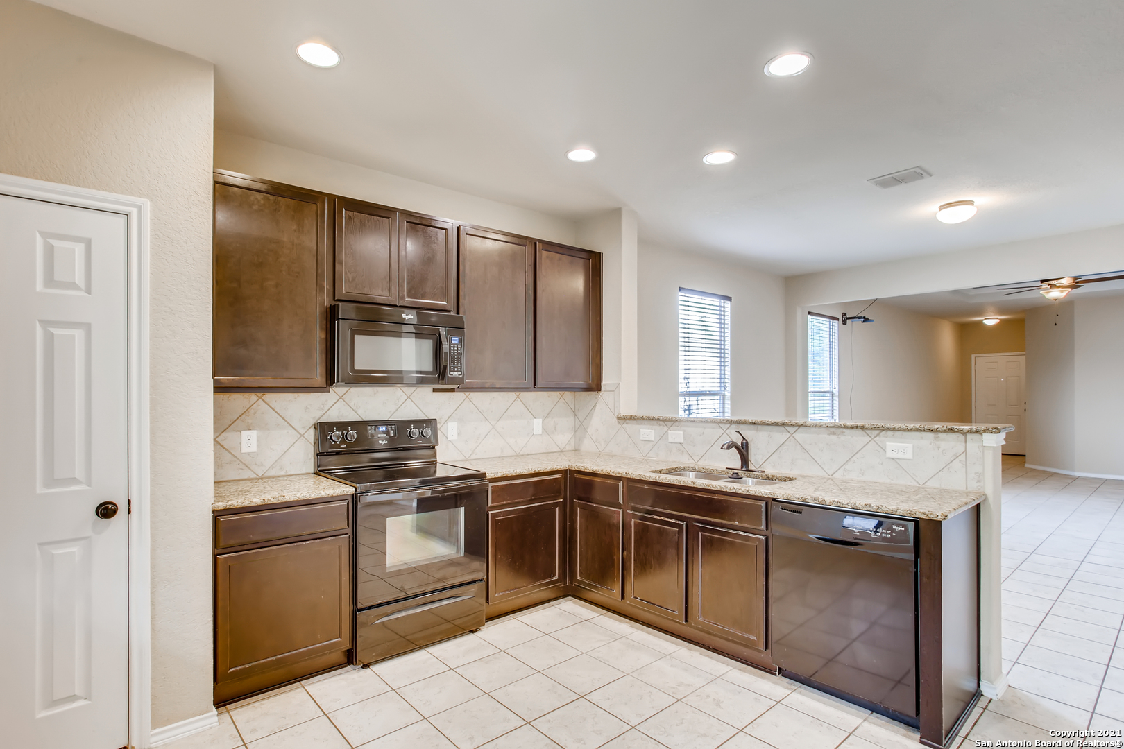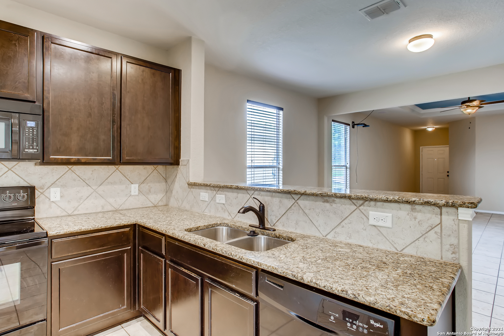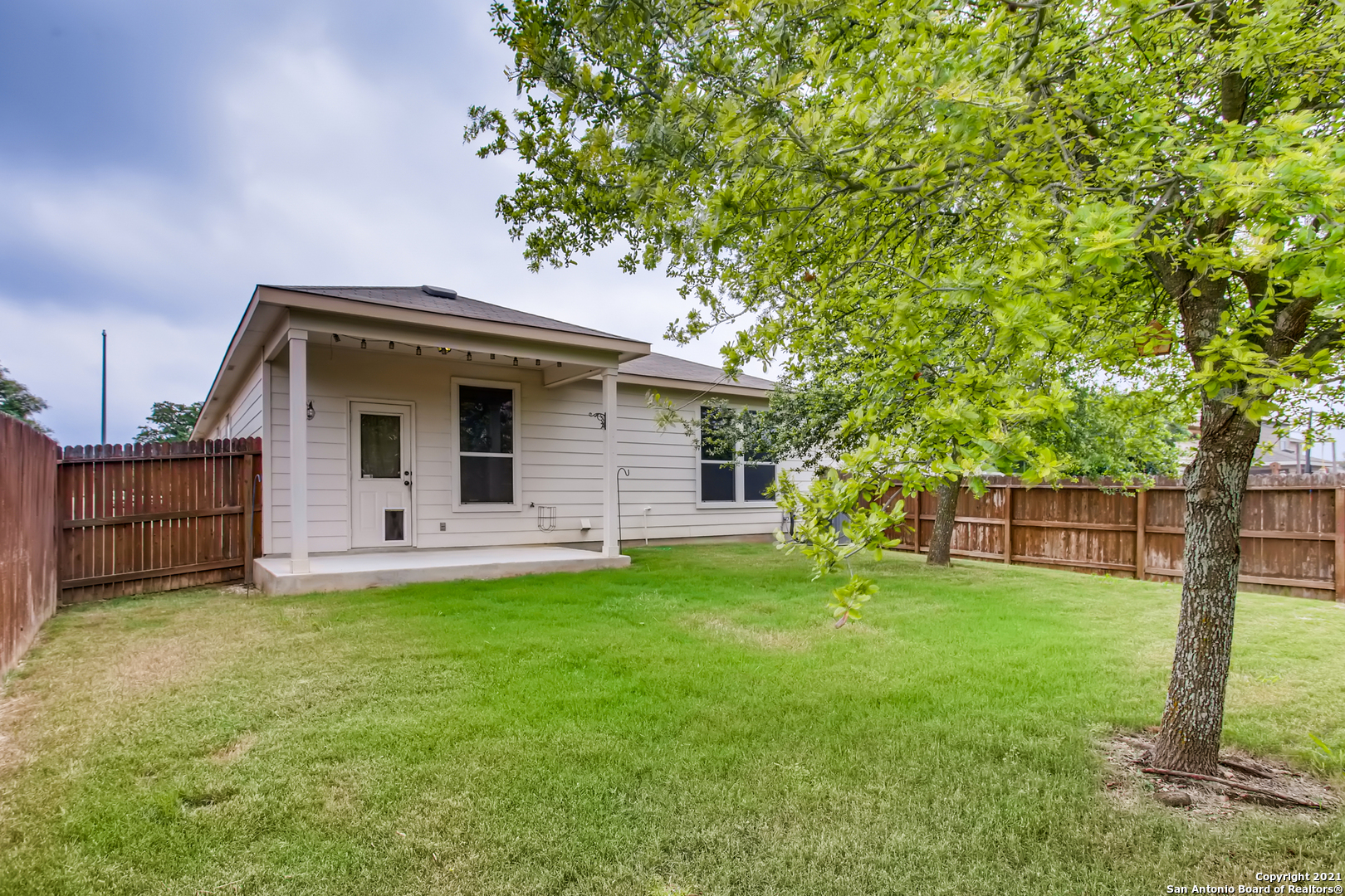 Welcome to this stunning 3-bedroom, 2-bathroom home located in the desirable Silverado Hills subdivision of San Antonio, TX. This property boasts an array of modern amenities that cater to a comfortable and convenient lifestyle. The kitchen is equipped with a refrigerator, dishwasher, microwave, and an electric range, perfect for those who love to cook. The open floor plan allows for seamless transitions between rooms, creating a spacious and welcoming environment. The home also features dual vanities in the primary bathroom, adding a touch of luxury and convenience. The attached 2-car garage comes with a garage door opener, providing easy access and secure parking. The exterior of the home is just as impressive, with a covered back patio and front porch, perfect for outdoor relaxation or entertaining. The property is nestled against a greenbelt, offering beautiful views and a sense of tranquility. A privacy fence surrounds the property, ensuring your peace and security. This home truly offers a blend of comfort, convenience, and modern living.