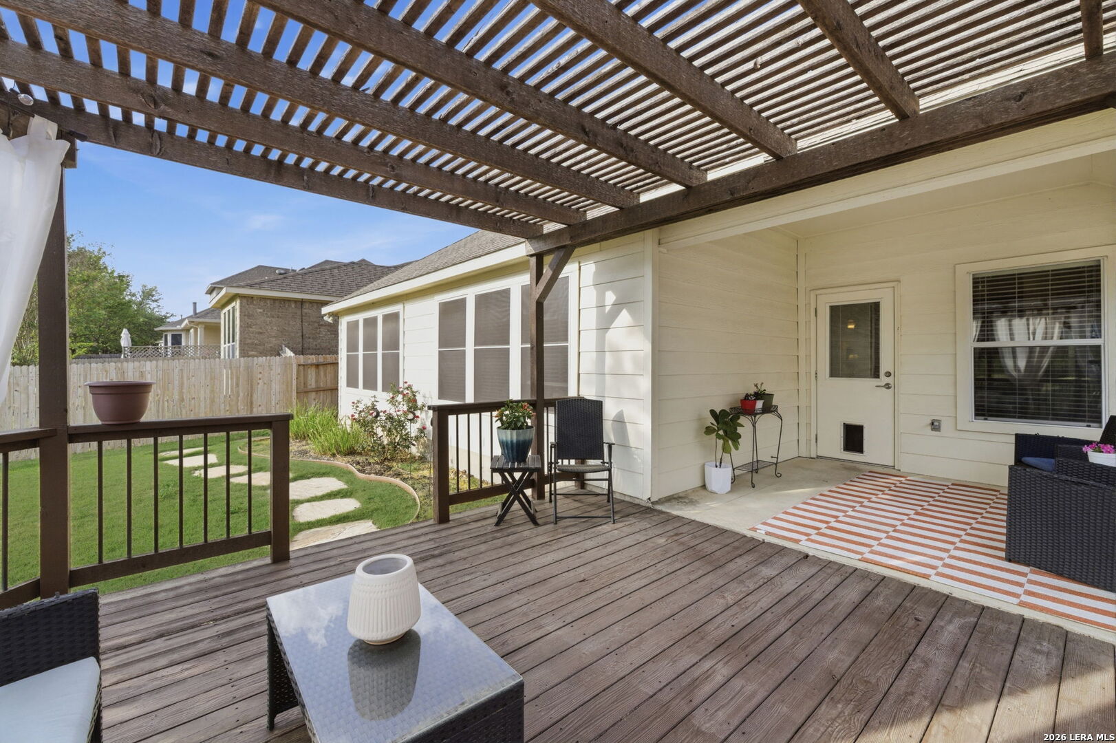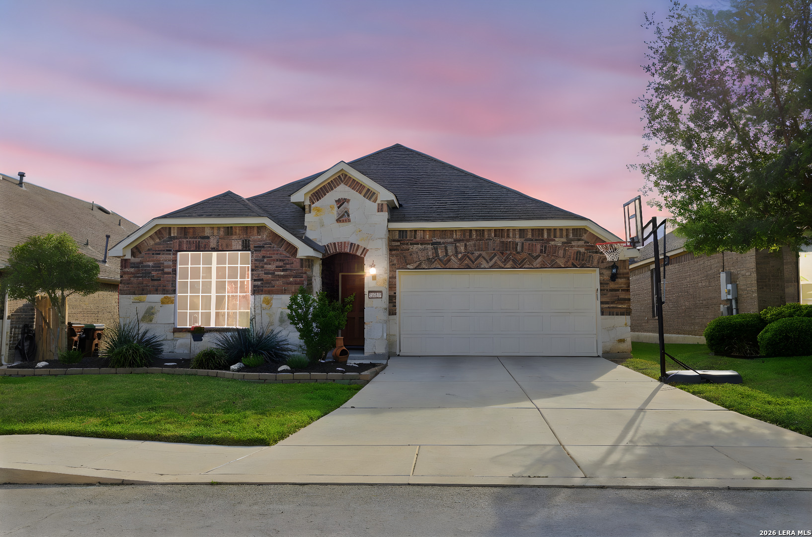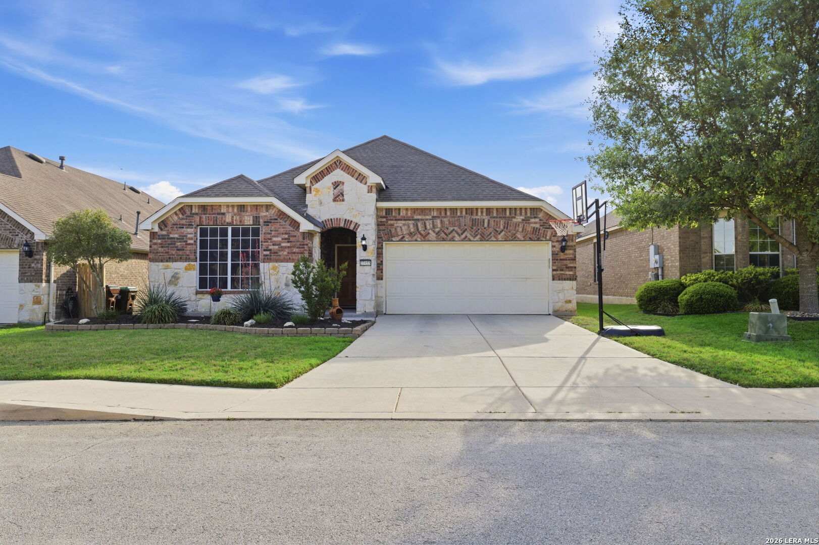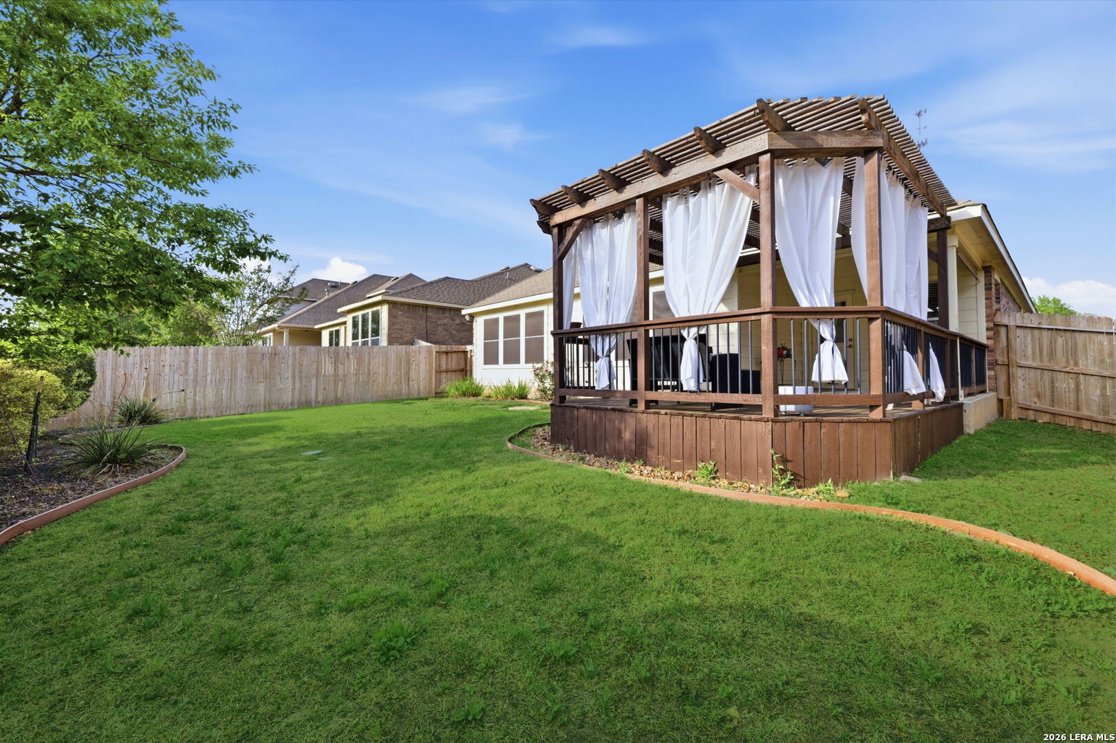 Welcome to 27455 Camino Haven, a beautifully designed single story home built in 2013, located in a gated community, featuring 3 bedrooms, 2 bathrooms, just under 1,800 SF, double oven, a large granite kitchen island, a gas cooktop, stainless steel appliances, wood-like laminate flooring in the family room, large tile flooring in the entry, kitchen and walking areas, tall baseboards, a split bedroom design (allowing for privacy in the primary bedroom) and much more. There is even a built-in tech center/small office situated near the kitchen and family room for extra convenience. The primary suite is quite spacious and offers a 5 piece bathroom with double vanities (granite counters), a walk-in shower with a glass surround, a soaking tub and a spacious walk-in closet. The guest bedrooms are located on the opposite wing of the primary bedroom and share a guest bathroom equipped with a double vanity and a tile shower. When you step into the backyard, you are greeted with a large, custom outdoor deck/pergola, perfect for outdoor dining and entertaining. The recently power-washed fence looks great as does the landscaping/vegetation. The spacious garage (featuring a 2.5 car tandem) is another nice feature as it allows for plenty of storage and has an epoxy flooring. Walk to the community pool and park within minutes and also enjoy the Boerne ISD schools! If you are in the market for a single story home that is well maintained, a comfortable lifestyle in the Boerne ISD at an affordable price, put 27455 Camino Haven on your short list!