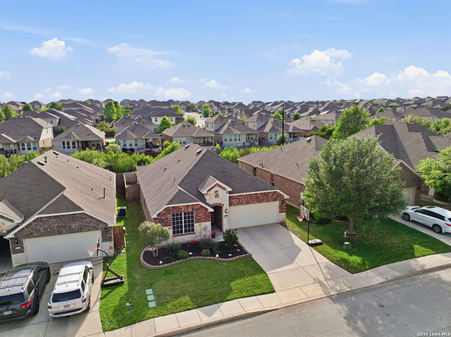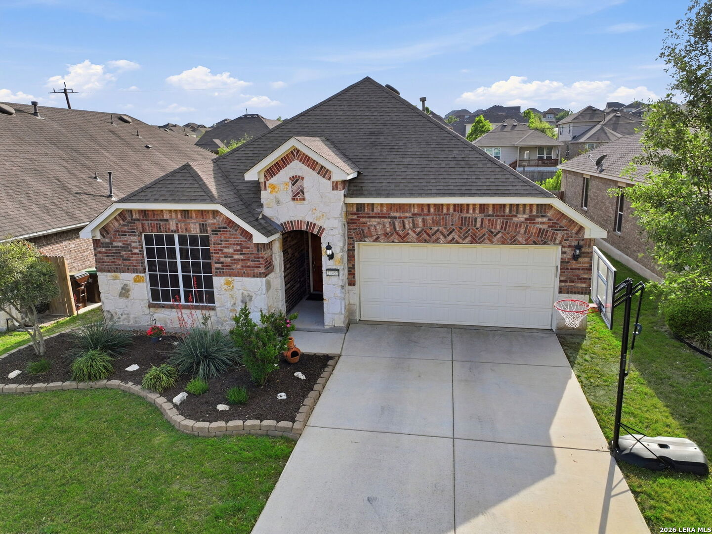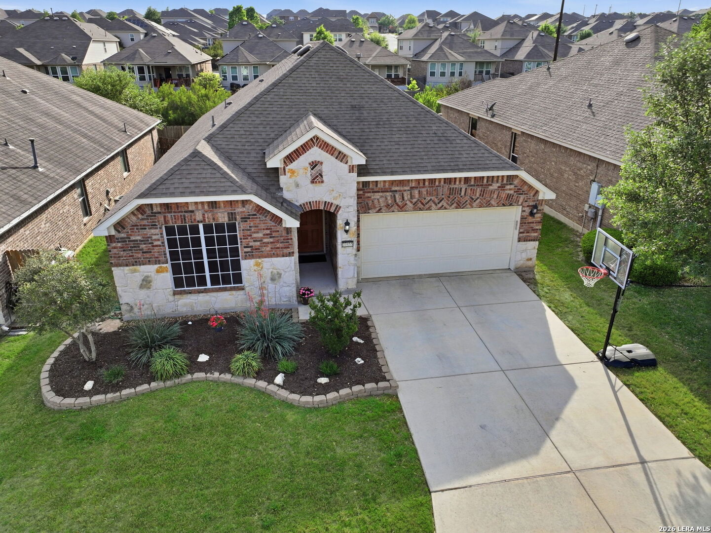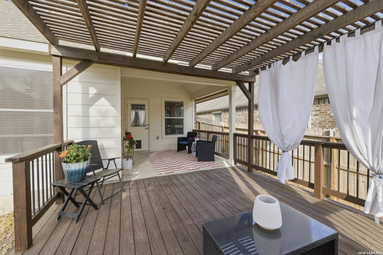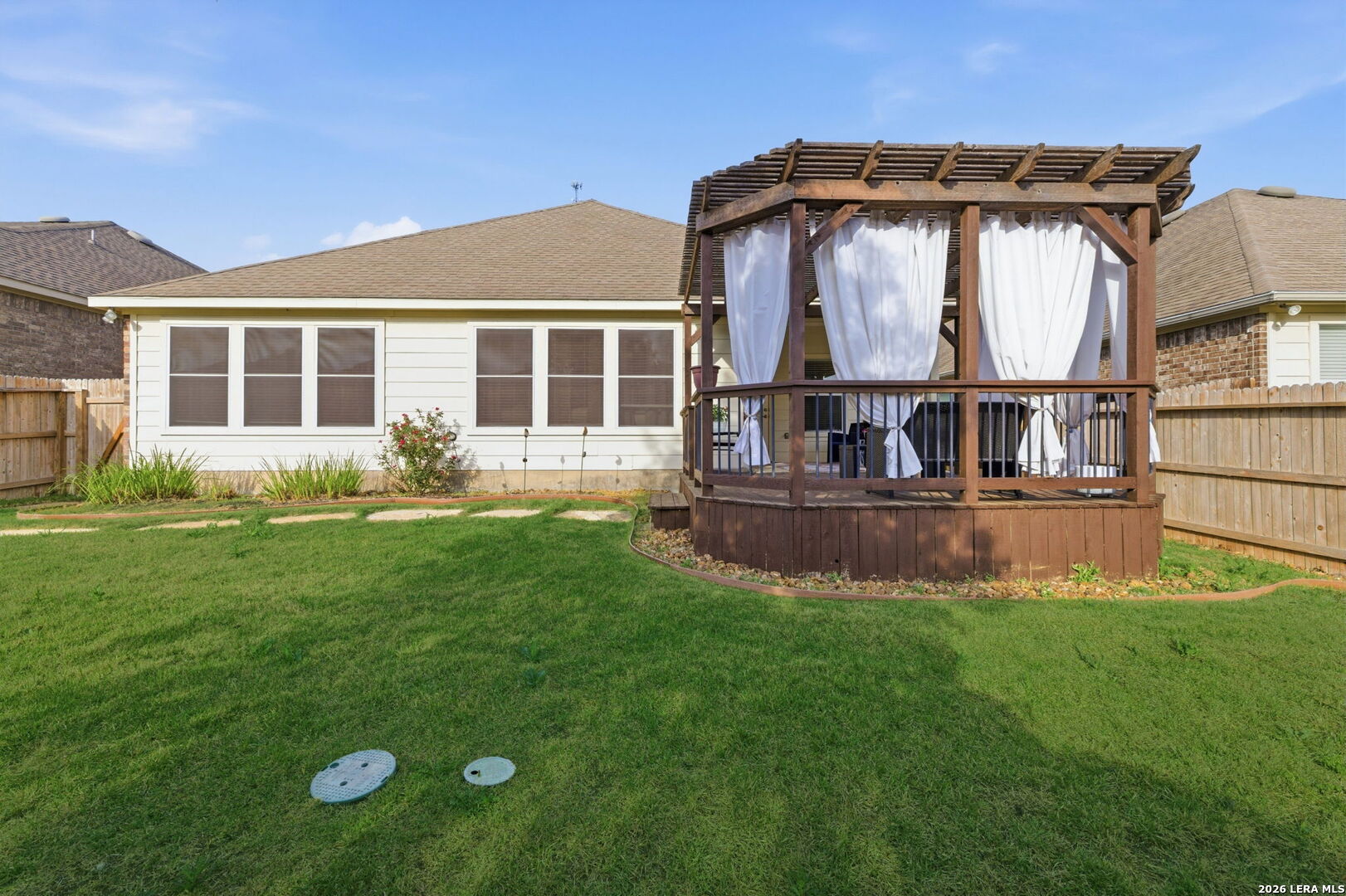 Welcome to 27455 Camino Haven, a beautifully designed single story home built in 2013, located in a gated community, featuring 3 bedrooms, 2 bathrooms, just under 1,800 SF, double oven, a large granite kitchen island, a gas cooktop, stainless steel appliances, wood-like laminate flooring in the family room, large tile flooring in the entry, kitchen and walking areas, tall baseboards, a split bedroom design (allowing for privacy in the primary bedroom) and much more. There is even a built-in tech center/small office situated near the kitchen and family room for extra convenience. The primary suite is quite spacious and offers a 5 piece bathroom with double vanities (granite counters), a walk-in shower with a glass surround, a soaking tub and a spacious walk-in closet. The guest bedrooms are located on the opposite wing of the primary bedroom and share a guest bathroom equipped with a double vanity and a tile shower. When you step into the backyard, you are greeted with a large, custom outdoor deck/pergola, perfect for outdoor dining and entertaining. The recently power-washed fence looks great as does the landscaping/vegetation. The spacious garage (featuring a 2.5 car tandem) is another nice feature as it allows for plenty of storage and has an epoxy flooring. Walk to the community pool and park within minutes and also enjoy the Boerne ISD schools! If you are in the market for a single story home that is well maintained, a comfortable lifestyle in the Boerne ISD at an affordable price, put 27455 Camino Haven on your short list!