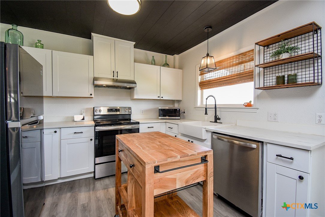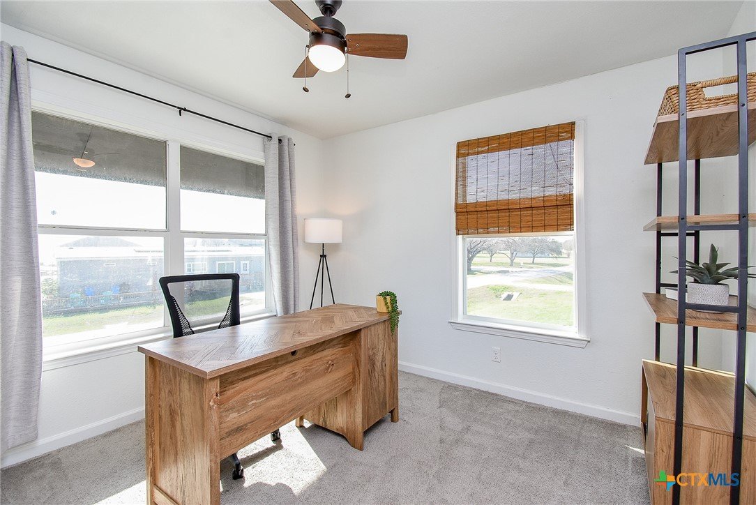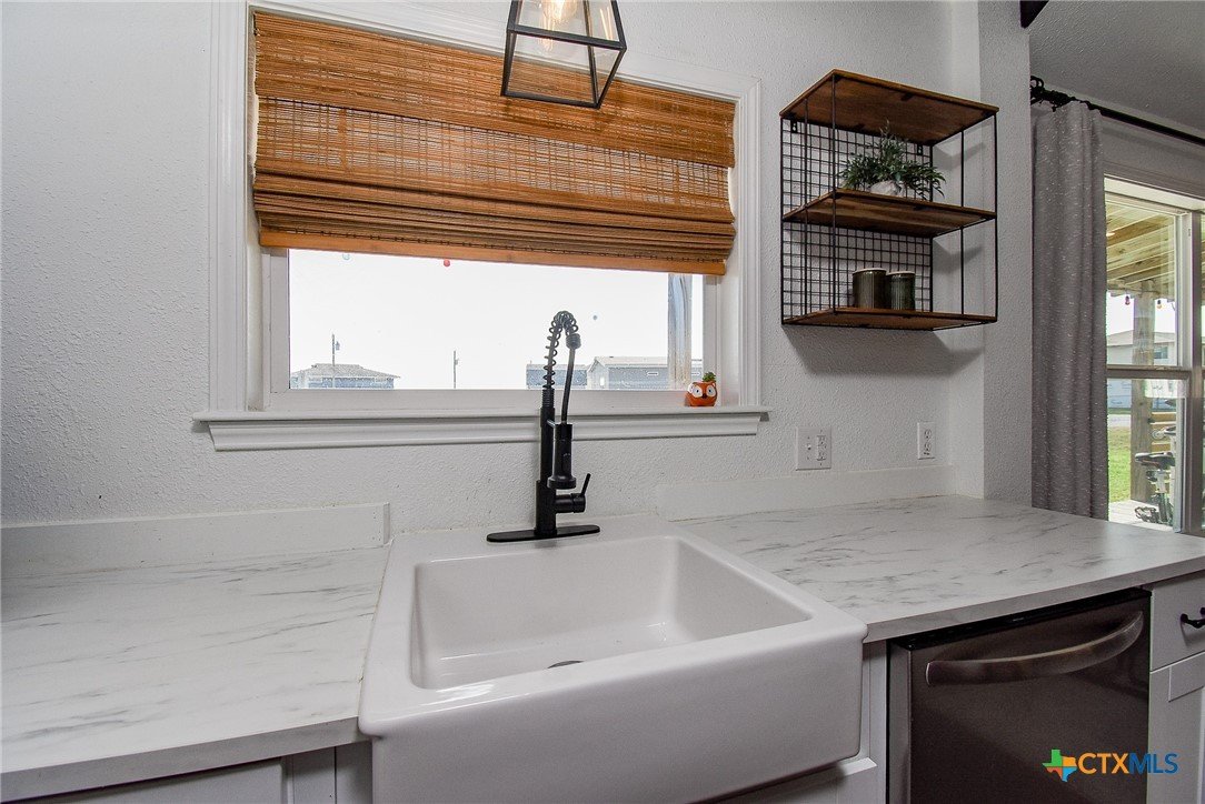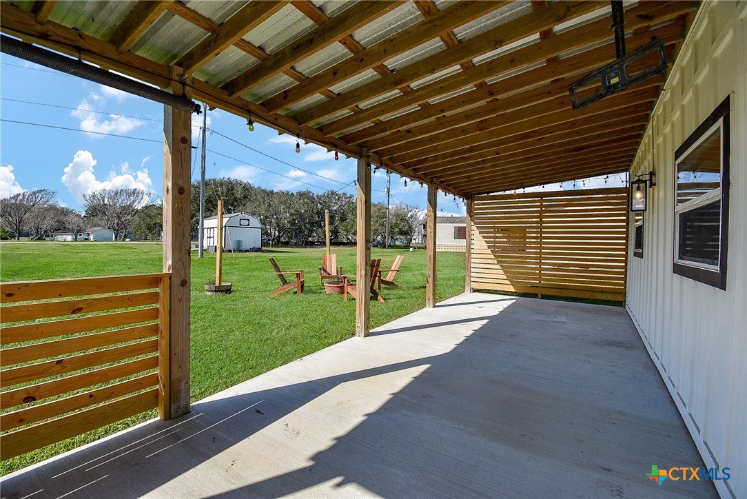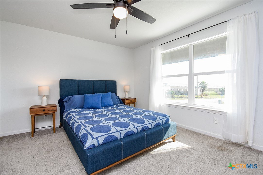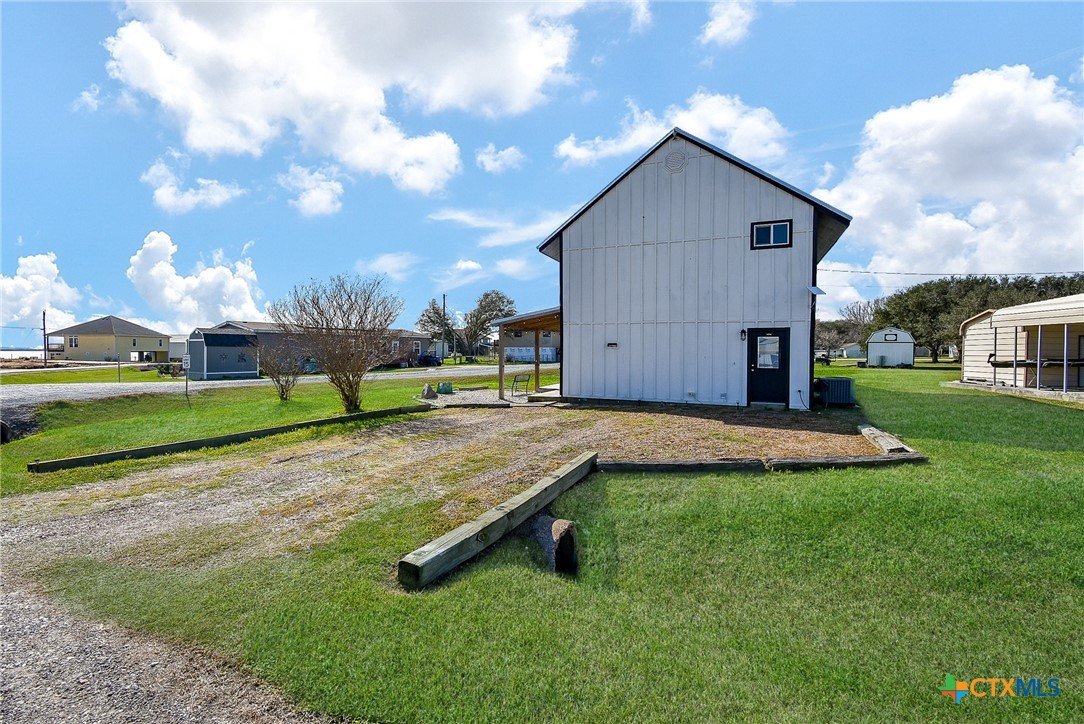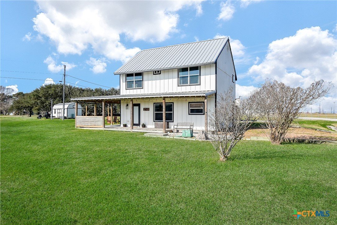 Discover this charming waterview home just one block from the water in the gated Cape Carancahua community! Perfect as a weekend getaway or primary residence, this coastal retreat offers farmhouse charm with shiplap accents, a tin roof, and a wrap-around porch. Inside, an open floor plan connects the kitchen, living, and dining areas, creating a bright, airy atmosphere with a modern white and black color scheme. Upstairs, find a cozy reading nook and three bedrooms with two full baths. The expansive exterior features two double-wide driveways, RV hookups, a large yard, and a 12'x24' storage building on two premium corner lots. Enjoy fantastic community amenities, including a boat ramp, fishing piers, playground, community center, outdoor pavilion, tennis courts, and two swimming pools.
