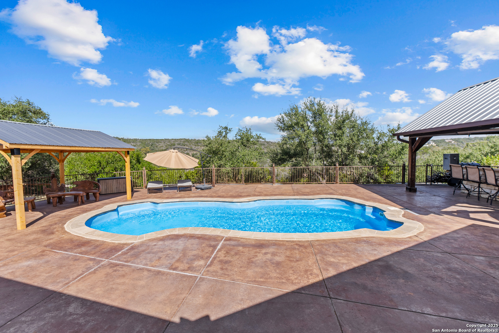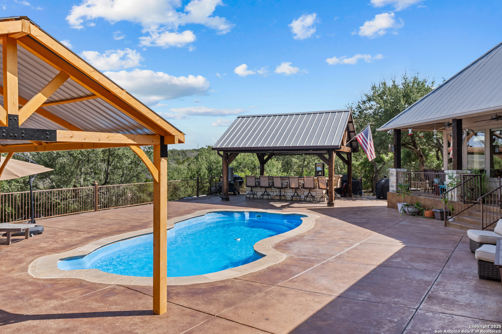 Major price improvement! Appraised at $950k--now offered at $949,900! VERIFIED VALUE AND MOTIVATED SELLER~~ Perched atop 3.76 private acres in River Chase, 276 Oak Vista offers breathtaking views, timeless design, and serene hilltop living. This elegant home features a flowing, light-filled layout, a durable metal roof, high ceilings, and a tranquil primary suite with his and hers closets and panoramic vistas. Outdoors, enjoy a serene pool oasis, covered patio, outdoor kitchen, shaded gazebo and expansive deck - ideal for effortless entertaining or peaceful retreats beneath mature trees. Additional features: 30amp plug near drive-way, propane tank (w/hose), extended garage space, kids jungle gym/playground and many more! Just a short 5 minute drive to River Chase's PRIVATE riverfront access, this property combines seclusion with rare proximity to the Guadalupe River. A true sanctuary, where luxury meets lifestyle. And... HOA is only $300/annually which includes access to nature parks, pools, sports courts, clubhouse, gym and much MORE!
