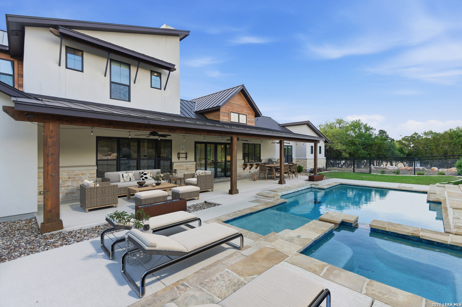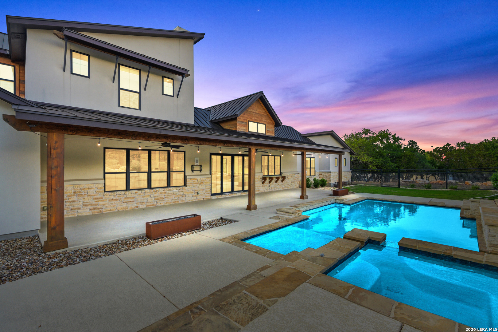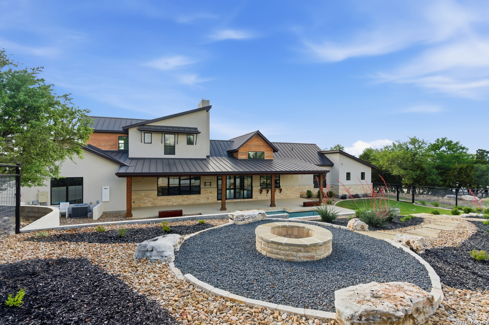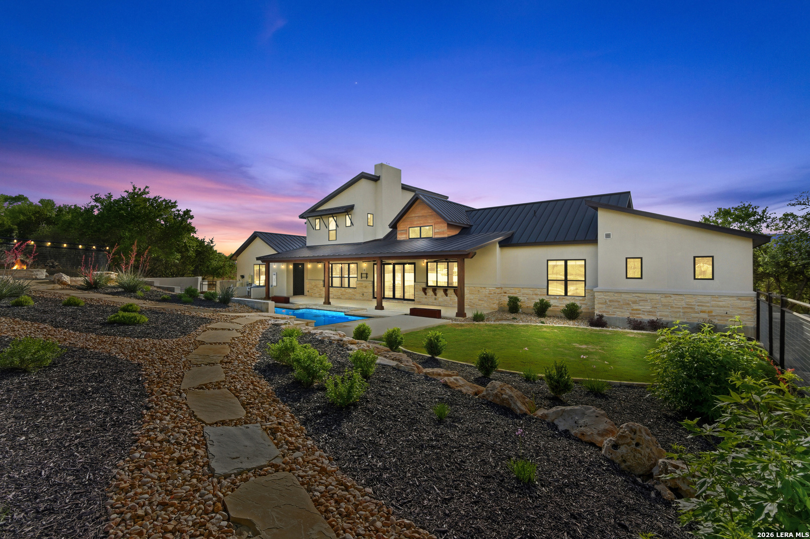 Set behind the gates of Ramble Ridge Ranch on 1.4 private acres, this fully-custom Hill Country modern farmhouse designed by Austin's acclaimed Vanguard Architecture makes a striking first impression with custom iron front doors crafted by San Marcos Iron Doors, setting the tone for the level of design and craftsmanship found throughout. A large front porch welcomes you in, offering a front-row seat to the surrounding landscape and unforgettable Hill Country sunsets. Inside, the home opens with clean lines, abundant natural light, and a seamless flow between living spaces. The great room and dining area are anchored by a striking double-sided fireplace, enhanced by Klipsch surround sound speakers that elevate both everyday living and entertaining. At the heart of the home, the kitchen is thoughtfully designed for both function and presence. A 9-foot island with a dramatic 3-inch drop countertop is complemented by custom Schmidt Brothers cabinetry, a spacious walk-in pantry, and premium appliances including double ovens, a 5-burner gas cooktop, a high-end Zephyr wine fridge, and an included refrigerator. Details such as a touch-activated faucet, under-cabinet lighting, and reverse osmosis filtration system reflect the level of care throughout. A serving window opens directly to the covered patio, creating an effortless indoor-outdoor connection. The primary suite offers a private retreat with a spa-inspired bath featuring a rain shower and a custom-designed closet. Additional spaces include a dedicated study and a hidden room (upstairs)-perfect for a quiet escape, creative studio, or media space. Practical features such as a large under-stairs storage area and a utility room with cabinetry, counters, sink, and a pet wash station add everyday convenience. 2nd bedroom with ensuite downstairs. Upstairs, 2 additional bedrooms are connected by a Jack-and-Jill bath with a convenient laundry chute, while the oversized three-car side-entry garage provides ample room for storage and hobbies. The home is also supported by two underground propane tanks (approximately 250 and 500 gallons) and an outdoor sprinkler system for ease of maintenance. Outdoor living is where this home truly shines. The resort-style backyard is professionally landscaped and enclosed with custom ranch-style fencing, offering both privacy and a sense of openness. The centerpiece is a Belize-blue pool with spillovers, featuring in-pool lounging areas and bar-style stools, complemented by a hot tub, and firepit. The large covered patio, also equipped with Klipsch speakers, is designed for gathering, relaxing, and taking in the views. This is more than a home-it's a carefully designed Hill Country retreat where craftsmanship, comfort, and setting come together to create something truly exceptional.