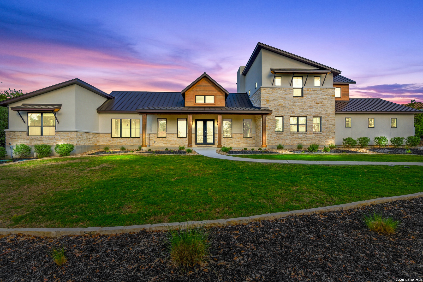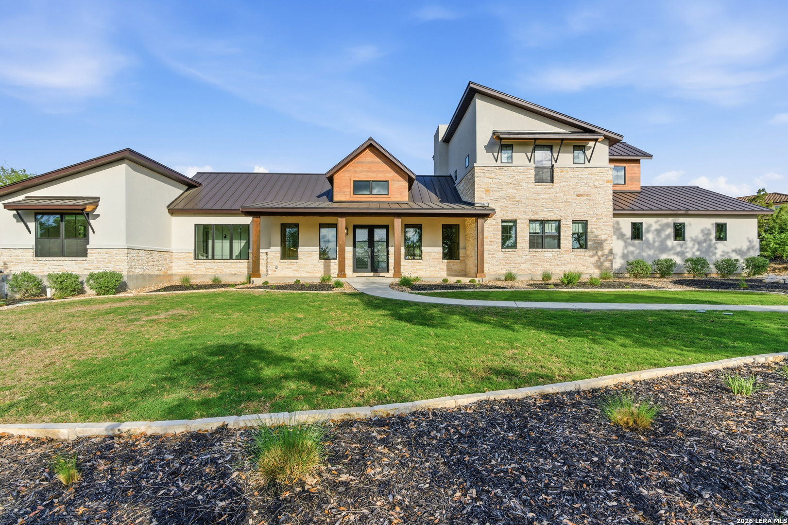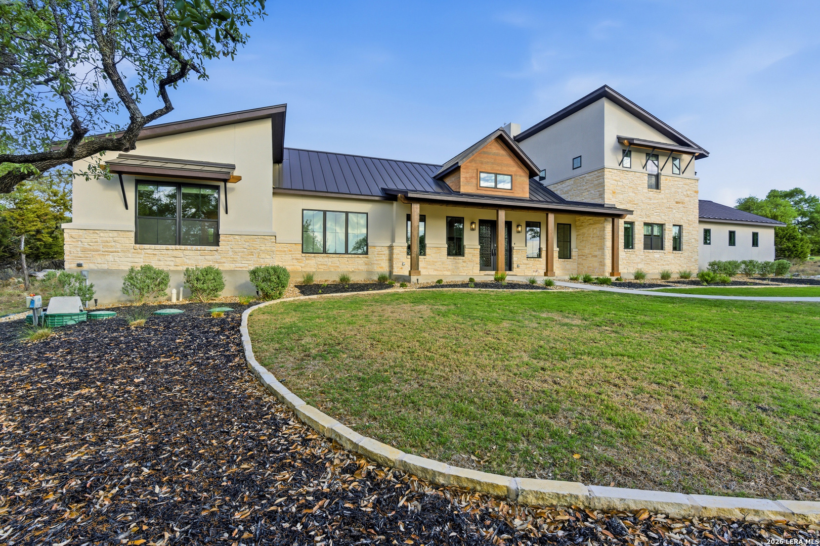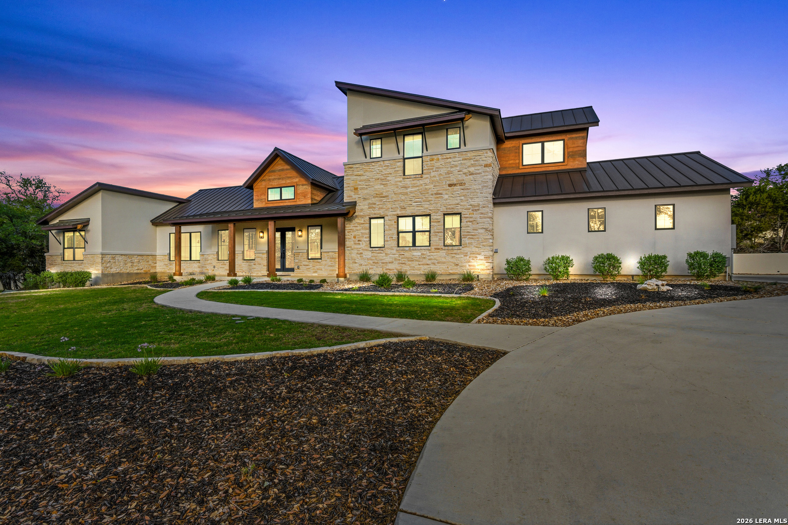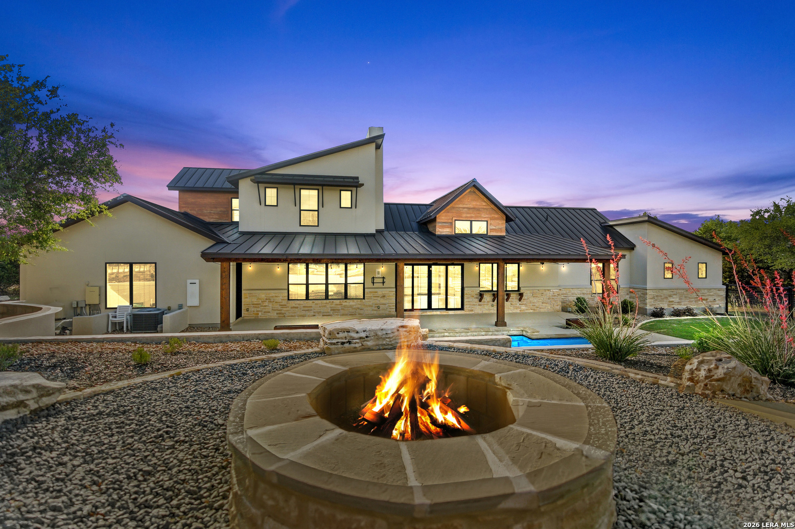 Set behind the gates of Ramble Ridge Ranch on 1.4 private acres, this fully-custom Hill Country modern farmhouse designed by Austin's acclaimed Vanguard Architecture makes a striking first impression with custom iron front doors crafted by San Marcos Iron Doors, setting the tone for the level of design and craftsmanship found throughout. A large front porch welcomes you in, offering a front-row seat to the surrounding landscape and unforgettable Hill Country sunsets. Inside, the home opens with clean lines, abundant natural light, and a seamless flow between living spaces. The great room and dining area are anchored by a striking double-sided fireplace, enhanced by Klipsch surround sound speakers that elevate both everyday living and entertaining. At the heart of the home, the kitchen is thoughtfully designed for both function and presence. A 9-foot island with a dramatic 3-inch drop countertop is complemented by custom Schmidt Brothers cabinetry, a spacious walk-in pantry, and premium appliances including double ovens, a 5-burner gas cooktop, a high-end Zephyr wine fridge, and an included refrigerator. Details such as a touch-activated faucet, under-cabinet lighting, and reverse osmosis filtration system reflect the level of care throughout. A serving window opens directly to the covered patio, creating an effortless indoor-outdoor connection. The primary suite offers a private retreat with a spa-inspired bath featuring a rain shower and a custom-designed closet. Additional spaces include a dedicated study and a hidden room (upstairs)-perfect for a quiet escape, creative studio, or media space. Practical features such as a large under-stairs storage area and a utility room with cabinetry, counters, sink, and a pet wash station add everyday convenience. 2nd bedroom with ensuite downstairs. Upstairs, 2 additional bedrooms are connected by a Jack-and-Jill bath with a convenient laundry chute, while the oversized three-car side-entry garage provides ample room for storage and hobbies. The home is also supported by two underground propane tanks (approximately 250 and 500 gallons) and an outdoor sprinkler system for ease of maintenance. Outdoor living is where this home truly shines. The resort-style backyard is professionally landscaped and enclosed with custom ranch-style fencing, offering both privacy and a sense of openness. The centerpiece is a Belize-blue pool with spillovers, featuring in-pool lounging areas and bar-style stools, complemented by a hot tub, and firepit. The large covered patio, also equipped with Klipsch speakers, is designed for gathering, relaxing, and taking in the views. This is more than a home-it's a carefully designed Hill Country retreat where craftsmanship, comfort, and setting come together to create something truly exceptional.