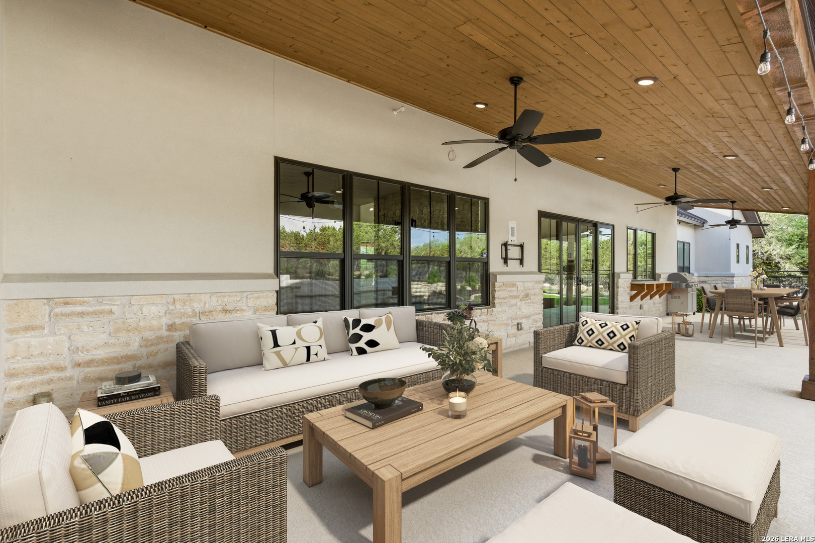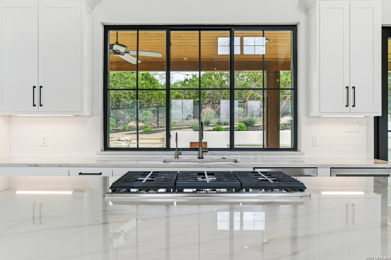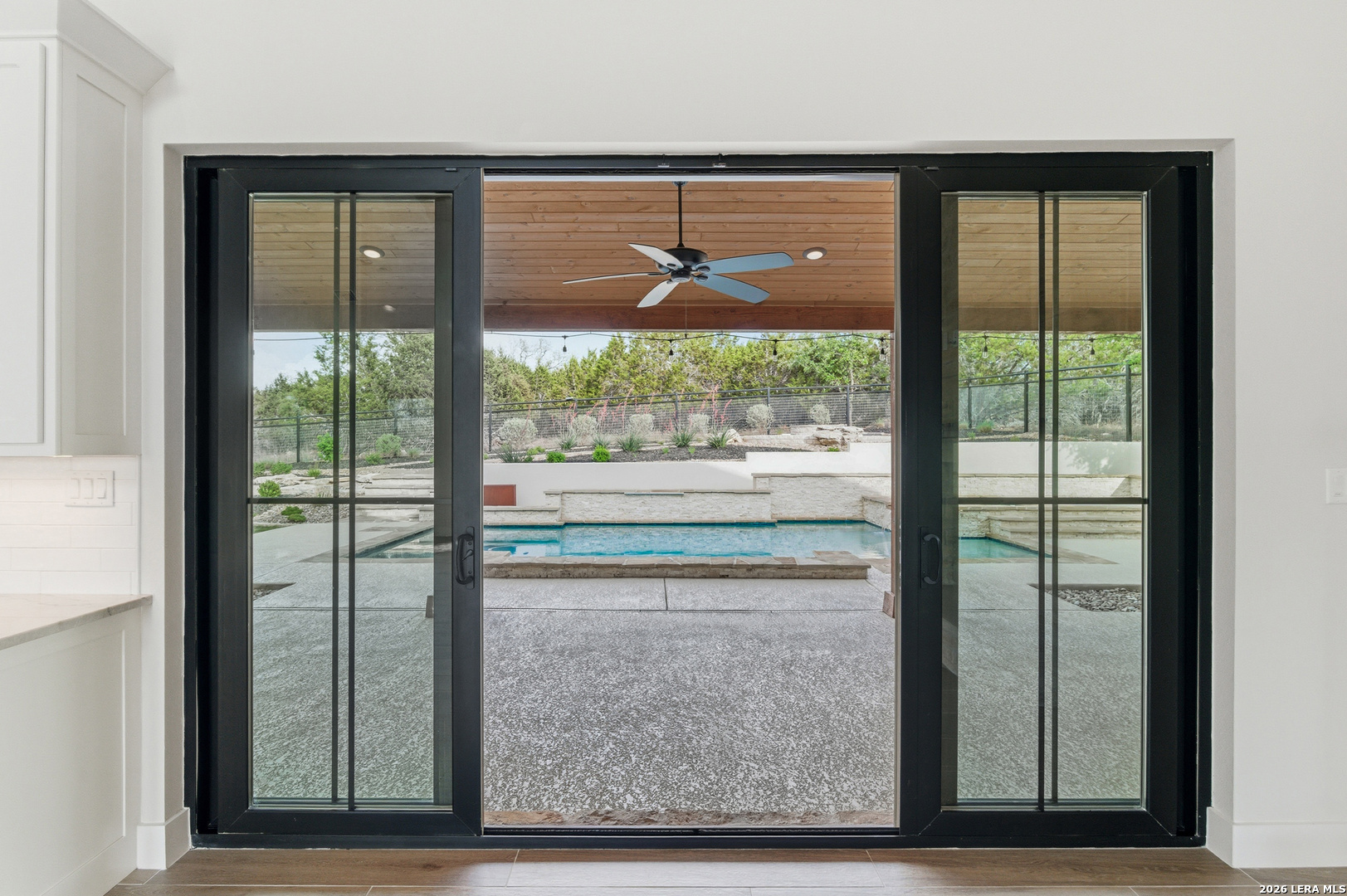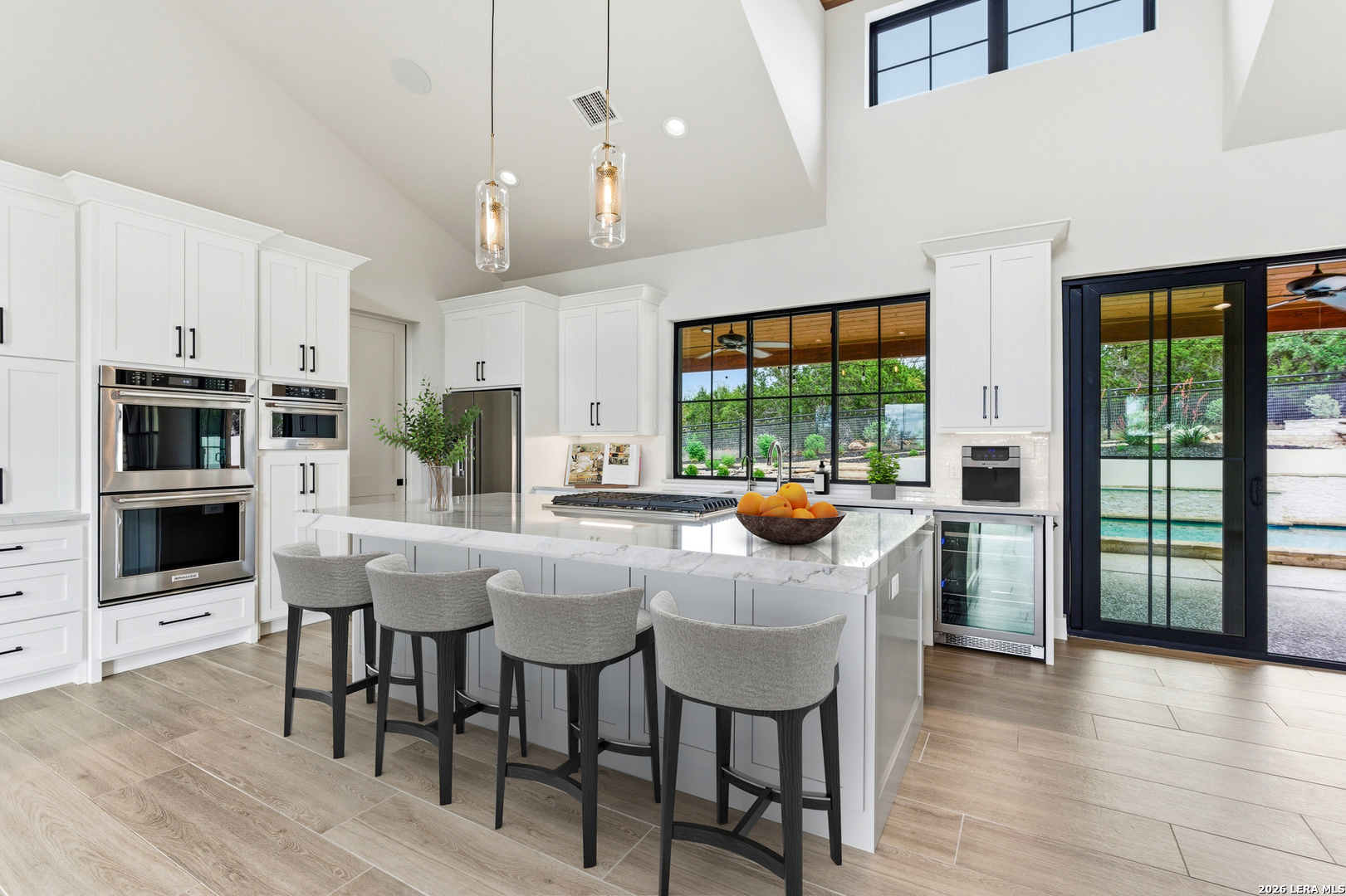 Set behind the gates of Ramble Ridge Ranch on 1.4 private acres, this fully-custom Hill Country modern farmhouse designed by Austin's acclaimed Vanguard Architecture makes a striking first impression with custom iron front doors crafted by San Marcos Iron Doors, setting the tone for the level of design and craftsmanship found throughout. A large front porch welcomes you in, offering a front-row seat to the surrounding landscape and unforgettable Hill Country sunsets. Inside, the home opens with clean lines, abundant natural light, and a seamless flow between living spaces. The great room and dining area are anchored by a striking double-sided fireplace, enhanced by Klipsch surround sound speakers that elevate both everyday living and entertaining. At the heart of the home, the kitchen is thoughtfully designed for both function and presence. A 9-foot island with a dramatic 3-inch drop countertop is complemented by custom Schmidt Brothers cabinetry, a spacious walk-in pantry, and premium appliances including double ovens, a 5-burner gas cooktop, a high-end Zephyr wine fridge, and an included refrigerator. Details such as a touch-activated faucet, under-cabinet lighting, and reverse osmosis filtration system reflect the level of care throughout. A serving window opens directly to the covered patio, creating an effortless indoor-outdoor connection. The primary suite offers a private retreat with a spa-inspired bath featuring a rain shower and a custom-designed closet. Additional spaces include a dedicated study and a hidden room (upstairs)-perfect for a quiet escape, creative studio, or media space. Practical features such as a large under-stairs storage area and a utility room with cabinetry, counters, sink, and a pet wash station add everyday convenience. 2nd bedroom with ensuite downstairs. Upstairs, 2 additional bedrooms are connected by a Jack-and-Jill bath with a convenient laundry chute, while the oversized three-car side-entry garage provides ample room for storage and hobbies. The home is also supported by two underground propane tanks (approximately 250 and 500 gallons) and an outdoor sprinkler system for ease of maintenance. Outdoor living is where this home truly shines. The resort-style backyard is professionally landscaped and enclosed with custom ranch-style fencing, offering both privacy and a sense of openness. The centerpiece is a Belize-blue pool with spillovers, featuring in-pool lounging areas and bar-style stools, complemented by a hot tub, and firepit. The large covered patio, also equipped with Klipsch speakers, is designed for gathering, relaxing, and taking in the views. This is more than a home-it's a carefully designed Hill Country retreat where craftsmanship, comfort, and setting come together to create something truly exceptional.