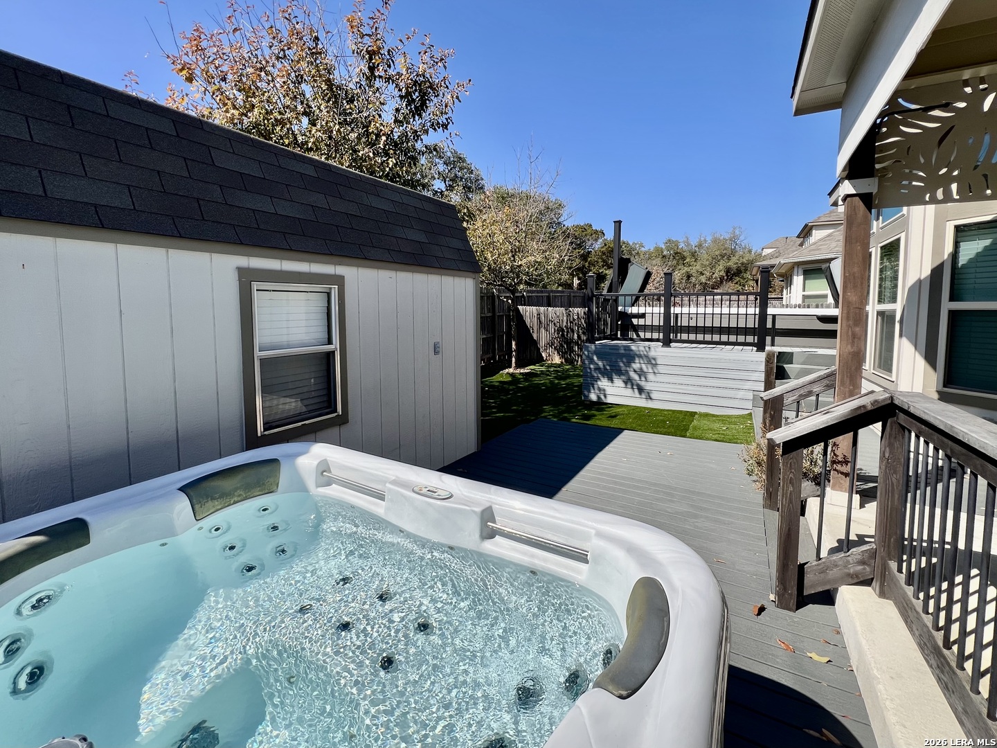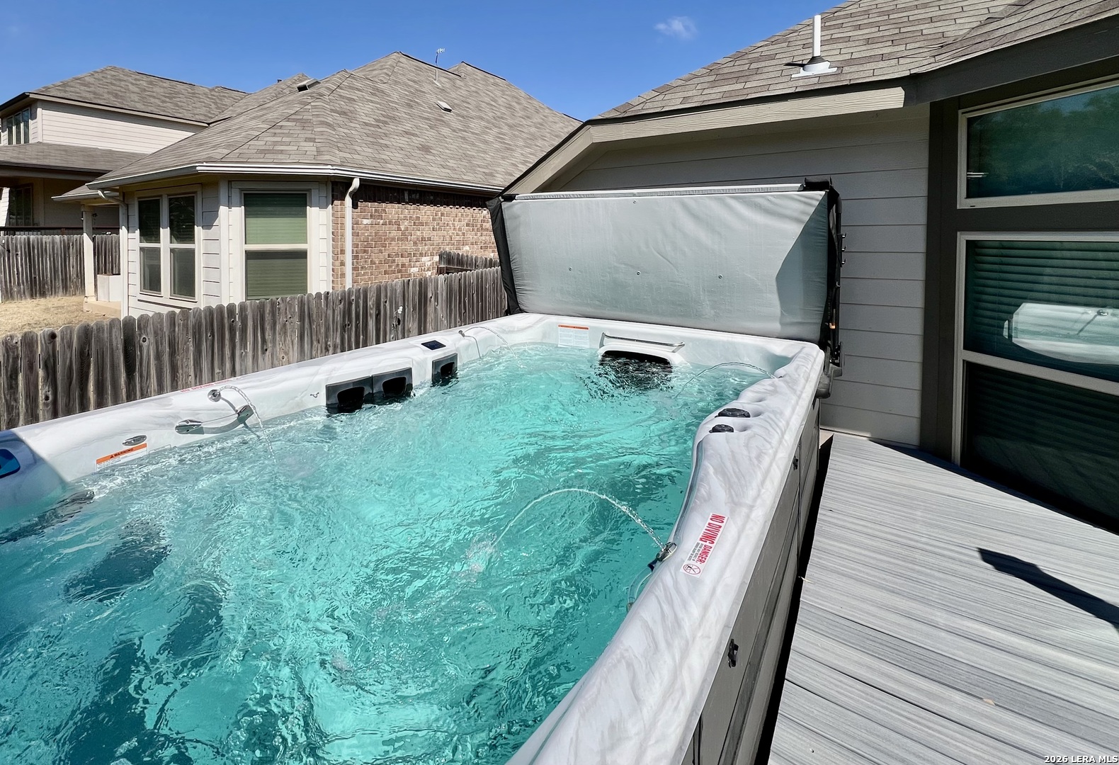 Won't last! Turnkey Gehan 1-story, 4 bed/3 bath home w/ your dream backyard including a swim spa awaits. Tastefully appointed open floor plan has upgraded finishes including common room wood floors, tile in bathrooms, stainless appliances, granite kitchen counters, & more. The extended primary bedroom suite has a double vanity, soaking tub & separate shower with a large closet. Enjoy the fantastic backyard--sellers added a new $35K swim spa ~2 yrs ago...plus the separate 2-person spa & all of the Trex decking, flatwork in front, side, & back of home. Powered $10K shed is ready for your projects/gym. Community is double gated with a pool & is zoned for great Boerne schools. Convenient access to I-10 makes for a short drive to shopping/restaurants including Lemon Creek, Leon Springs, The Rim, & La Cantera.