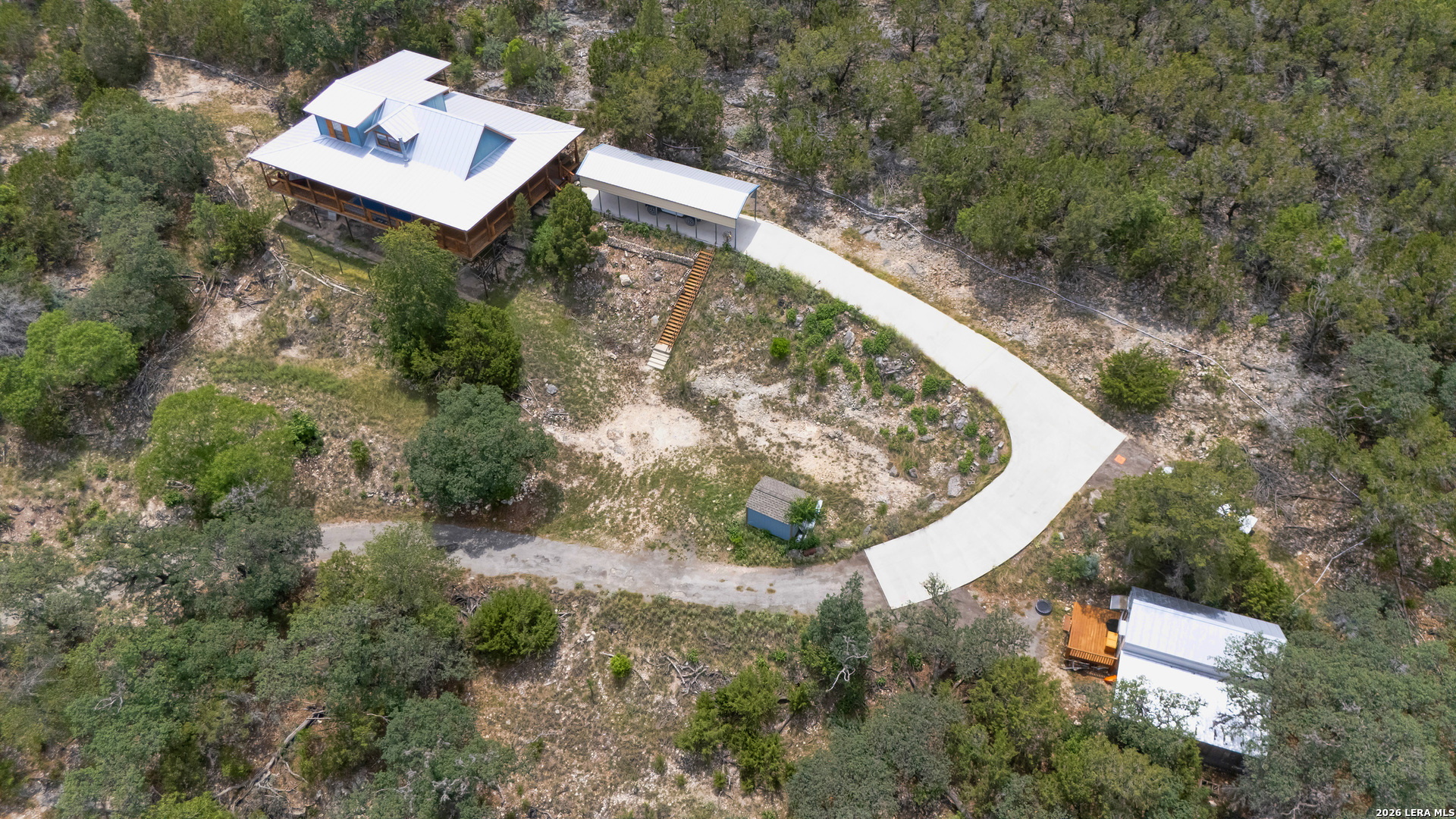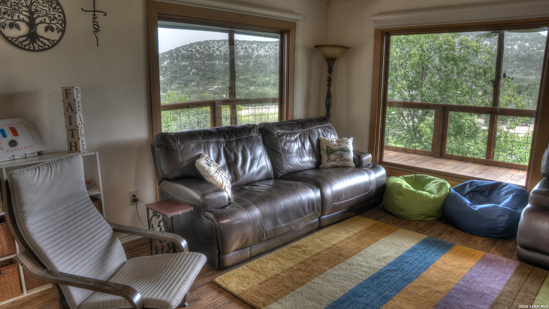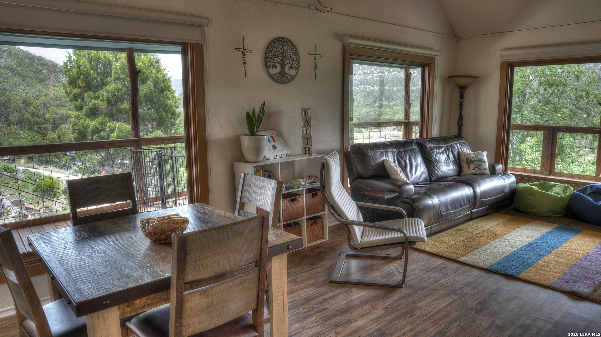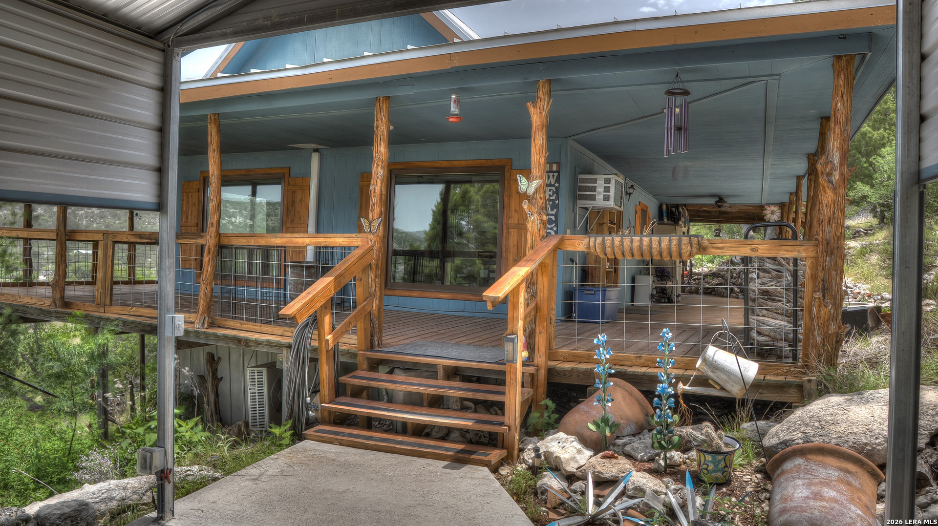 Located in gated Roaring Springs, approximately 12 miles west of Leakey, landowners will have access to a 50+ acre common park area with a spring fed creek, cascading waterfalls down chiseled rock formations, a deep swimming hole and a stocked lake for fishing and paddle boarding! The home has been recently remodeled and the wide, covered, porch wraps around the entire home for lots of outdoor entertaining and relaxing. The 3BR/2B home takes in the views with large picture windows in the living/dining area. The kitchen is an efficient galley style with a large utility room off of it. On the main level is the master bedroom and bath with a walk-in closet, equipped with built ins. The second floor offers two bedrooms, bathroom and loft area along with a private deck off the back bedroom. There is a cozy casita perfect for those wanting their own space and a fenced area for the pets! Nestled into a hillside the home provides long beautiful views of the spring fed lake and you can hear the trickling creek below. Home will come mostly furnished and includes water gear to enjoy at the lake! Dark skies perfect for star gazing!! All this is situated on 7.22 acres and should push all the buttons for those looking for a family retreat or someone wanting a quiet lake life! $449,000.