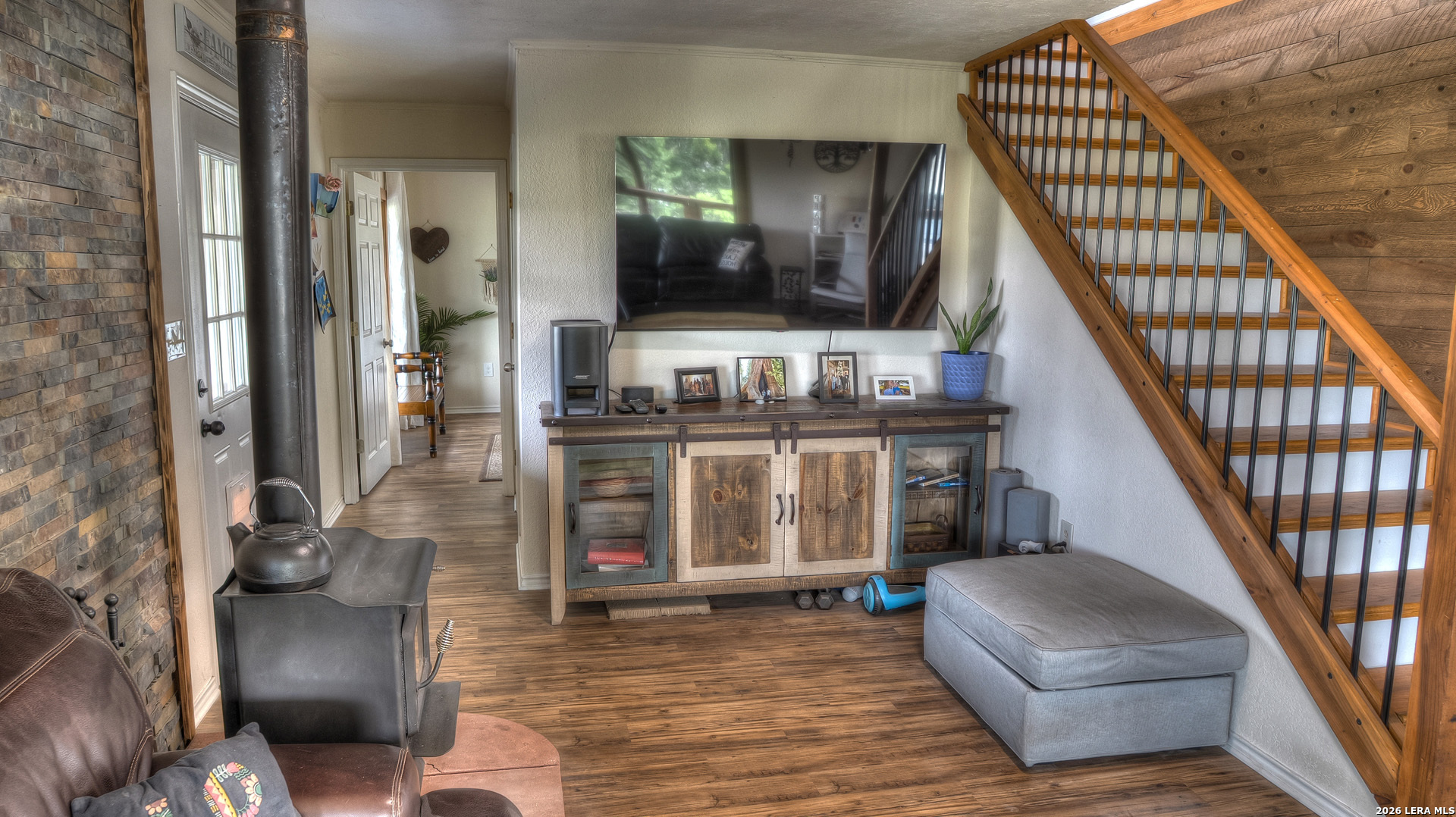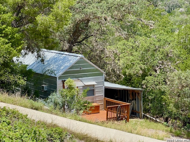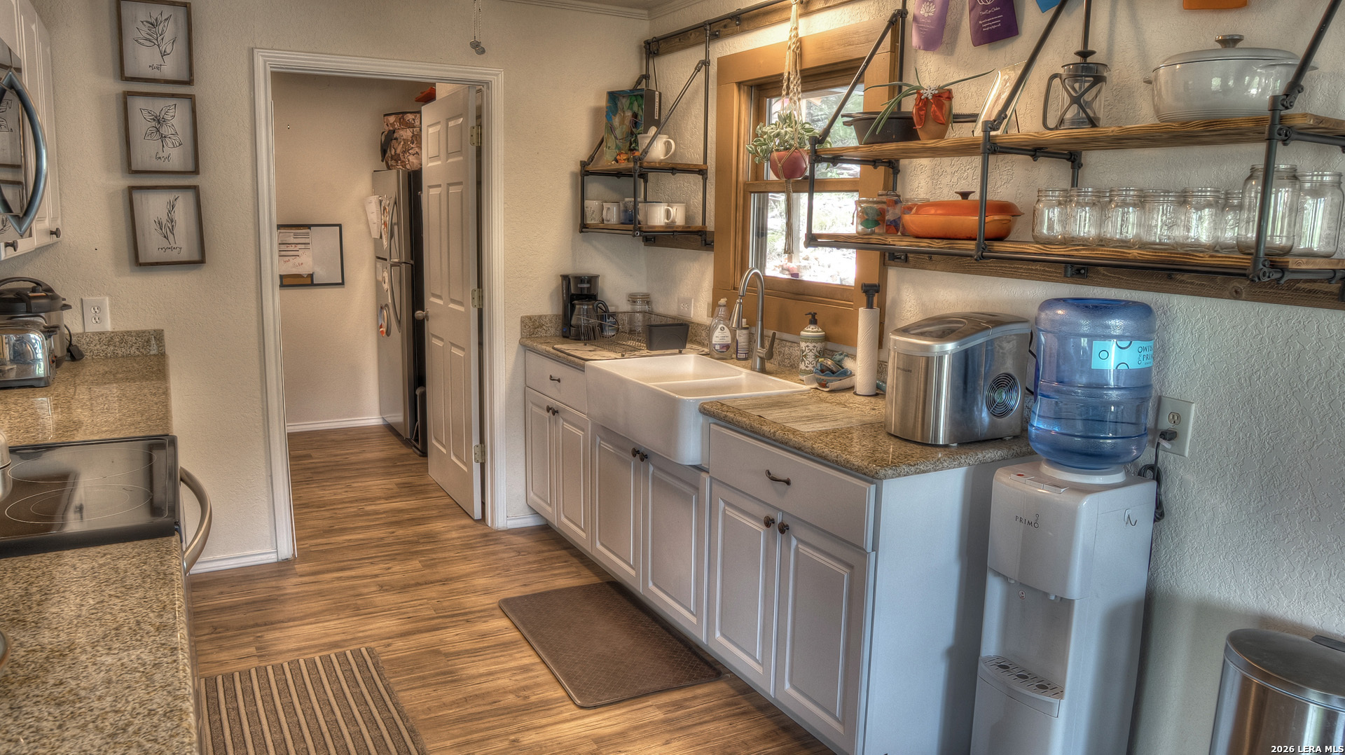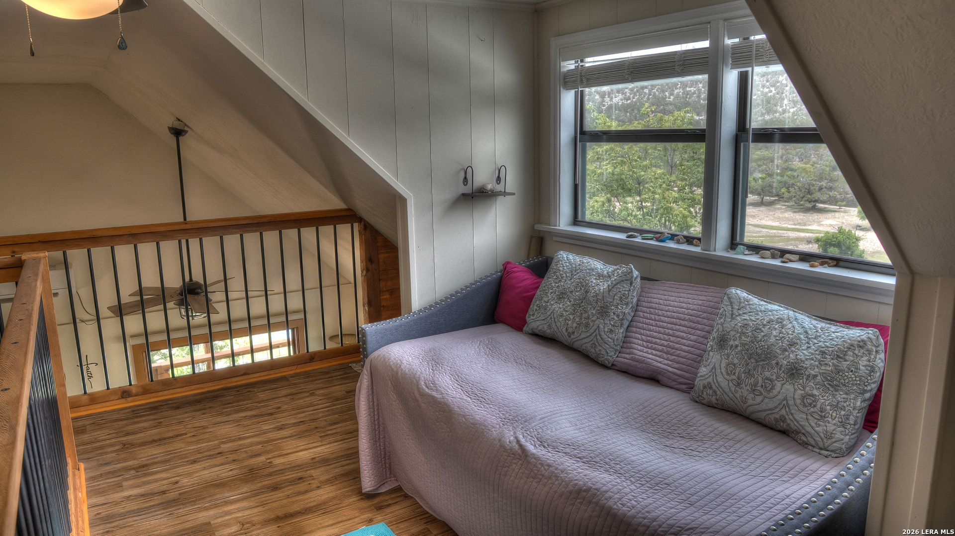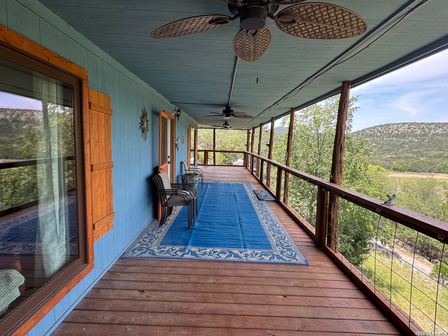 Located in gated Roaring Springs, approximately 12 miles west of Leakey, landowners will have access to a 50+ acre common park area with a spring fed creek, cascading waterfalls down chiseled rock formations, a deep swimming hole and a stocked lake for fishing and paddle boarding! The home has been recently remodeled and the wide, covered, porch wraps around the entire home for lots of outdoor entertaining and relaxing. The 3BR/2B home takes in the views with large picture windows in the living/dining area. The kitchen is an efficient galley style with a large utility room off of it. On the main level is the master bedroom and bath with a walk-in closet, equipped with built ins. The second floor offers two bedrooms, bathroom and loft area along with a private deck off the back bedroom. There is a cozy casita perfect for those wanting their own space and a fenced area for the pets! Nestled into a hillside the home provides long beautiful views of the spring fed lake and you can hear the trickling creek below. Home will come mostly furnished and includes water gear to enjoy at the lake! Dark skies perfect for star gazing!! All this is situated on 7.22 acres and should push all the buttons for those looking for a family retreat or someone wanting a quiet lake life! $449,000.